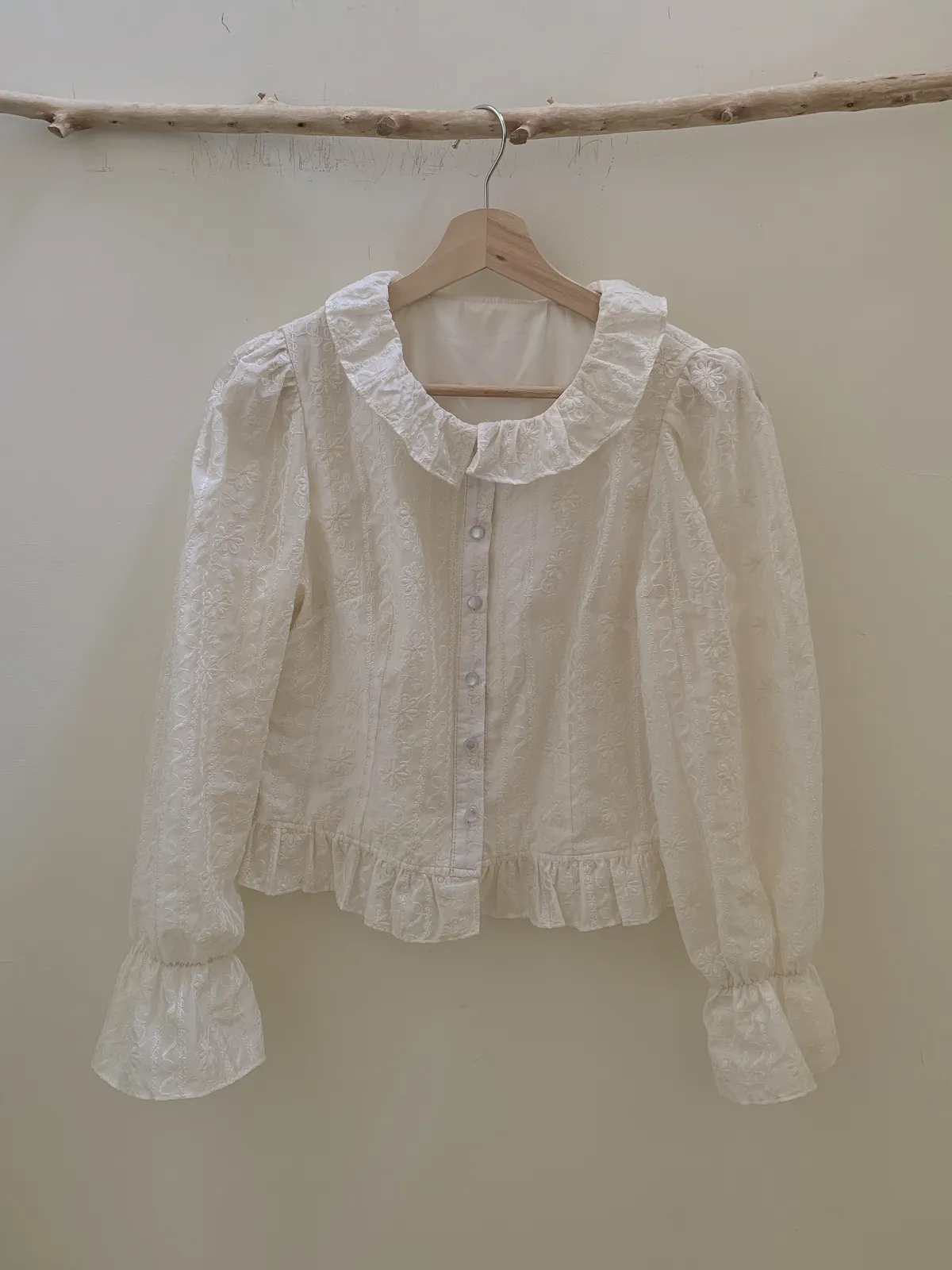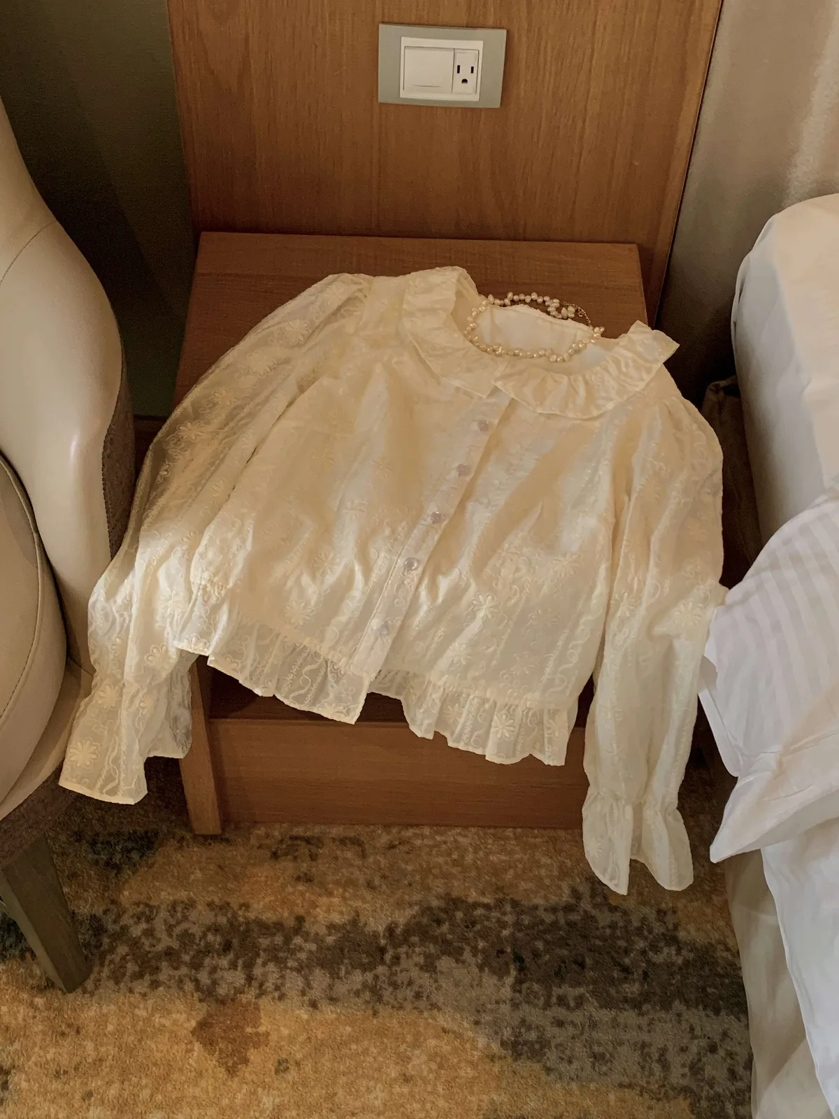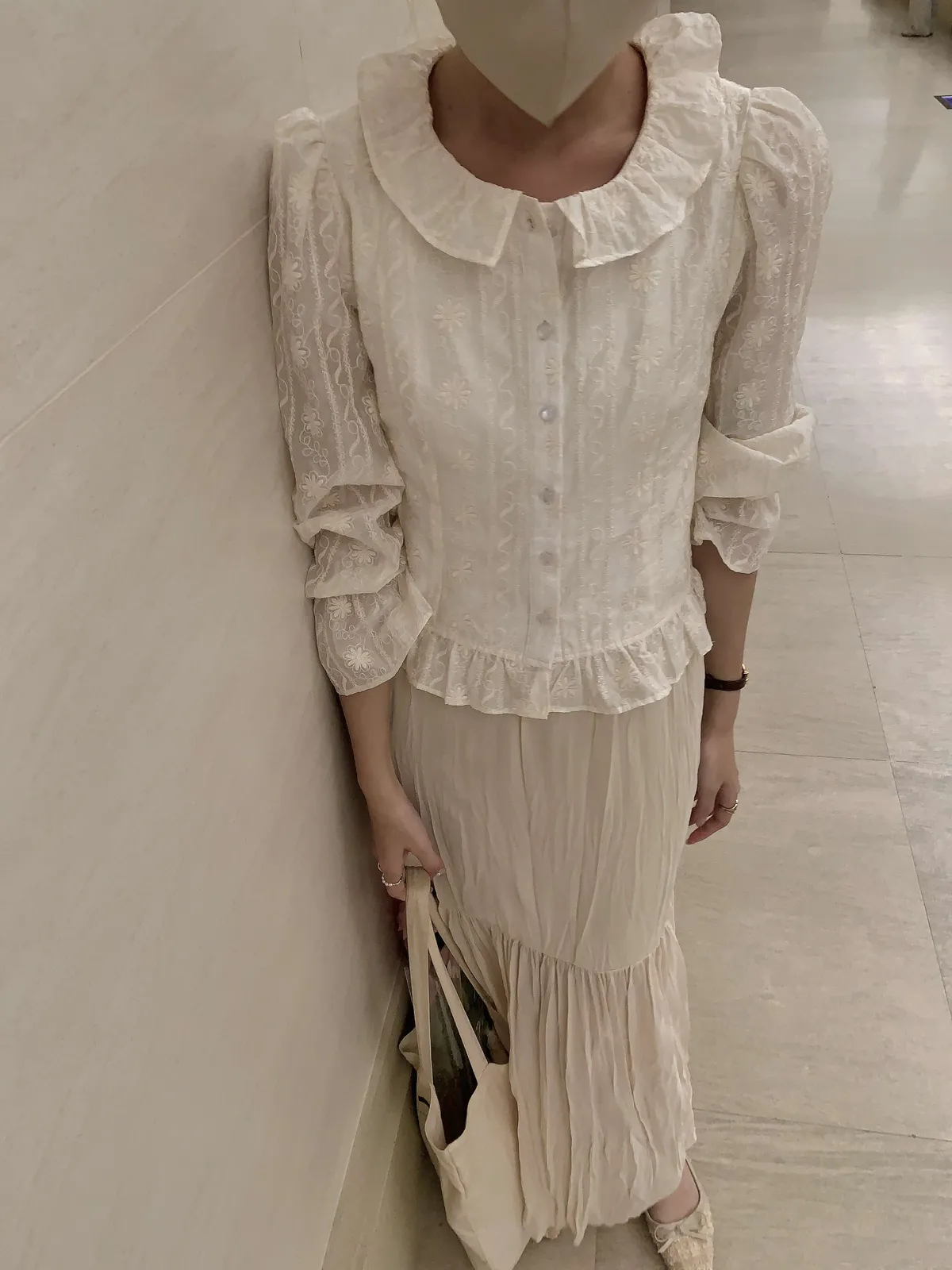 🇰🇷氣質雕花縮袖棉麻排釦上衣---米