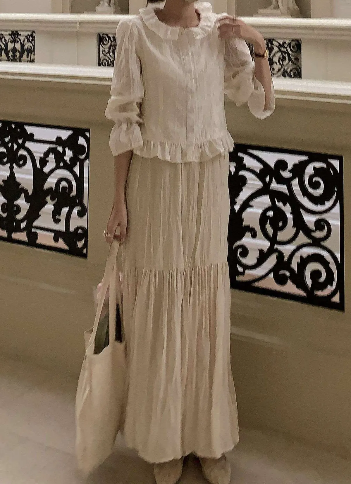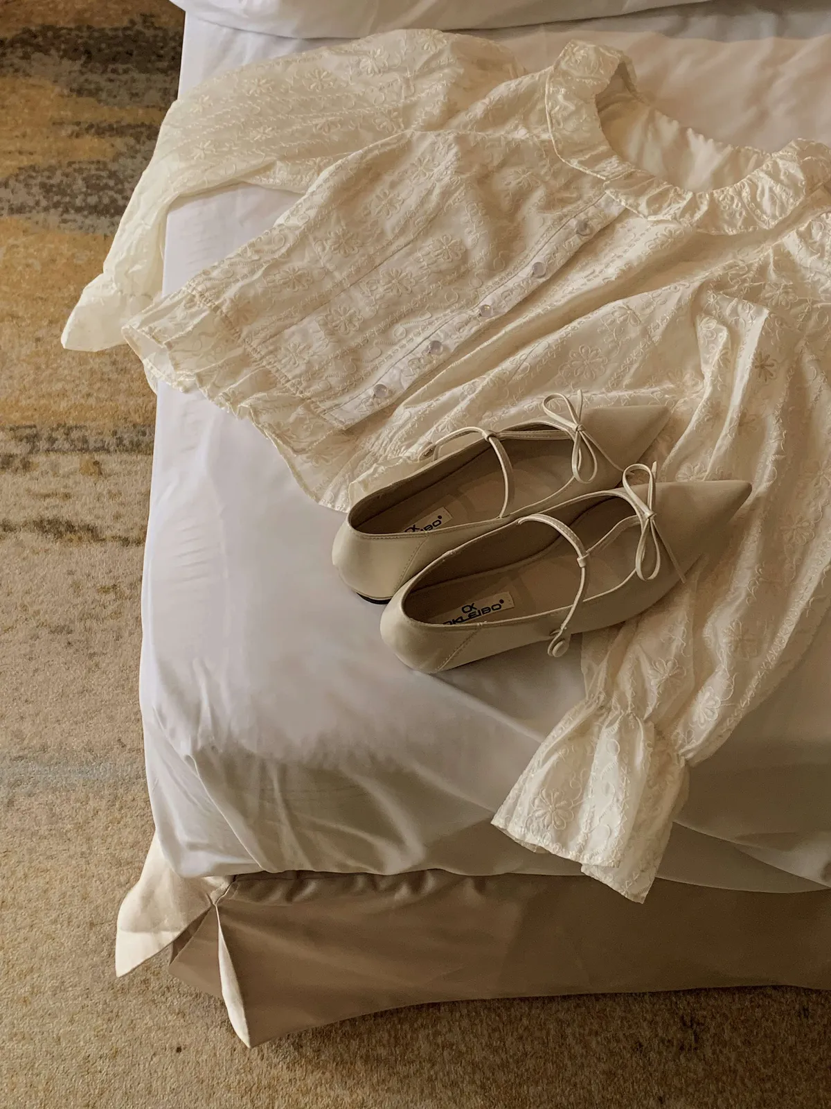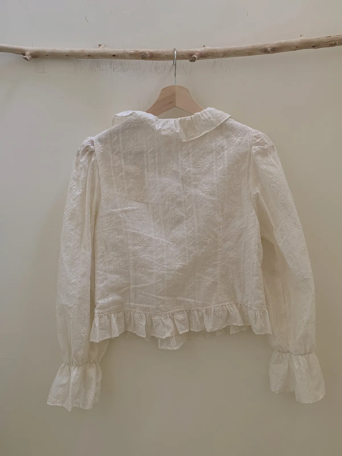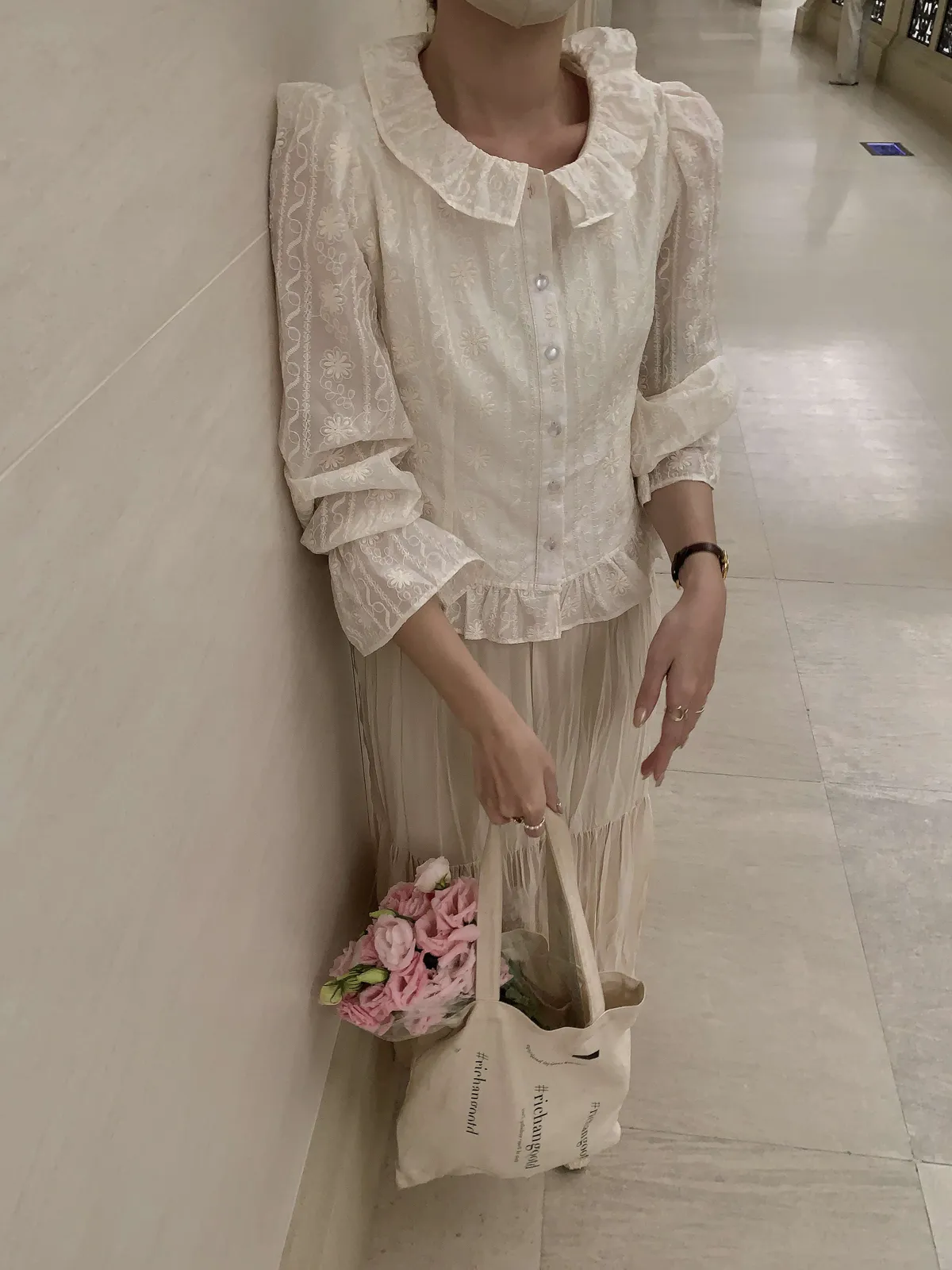 🇰🇷氣質雕花縮袖棉麻排釦上衣---米