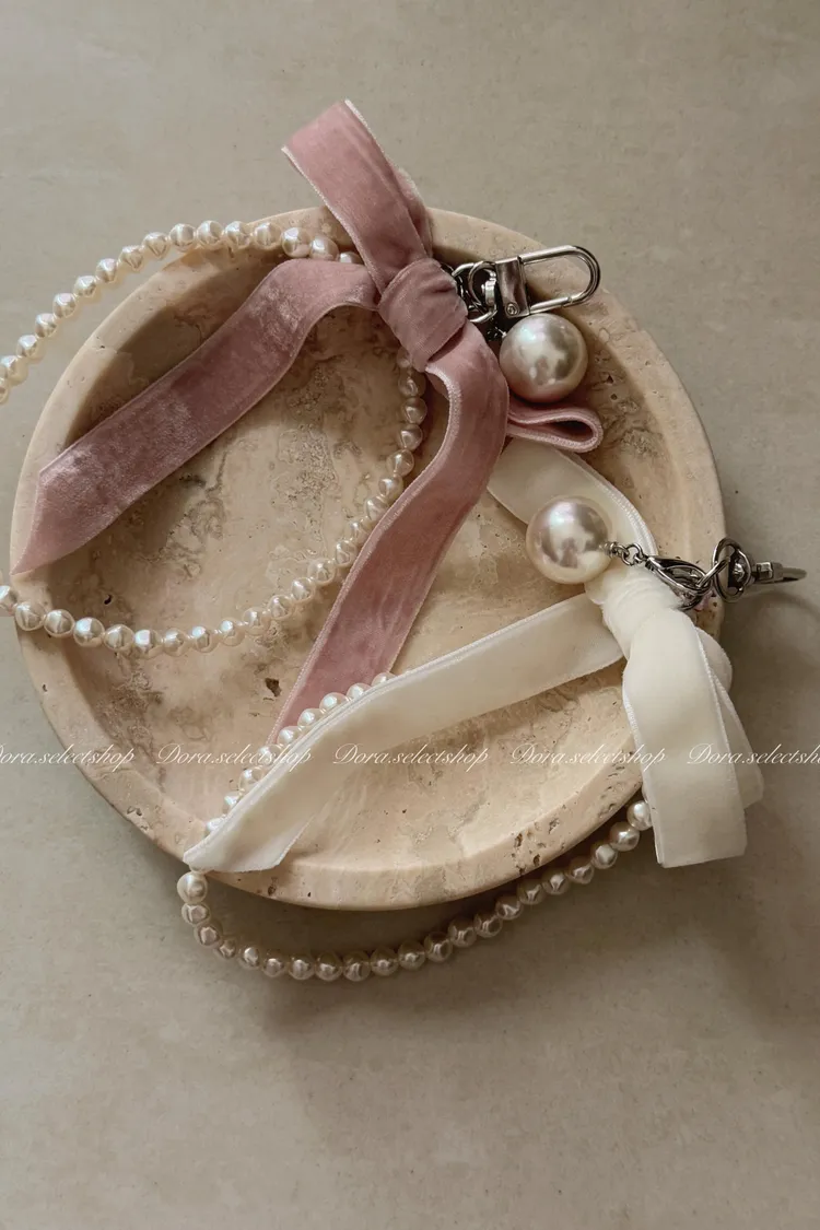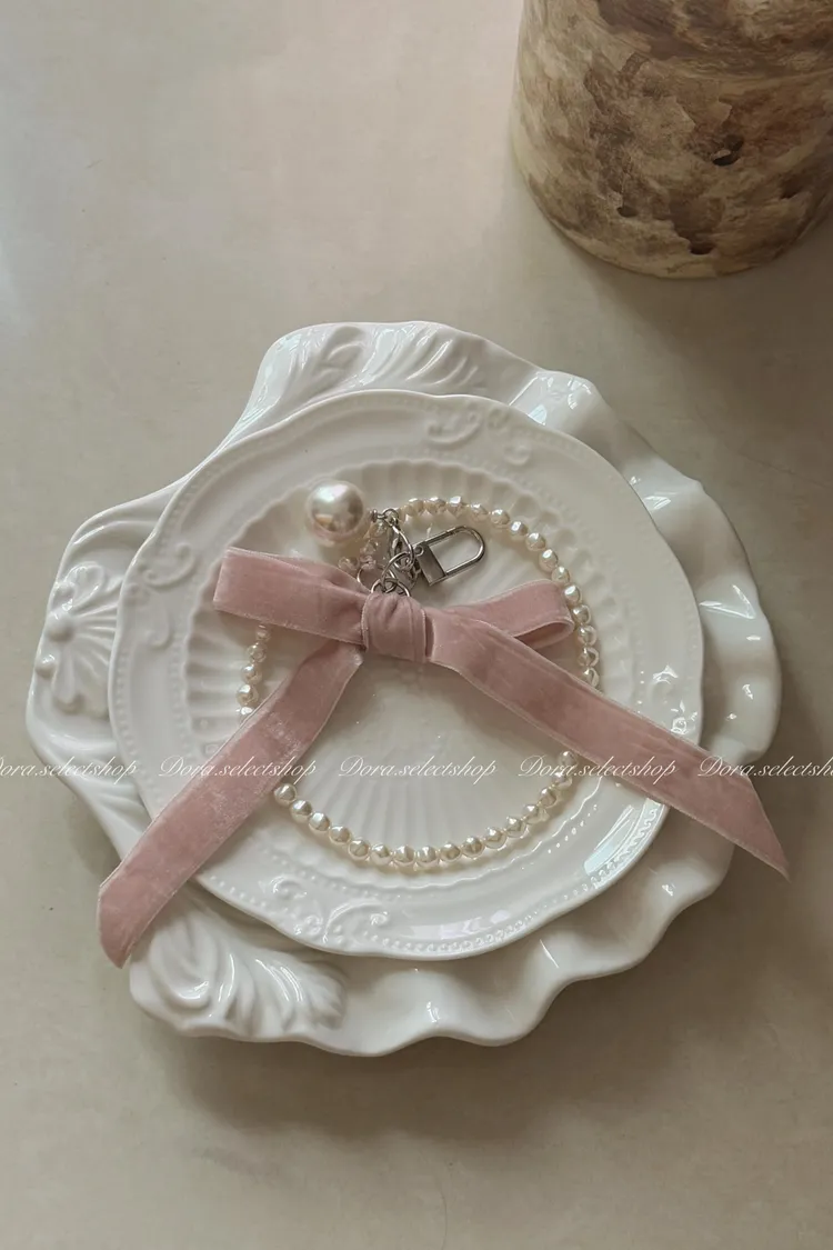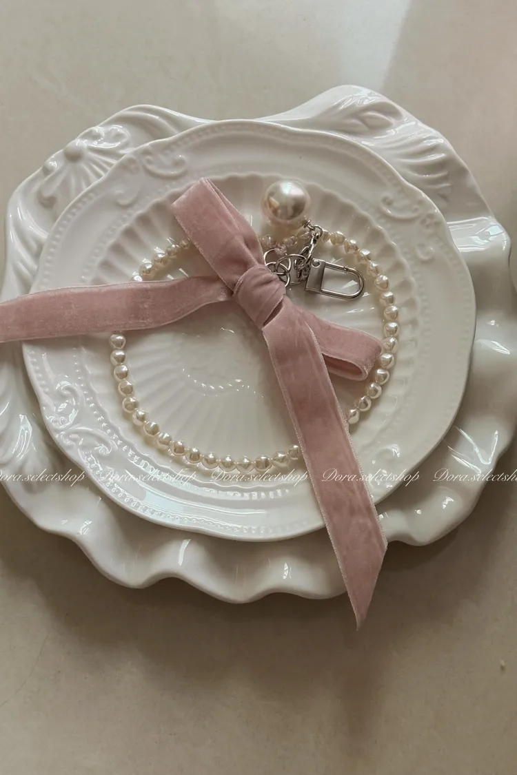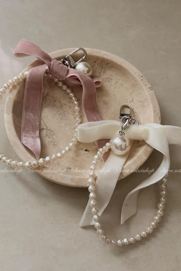 精緻小物🎀絨布蝴蝶結珍珠手機掛繩---粉
