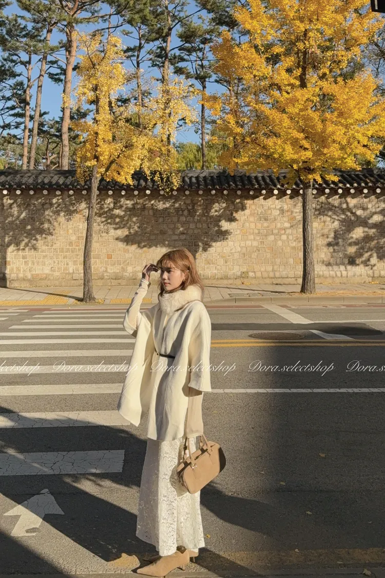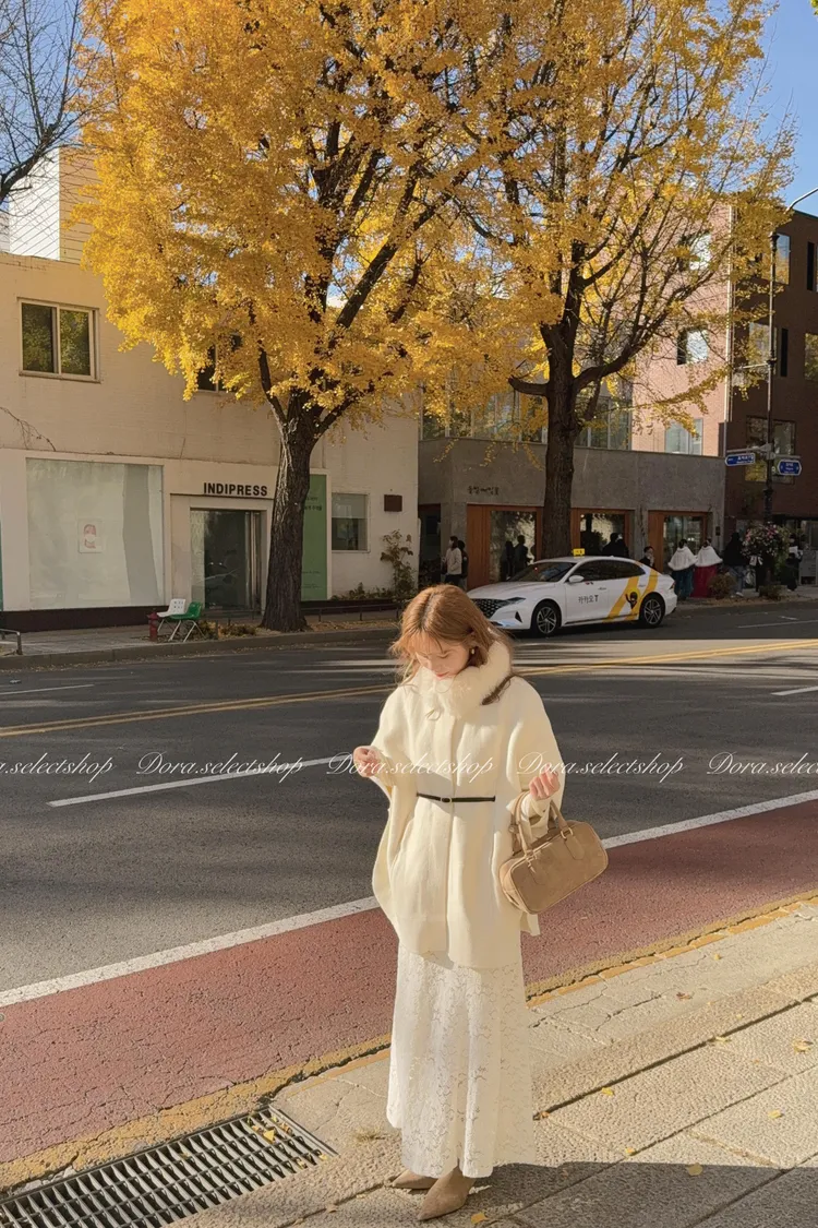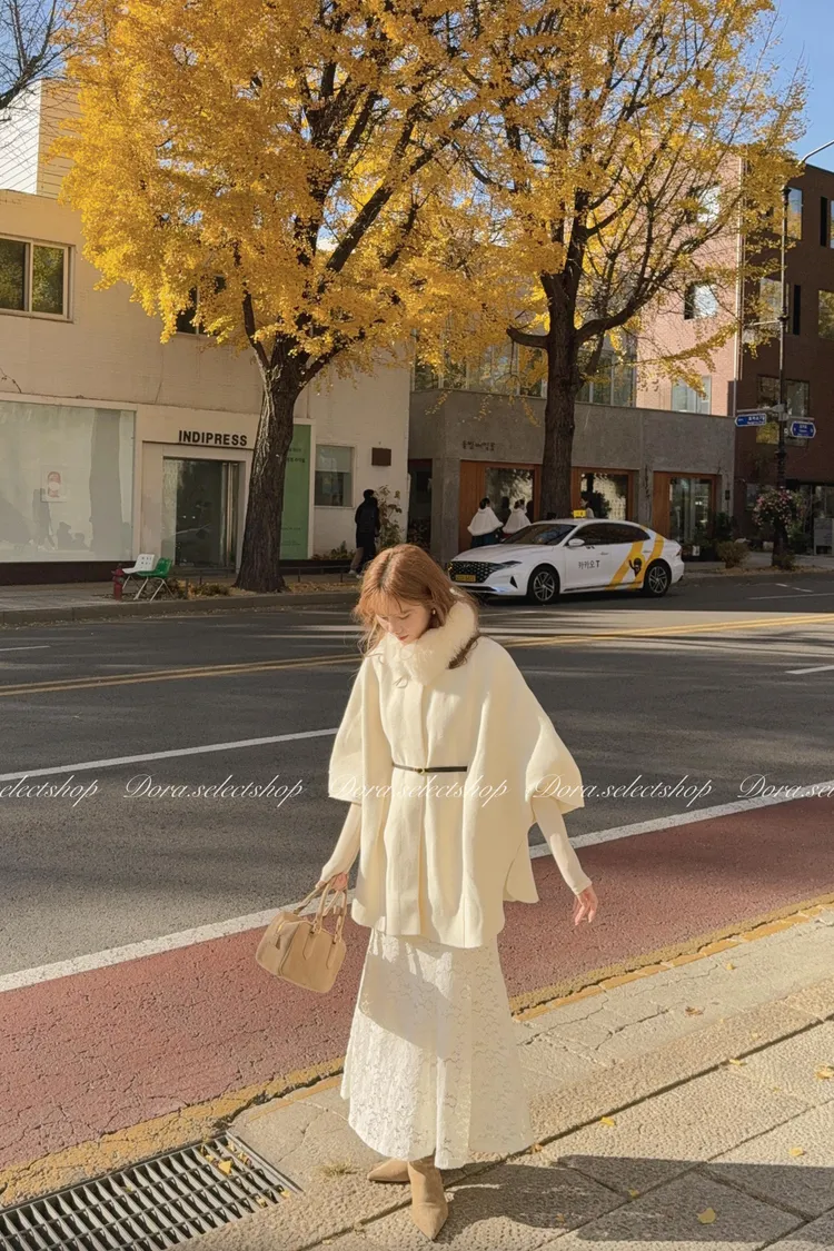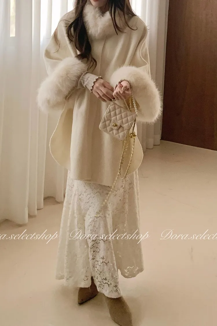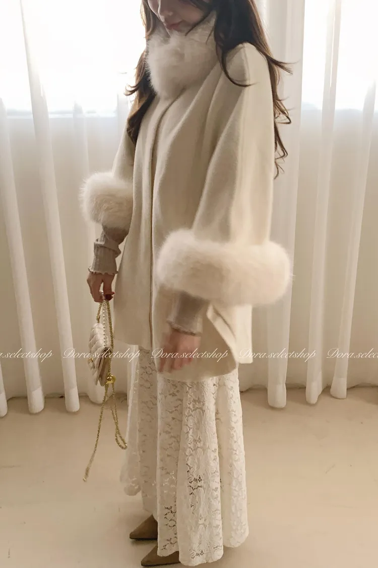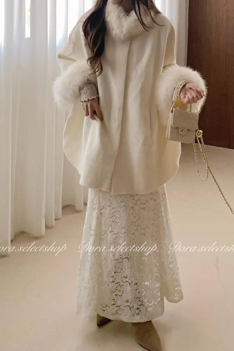 知性優雅毛毛中長版斗篷大衣(附腰帶)—-奶白