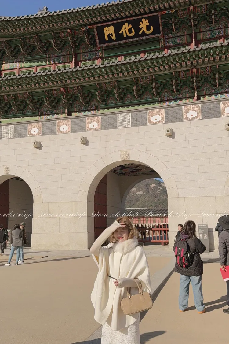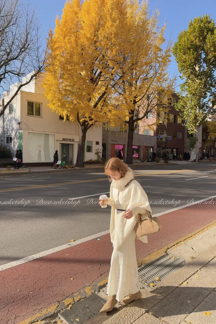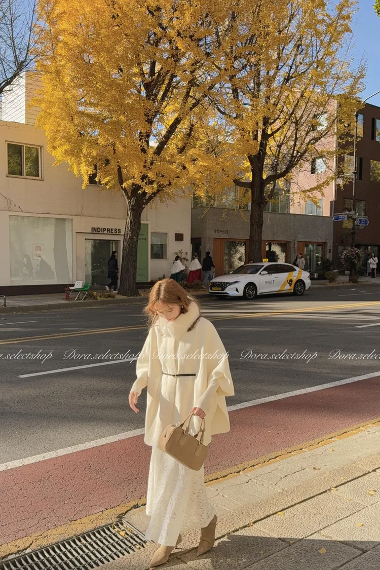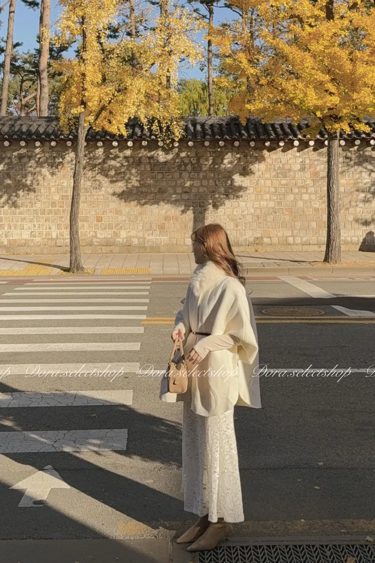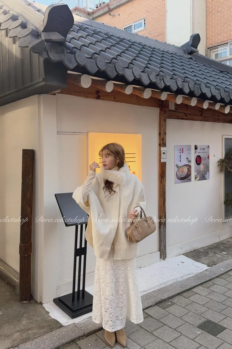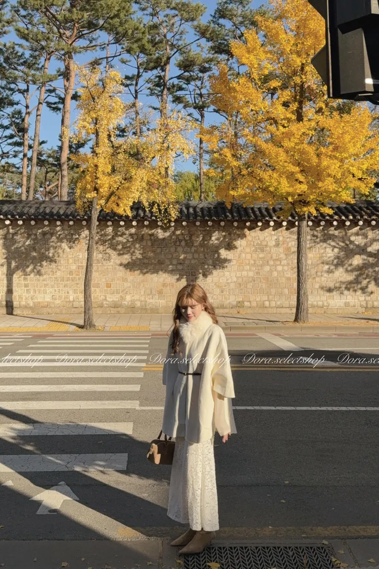 知性優雅毛毛中長版斗篷大衣(附腰帶)—-奶白