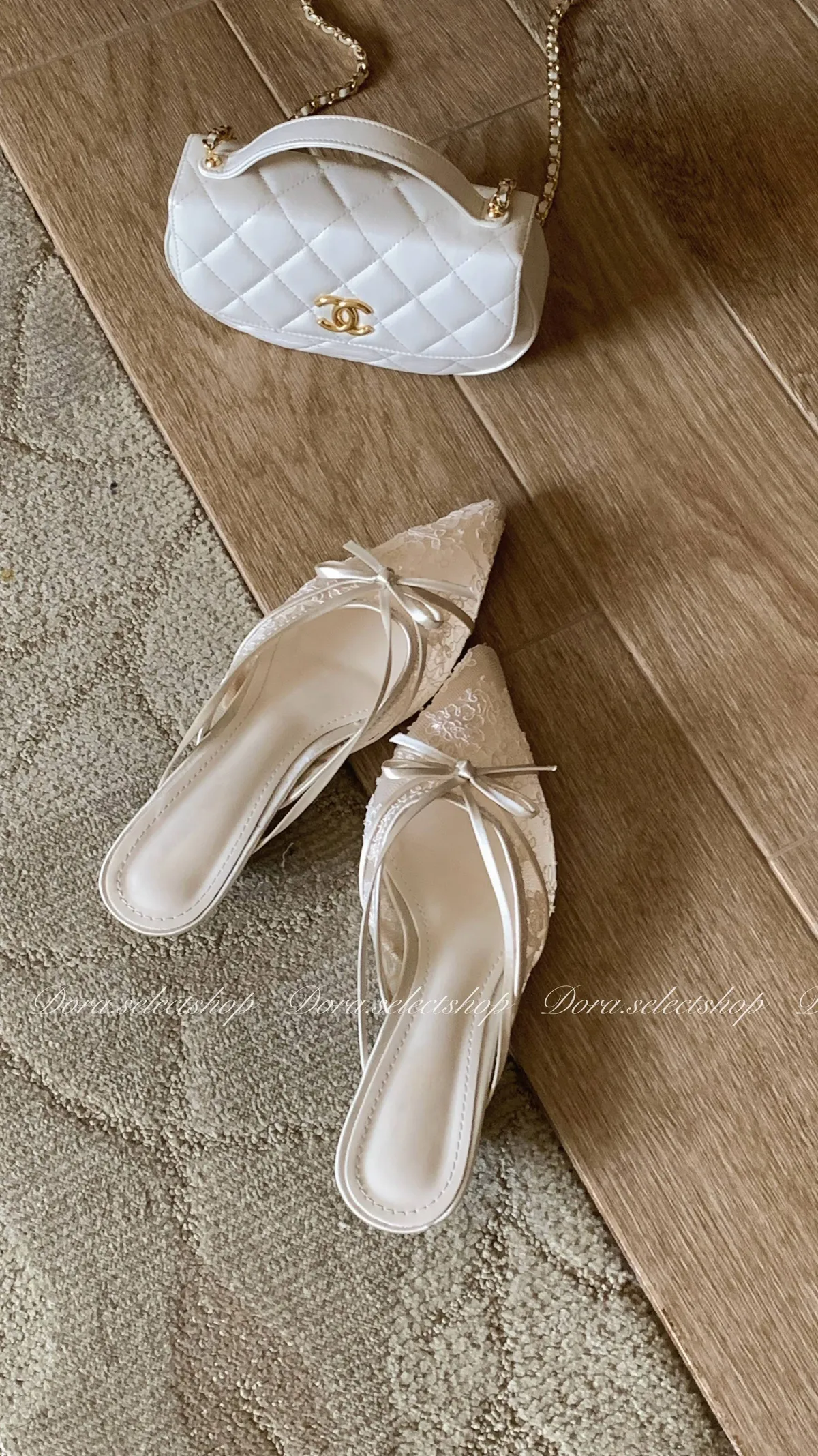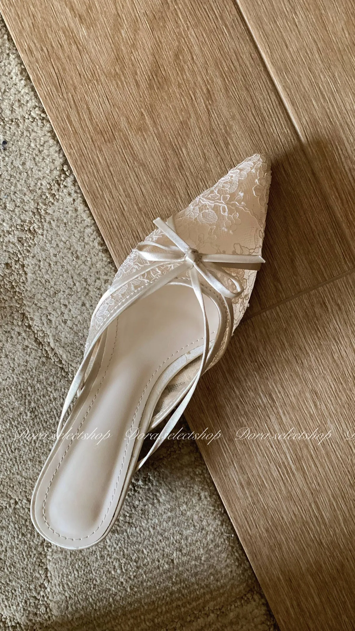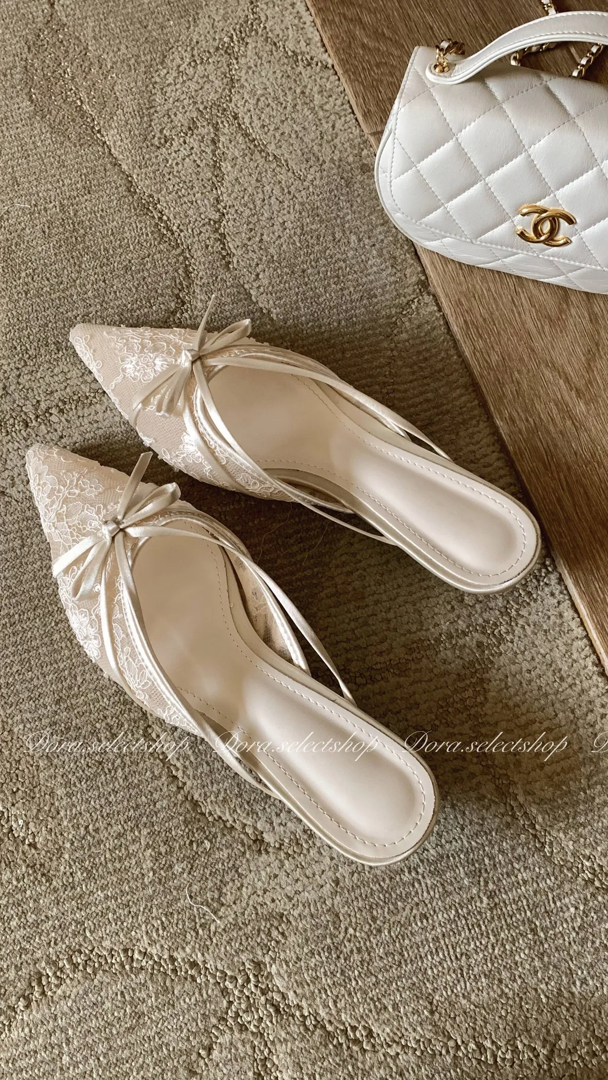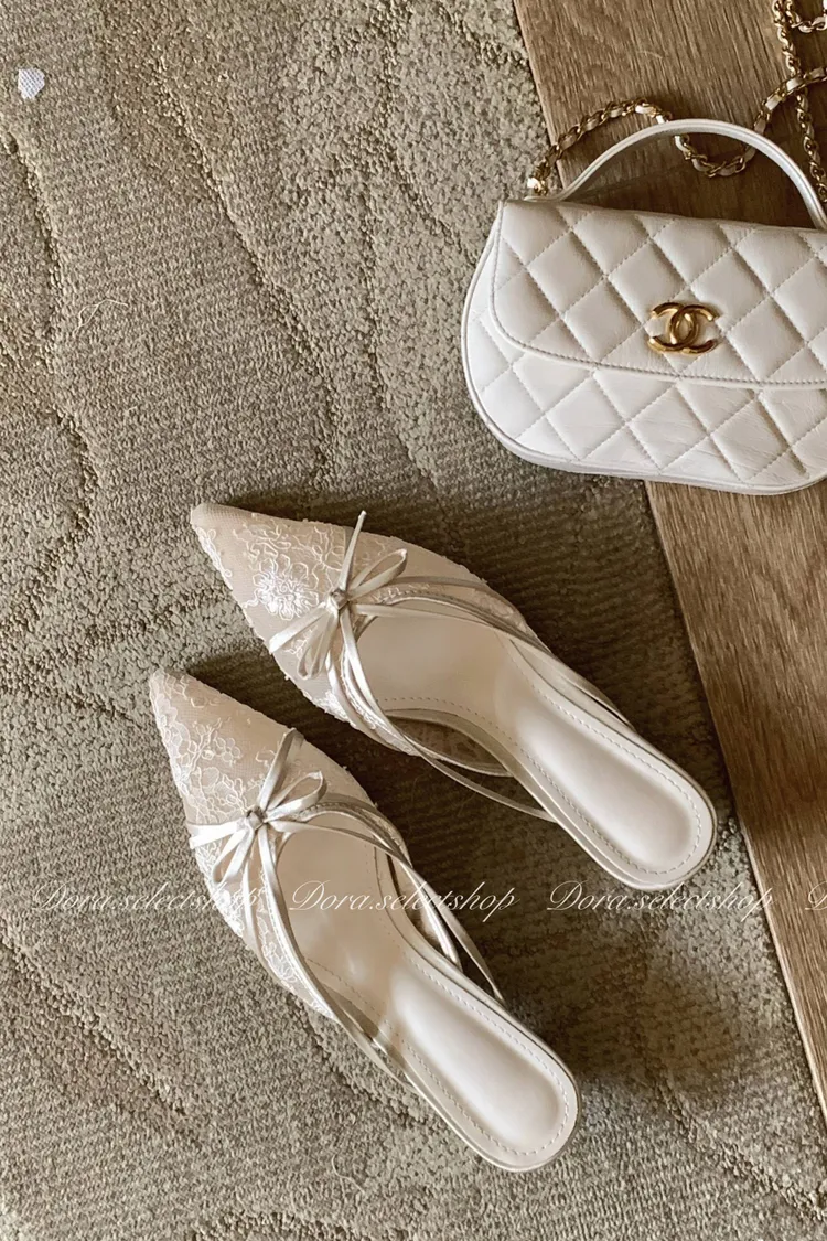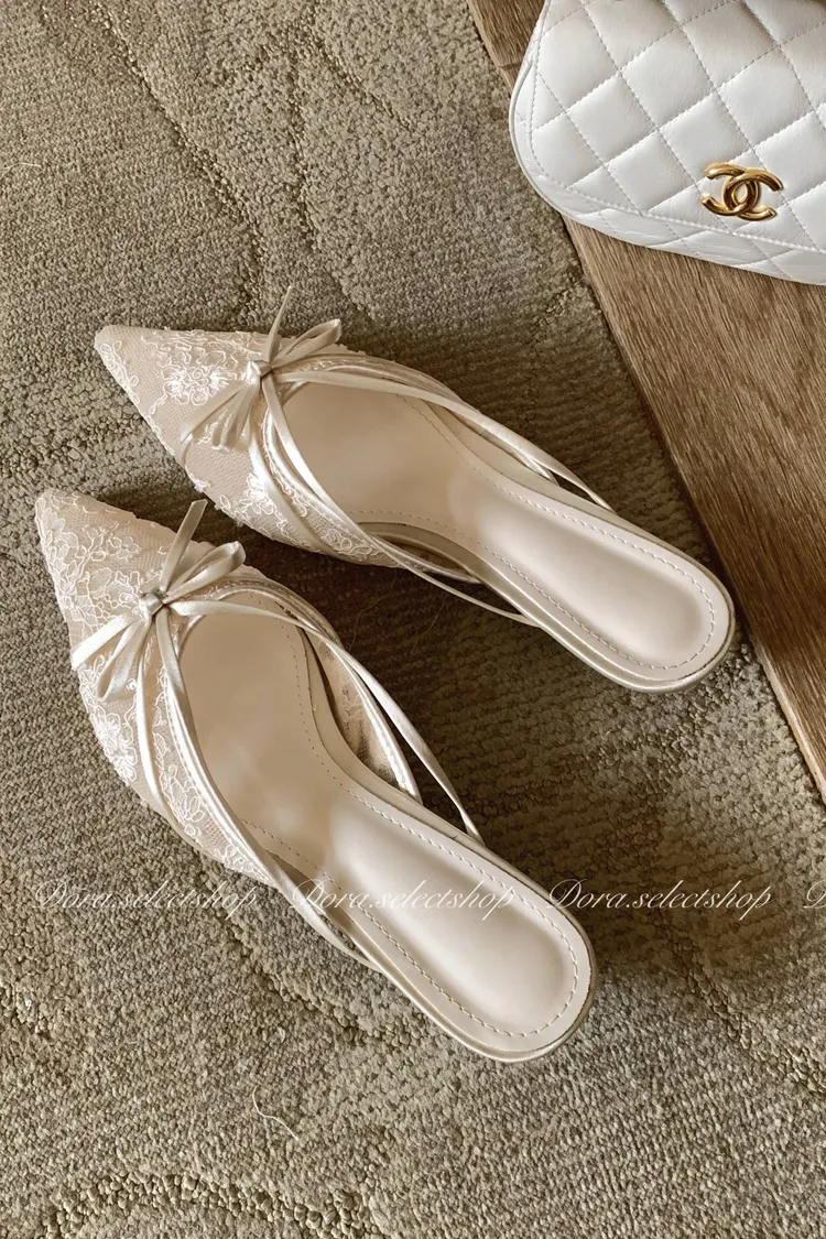 輕法式浪漫蕾絲緞帶低跟鞋---米
