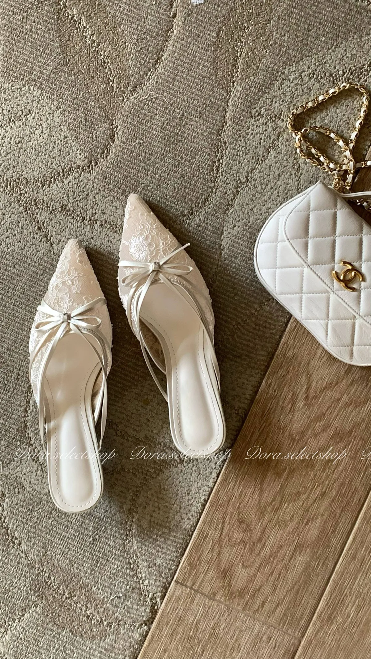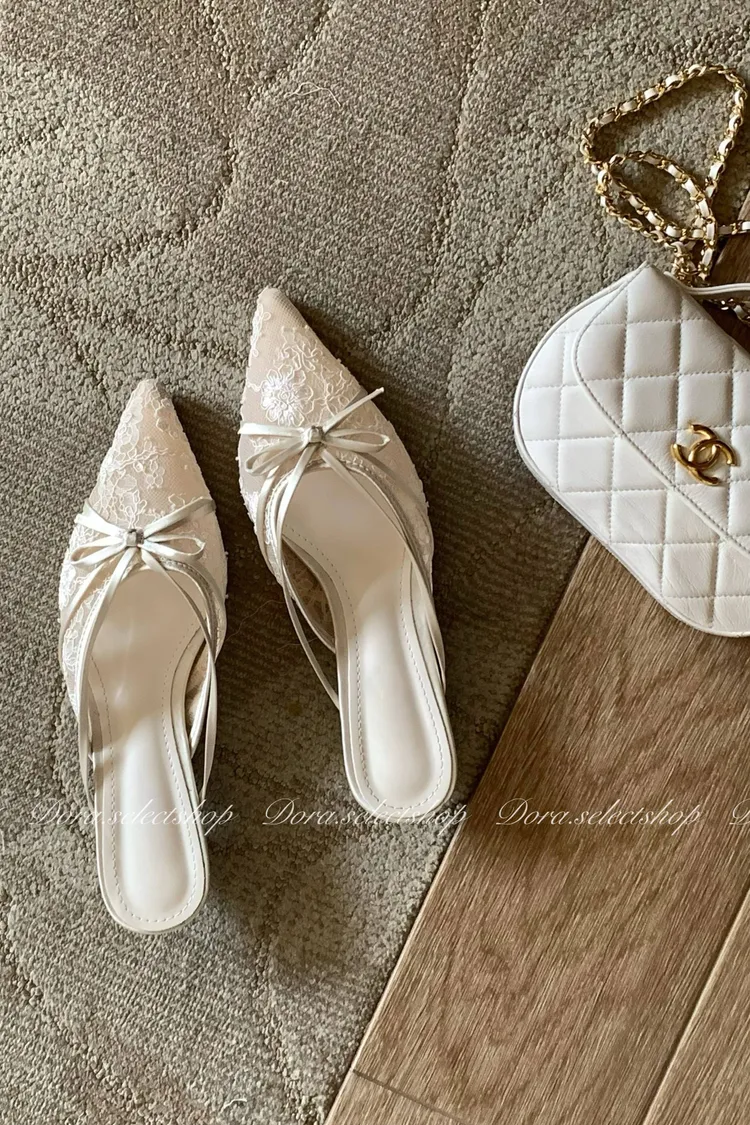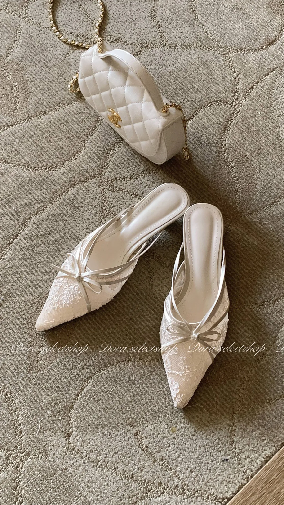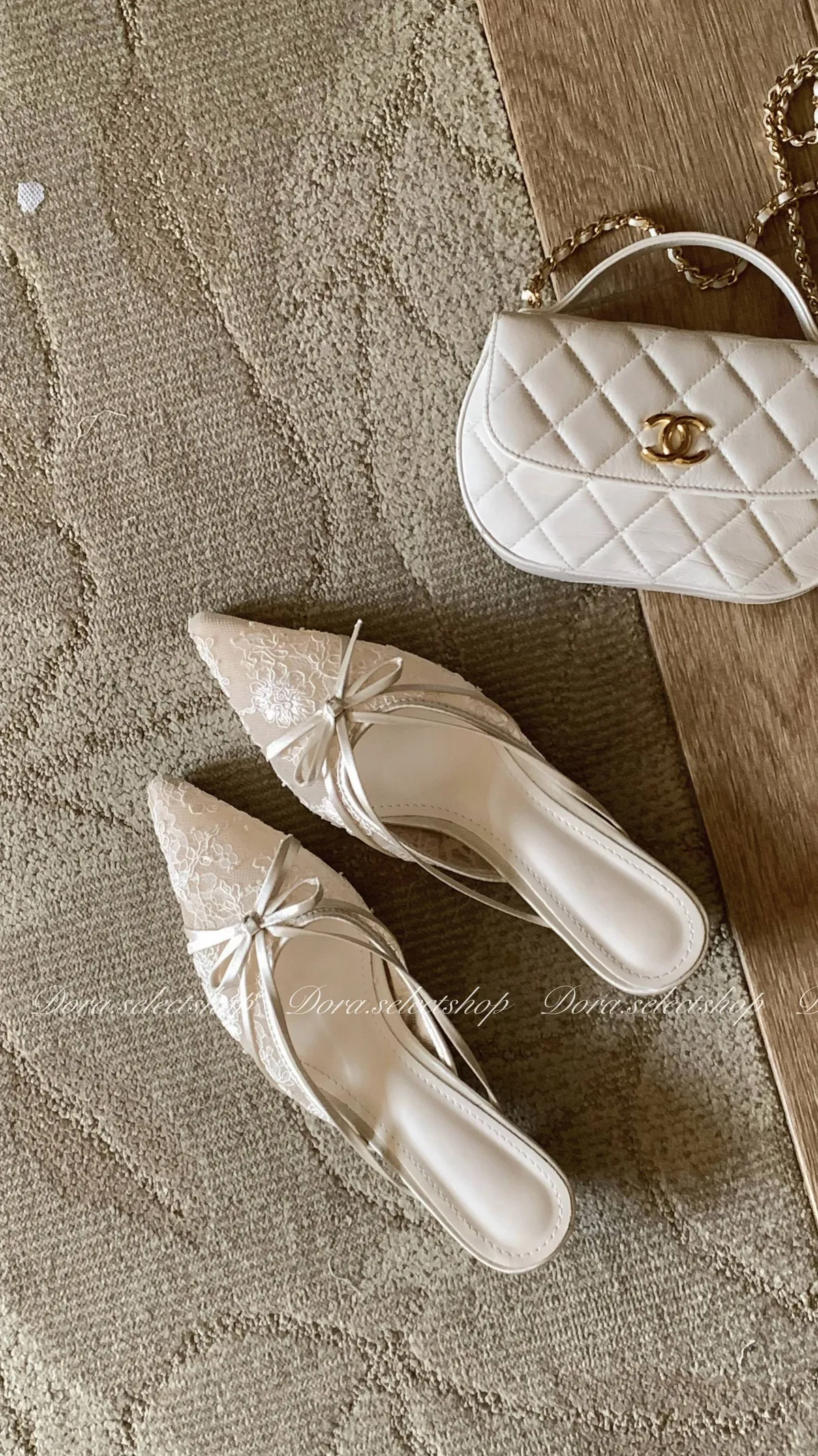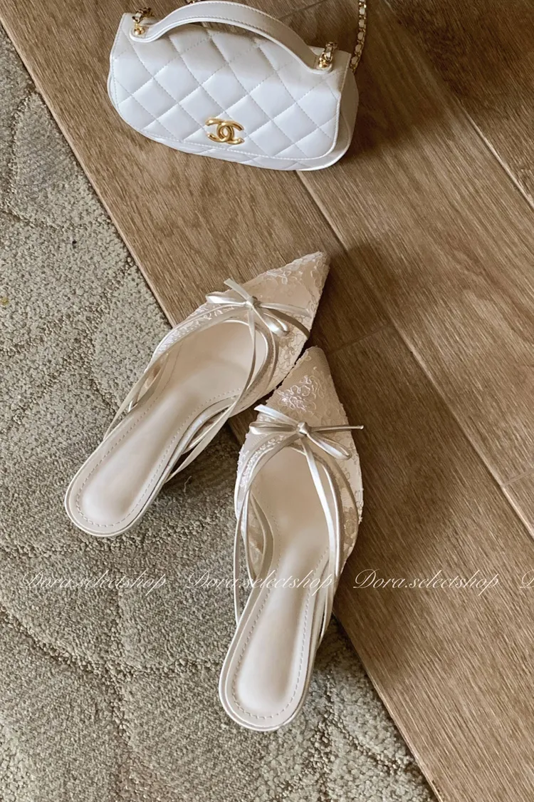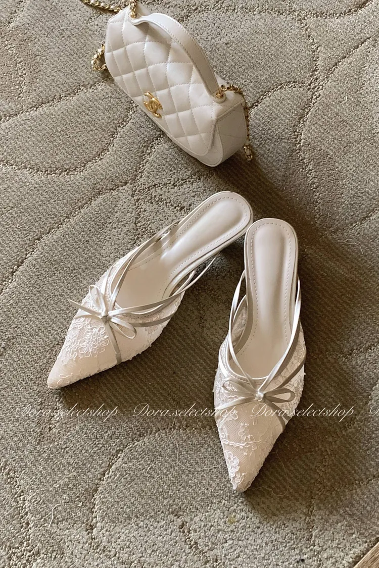 輕法式浪漫蕾絲緞帶低跟鞋---米