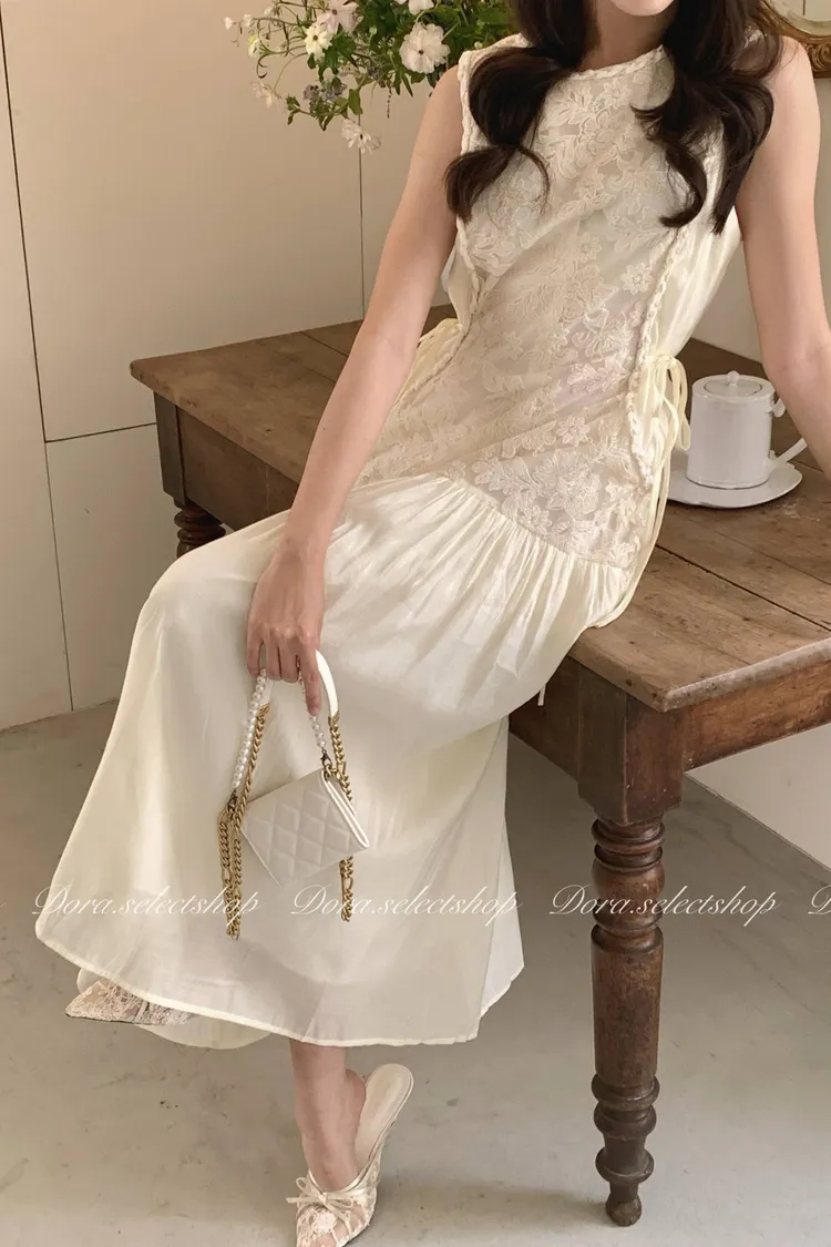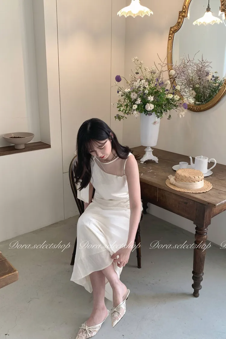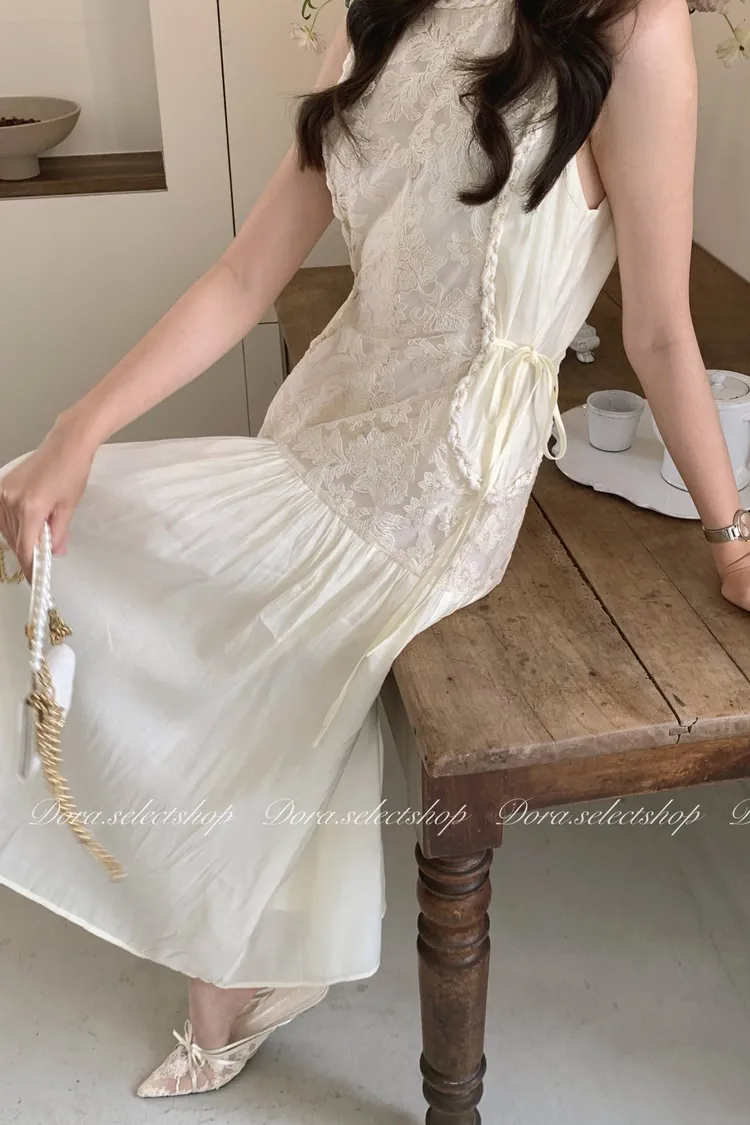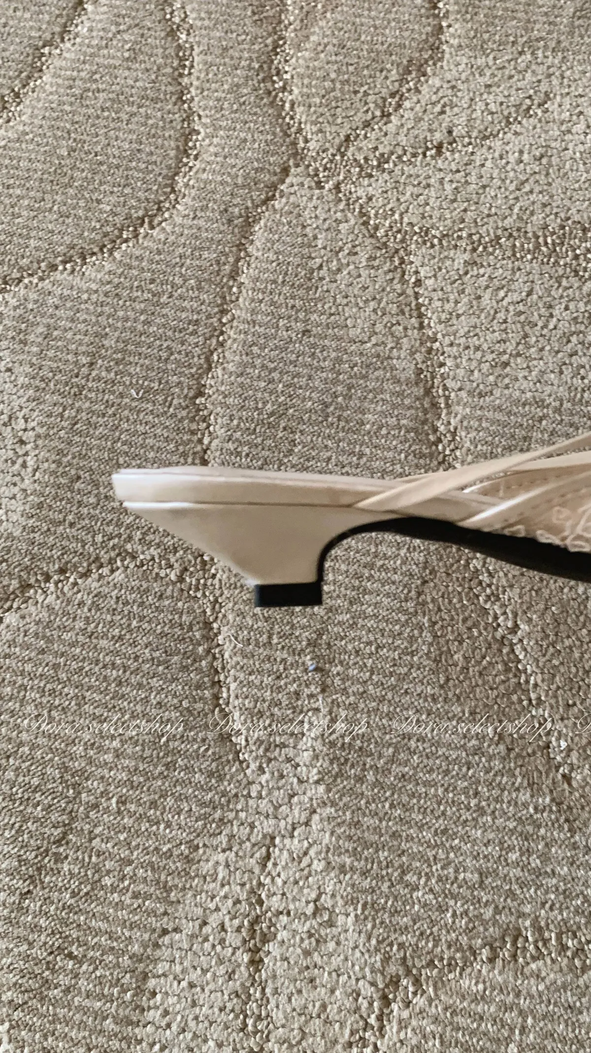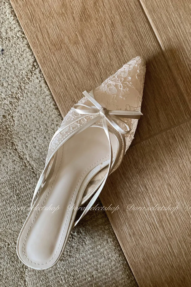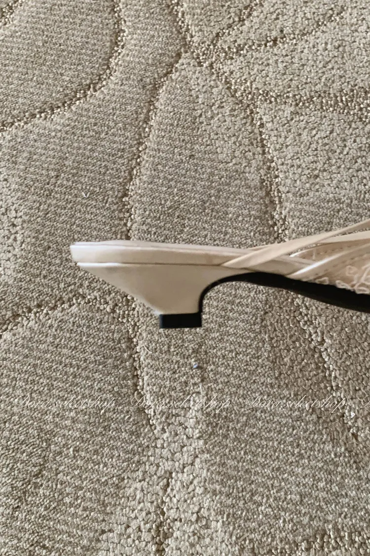 輕法式浪漫蕾絲緞帶低跟鞋---米