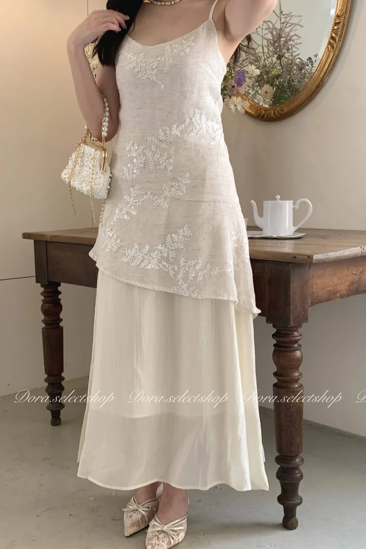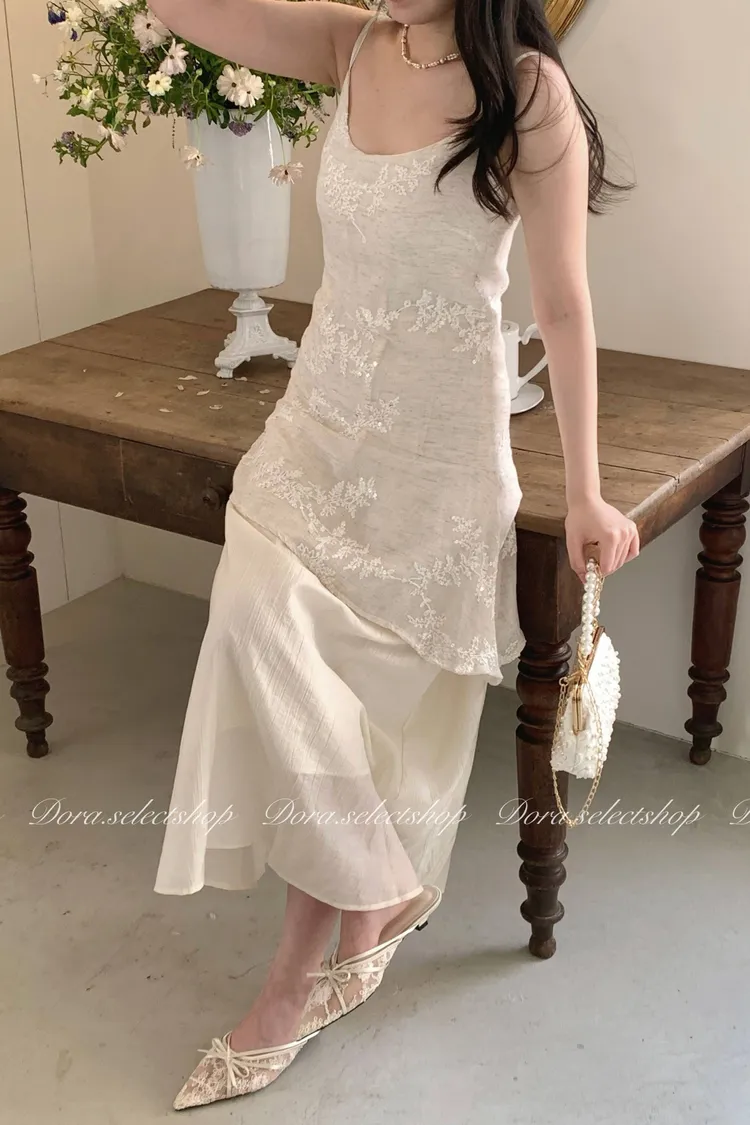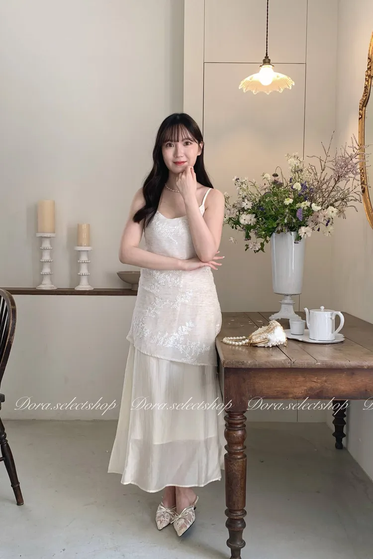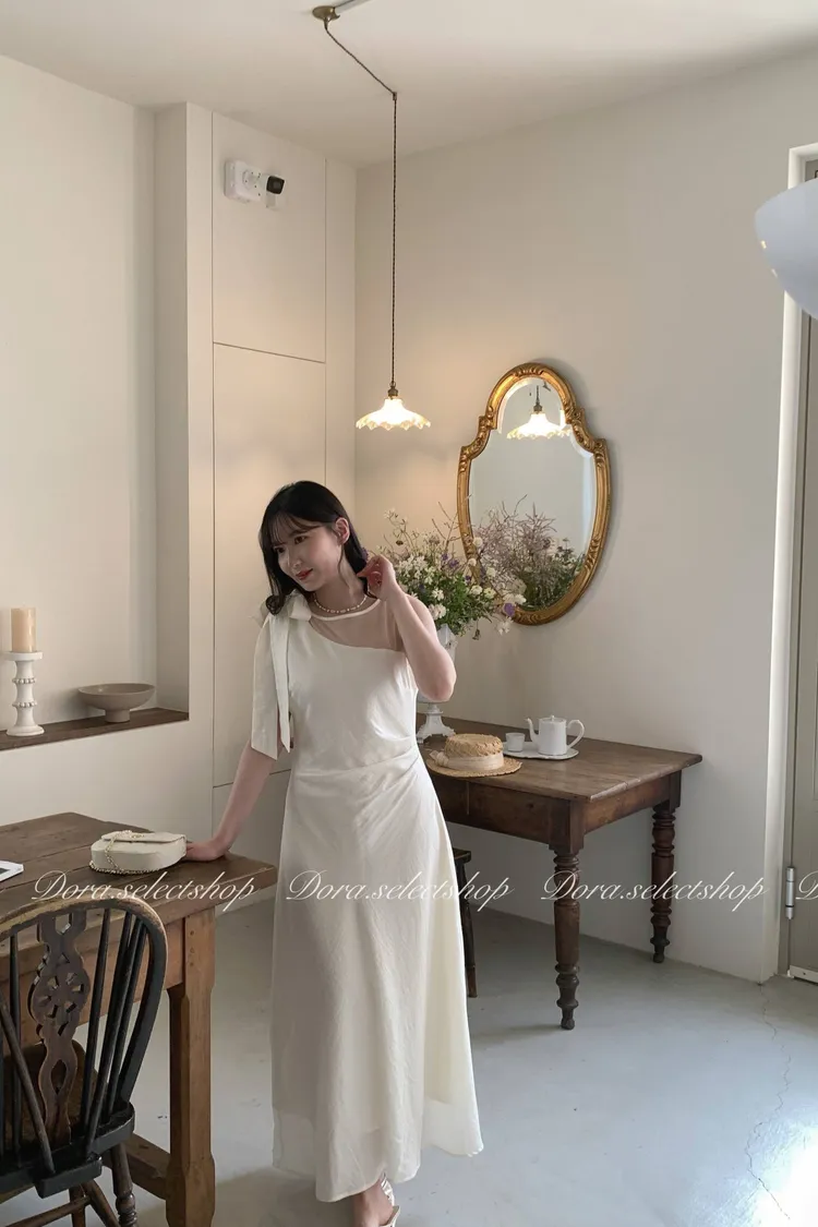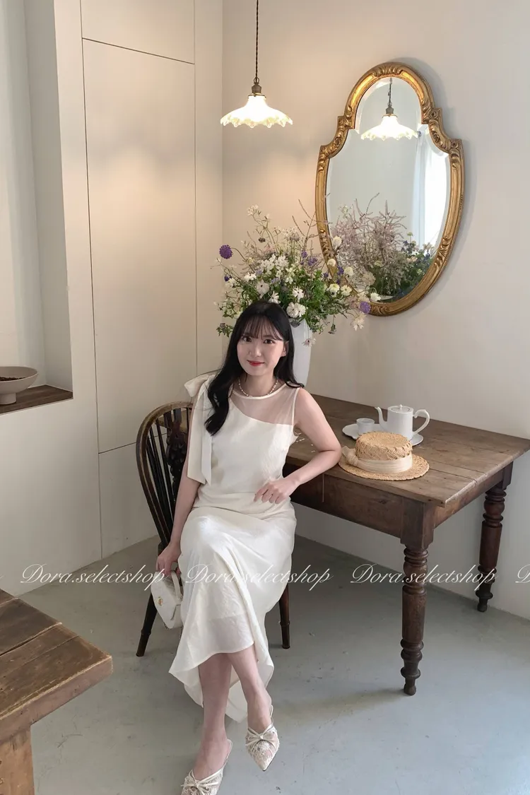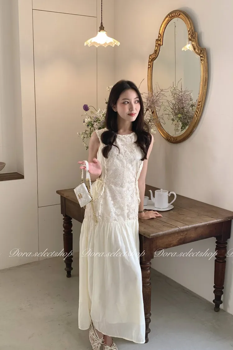 輕法式浪漫蕾絲緞帶低跟鞋---米