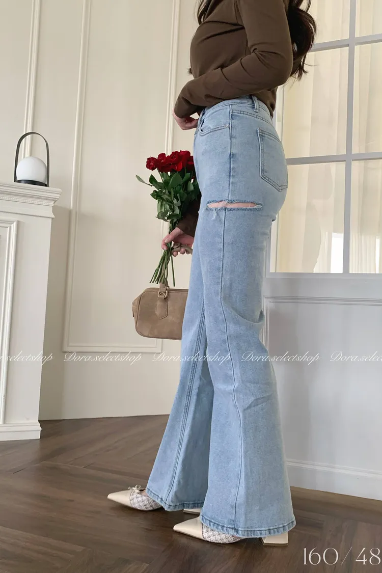 超瘦!!!挺版側割破牛仔喇叭褲---藍