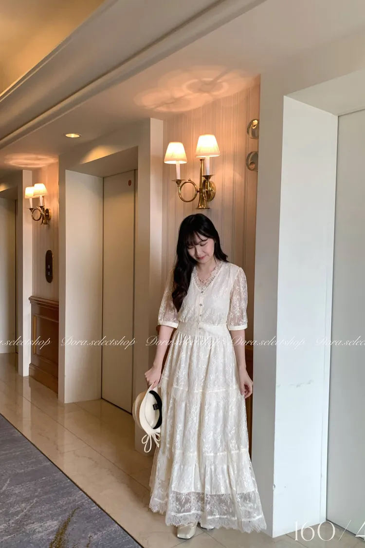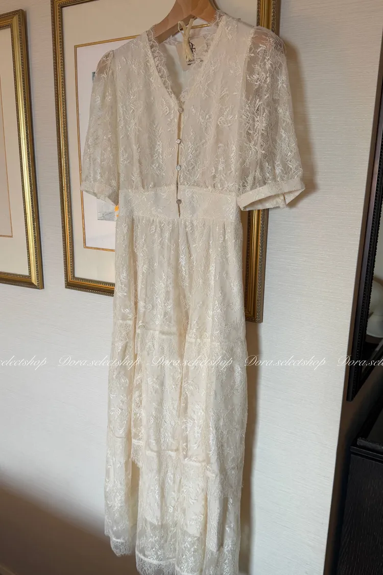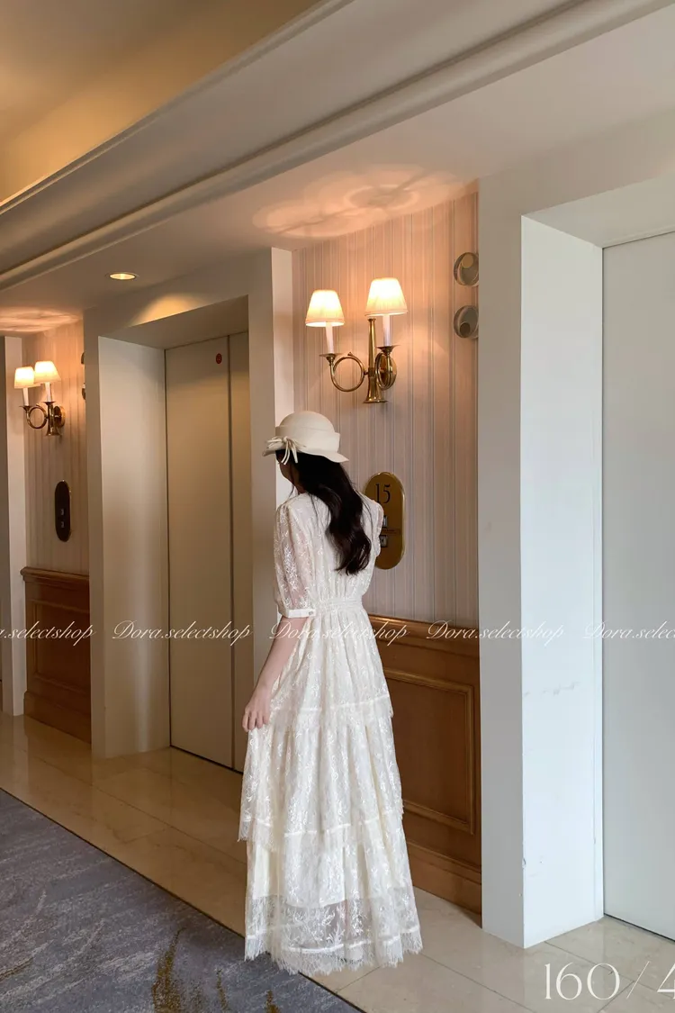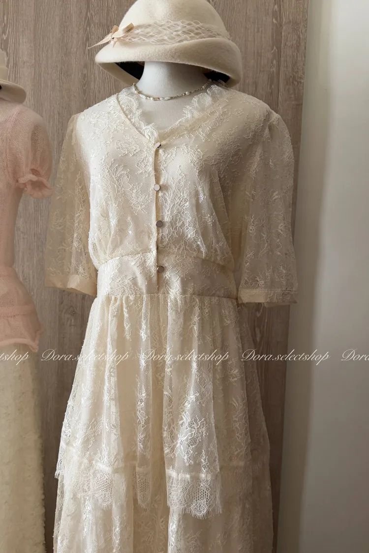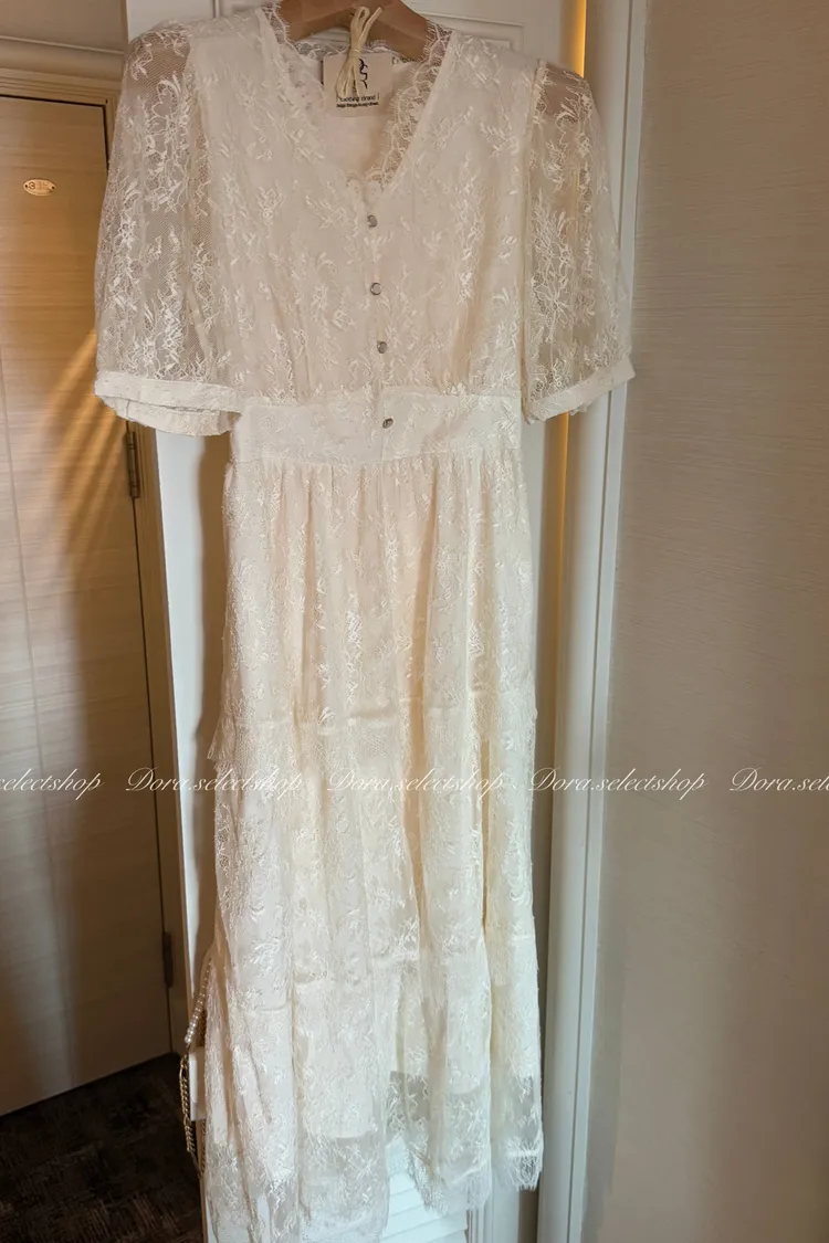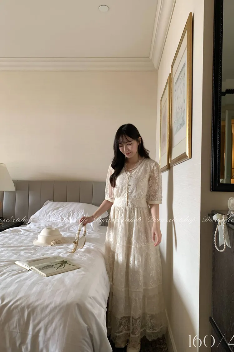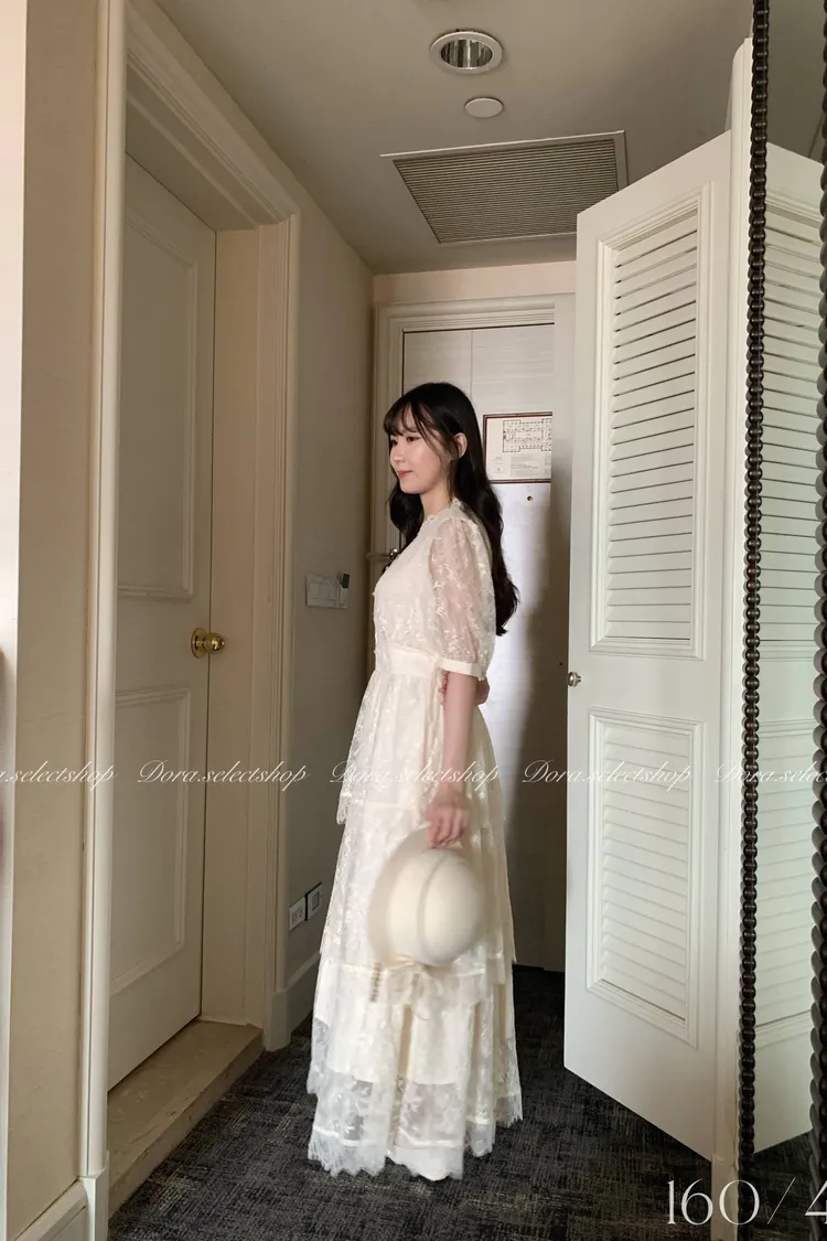 優雅氛圍感蕾絲蛋糕長洋裝---米