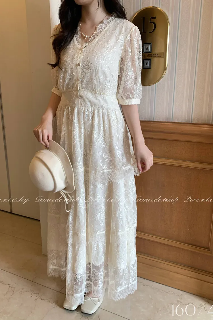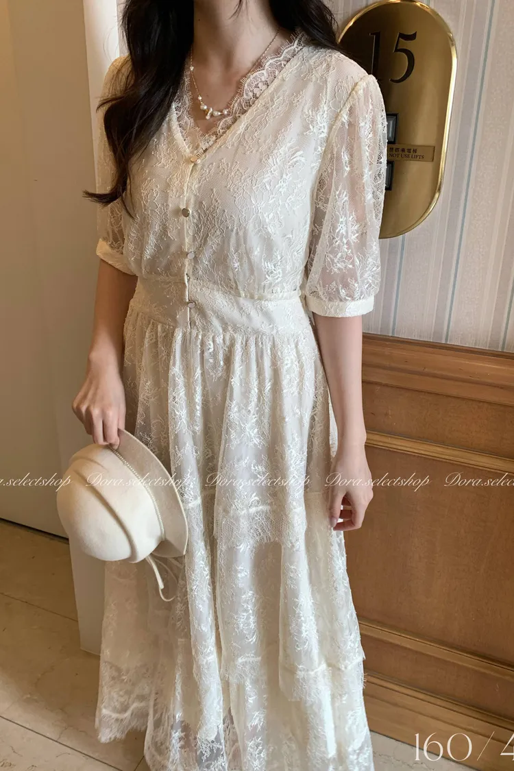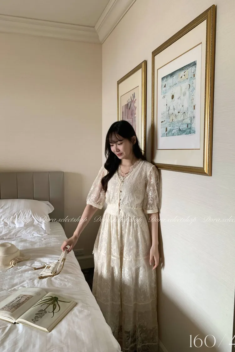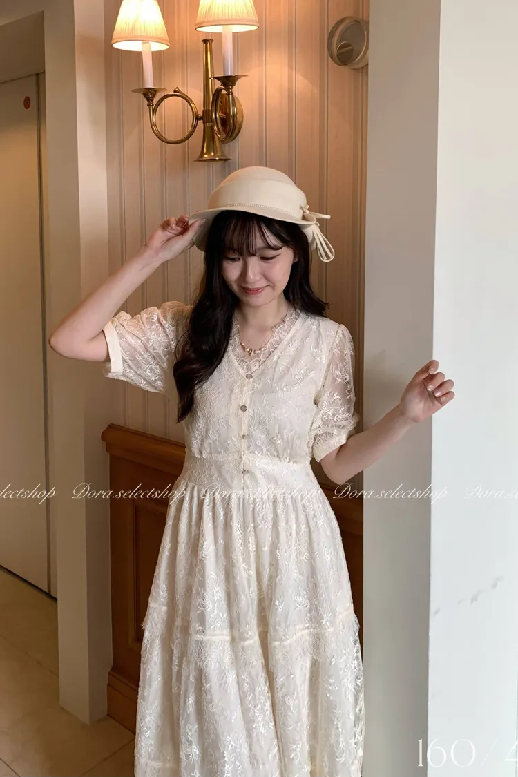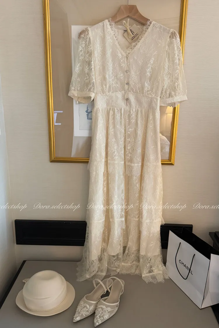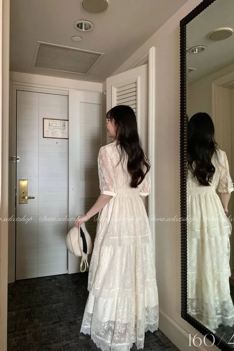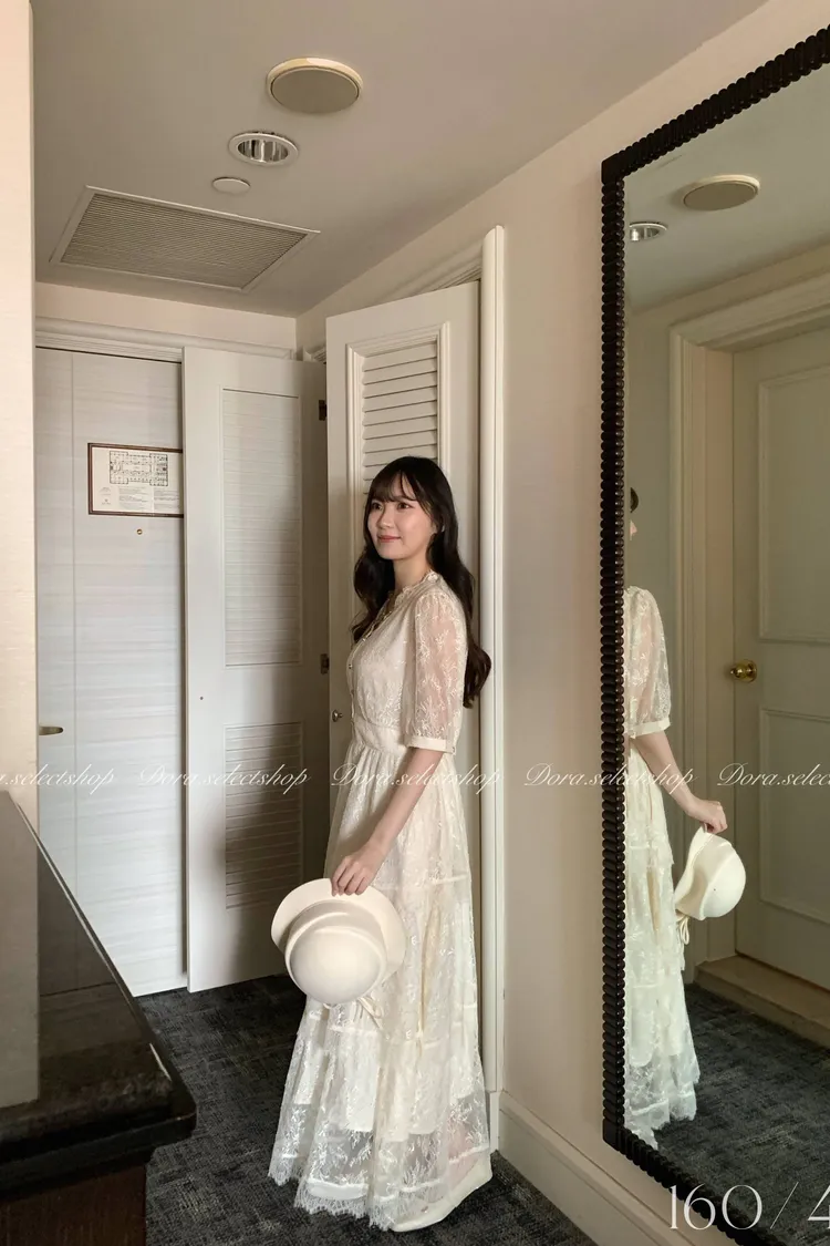優雅氛圍感蕾絲蛋糕長洋裝---米