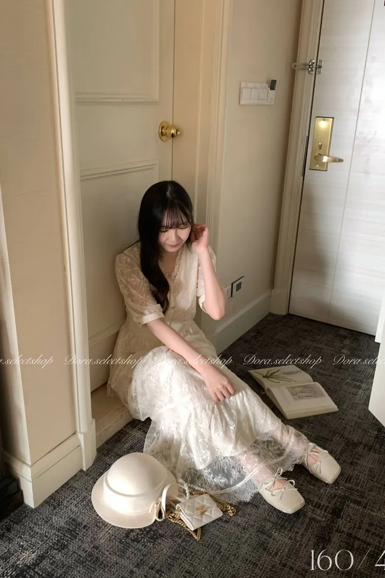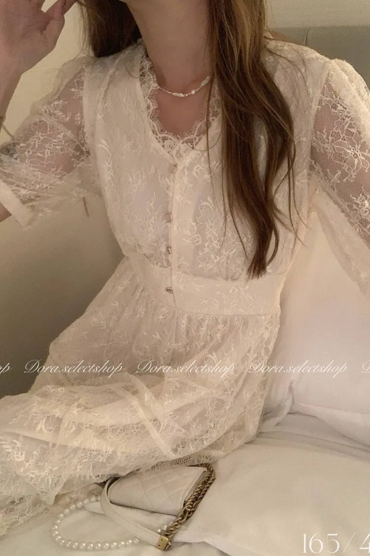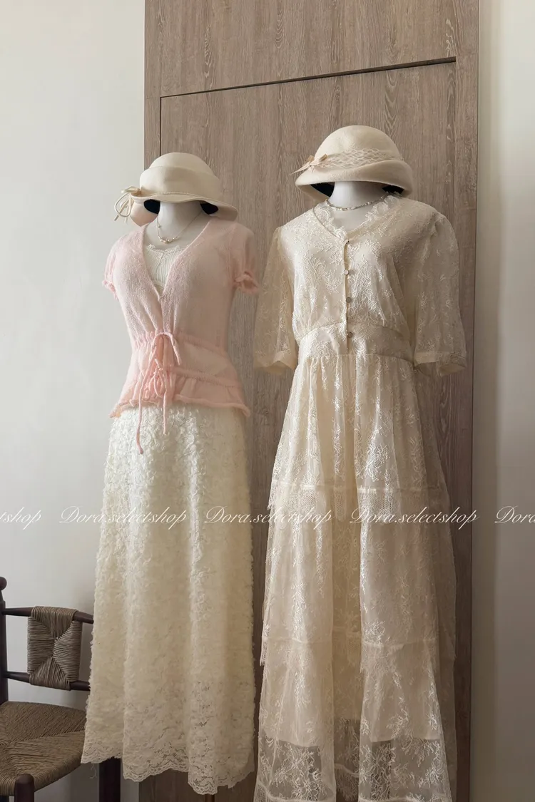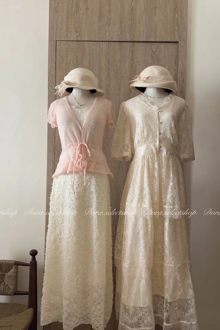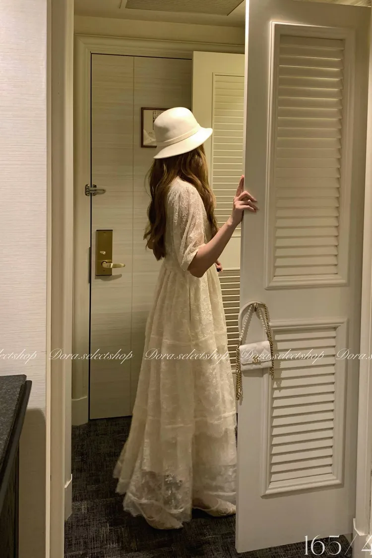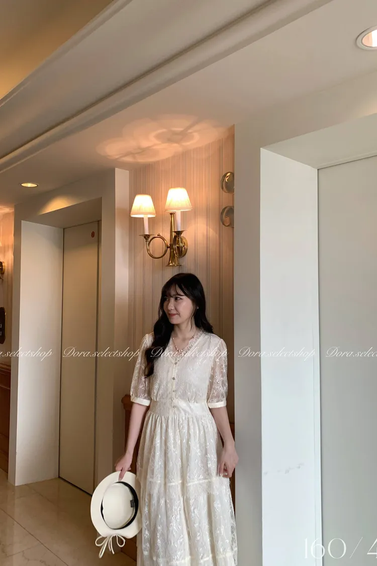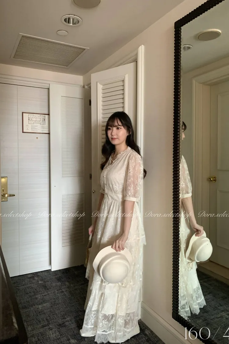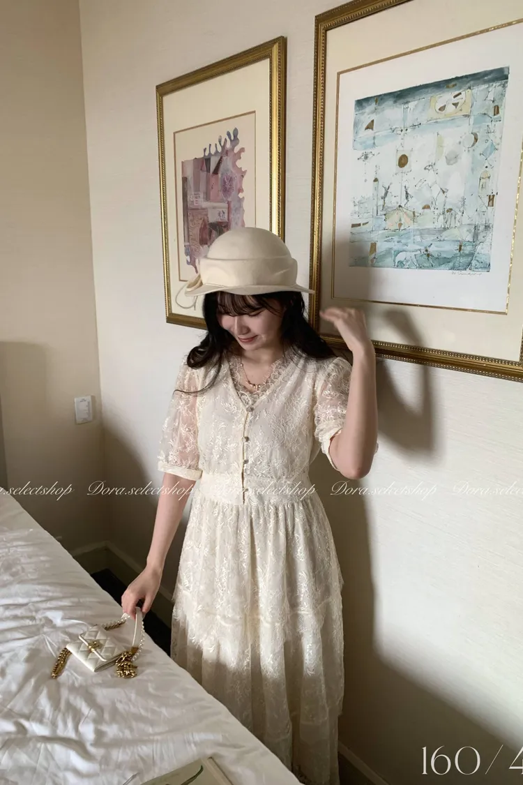 優雅氛圍感蕾絲蛋糕長洋裝---米