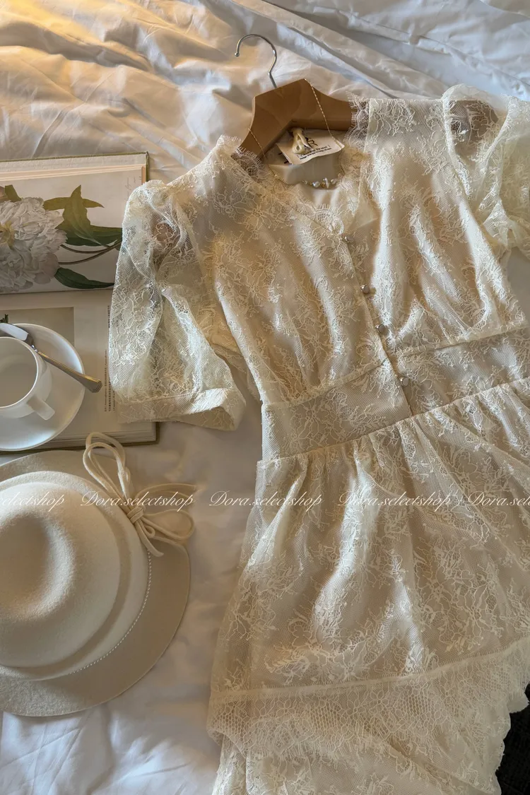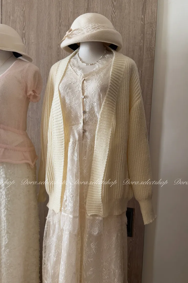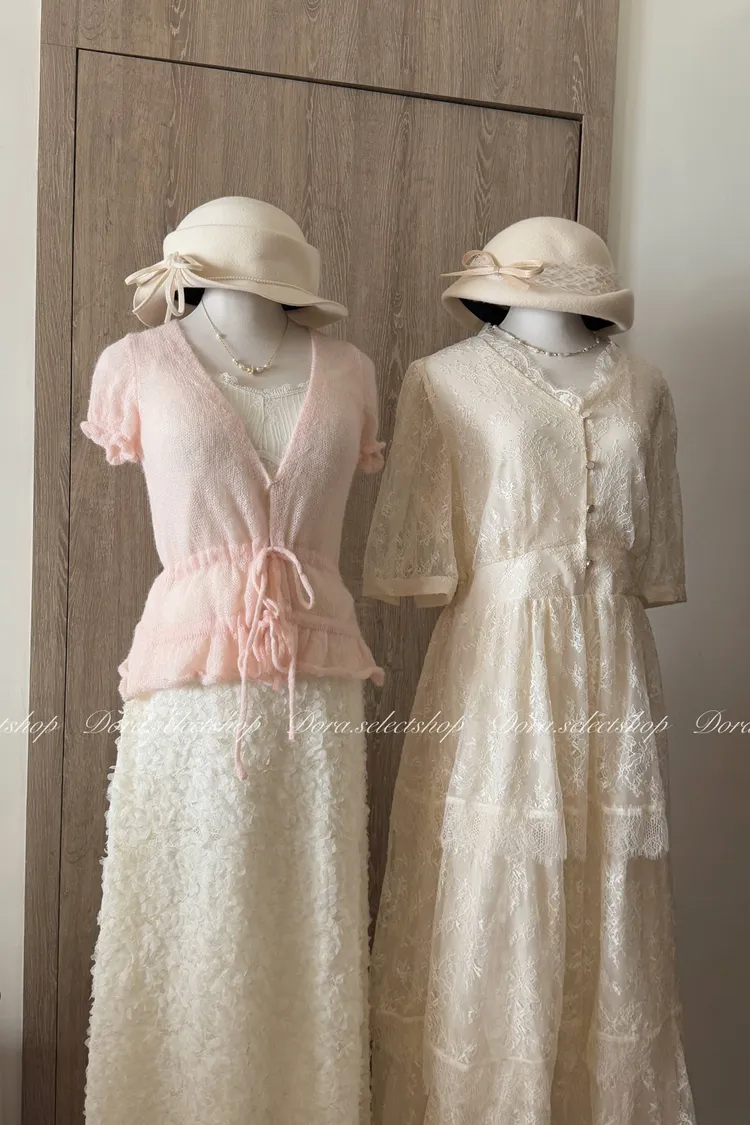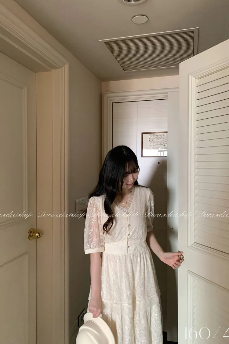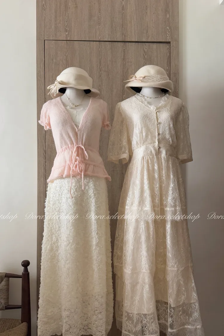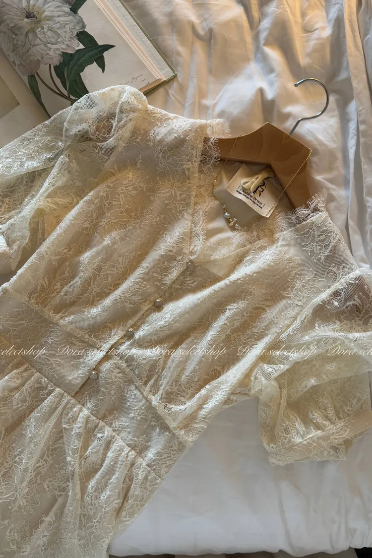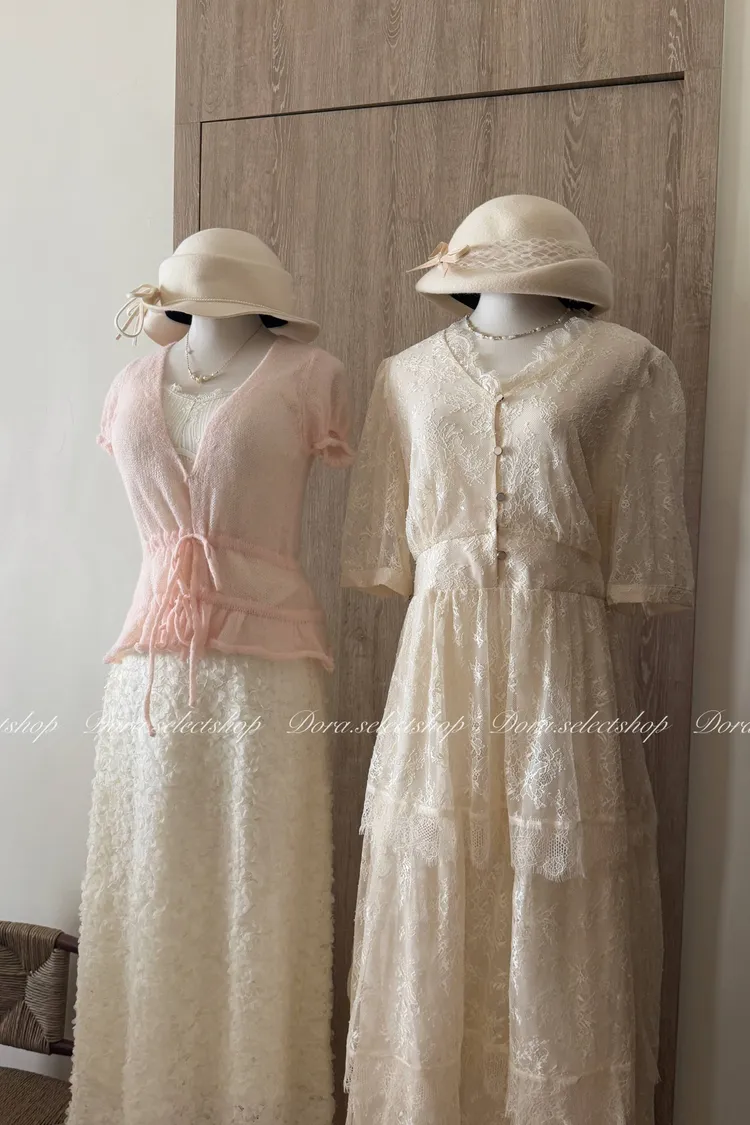 優雅氛圍感蕾絲蛋糕長洋裝---米