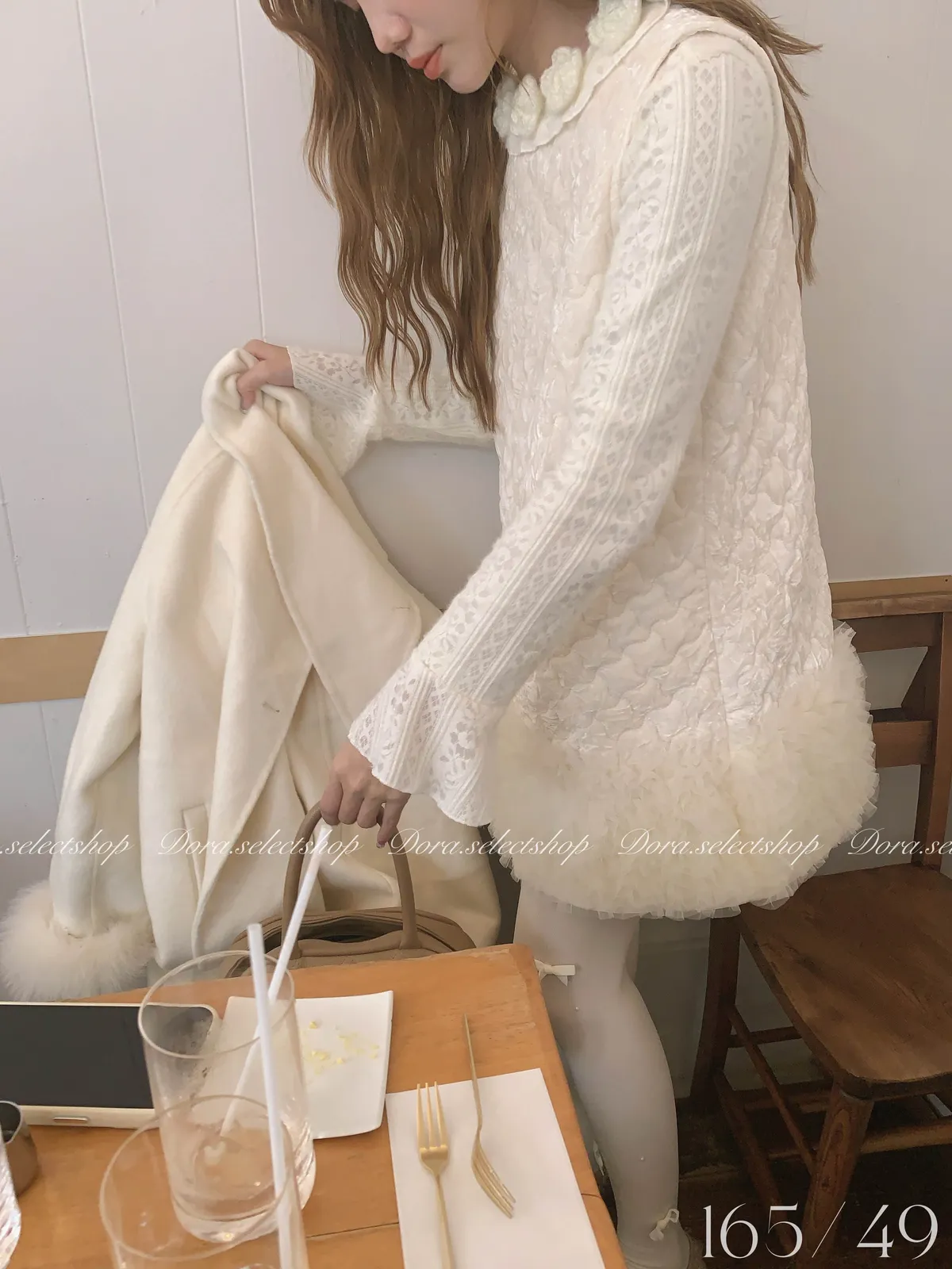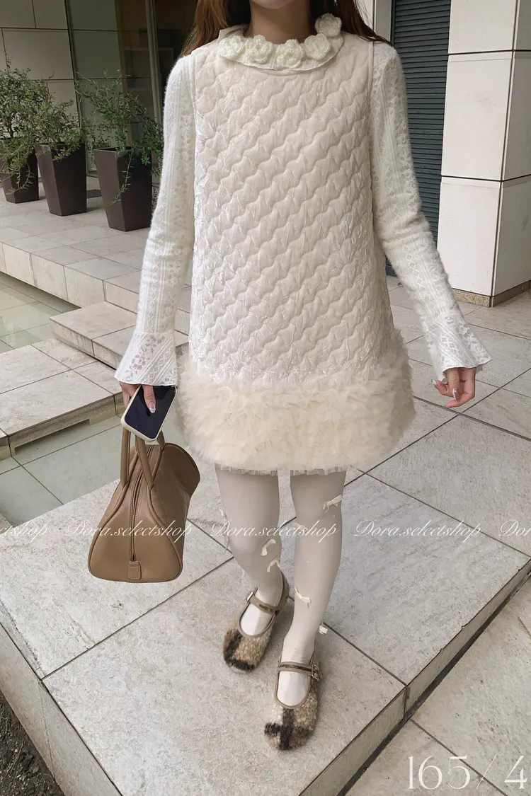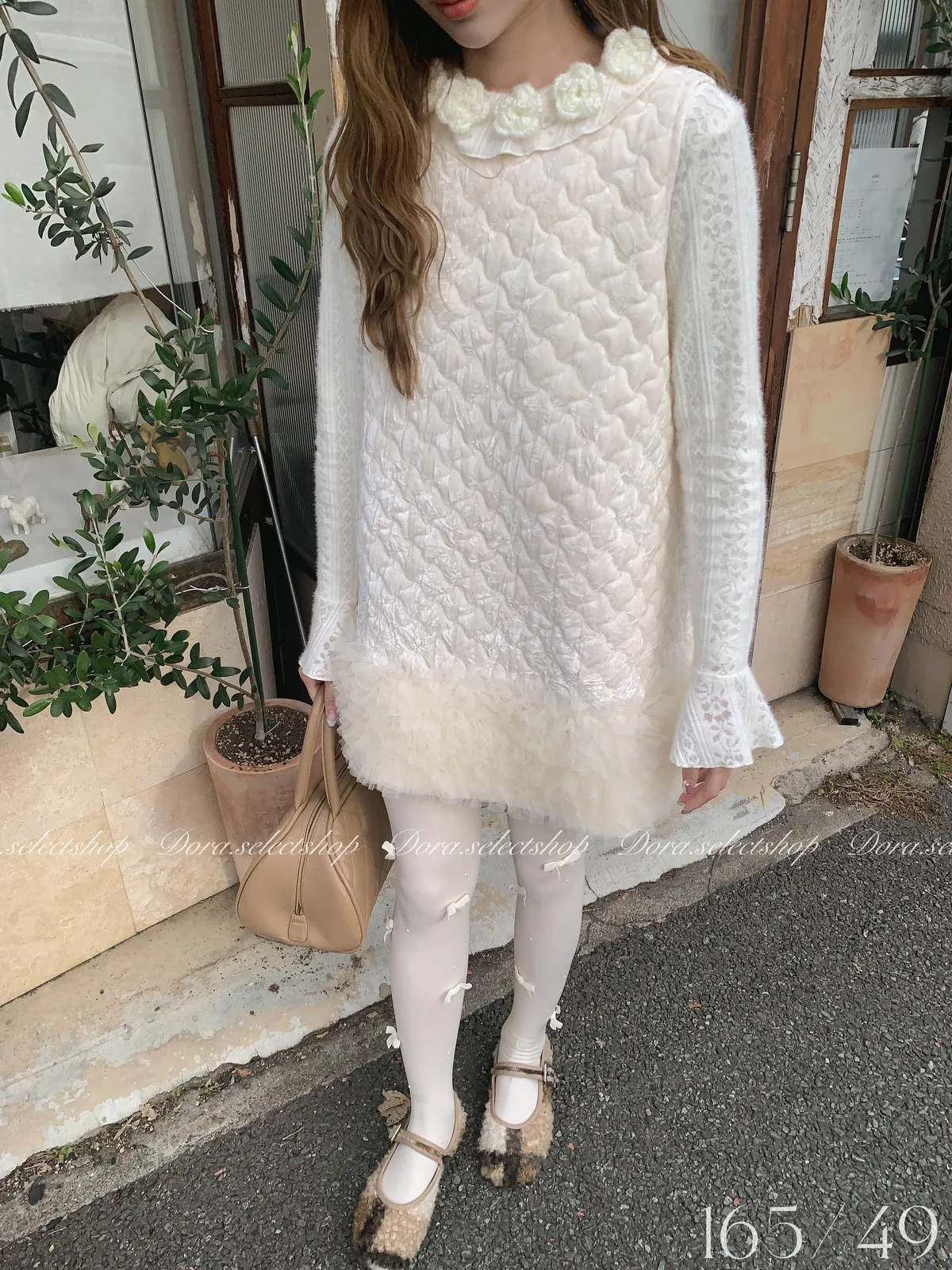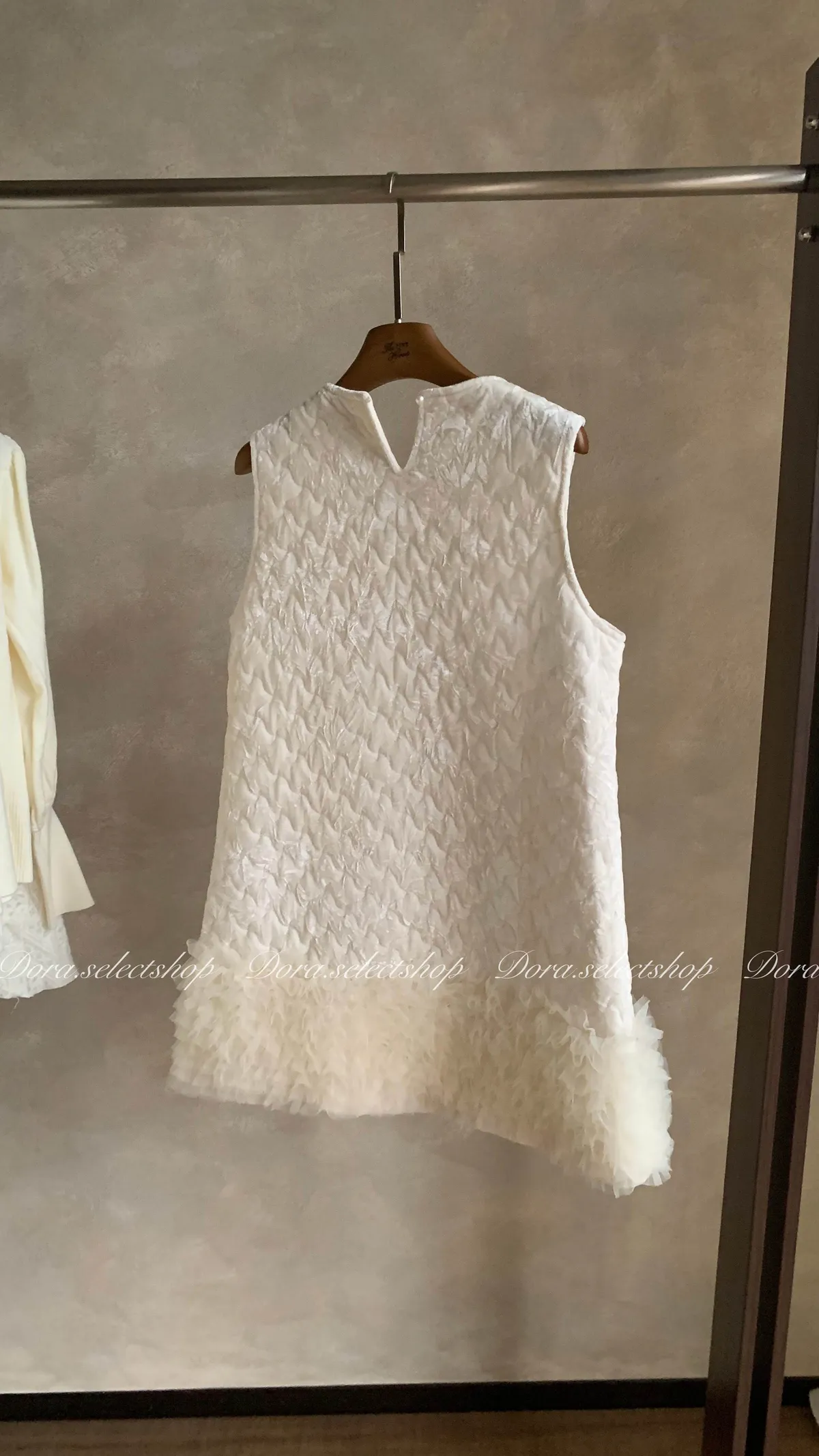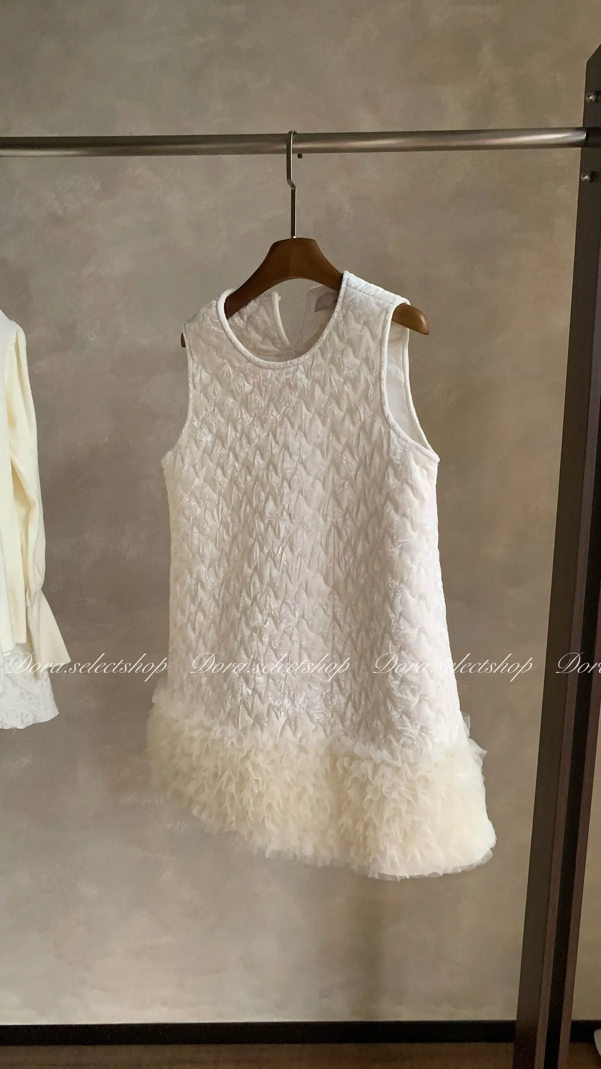 法式小公主菱格蕾絲拼接背心洋裝---米