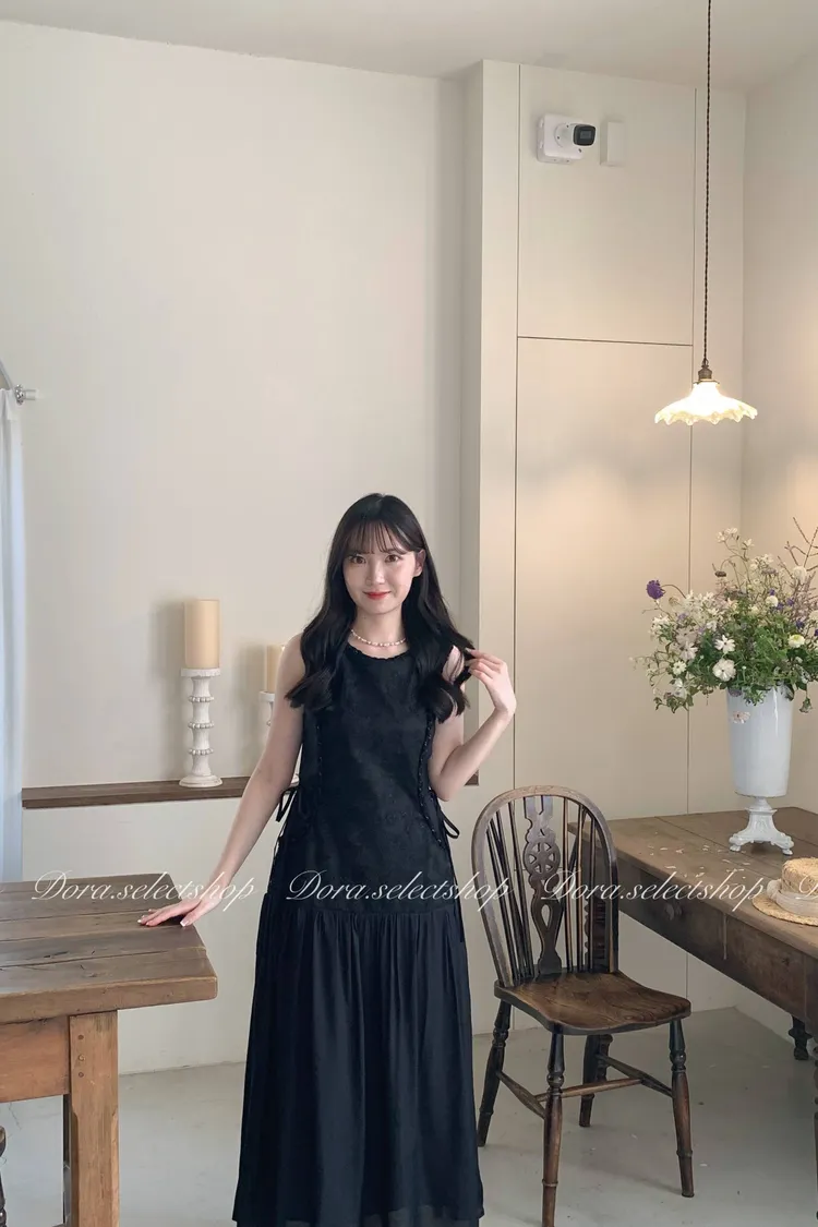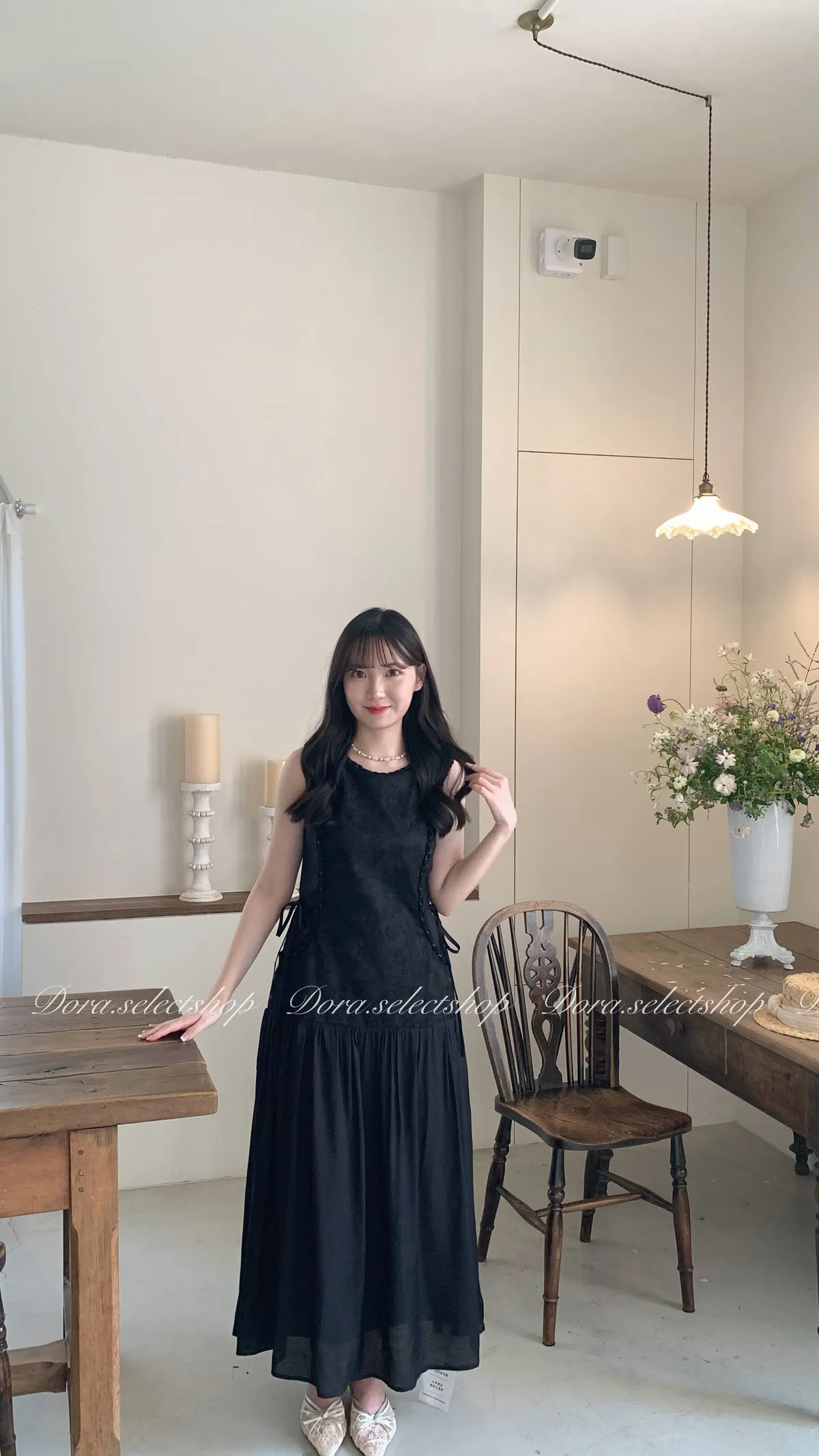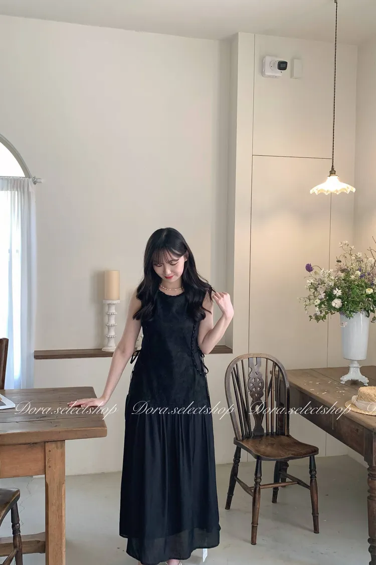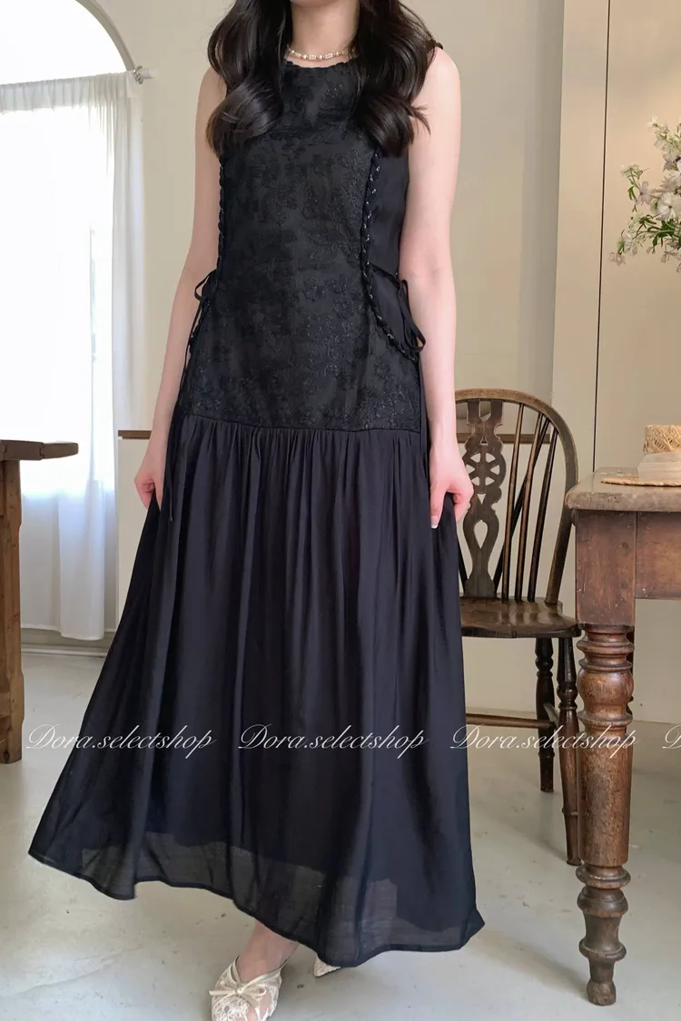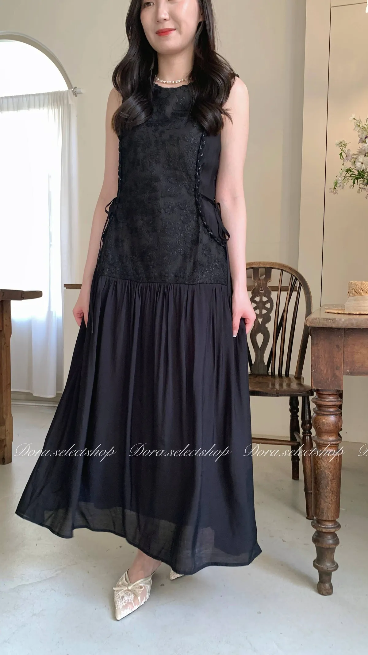 復古高級蕾絲拼接側綁帶長洋裝---黑