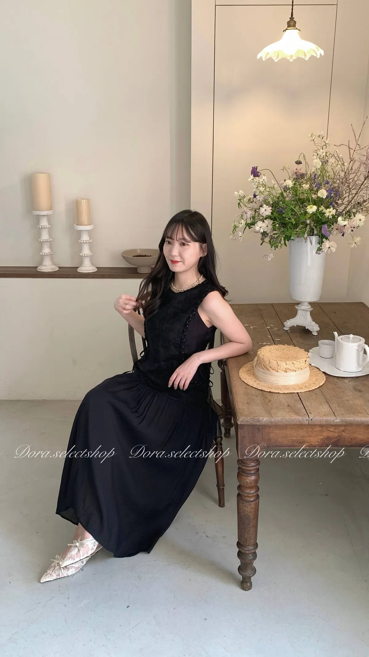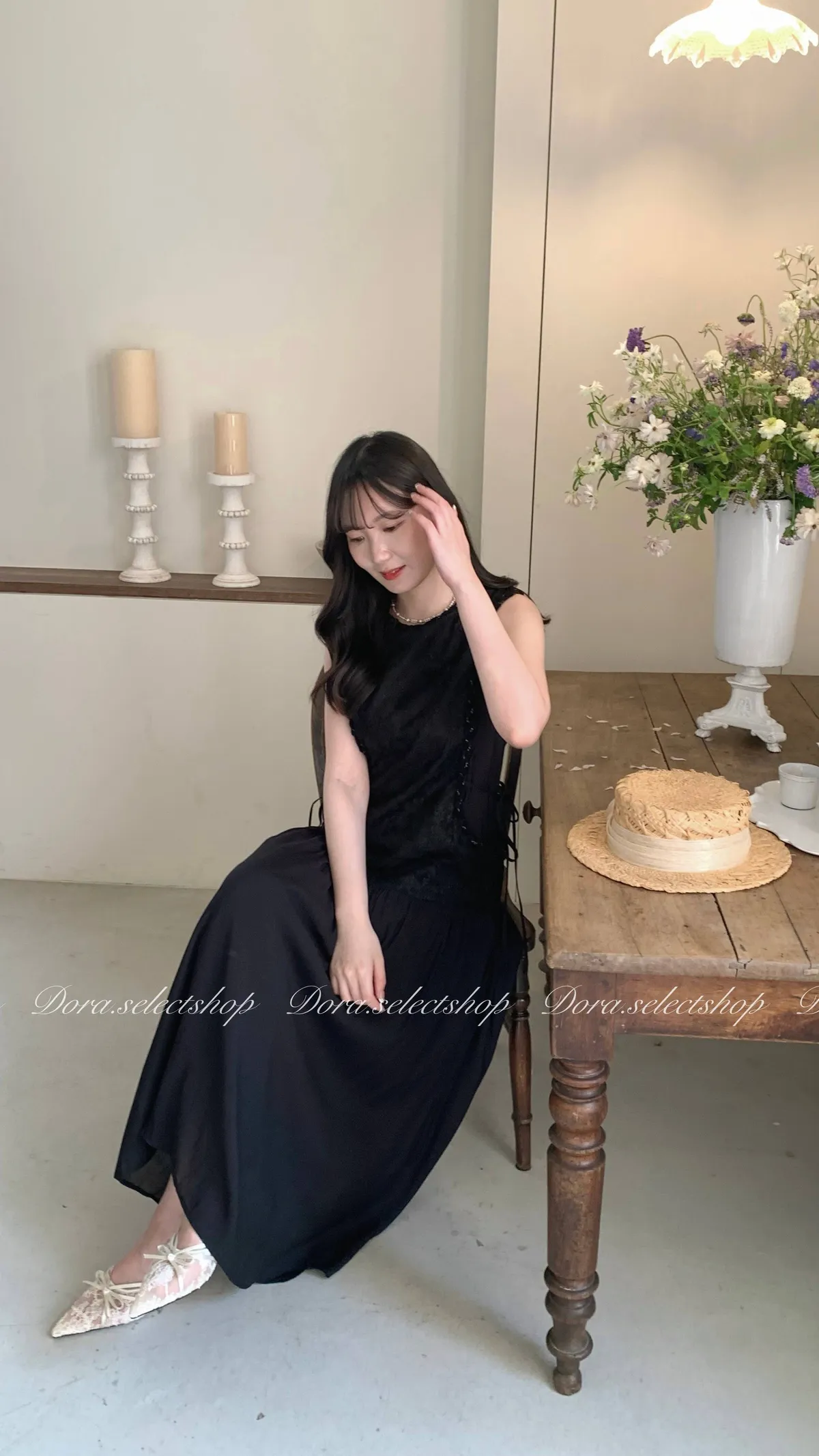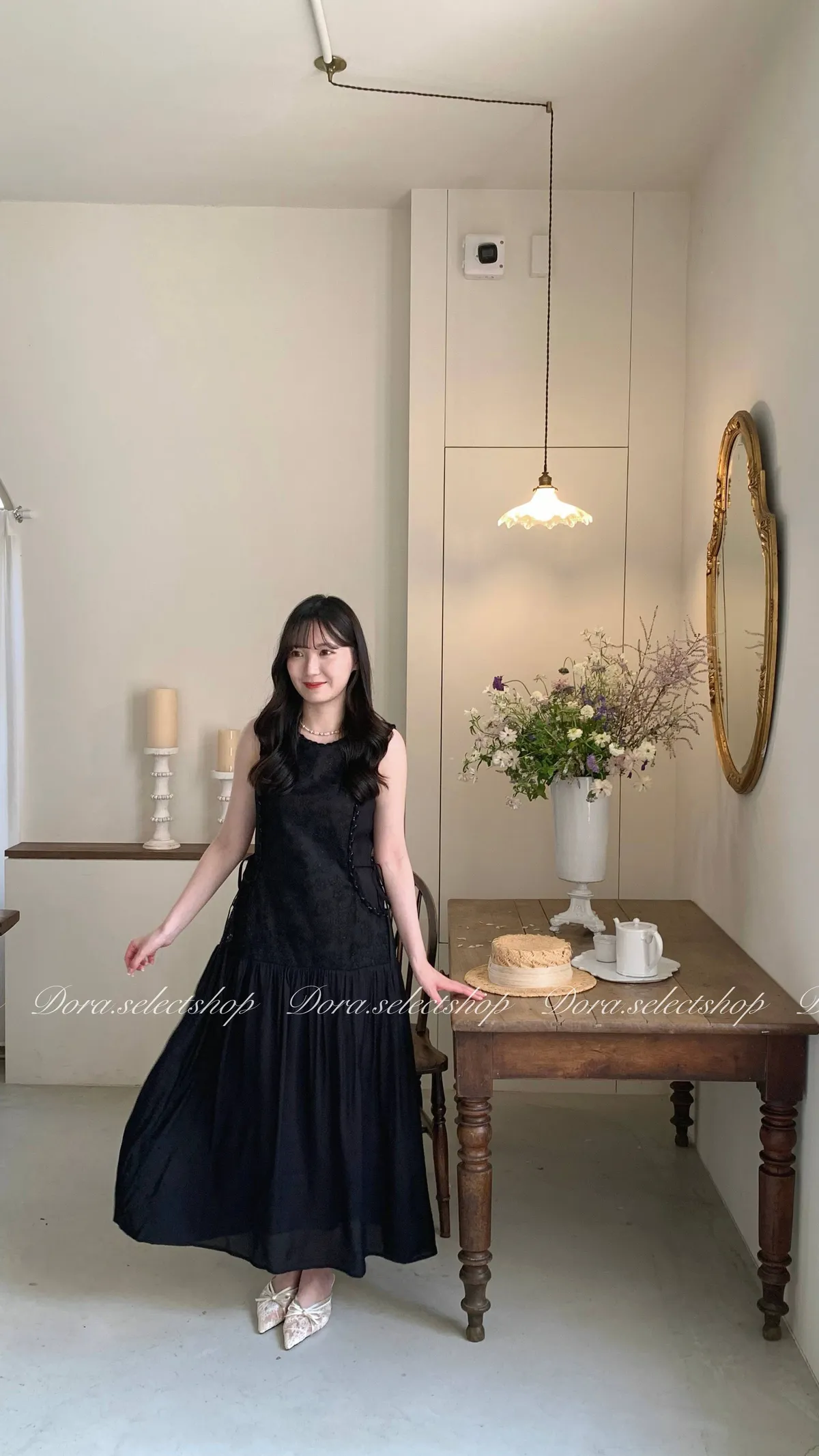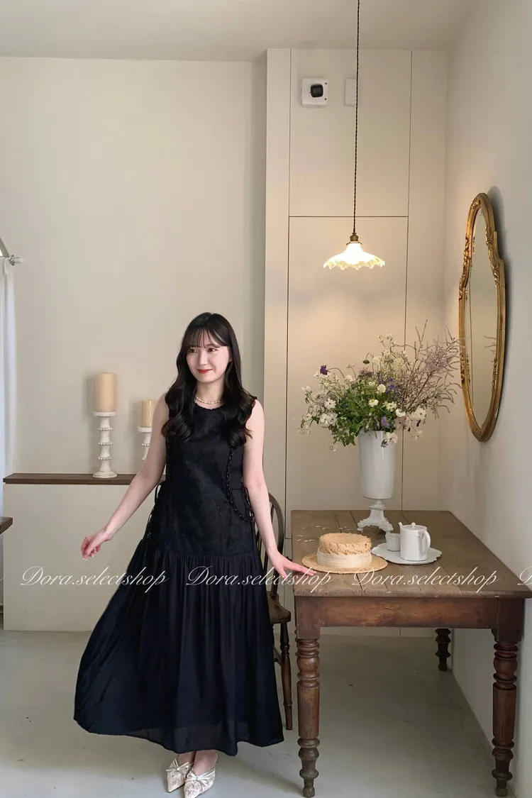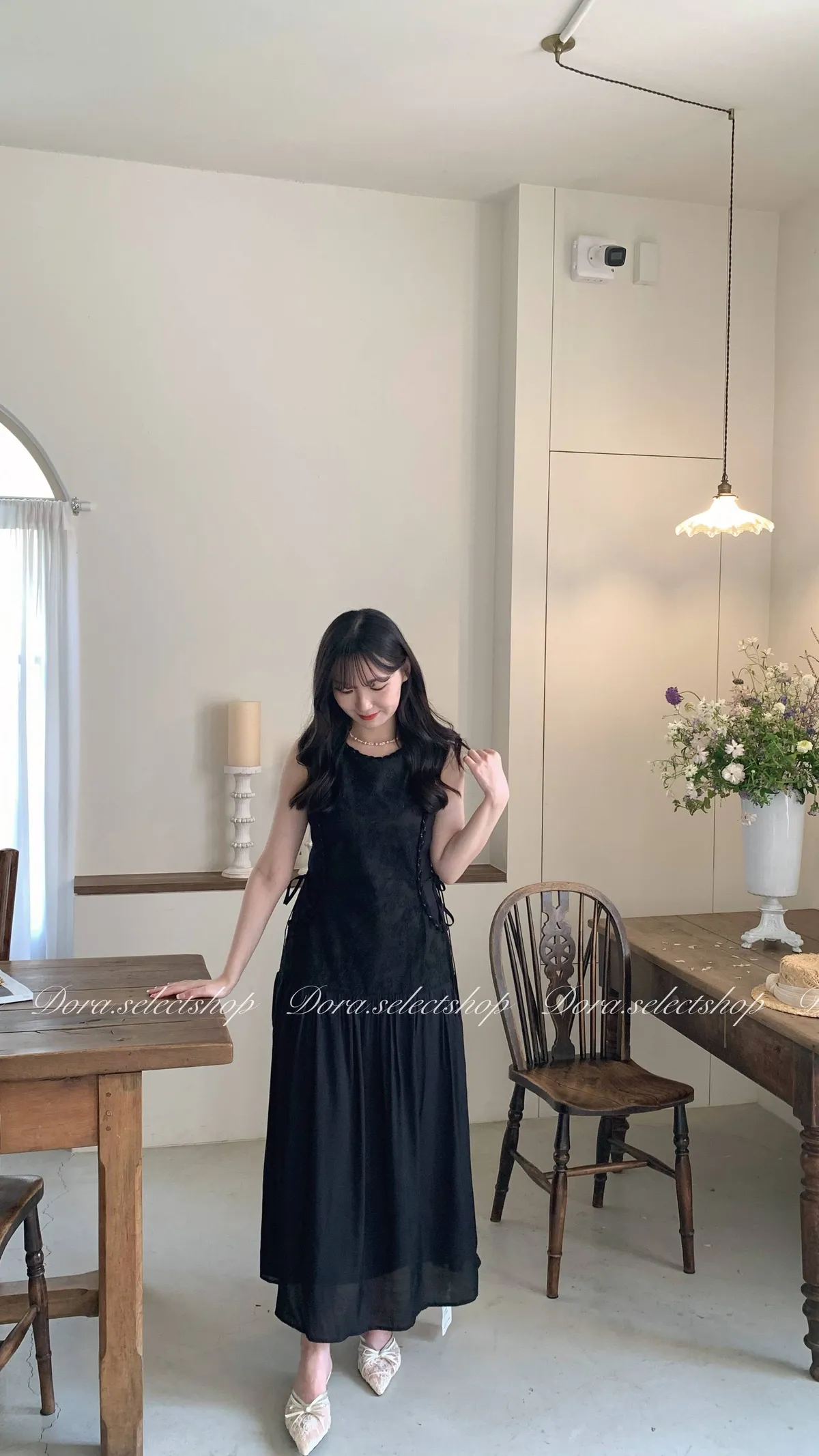 復古高級蕾絲拼接側綁帶長洋裝---黑