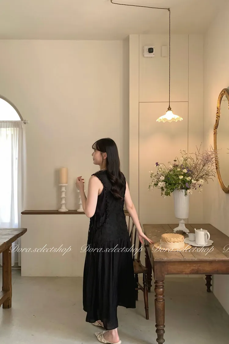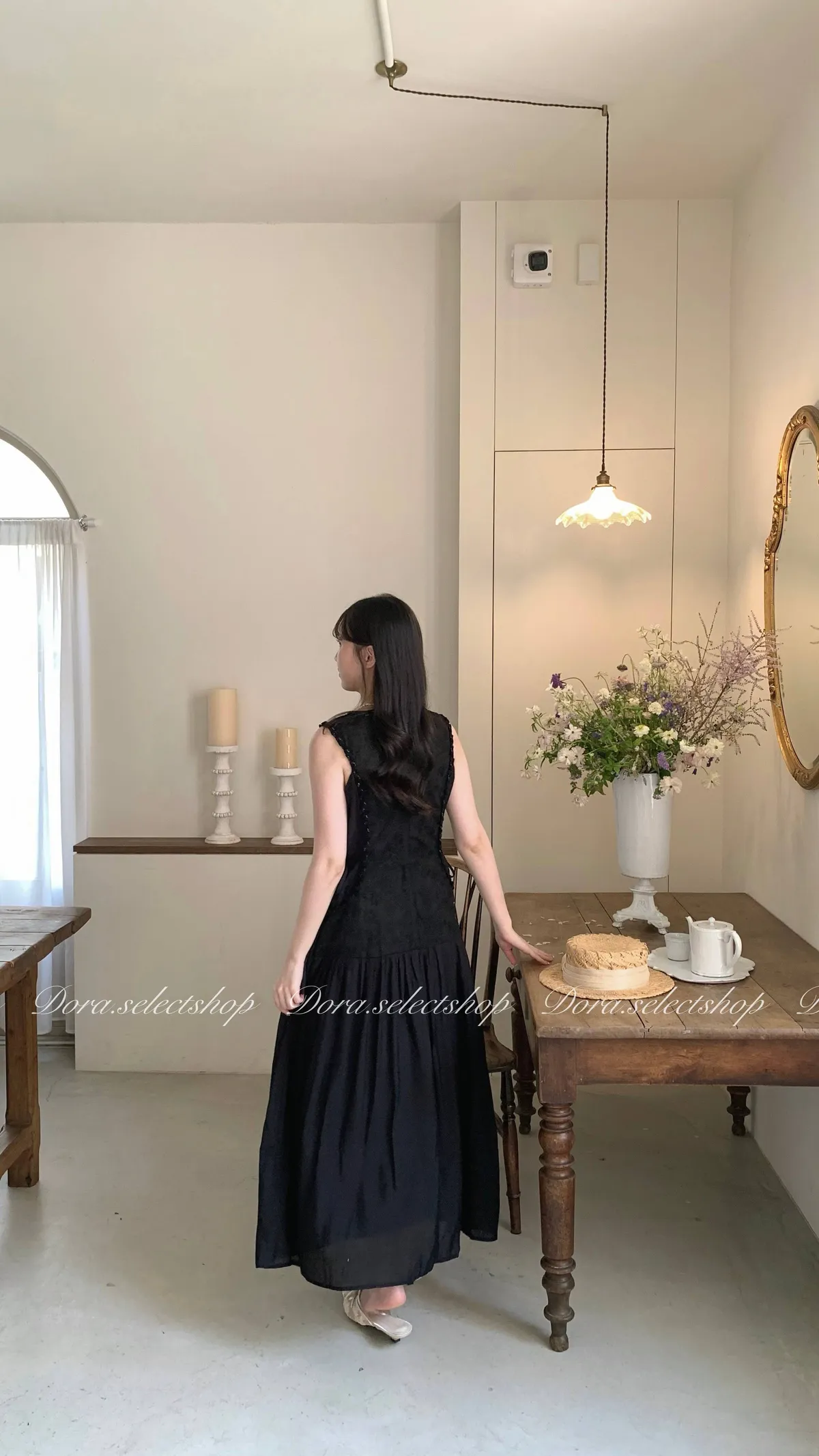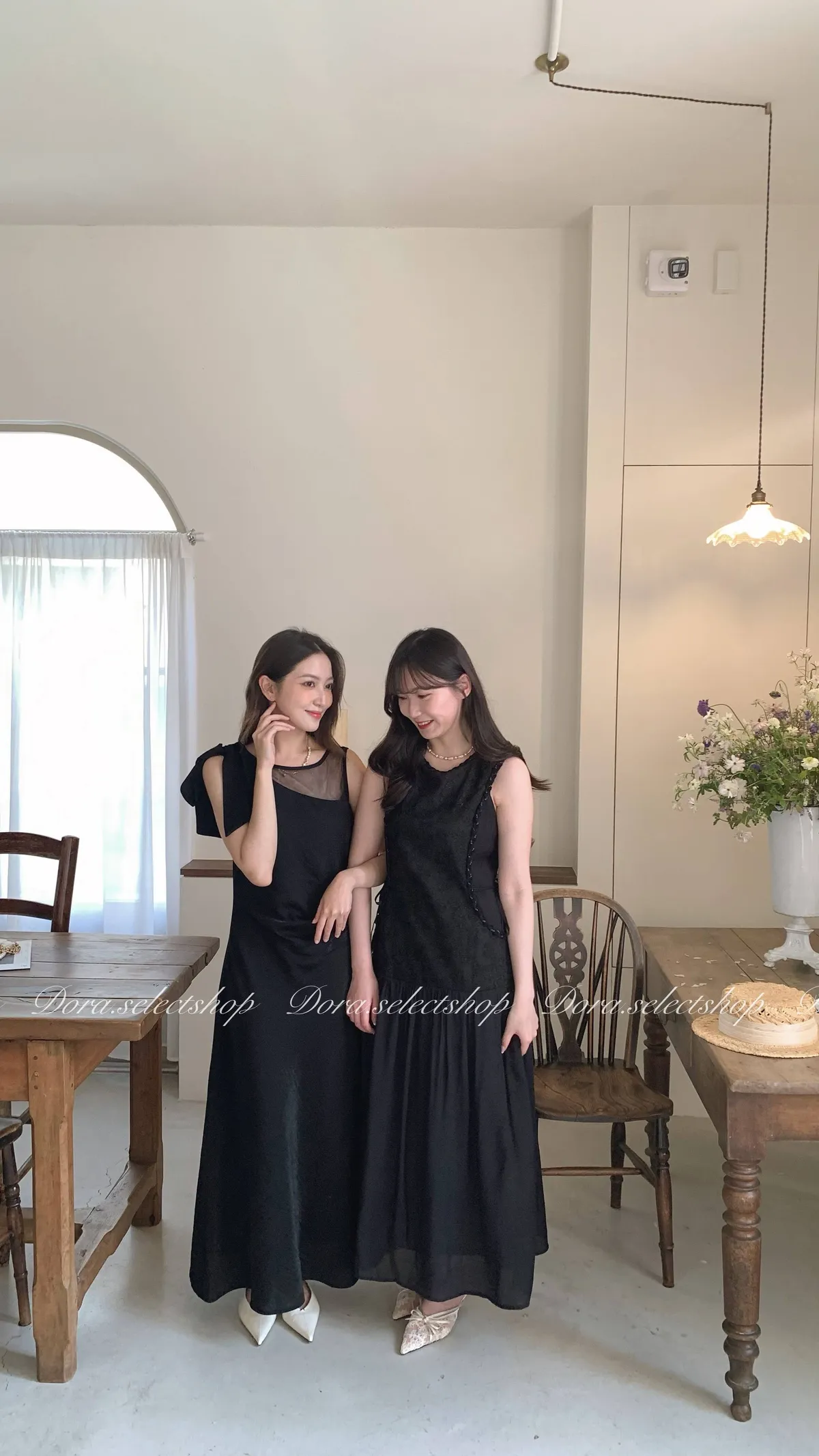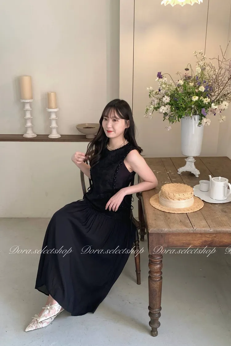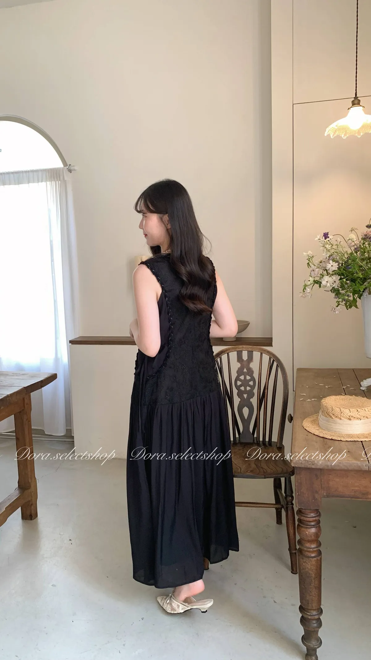 復古高級蕾絲拼接側綁帶長洋裝---黑