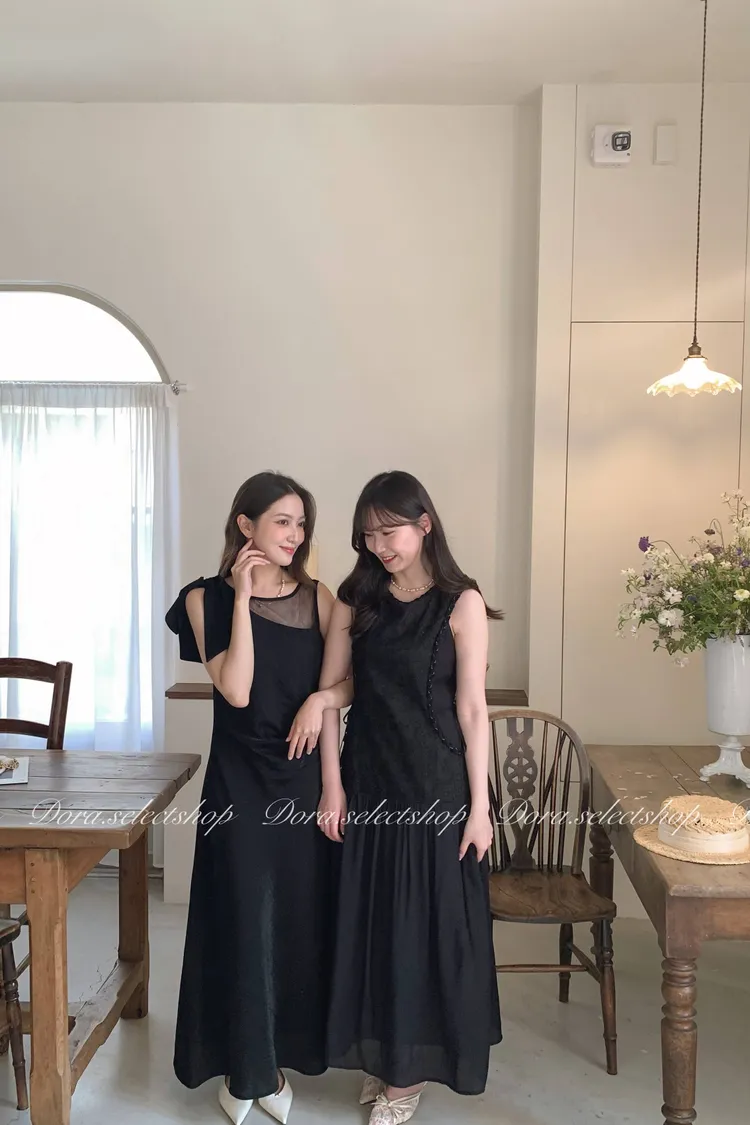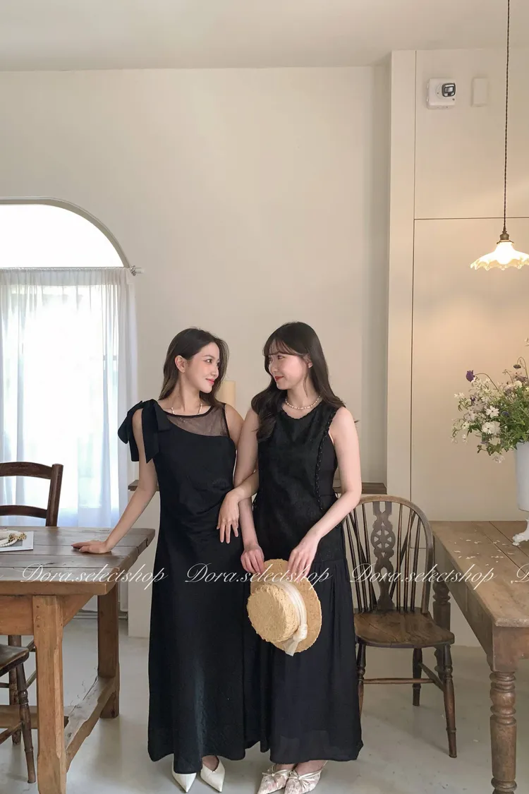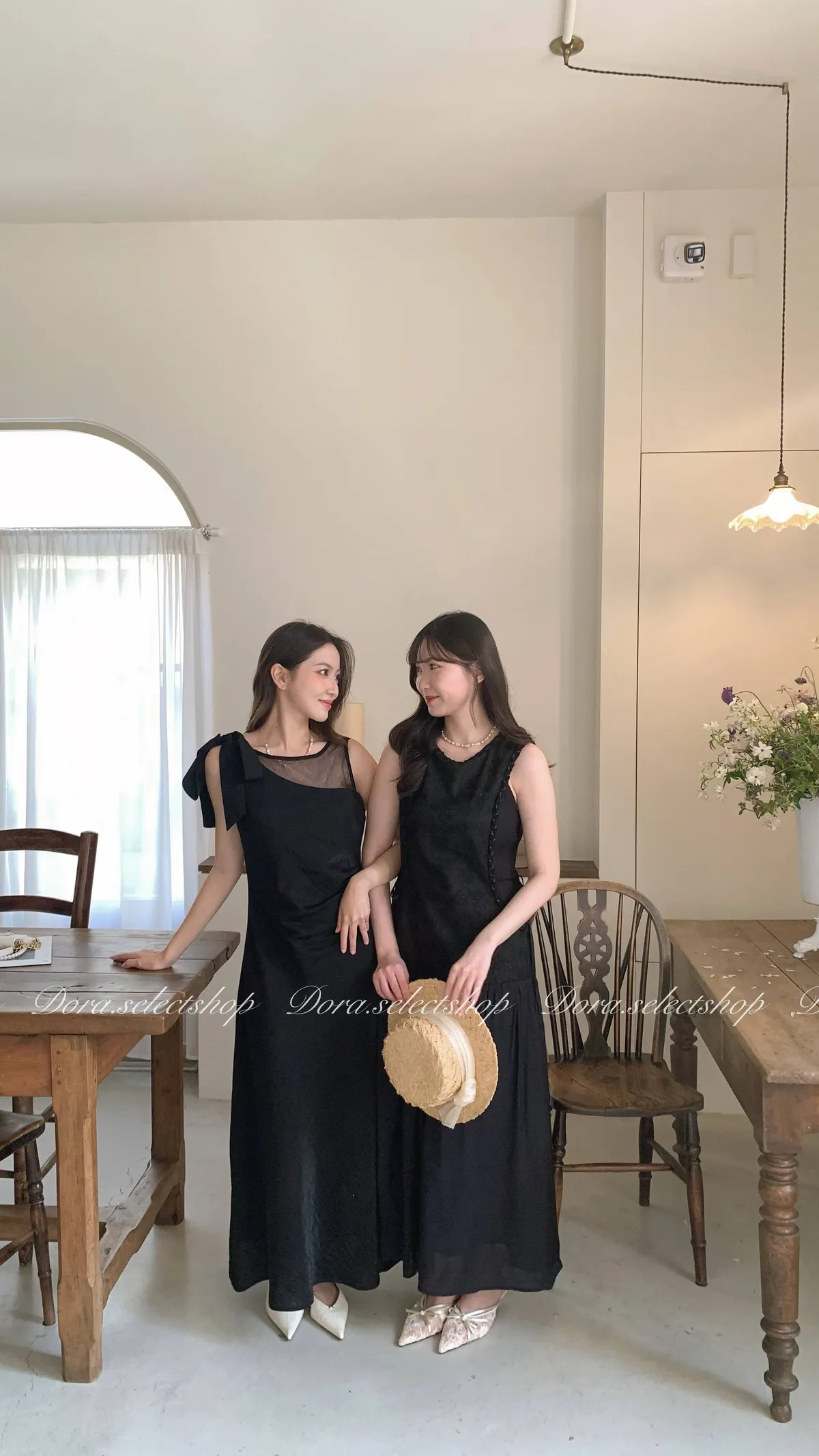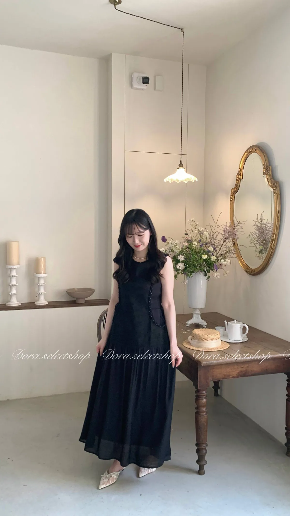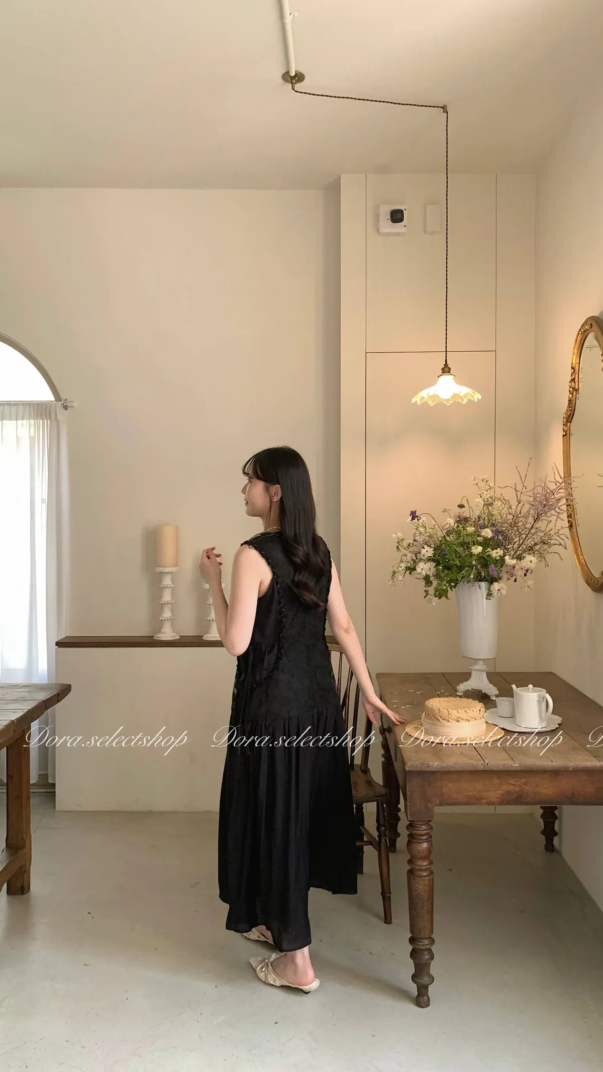 復古高級蕾絲拼接側綁帶長洋裝---黑