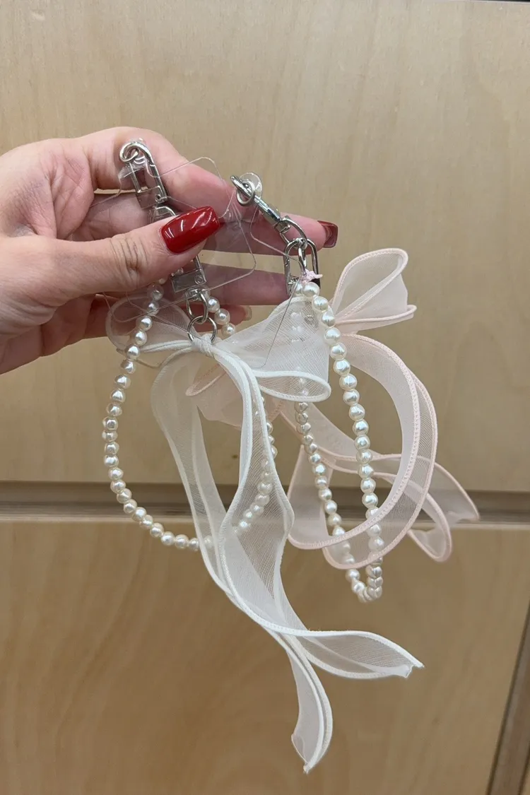 蝴蝶結緞帶不規則珍珠手機掛繩---粉