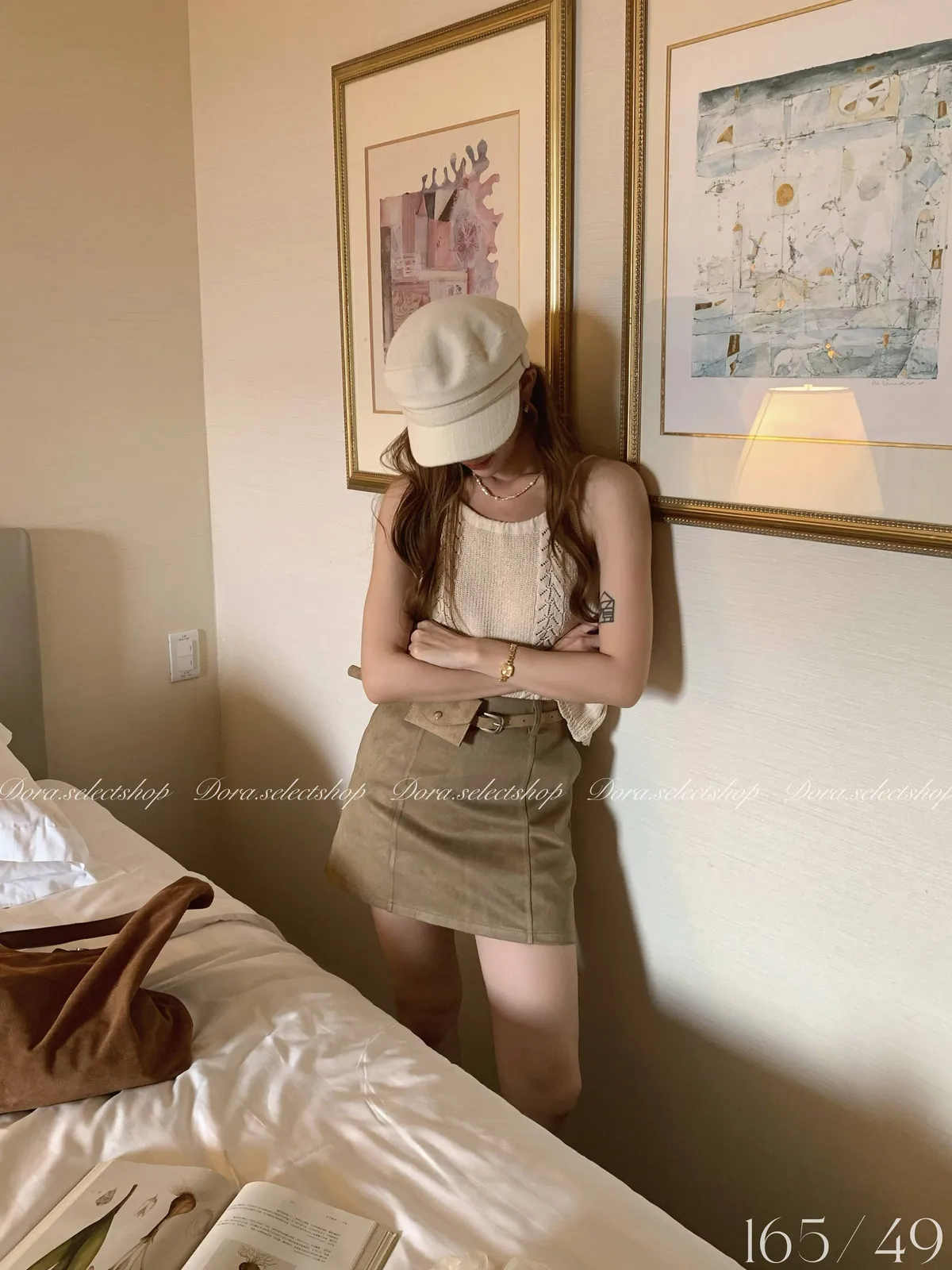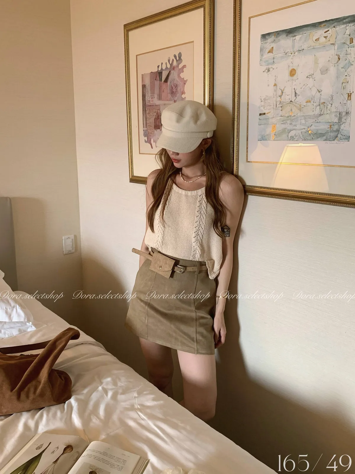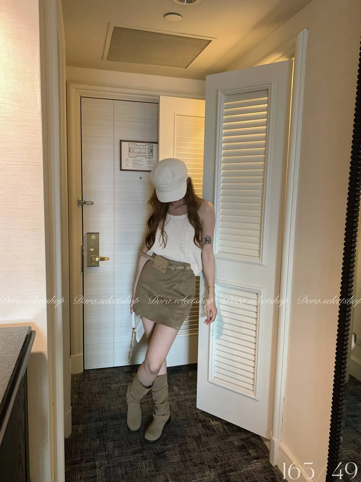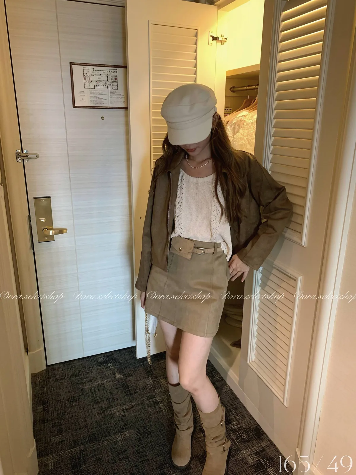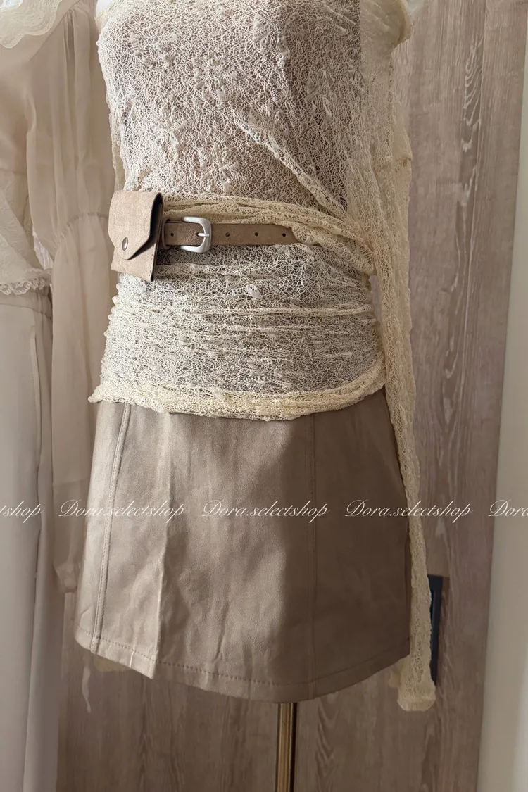 麂皮率性修身短裙(附安全褲、皮帶小腰包)---淺卡其