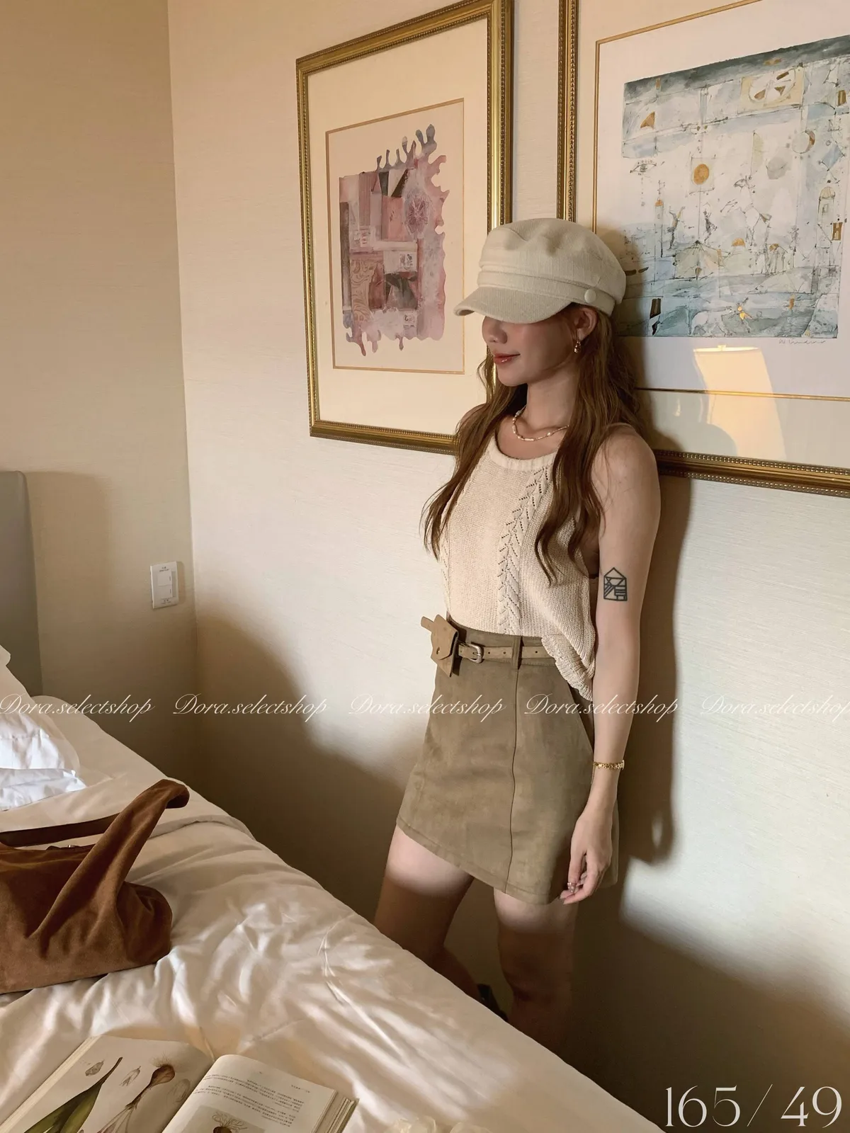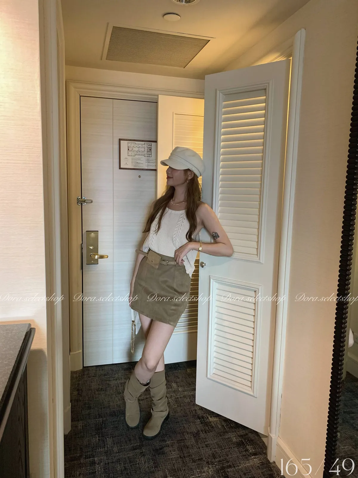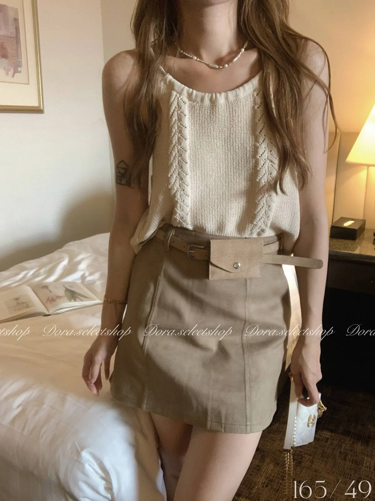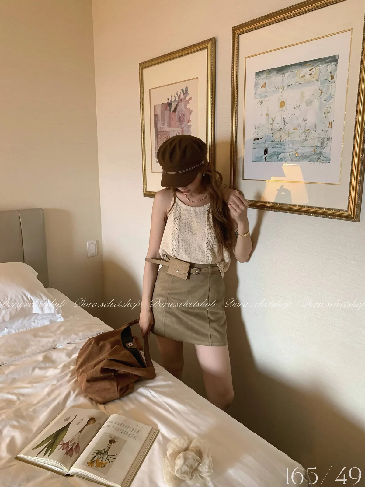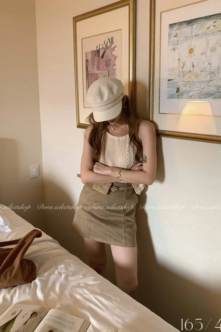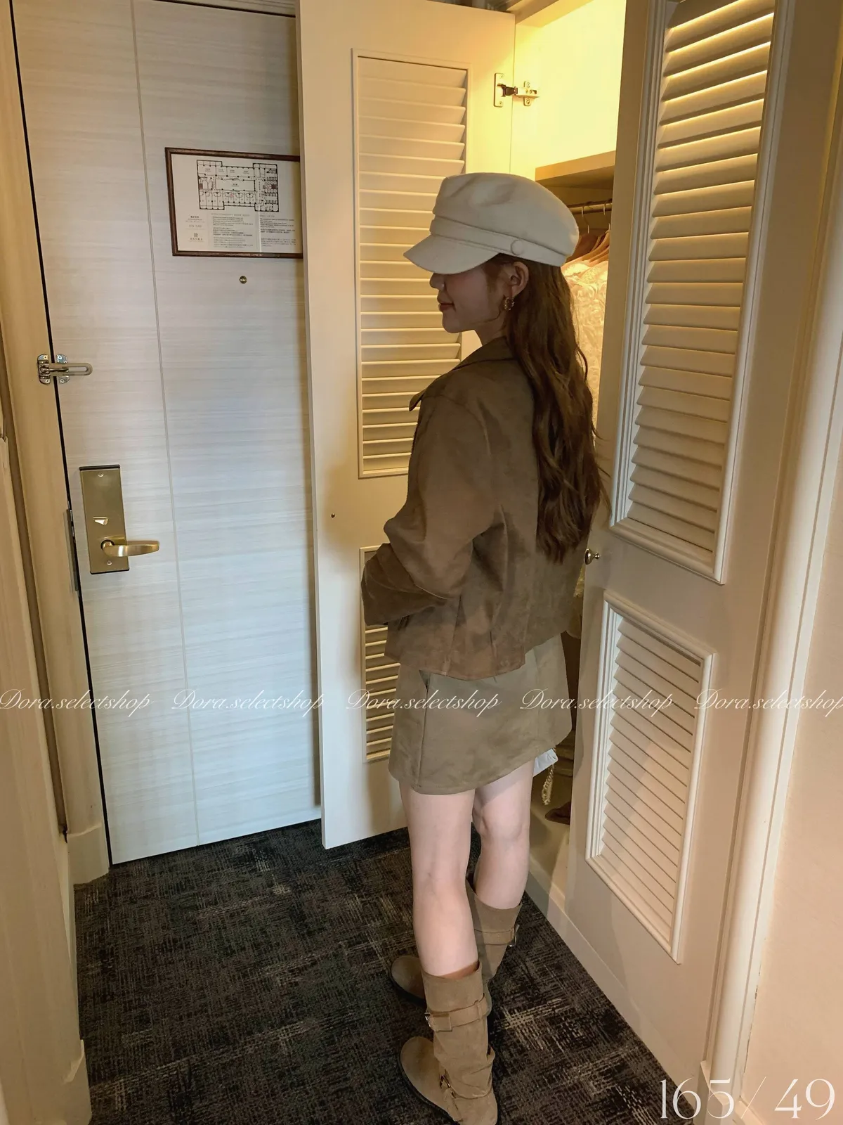 麂皮率性修身短裙(附安全褲、皮帶小腰包)---淺卡其
