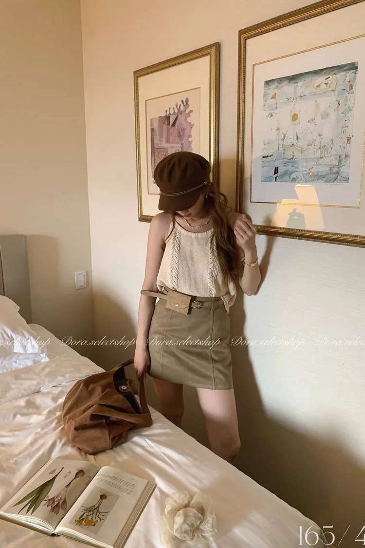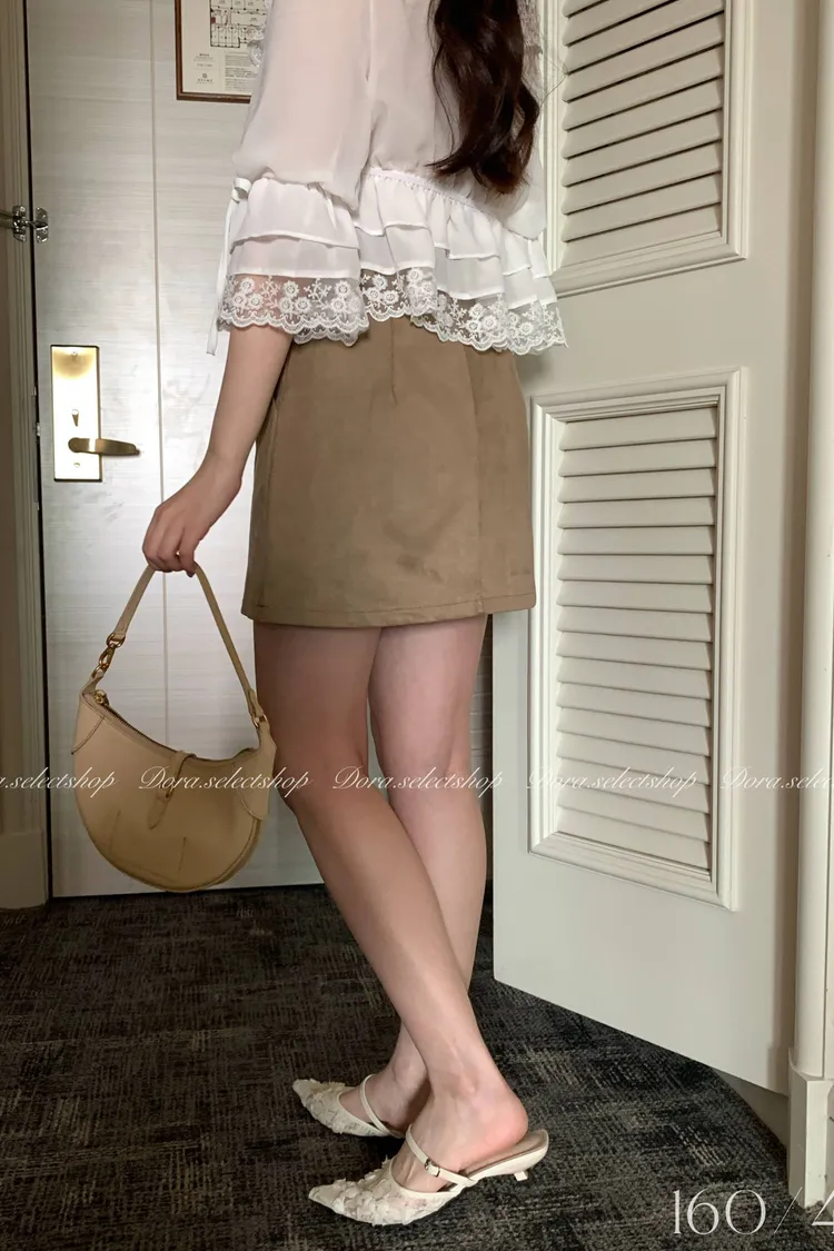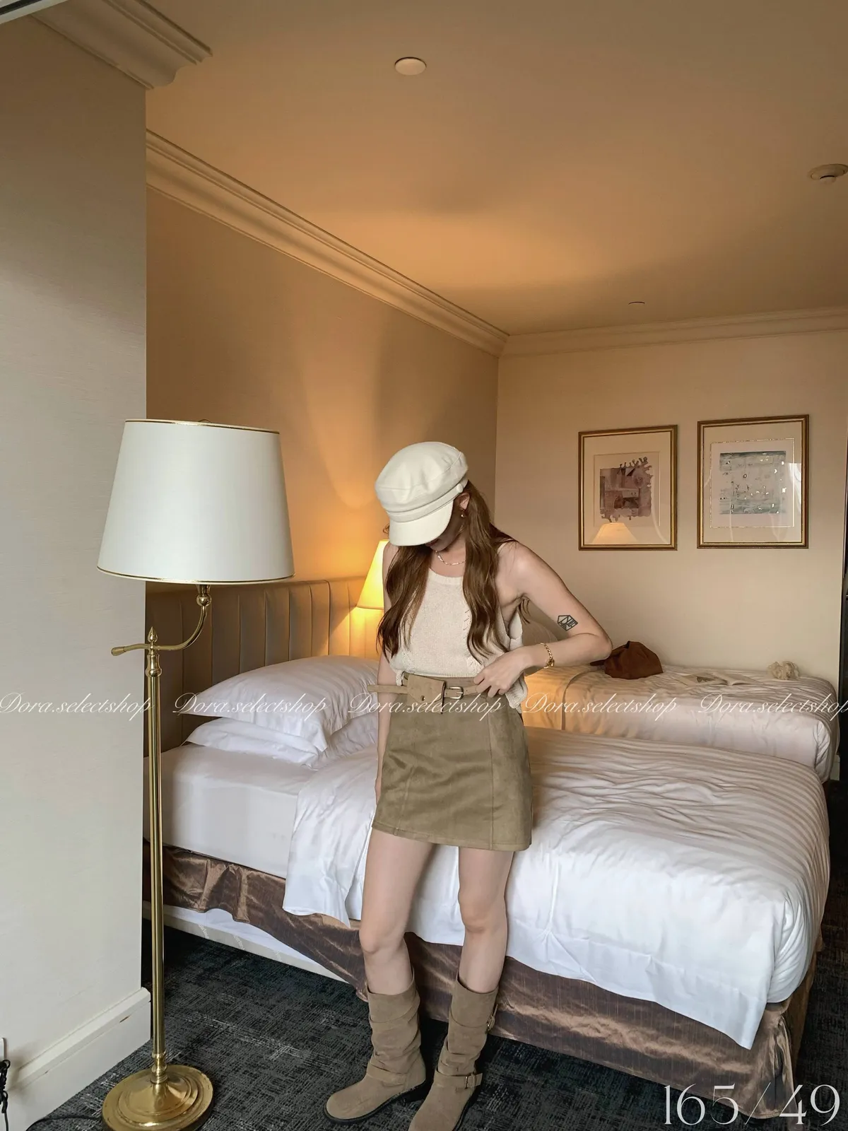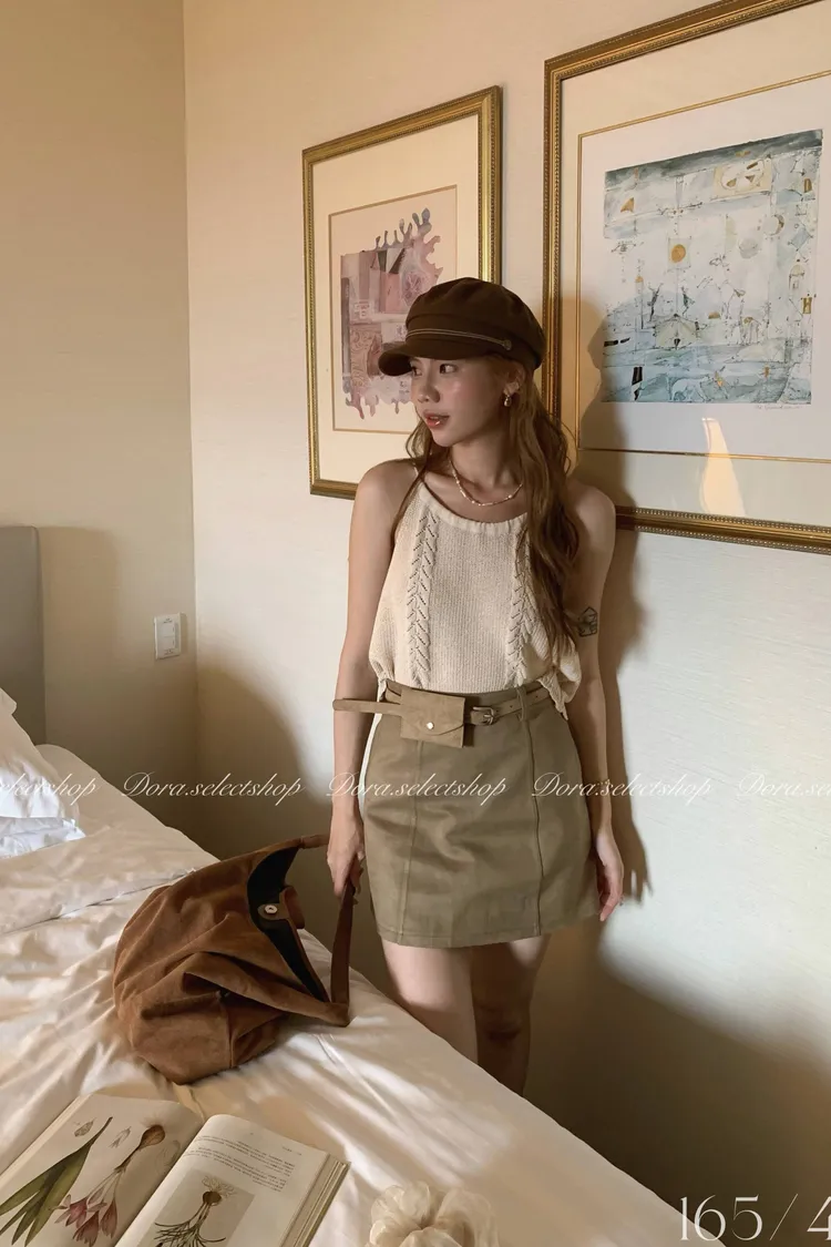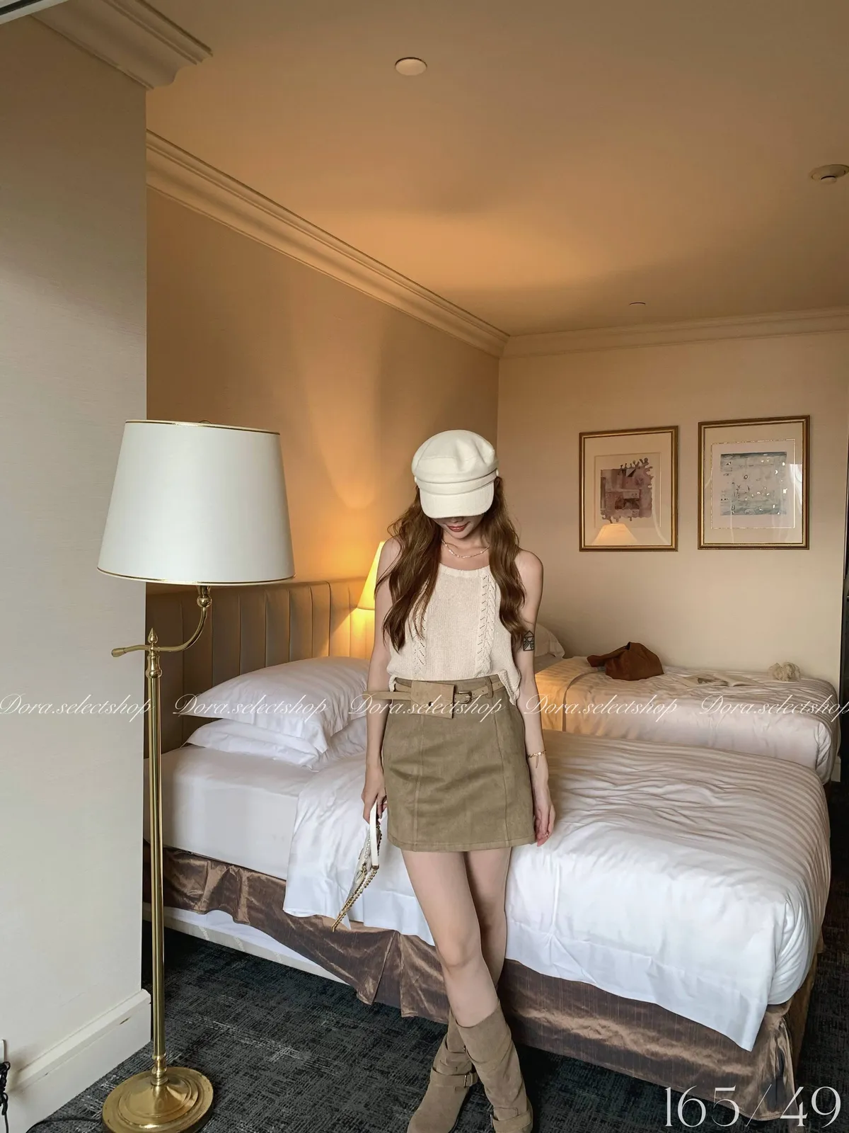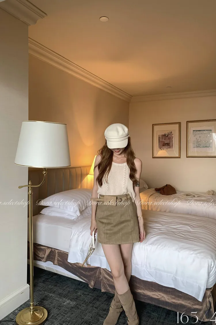麂皮率性修身短裙(附安全褲、皮帶小腰包)---淺卡其