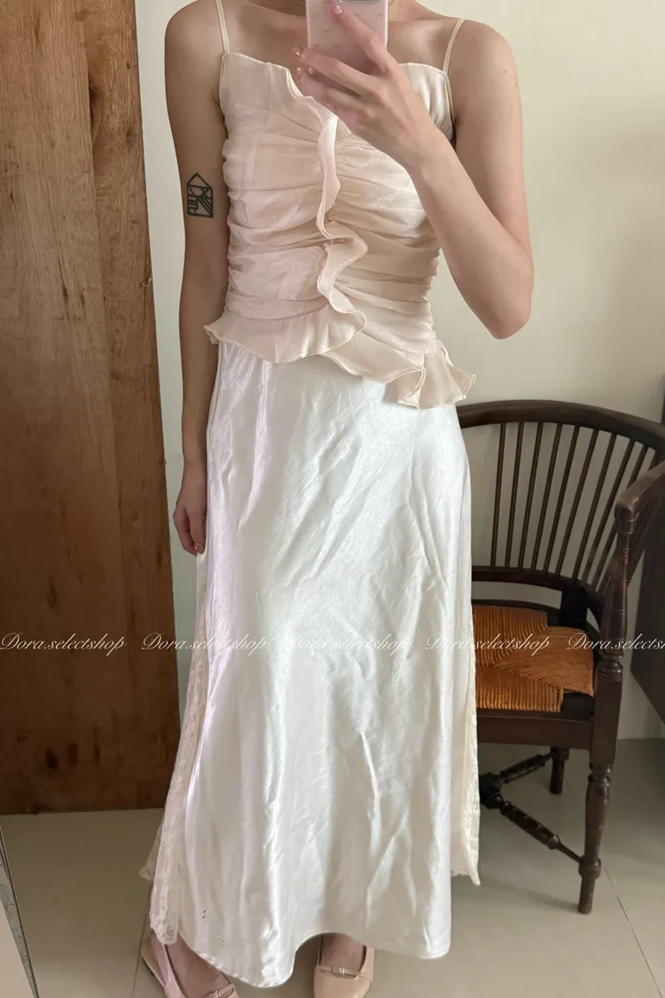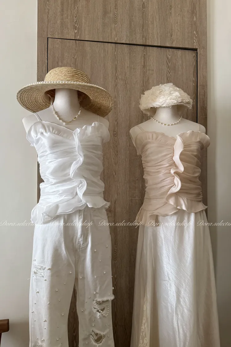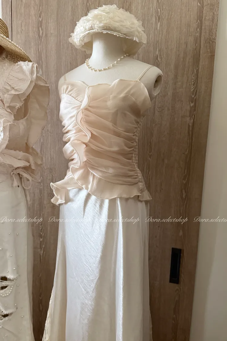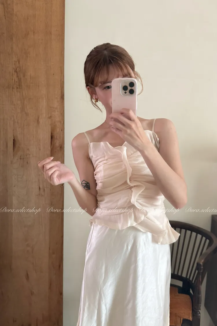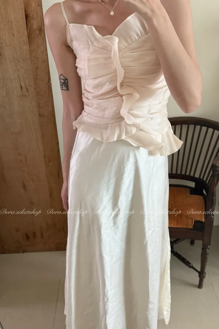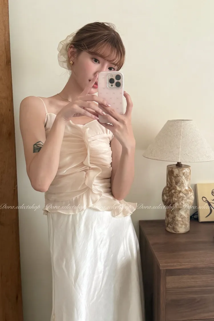 法式氣質荷葉邊抓皺光澤背心---杏