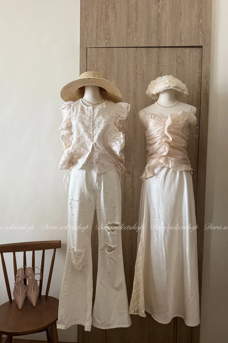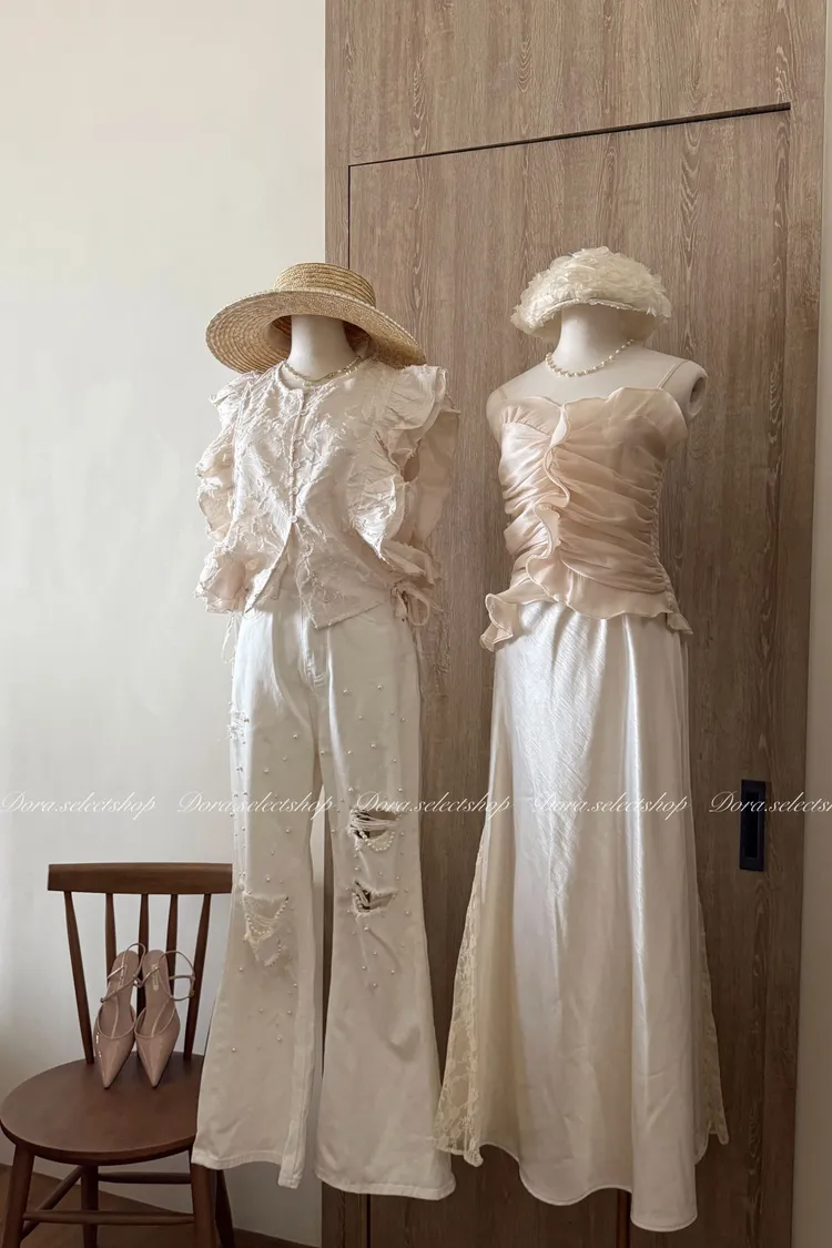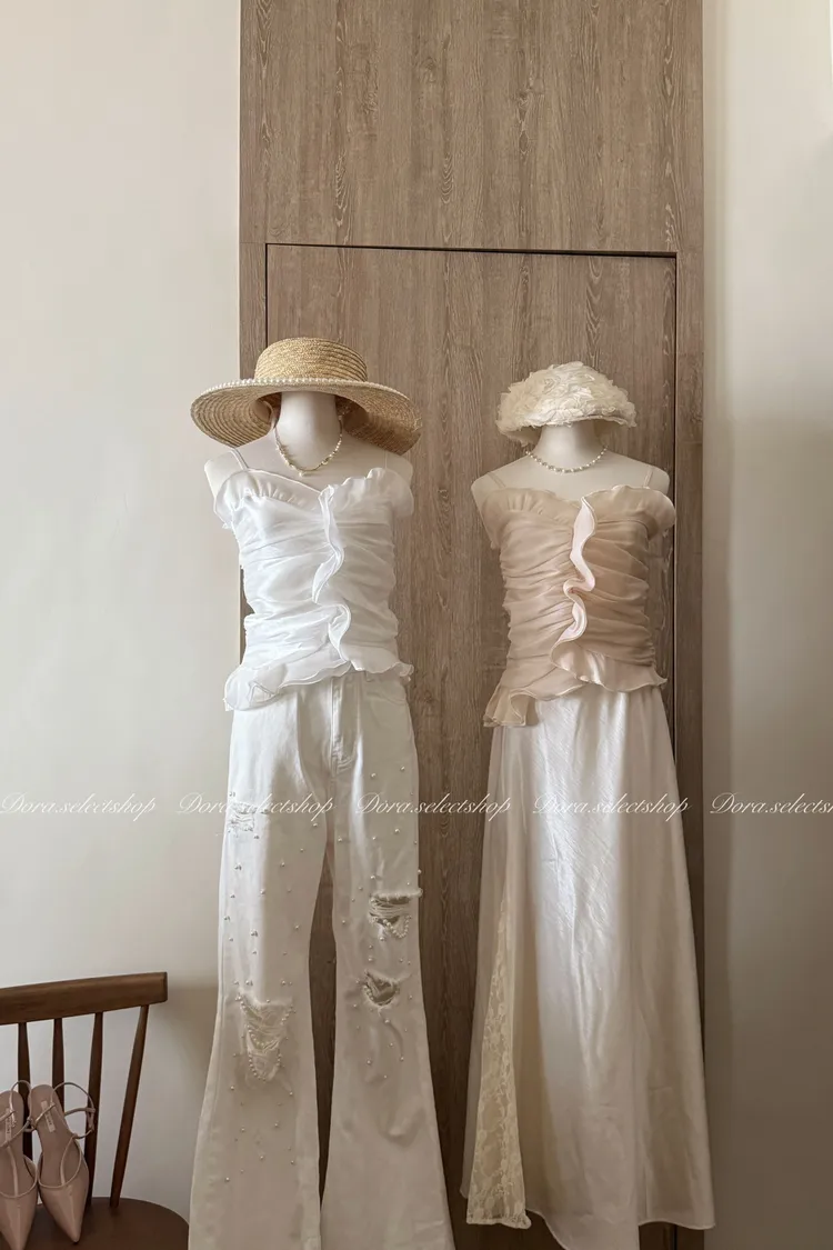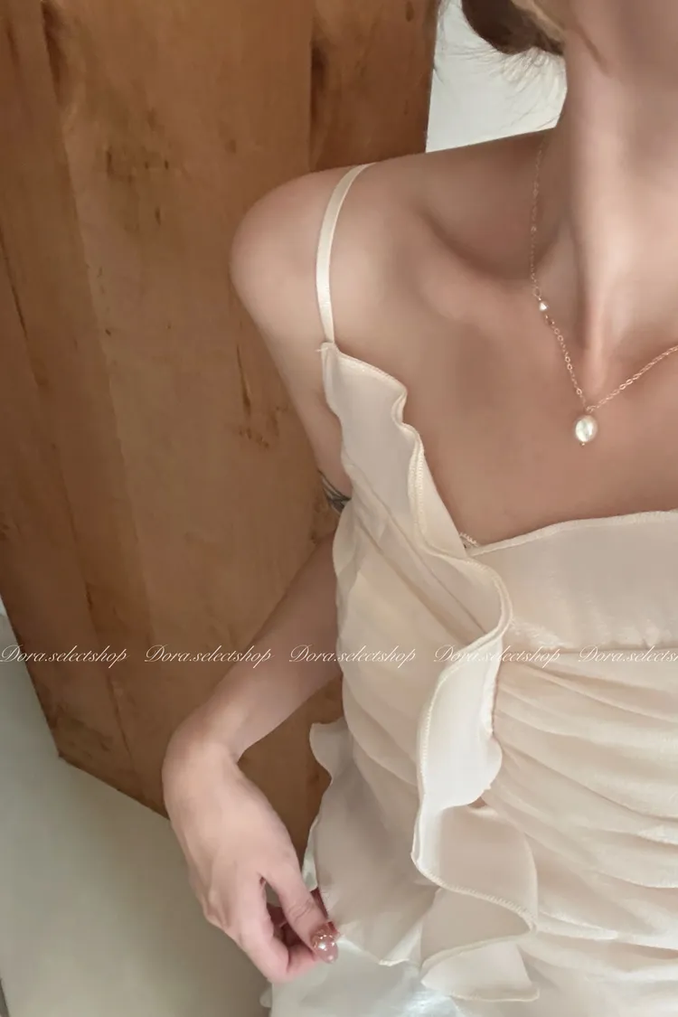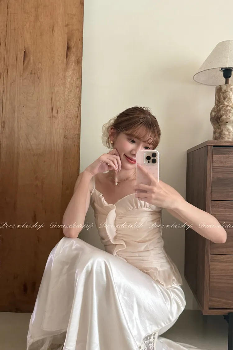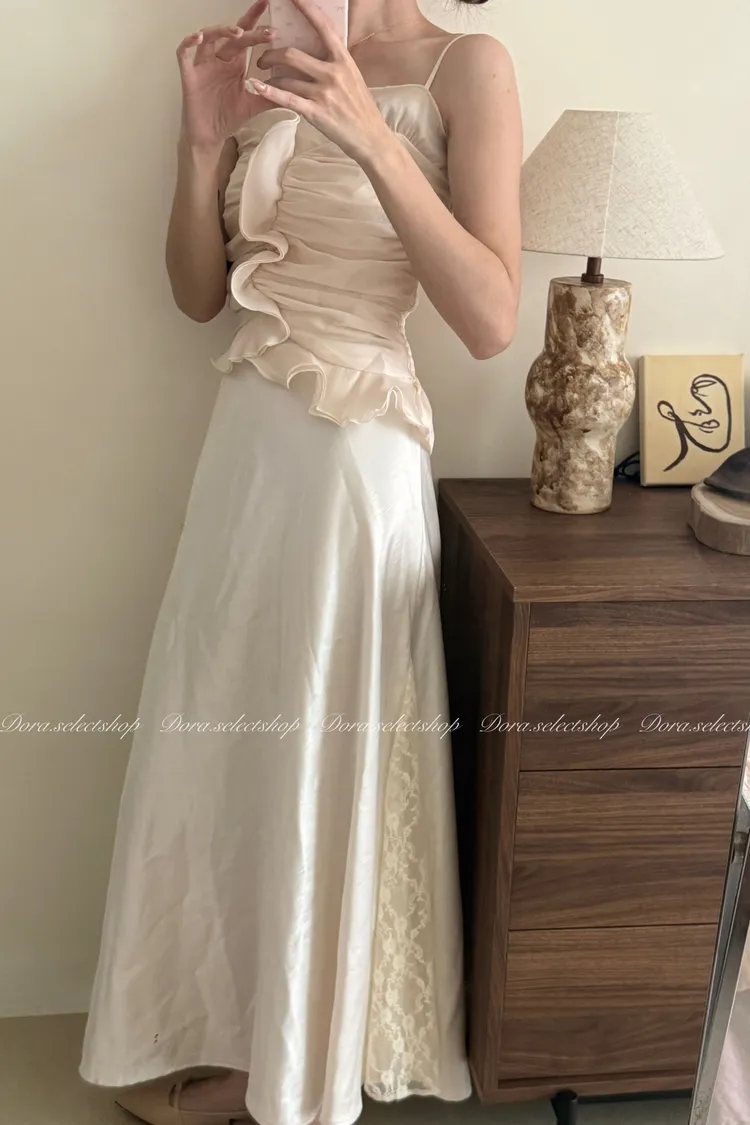 法式氣質荷葉邊抓皺光澤背心---杏