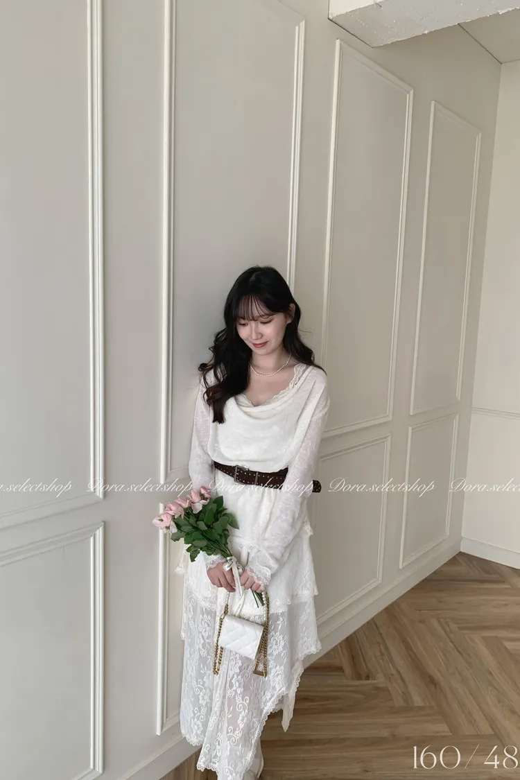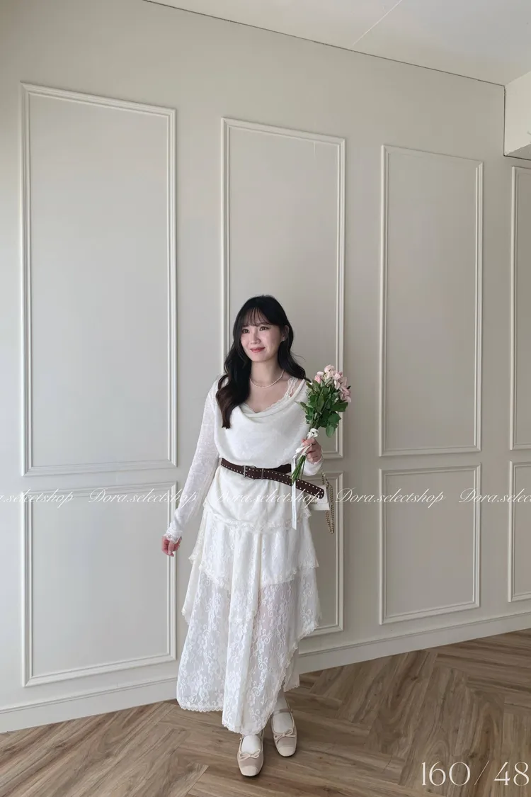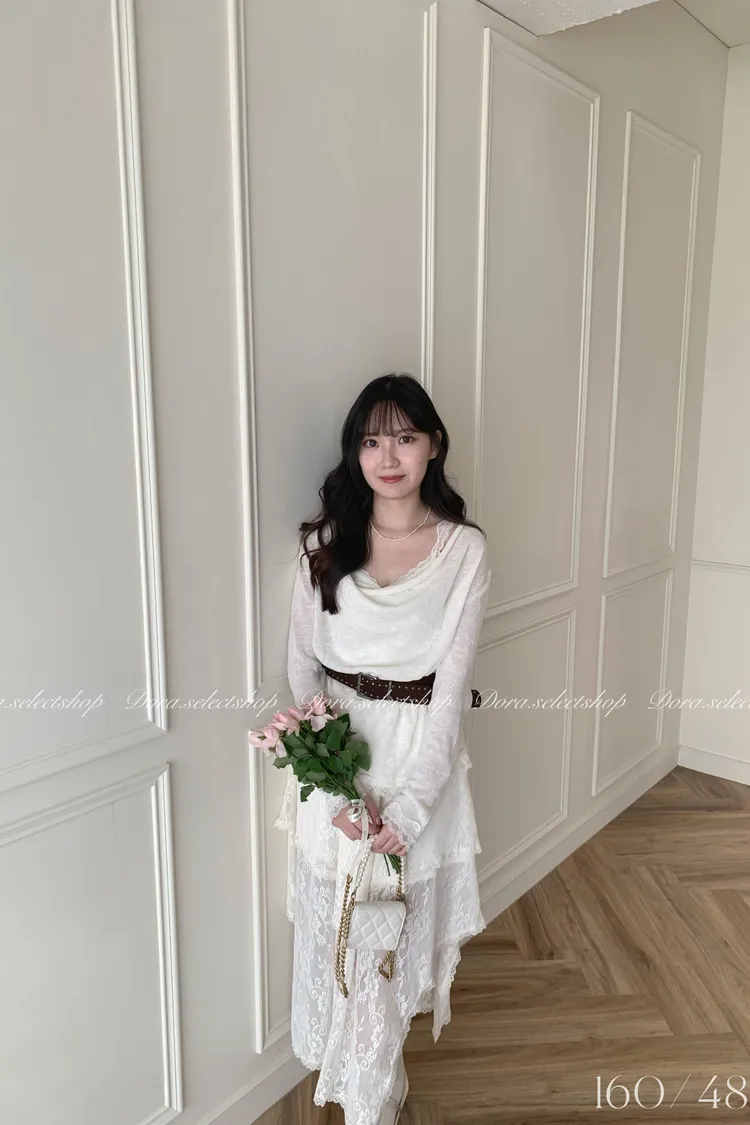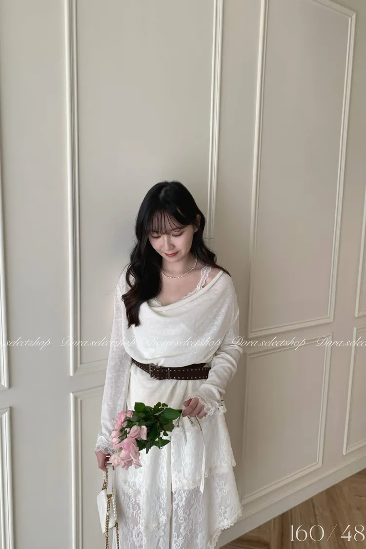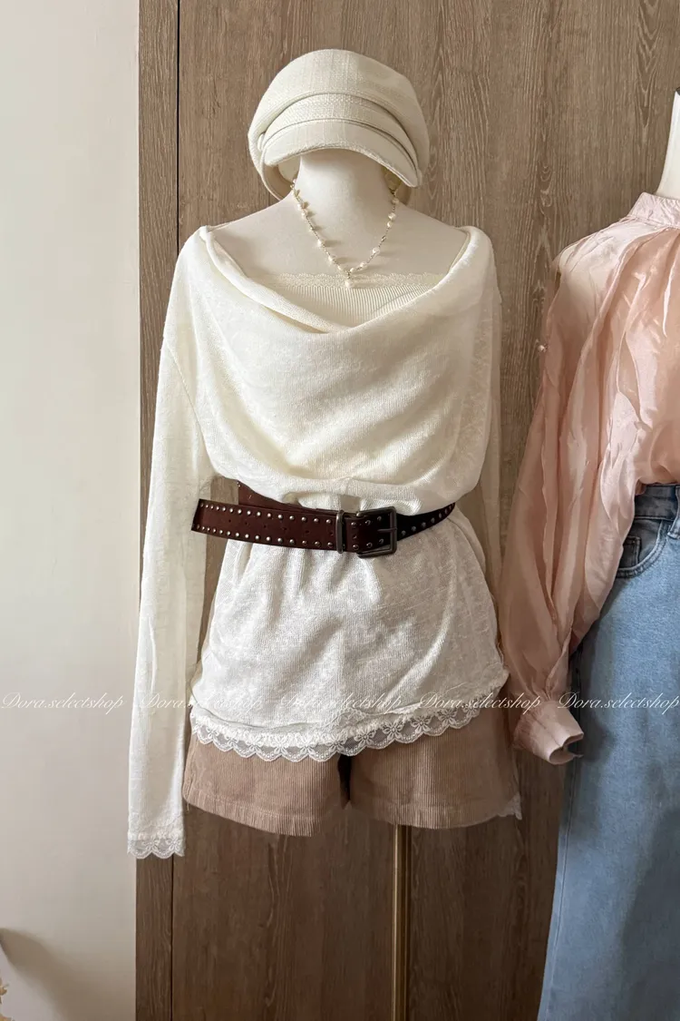 (限量預購!!!)慵懶性感垂領蕾絲滾邊針織衣(附腰帶)---米白