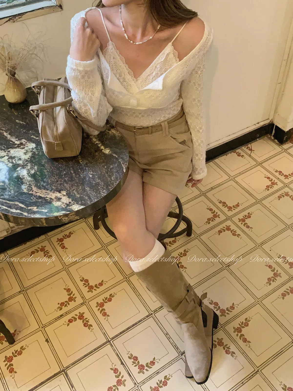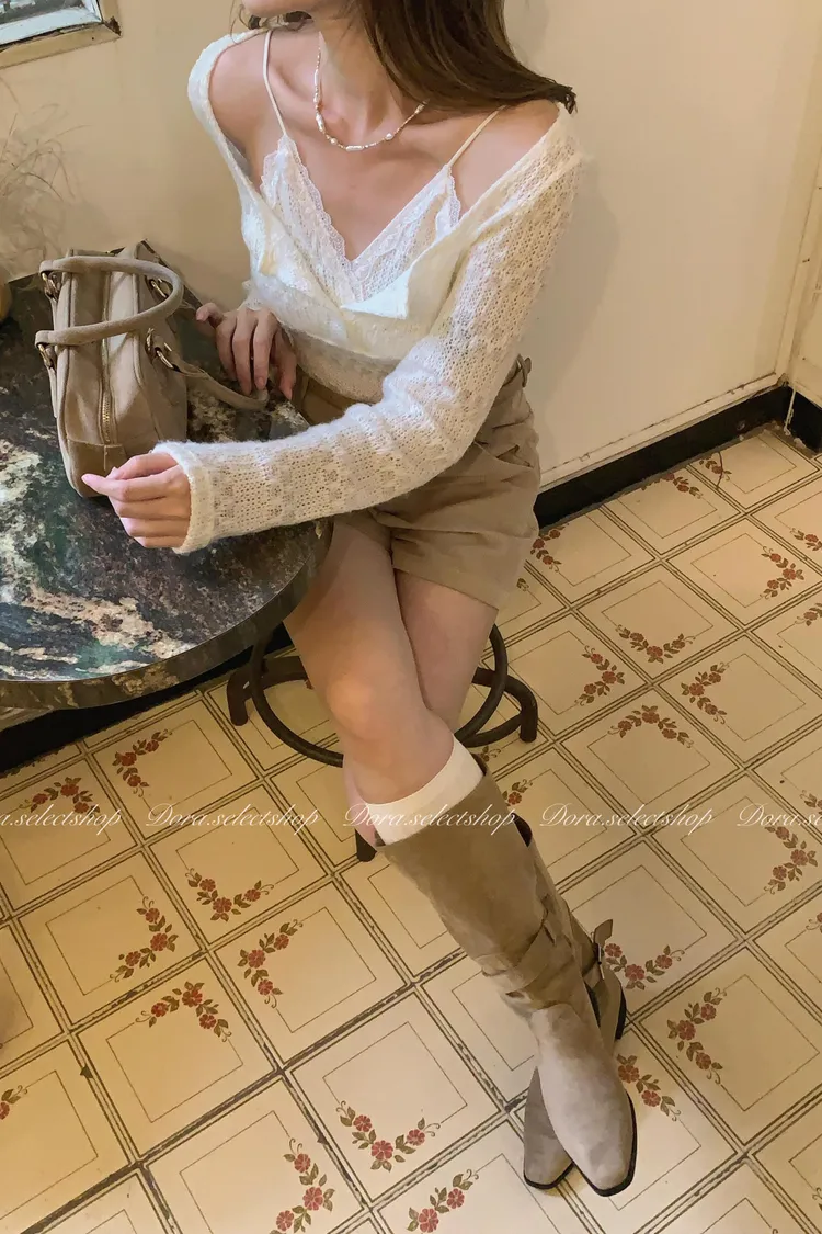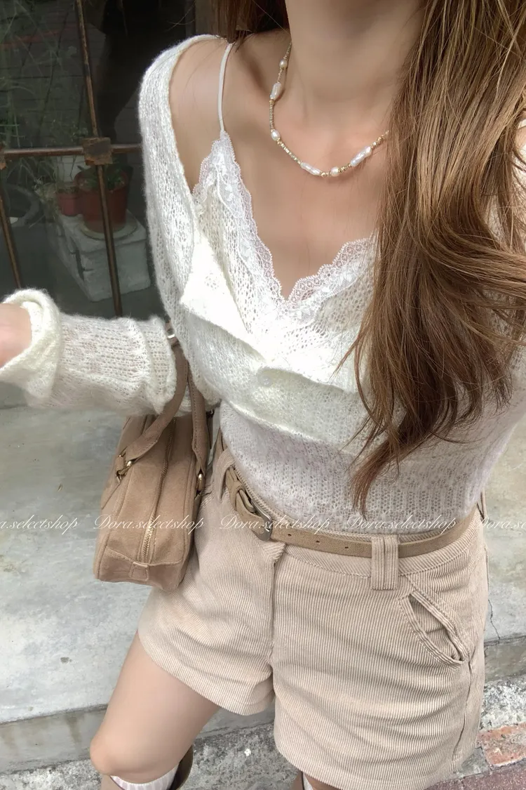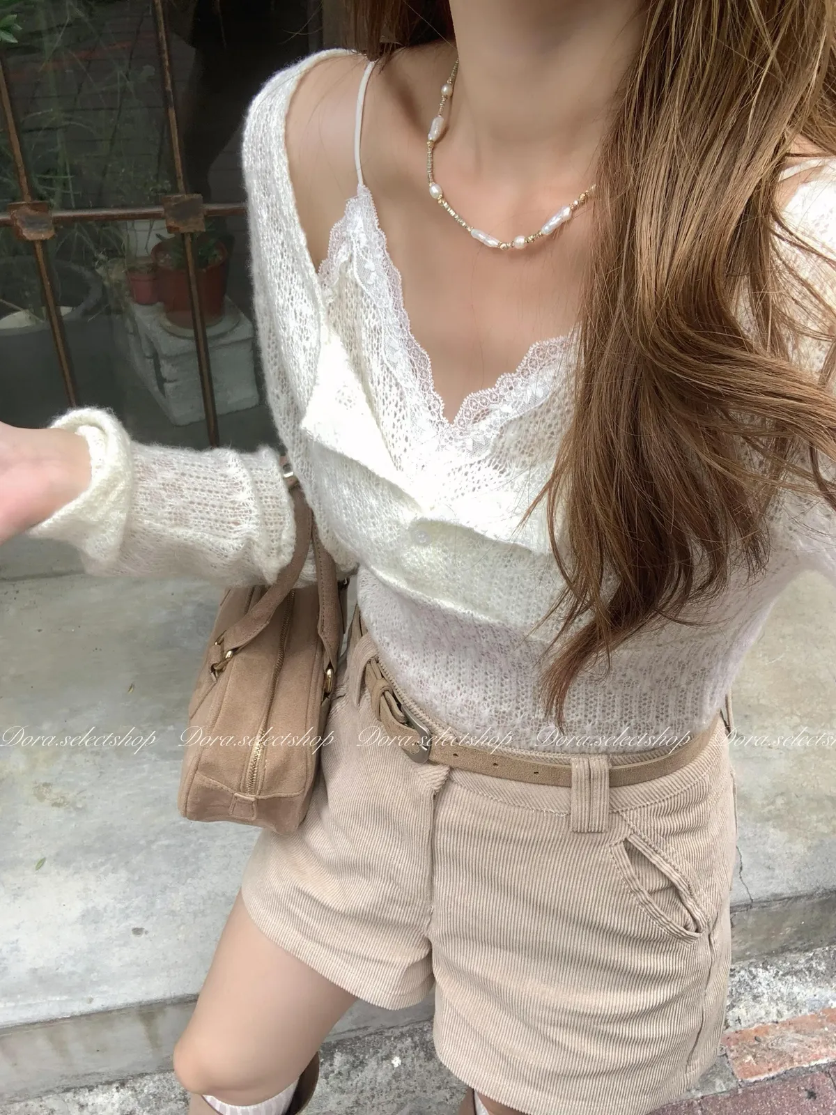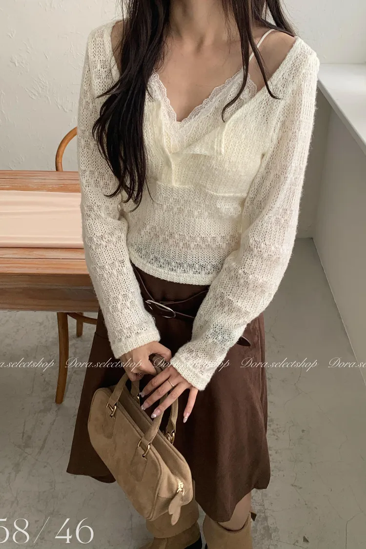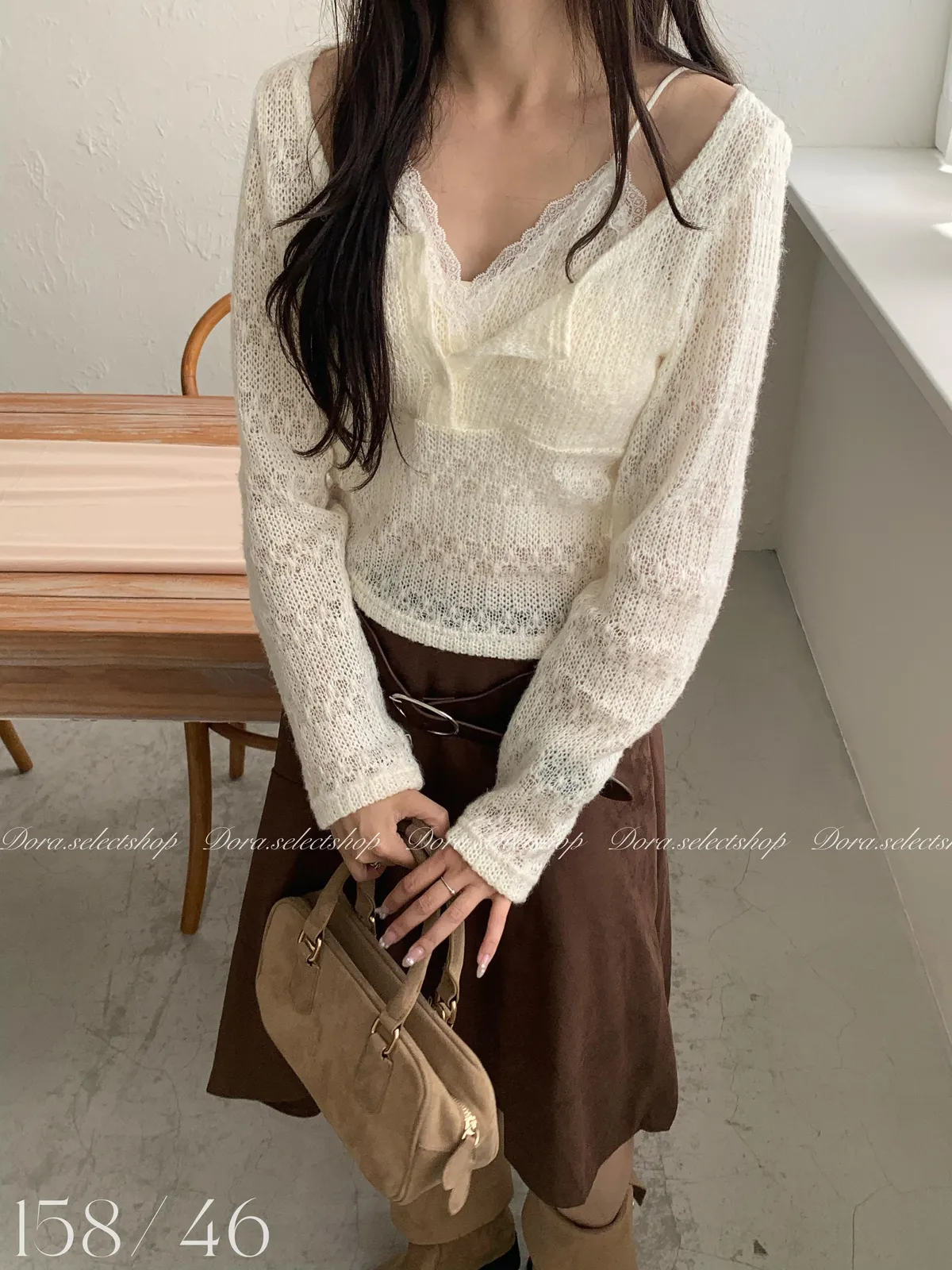 🇰🇷性感浪漫兼具假兩件蕾絲針織上衣---米白