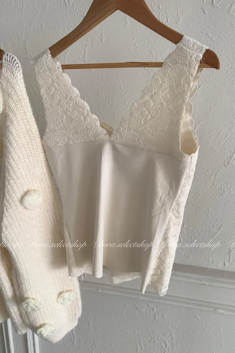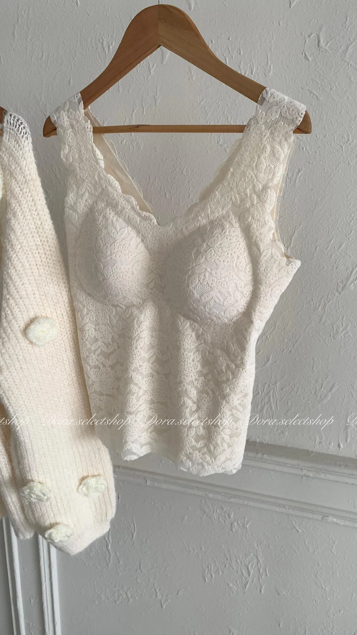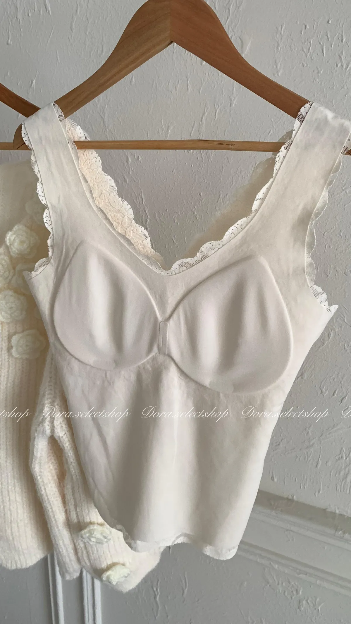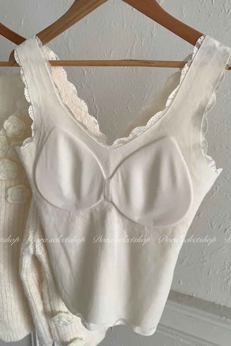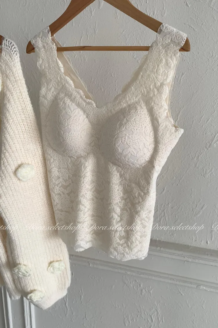 優雅內在美微磨毛彈性布蕾絲背心(附罩杯)---米白