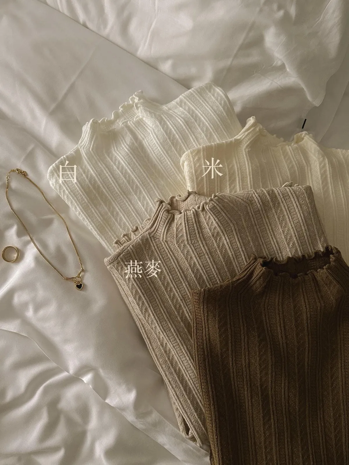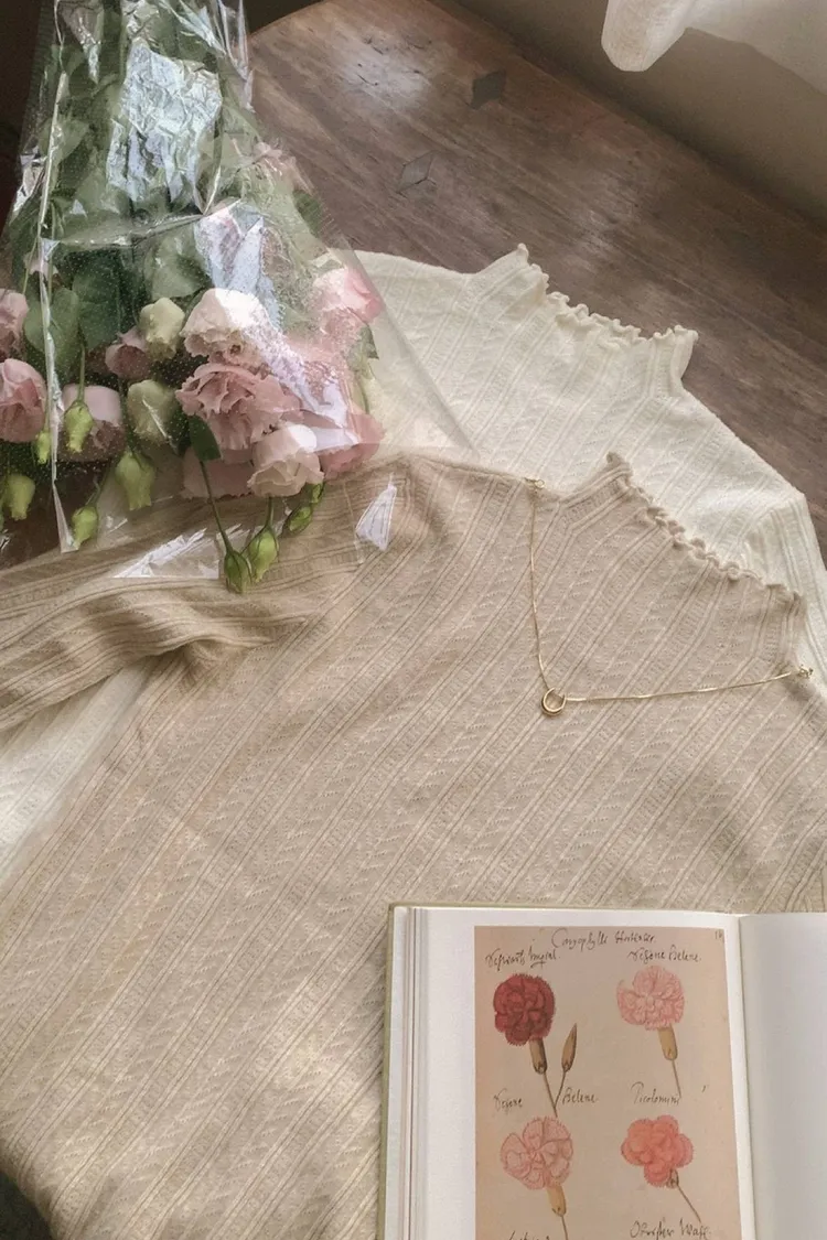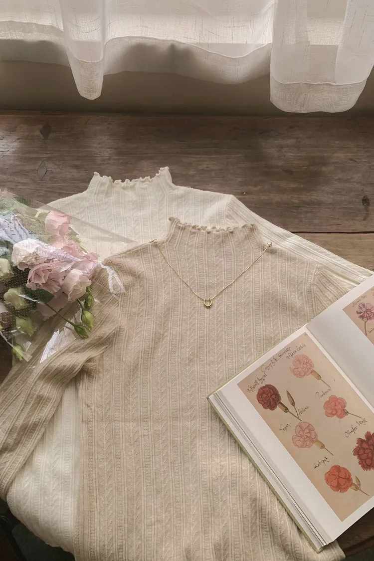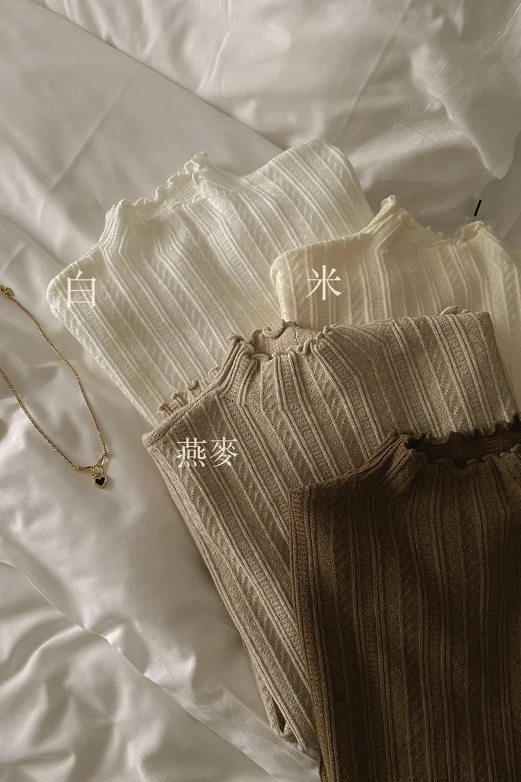 雕花壓褶捲邊立領針織上衣---燕麥