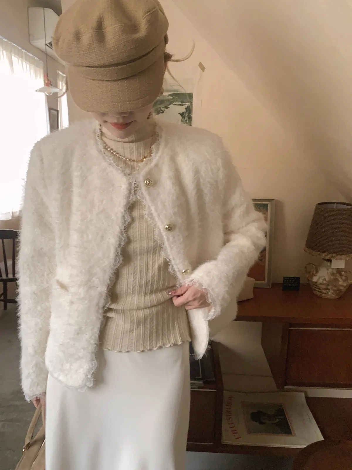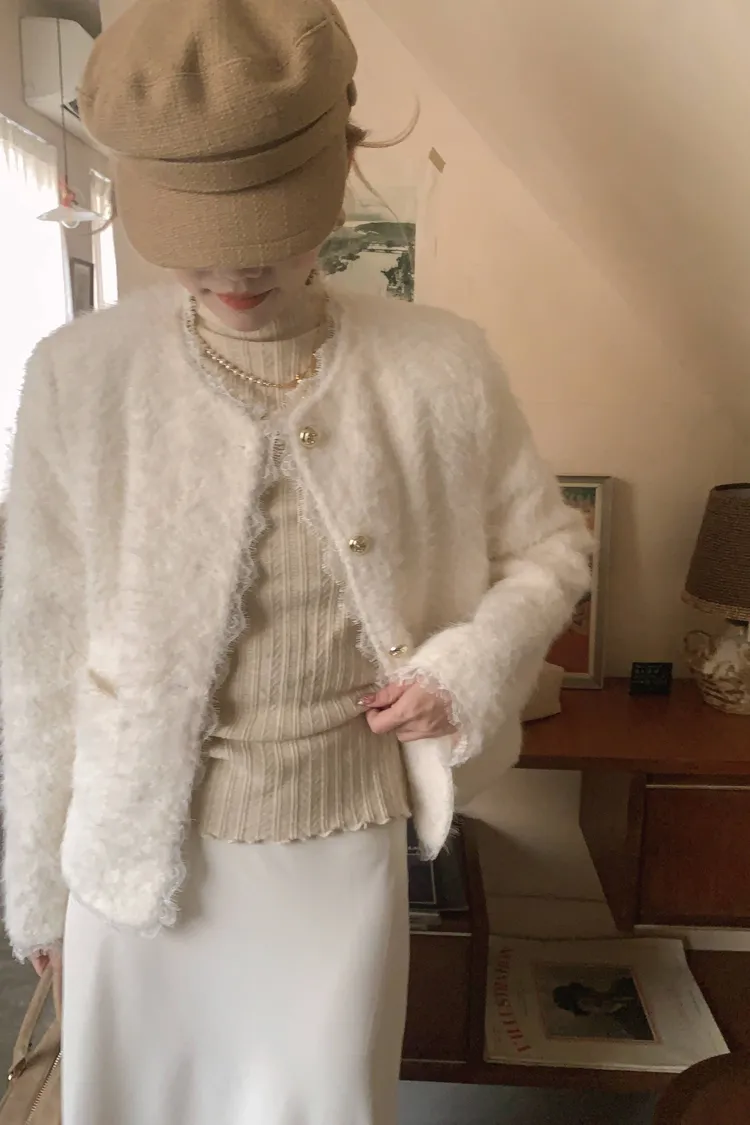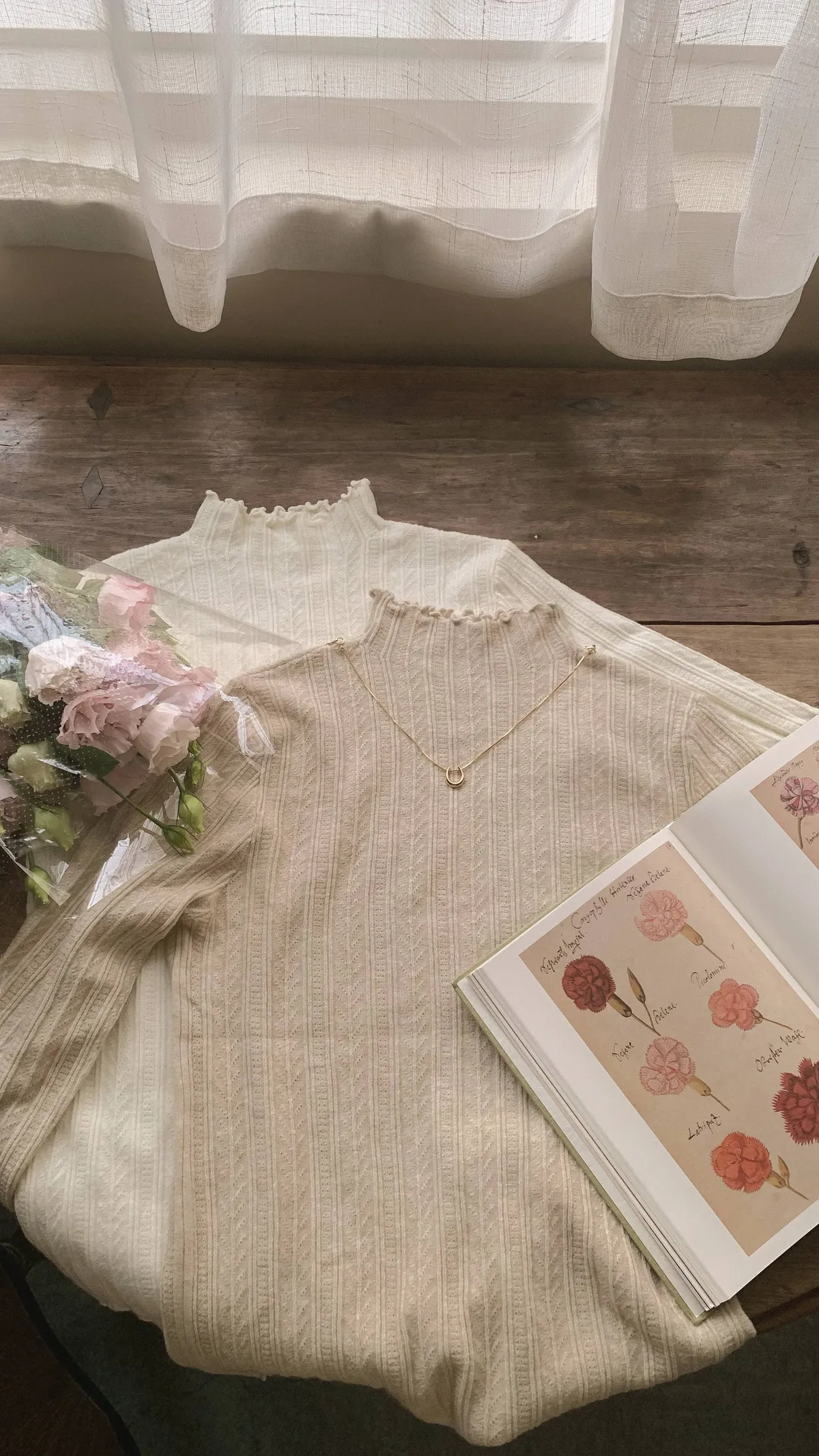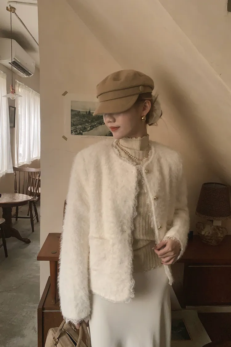 雕花壓褶捲邊立領針織上衣---燕麥