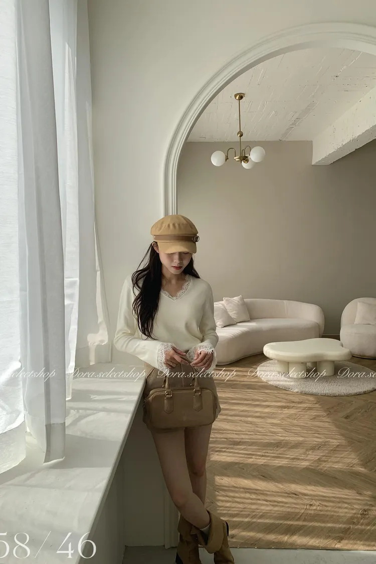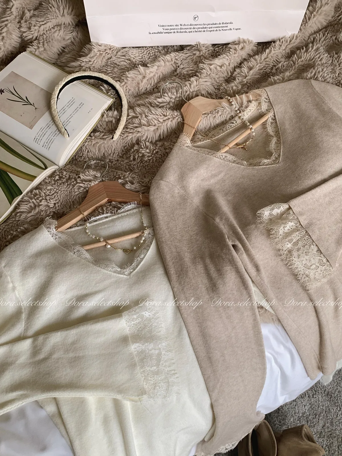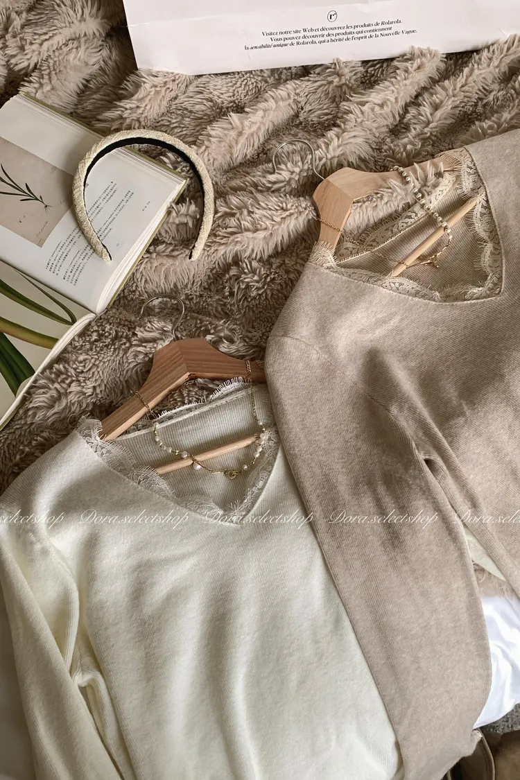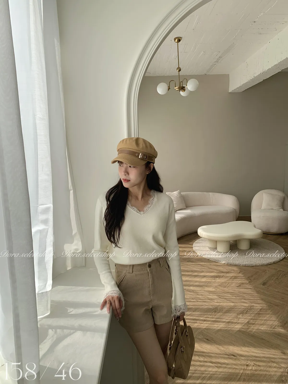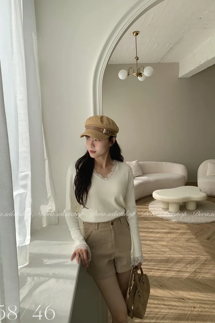 超親膚扎實針織V領蕾絲邊上衣---米白