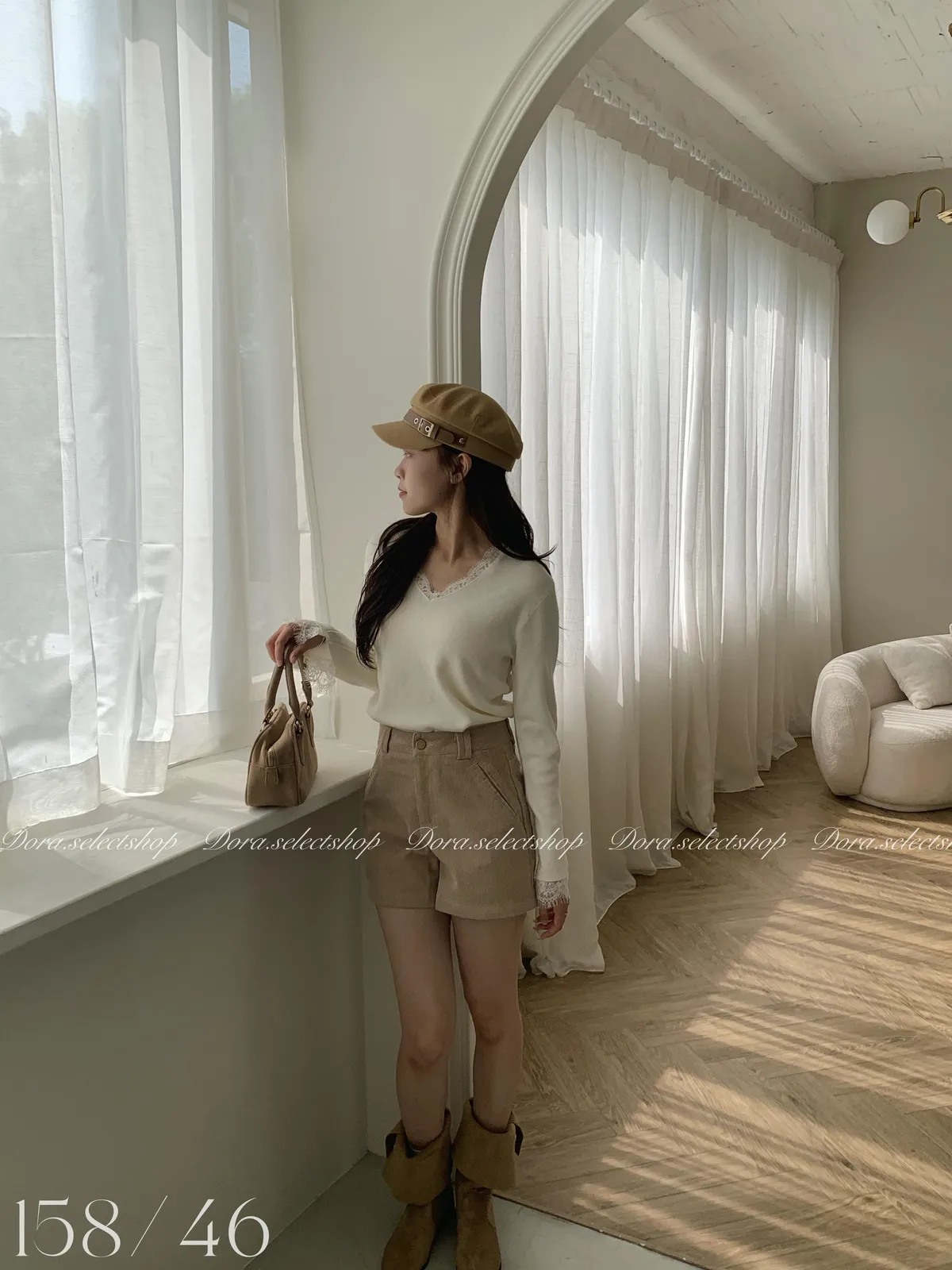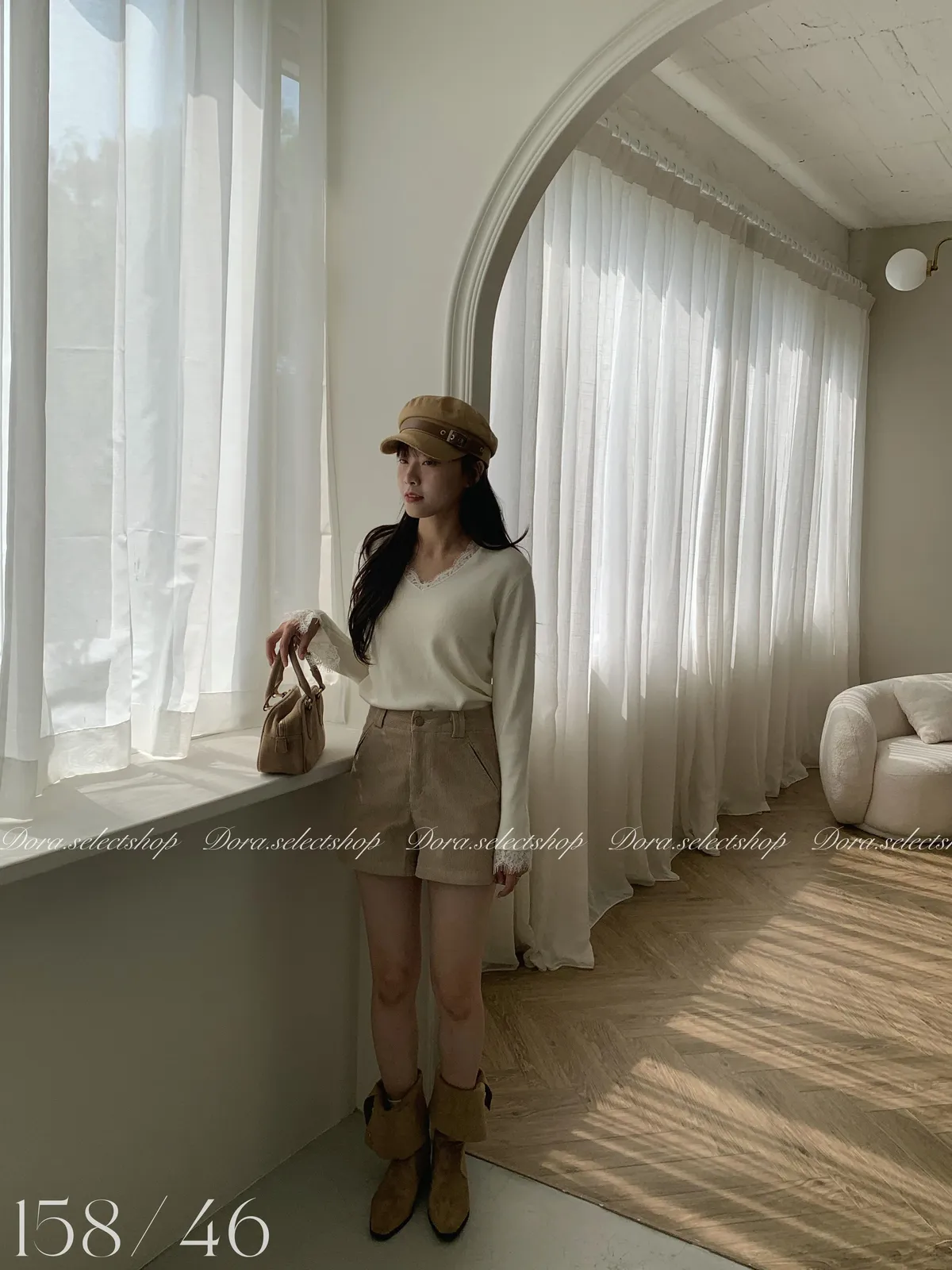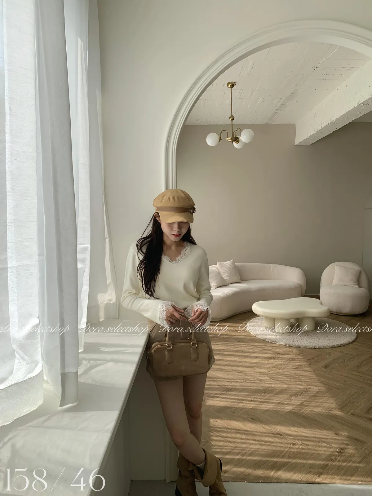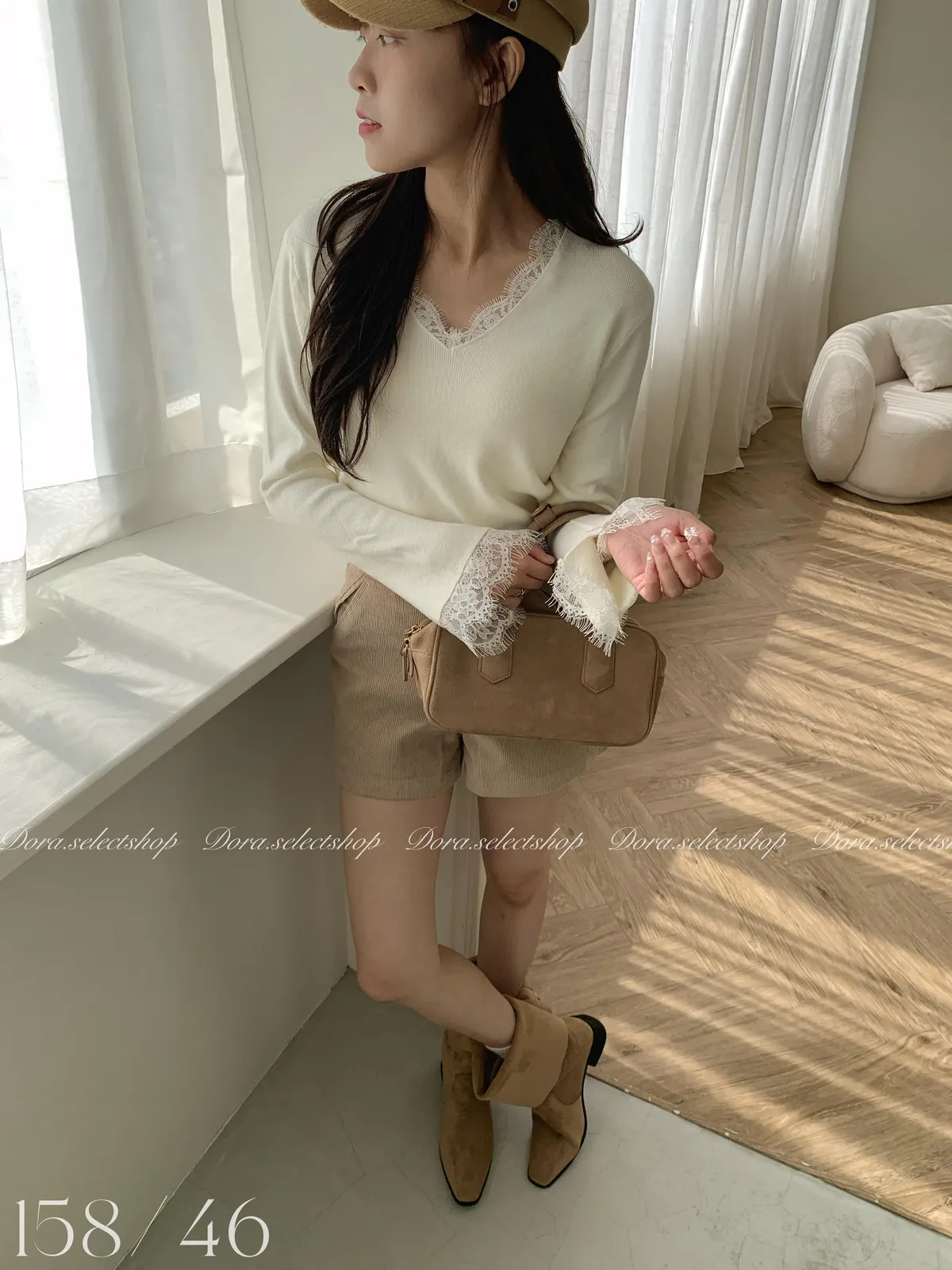 超親膚扎實針織V領蕾絲邊上衣---米白