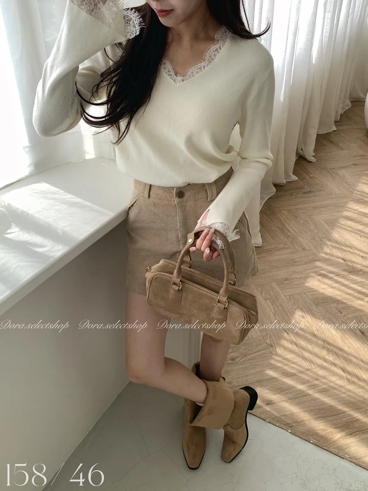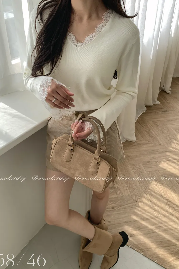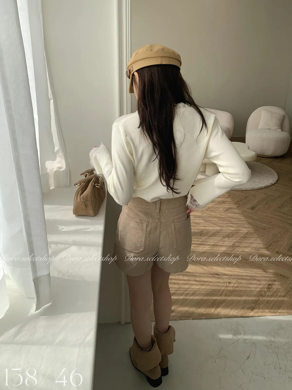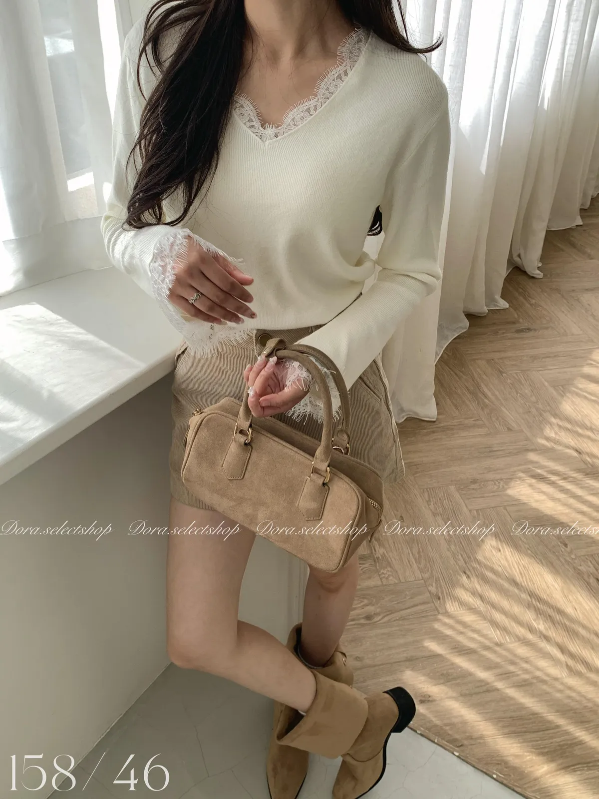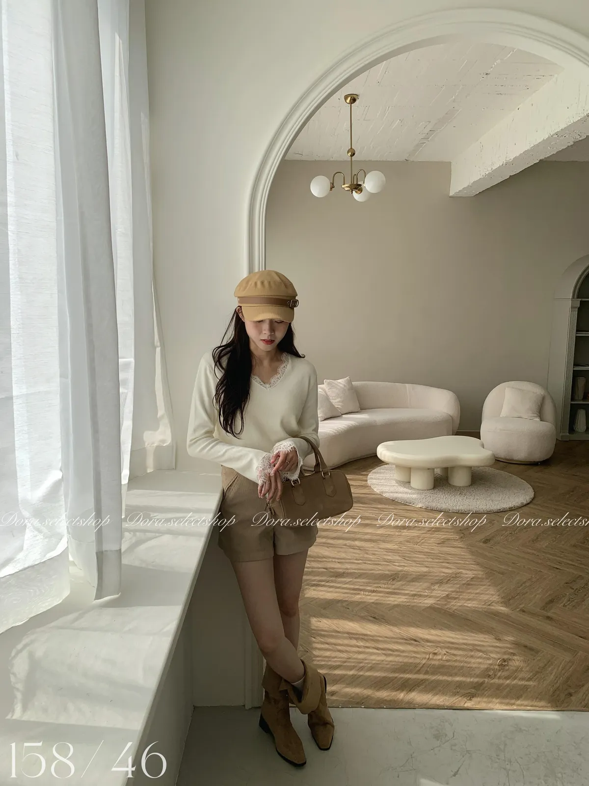 超親膚扎實針織V領蕾絲邊上衣---米白
