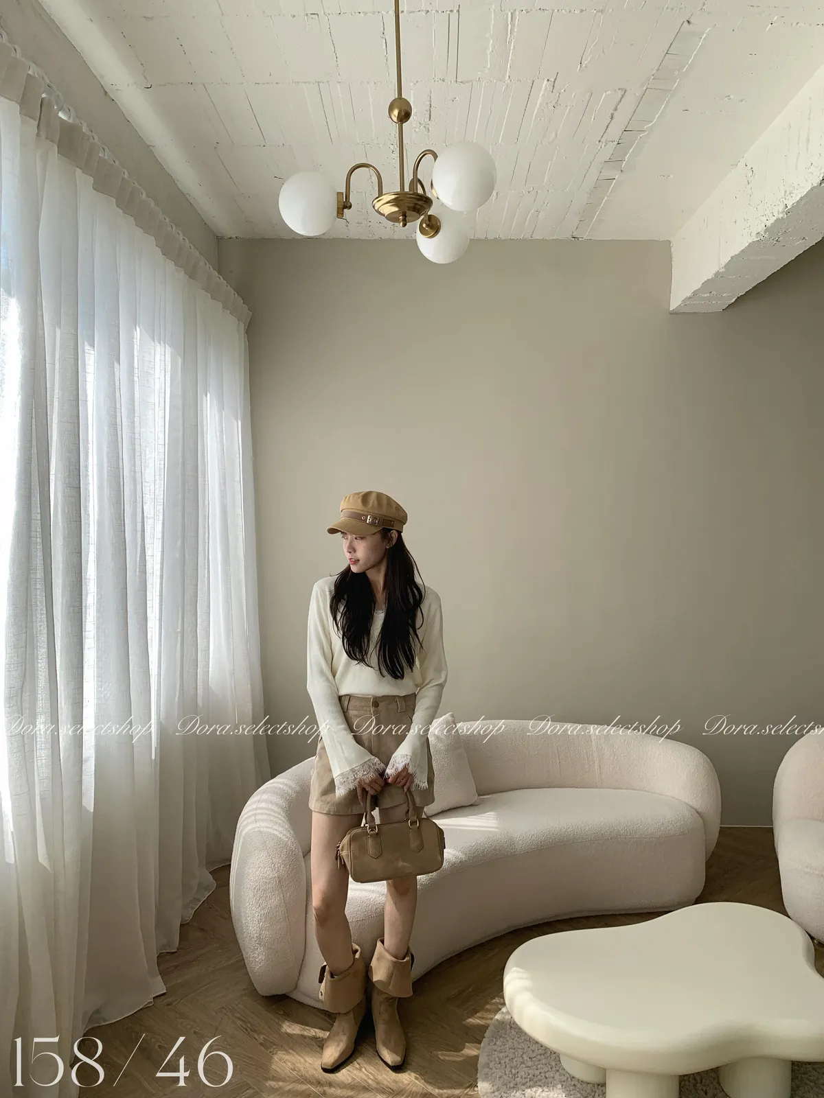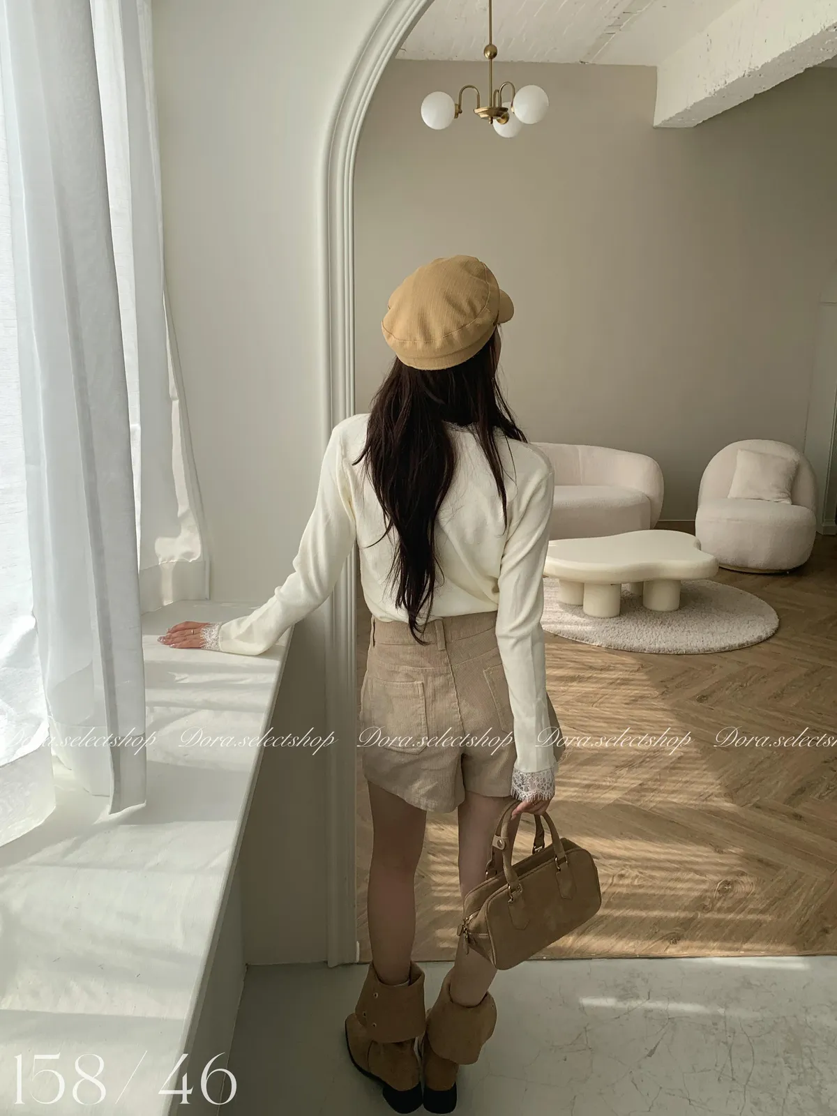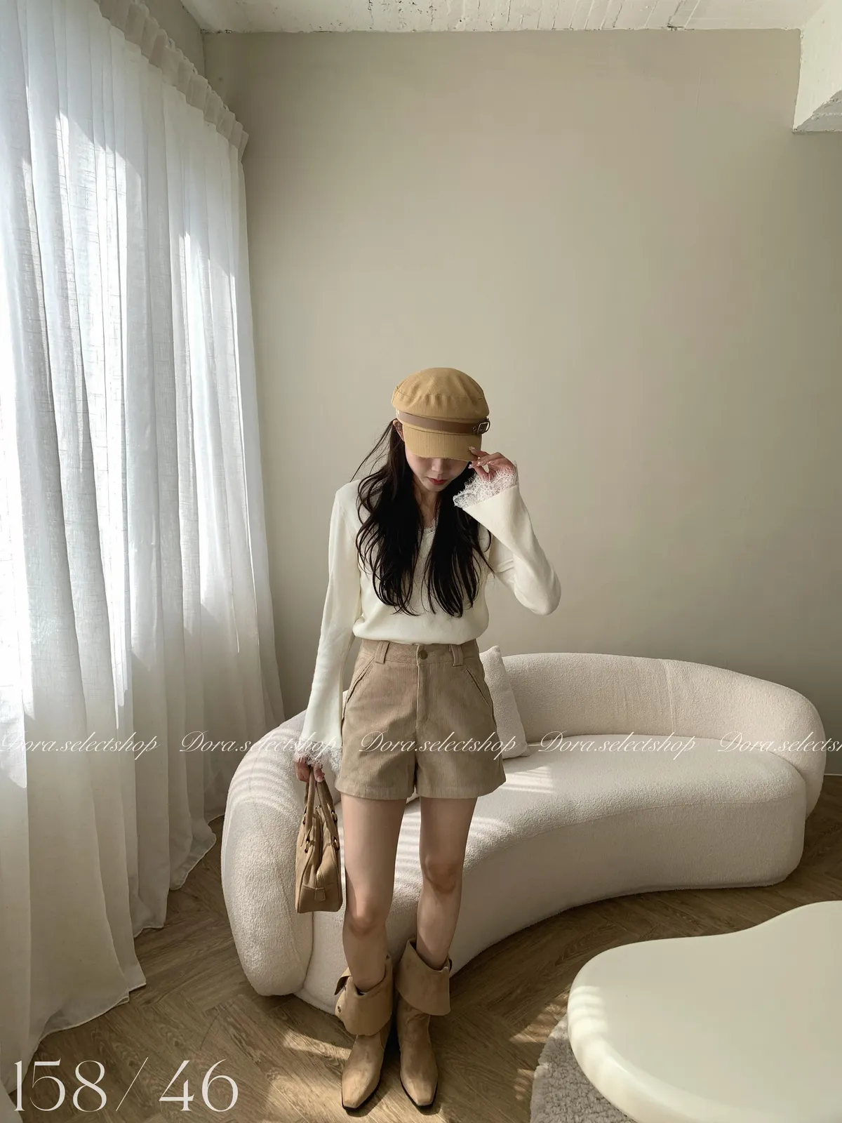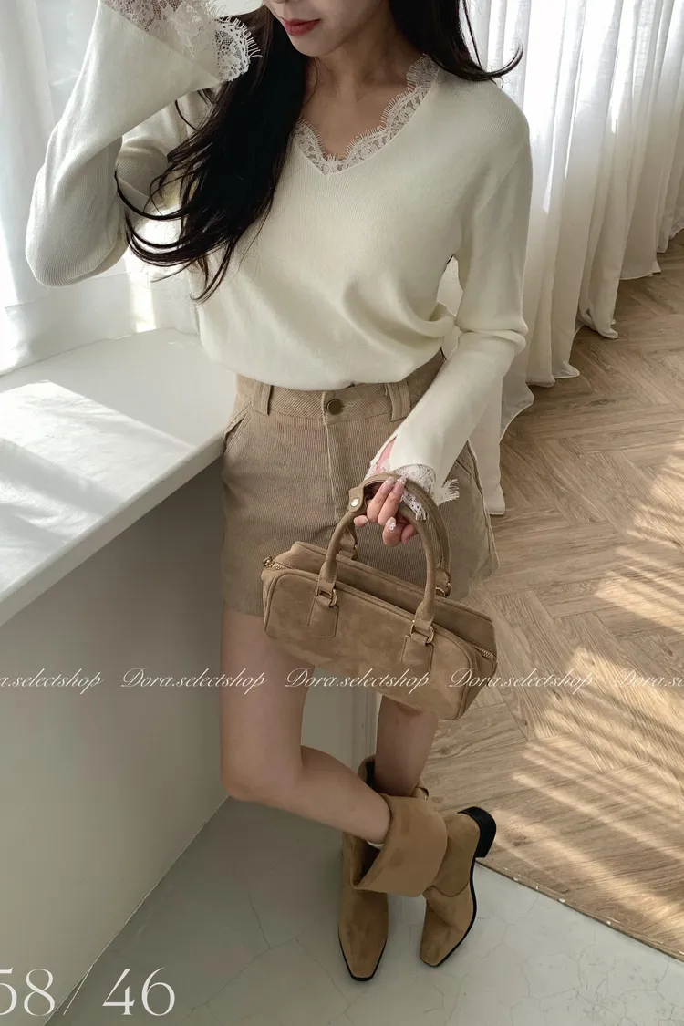 超親膚扎實針織V領蕾絲邊上衣---米白