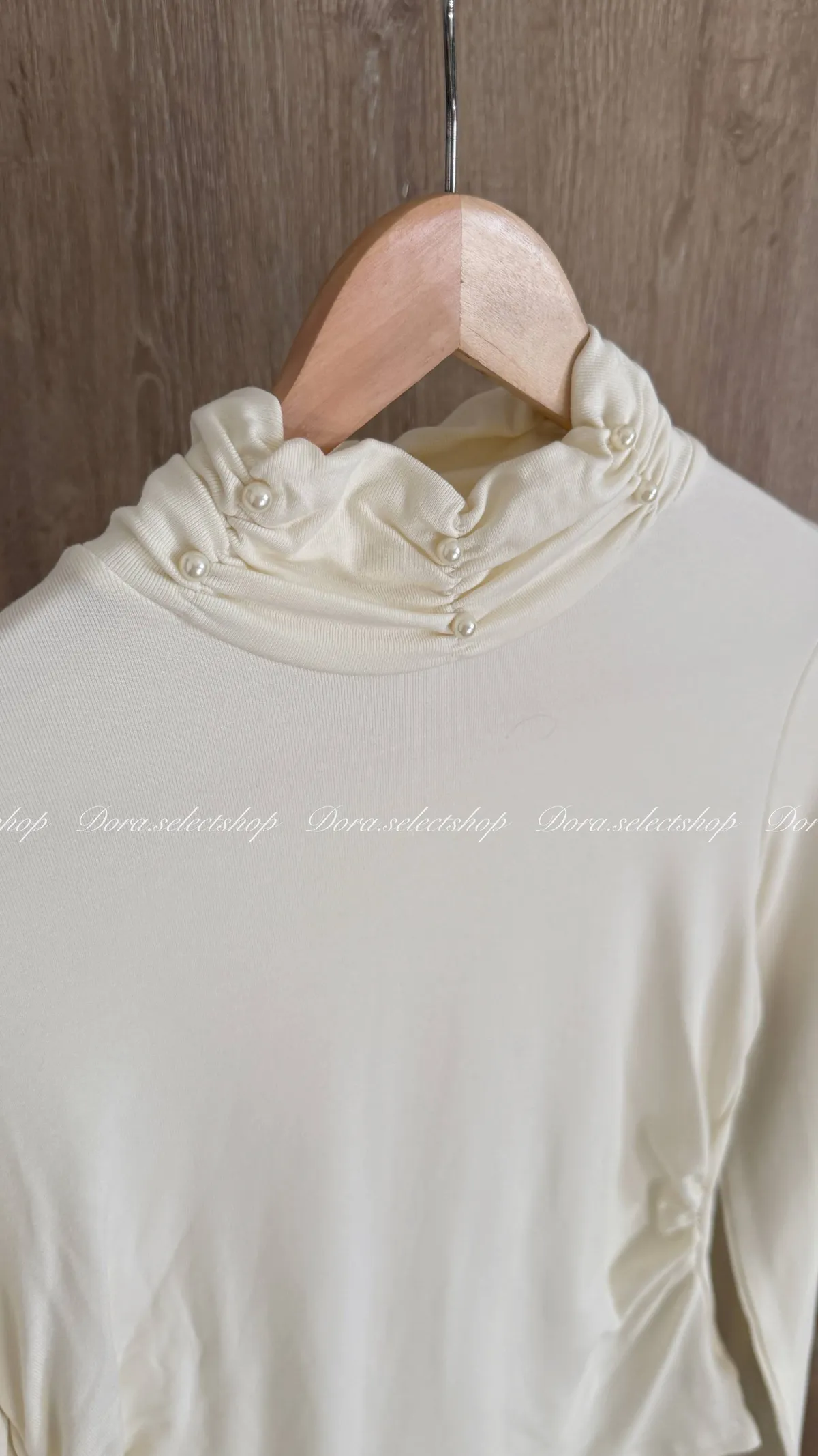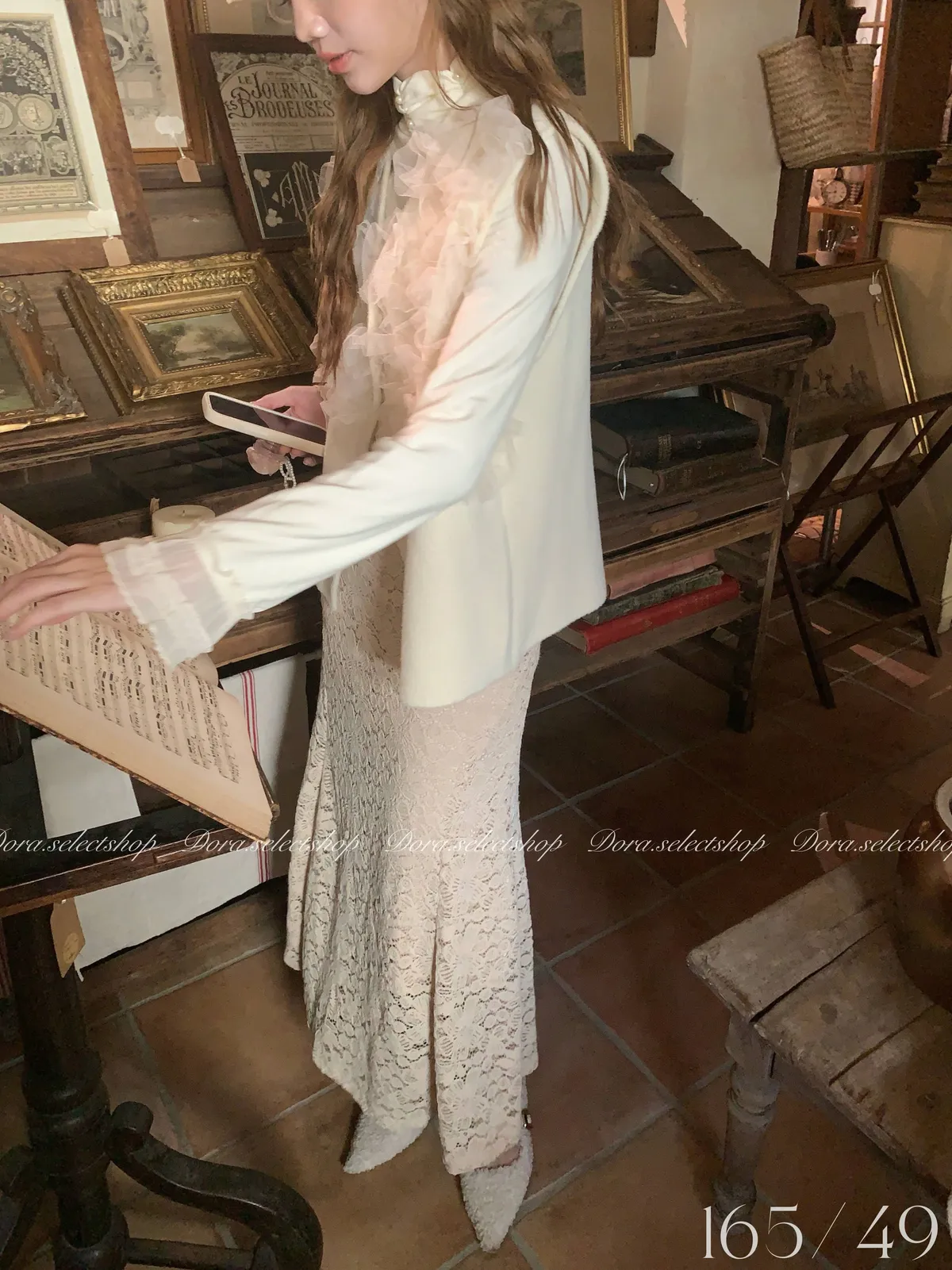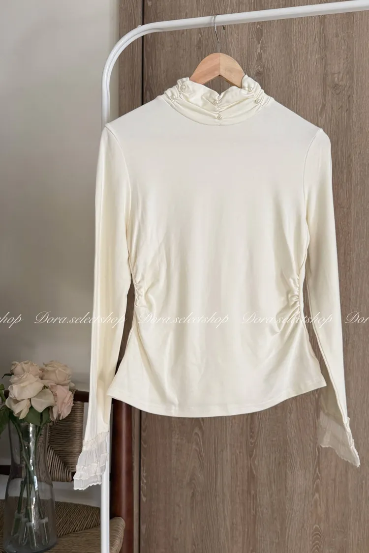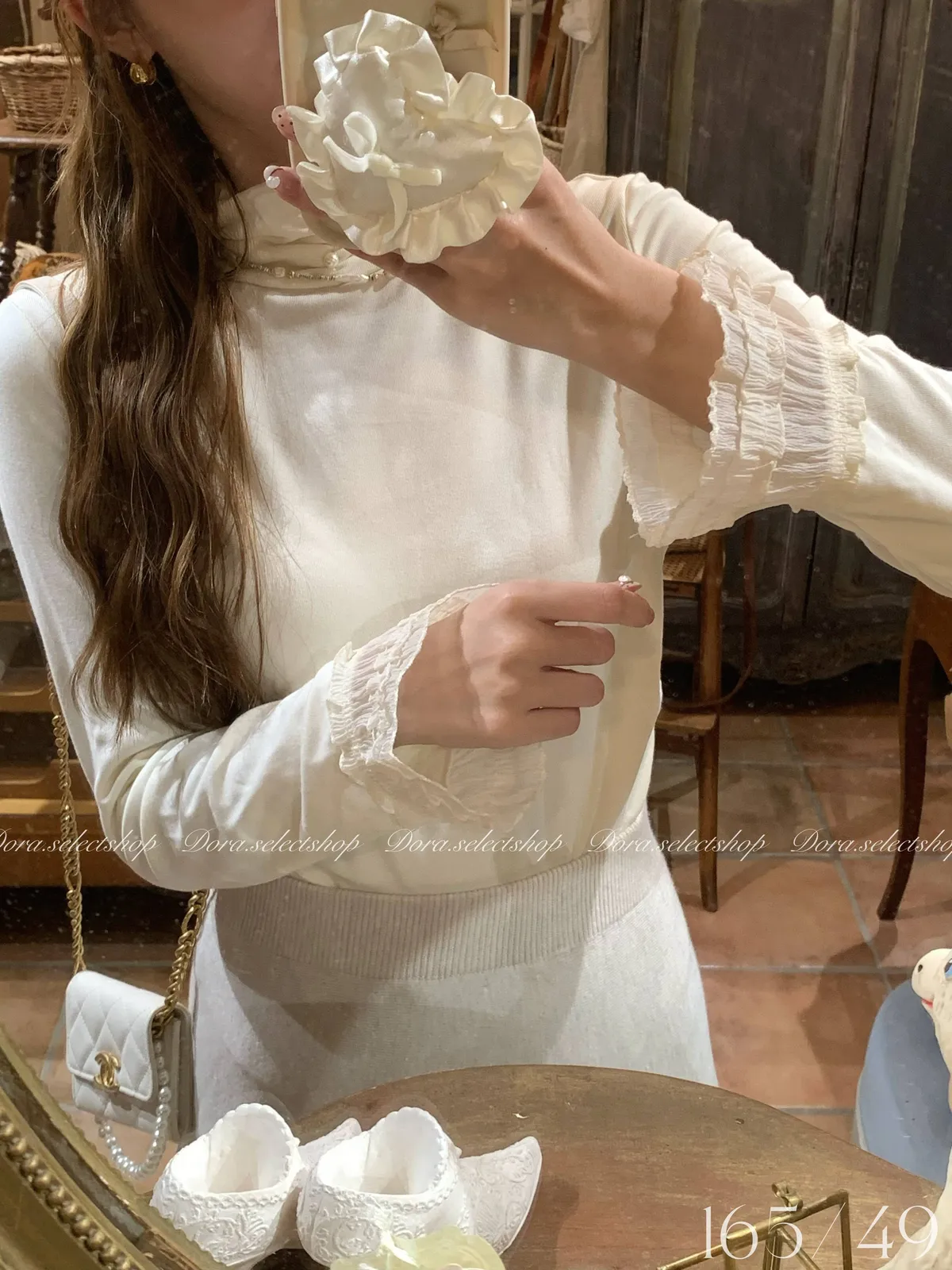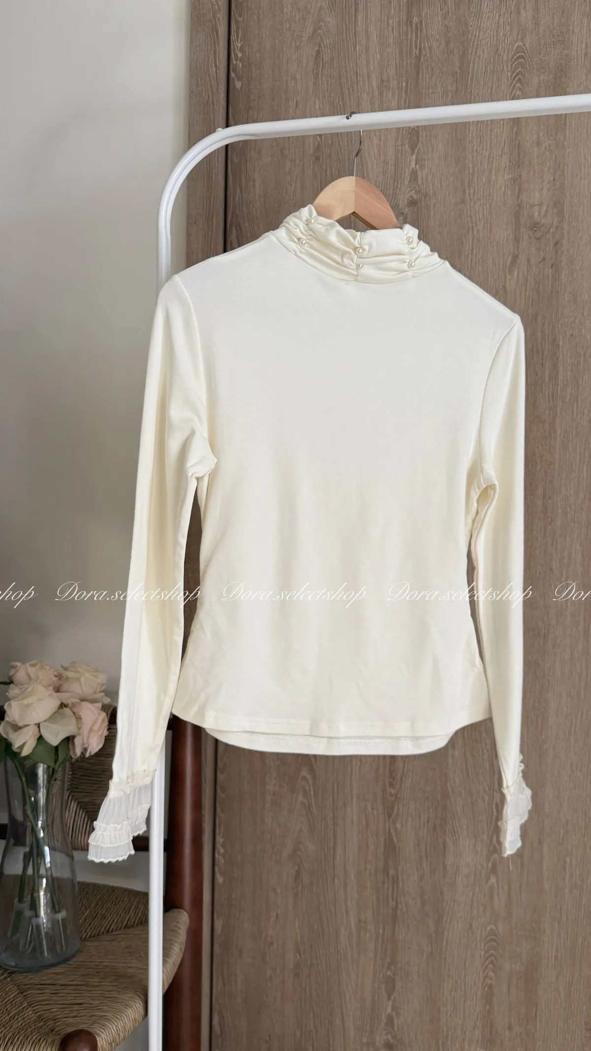 氣質宮廷珍珠領蕾絲拼接長袖上衣---米