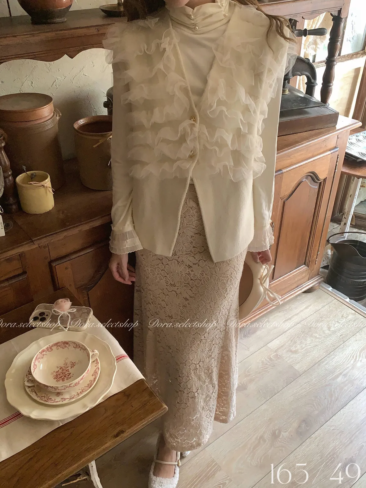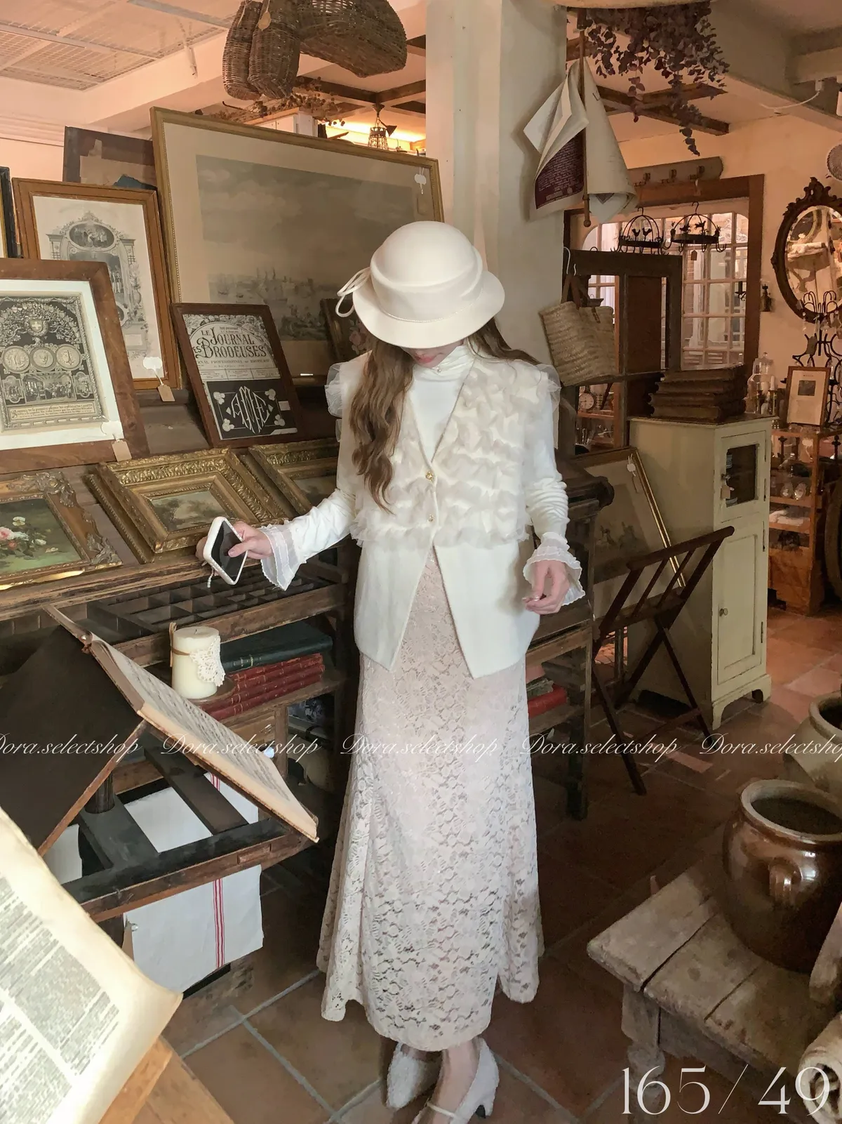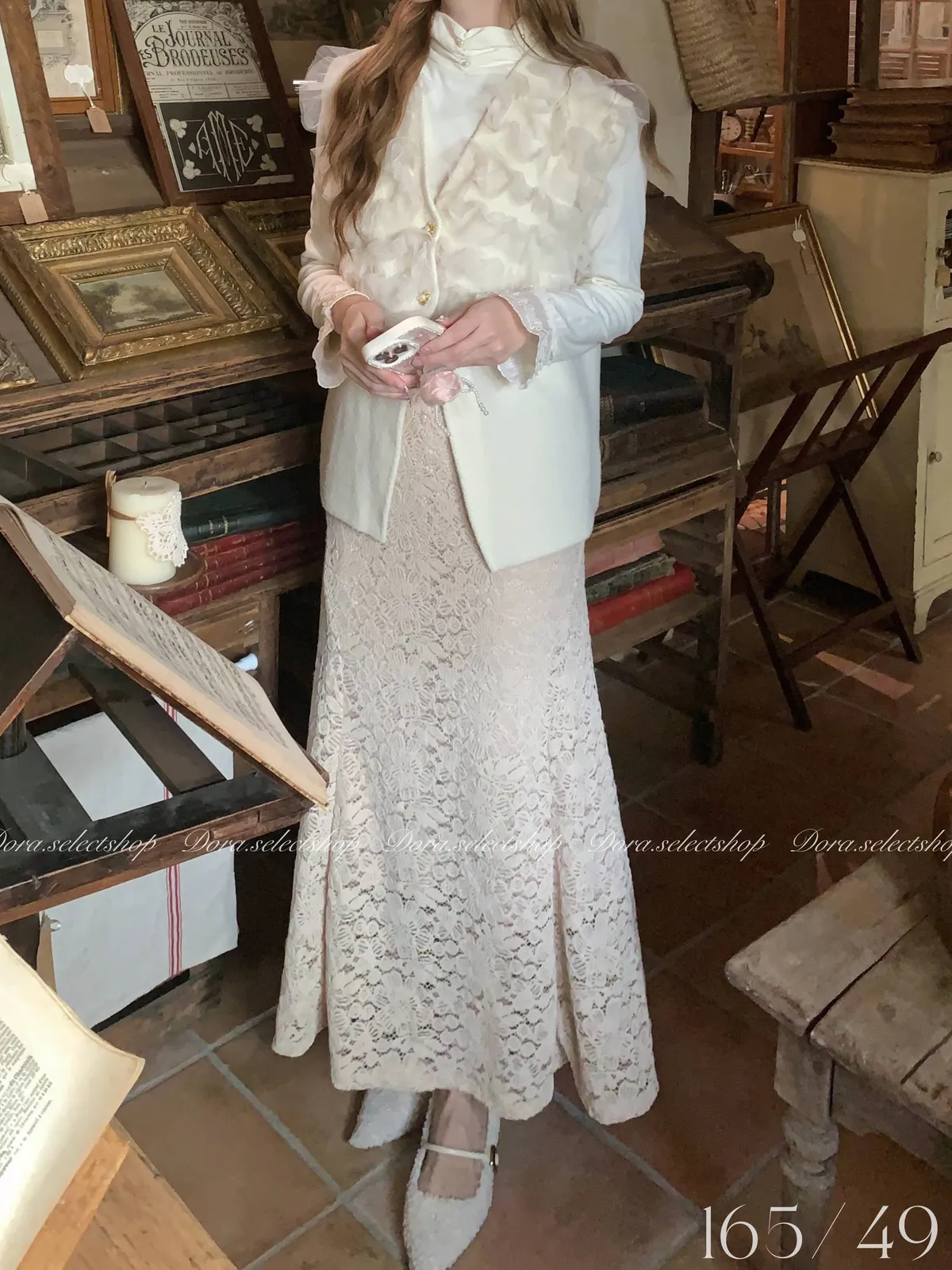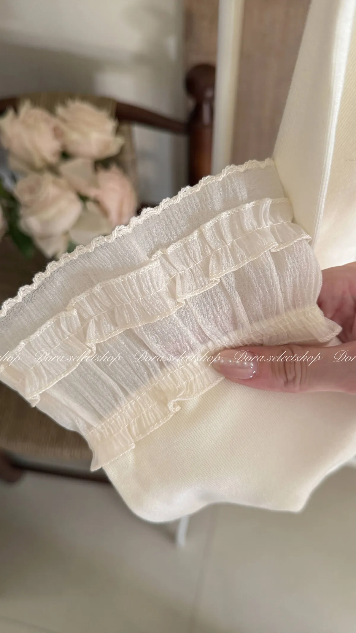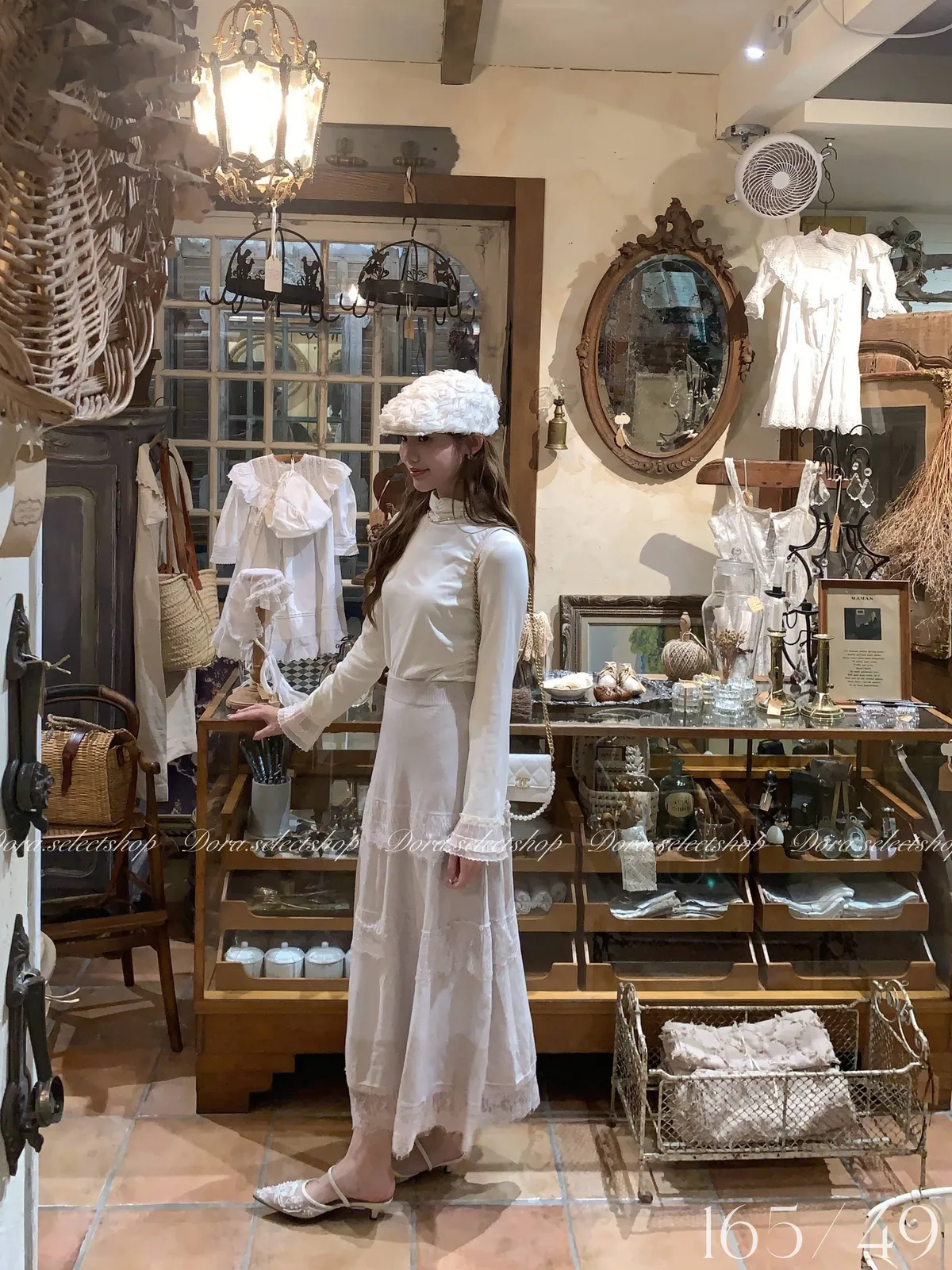 氣質宮廷珍珠領蕾絲拼接長袖上衣---米
