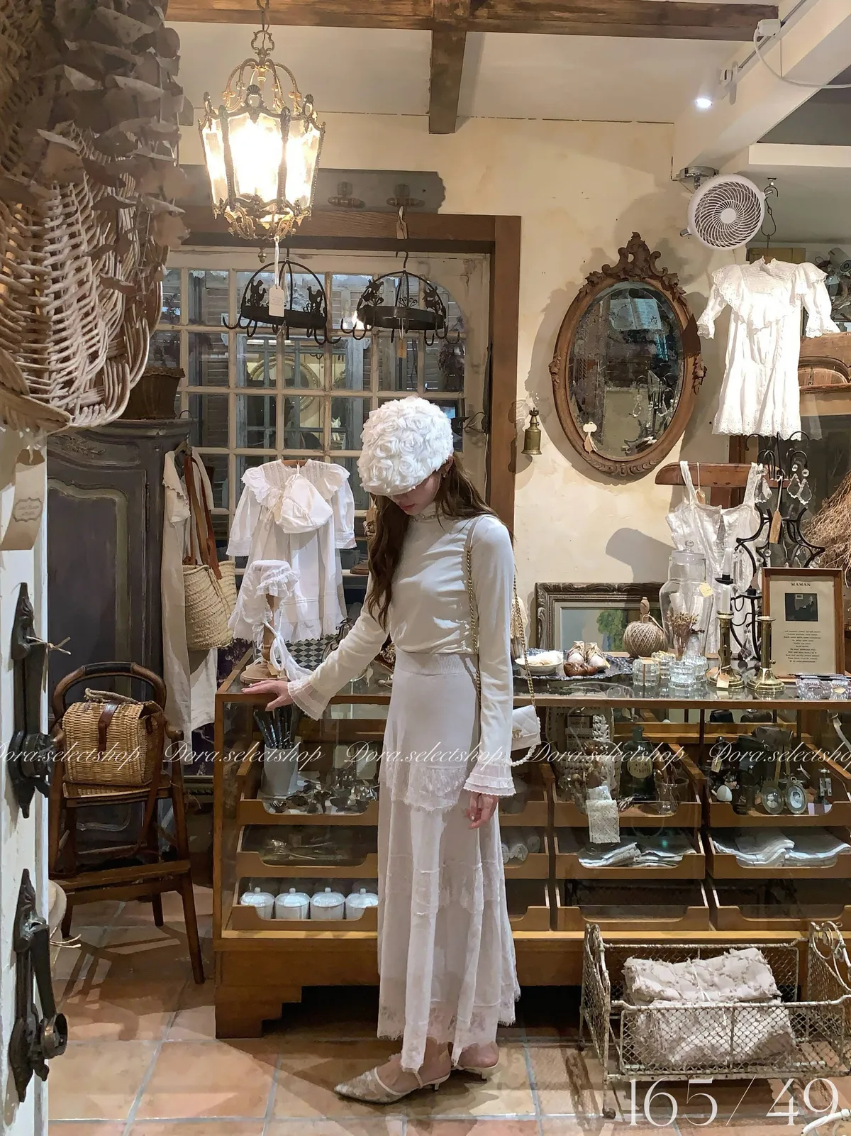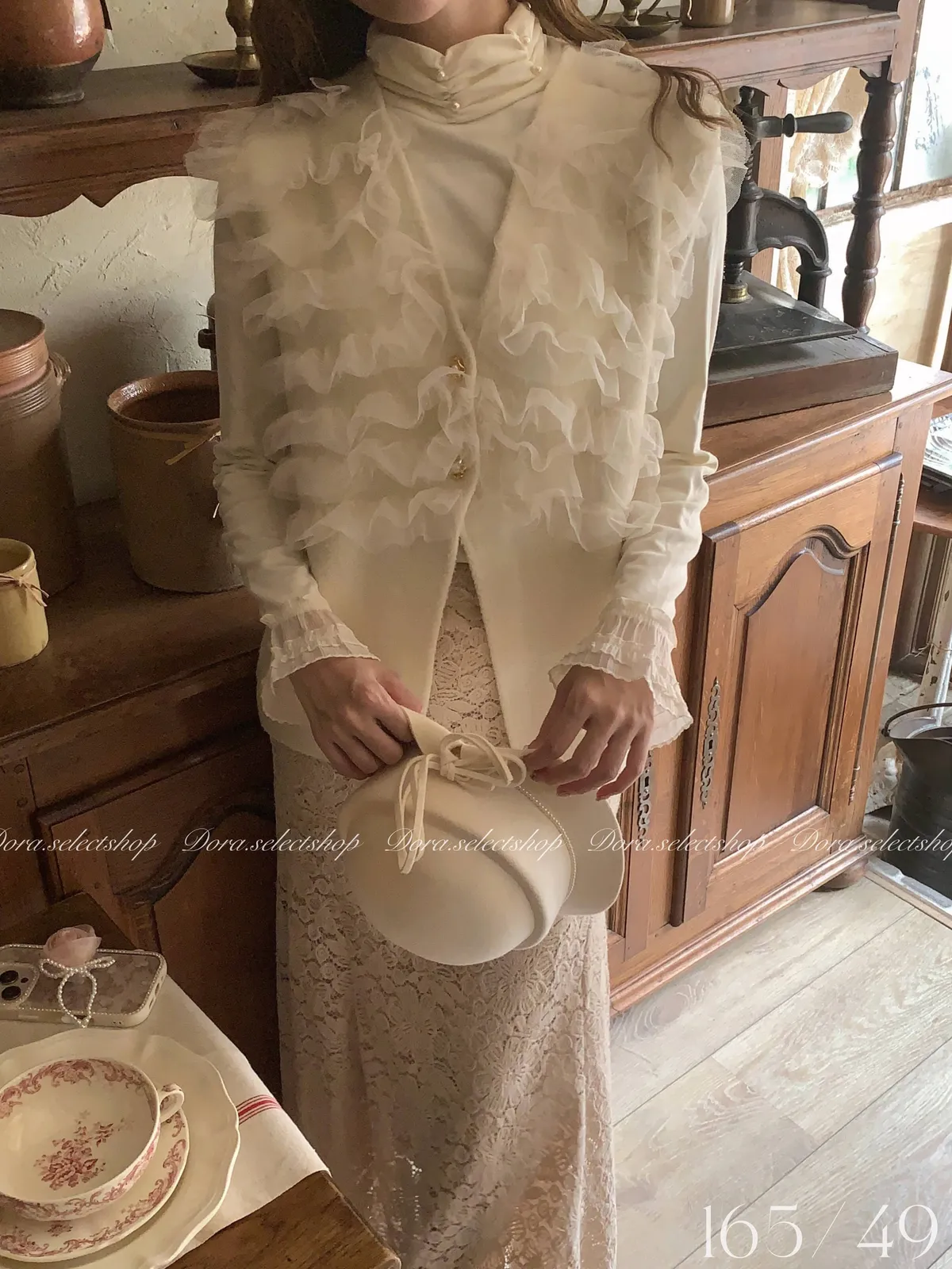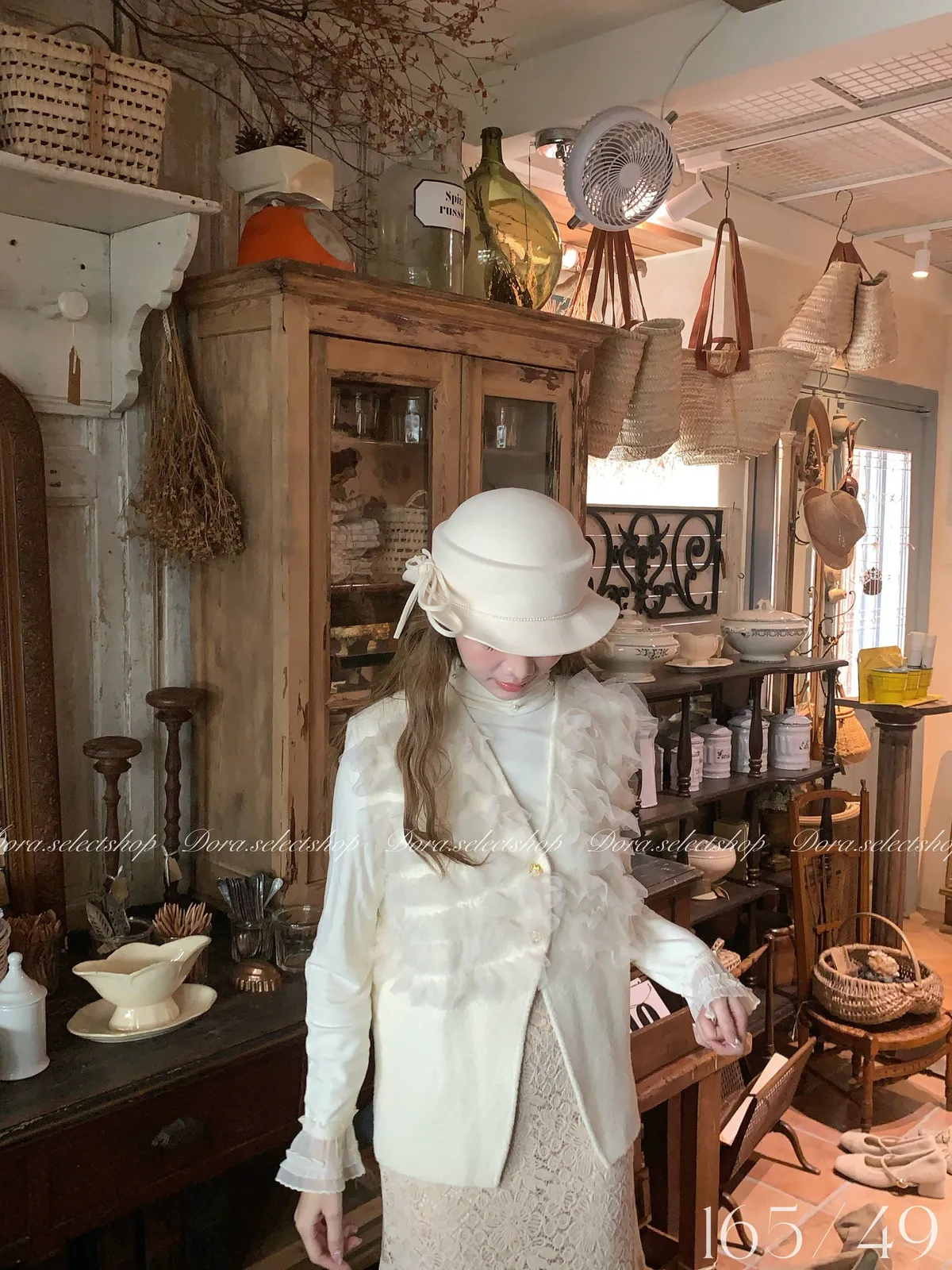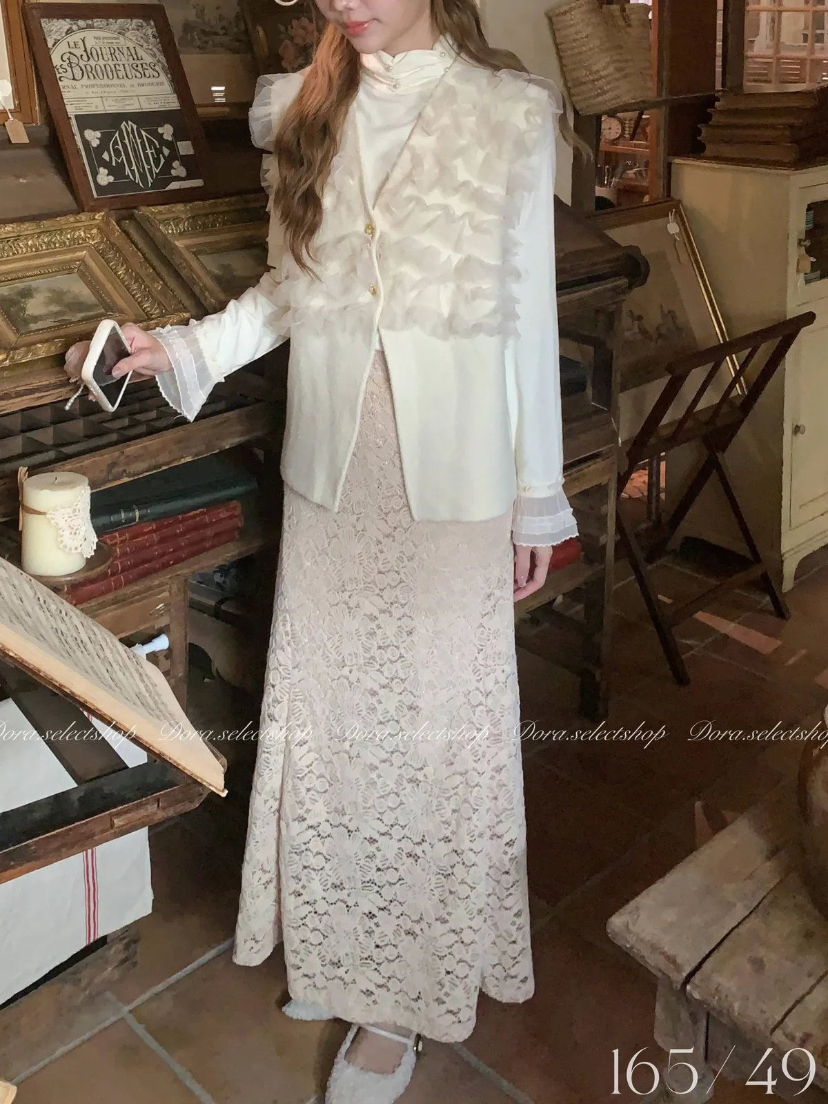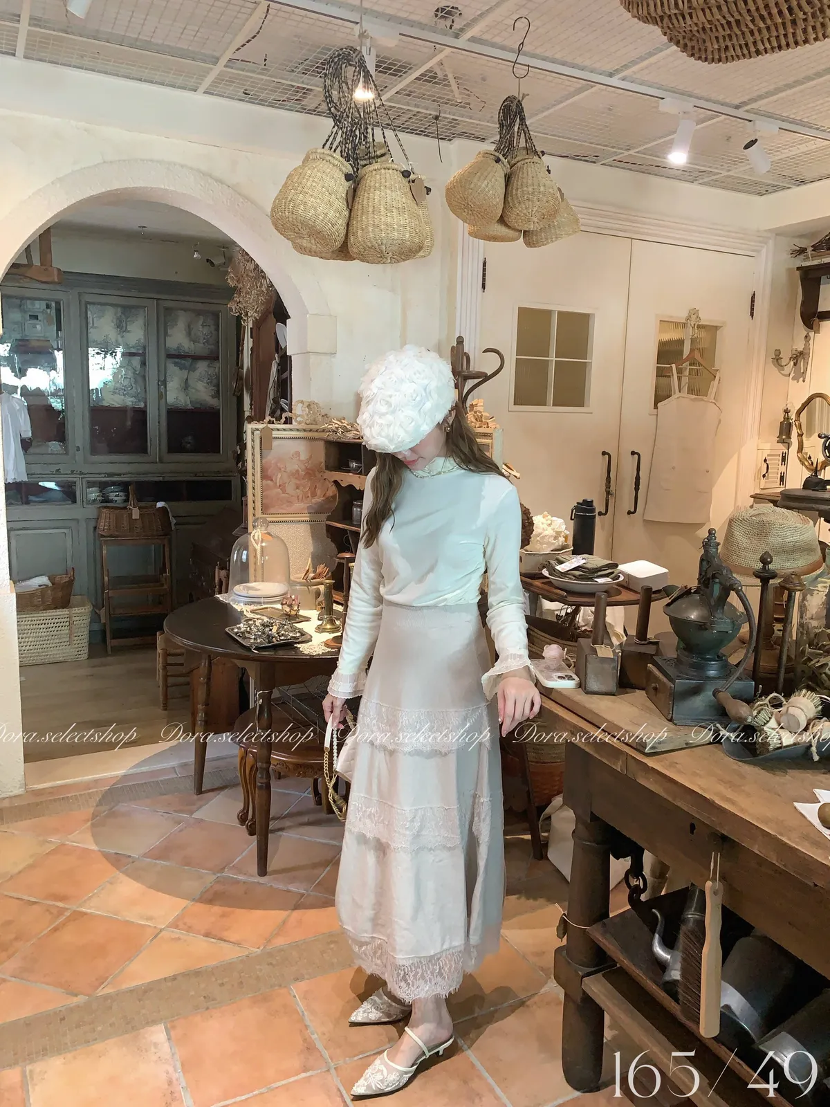 氣質宮廷珍珠領蕾絲拼接長袖上衣---米