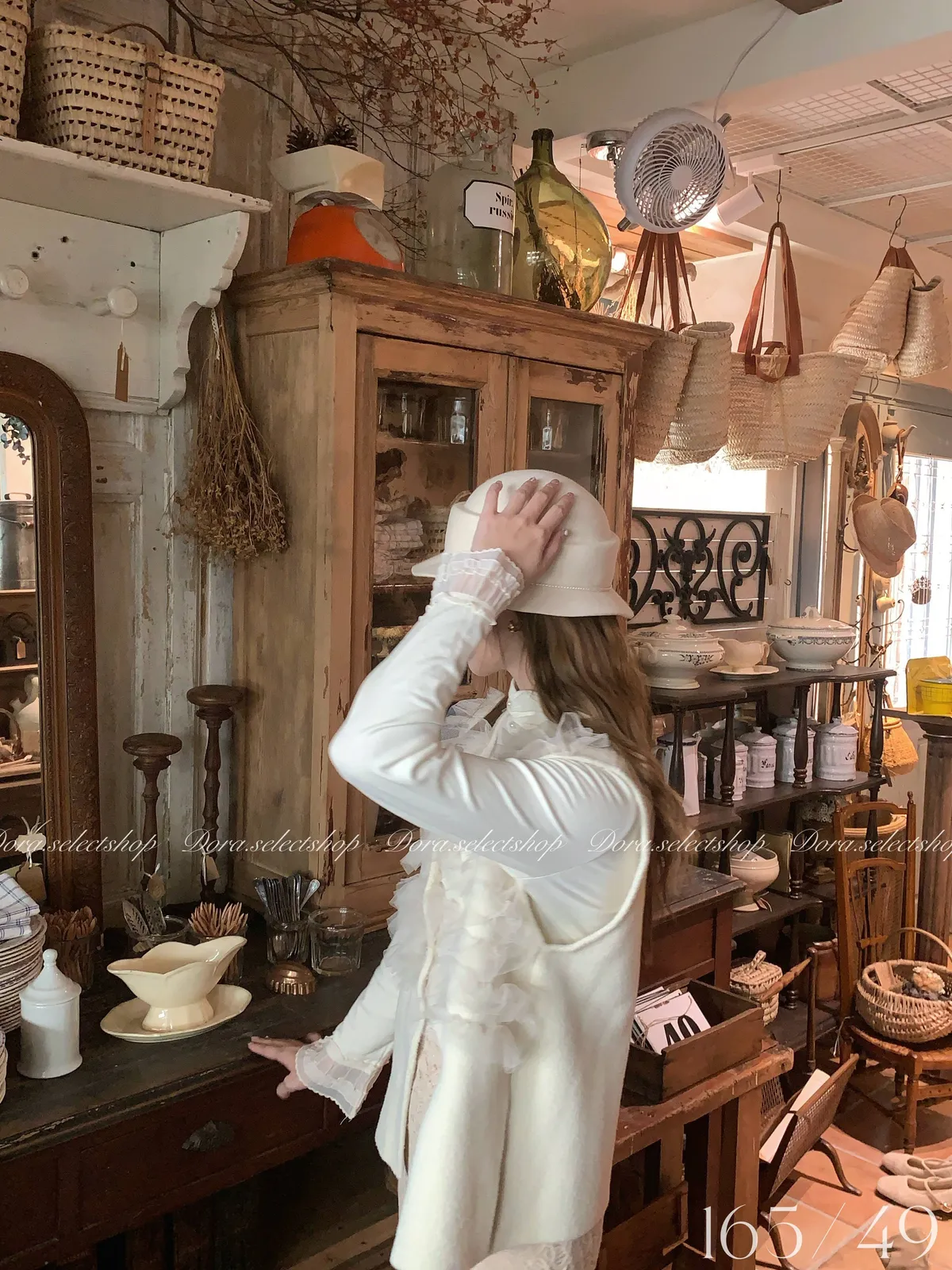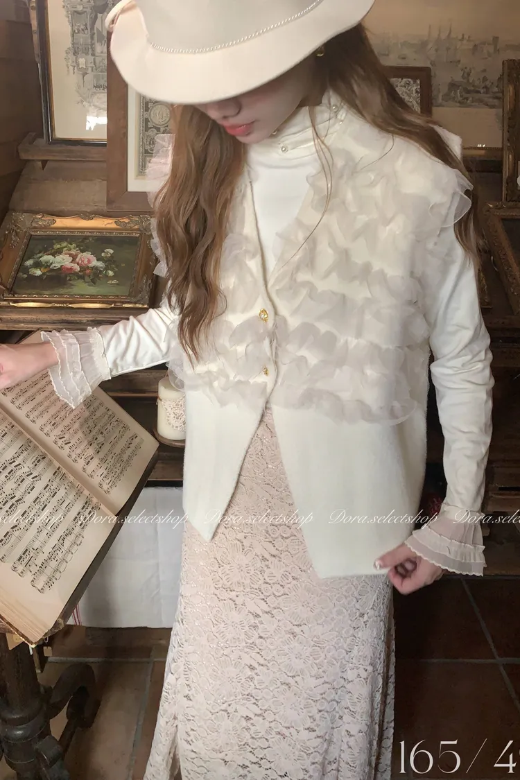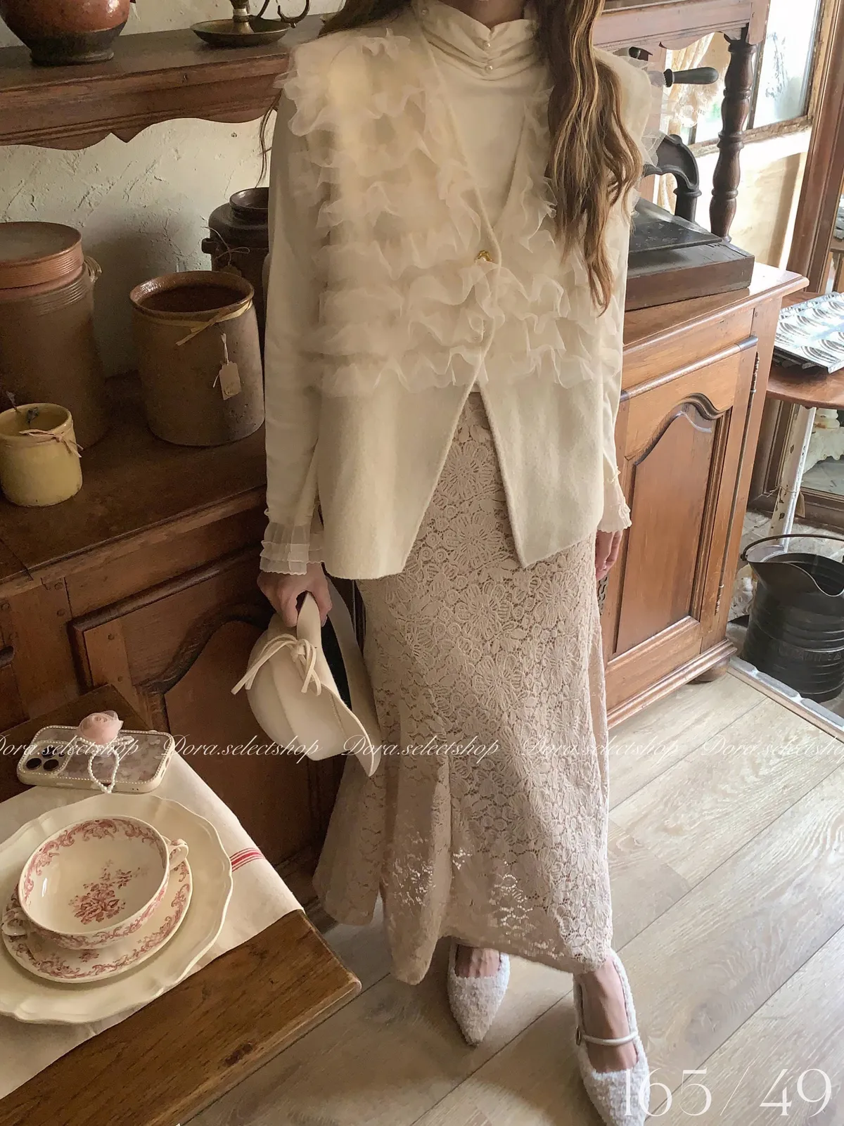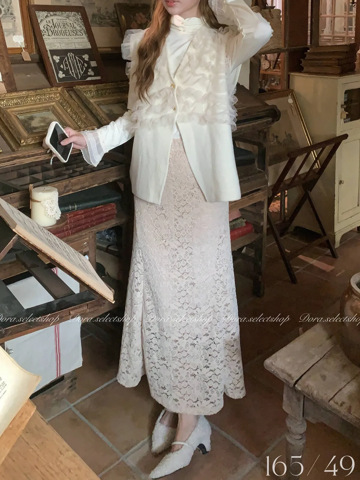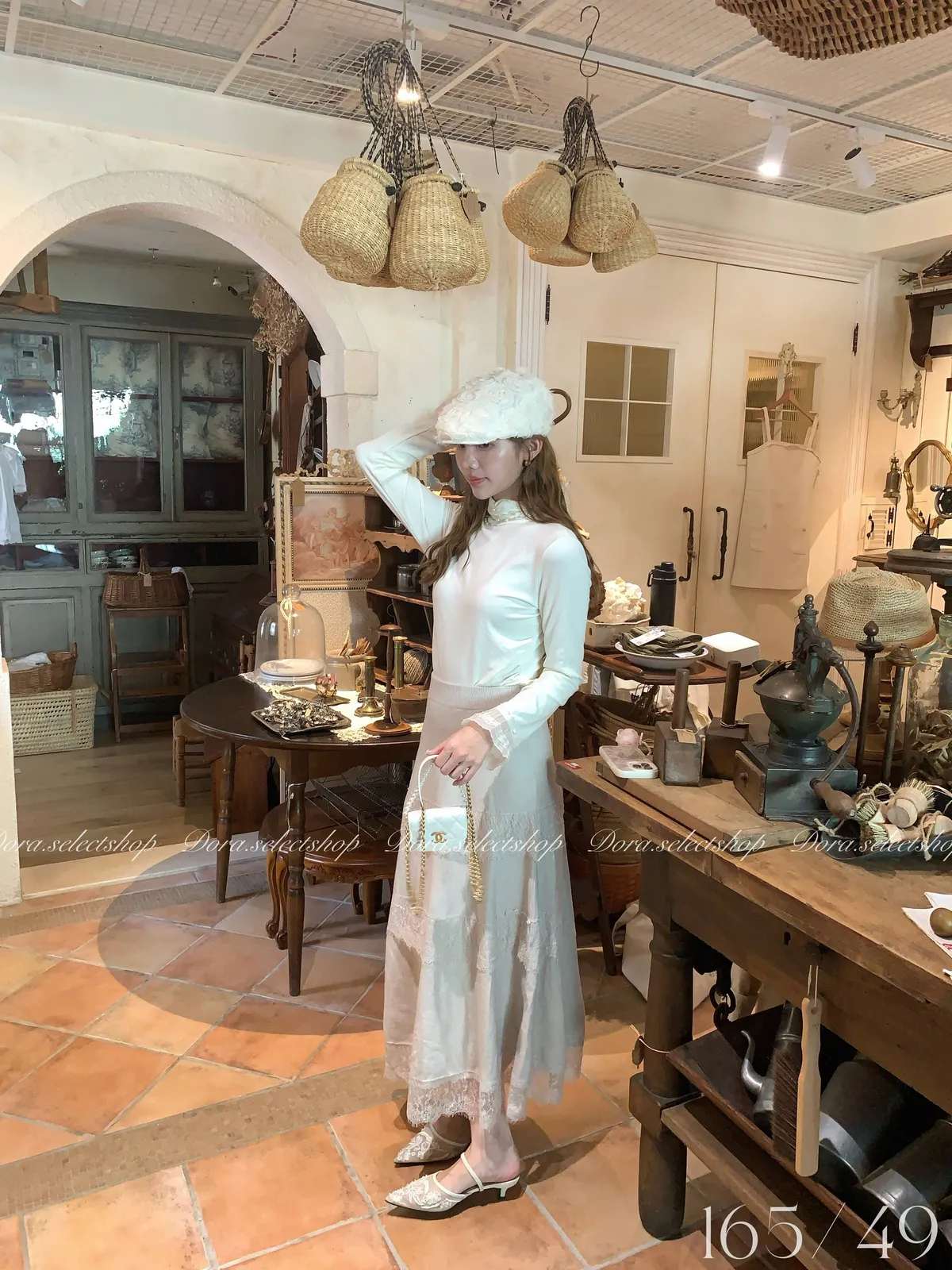 氣質宮廷珍珠領蕾絲拼接長袖上衣---米