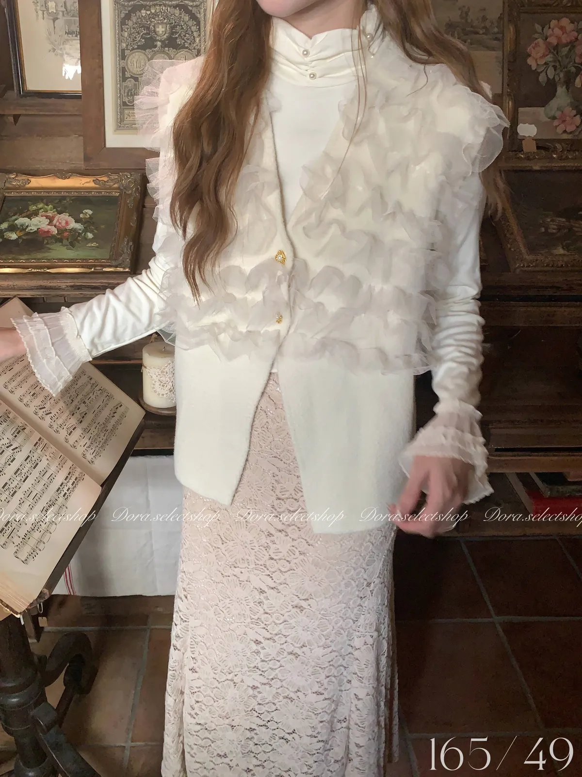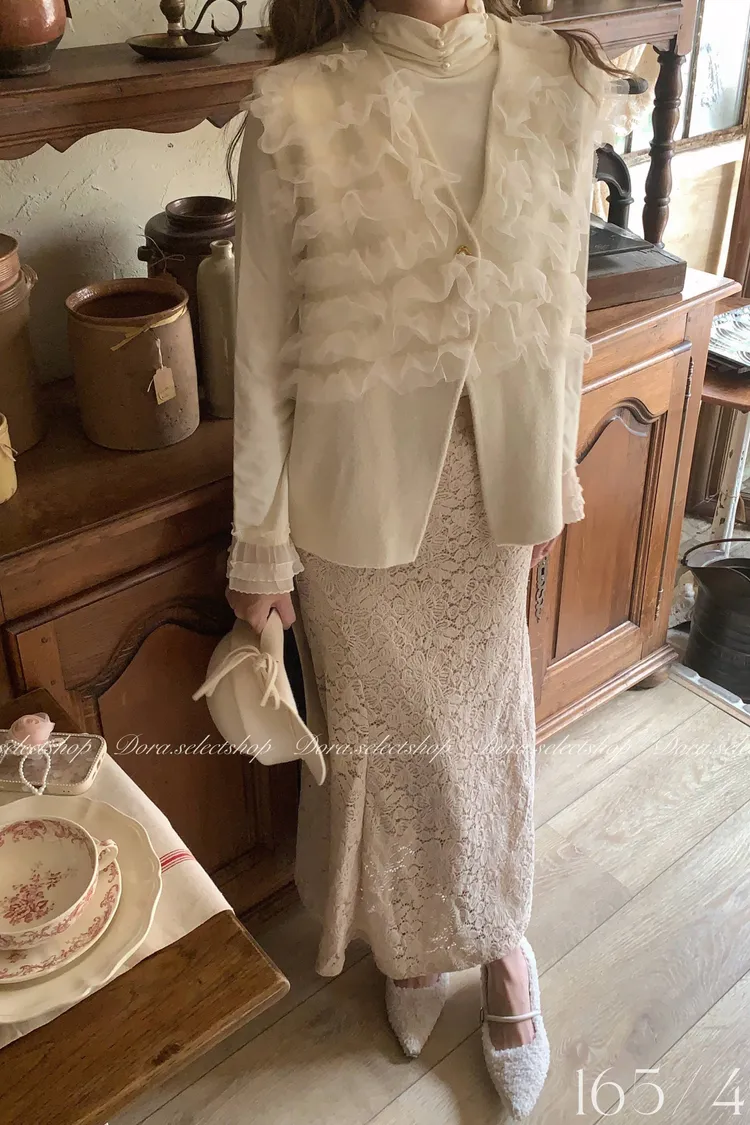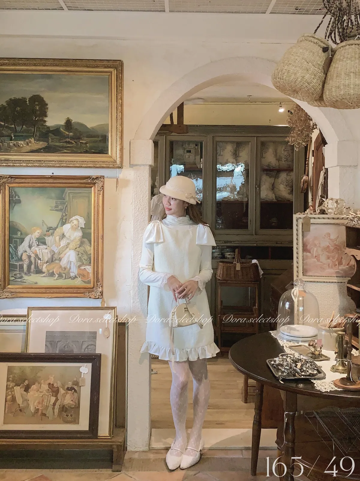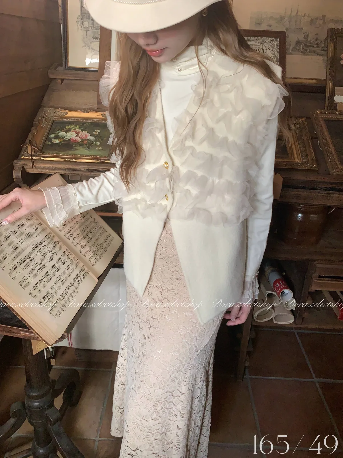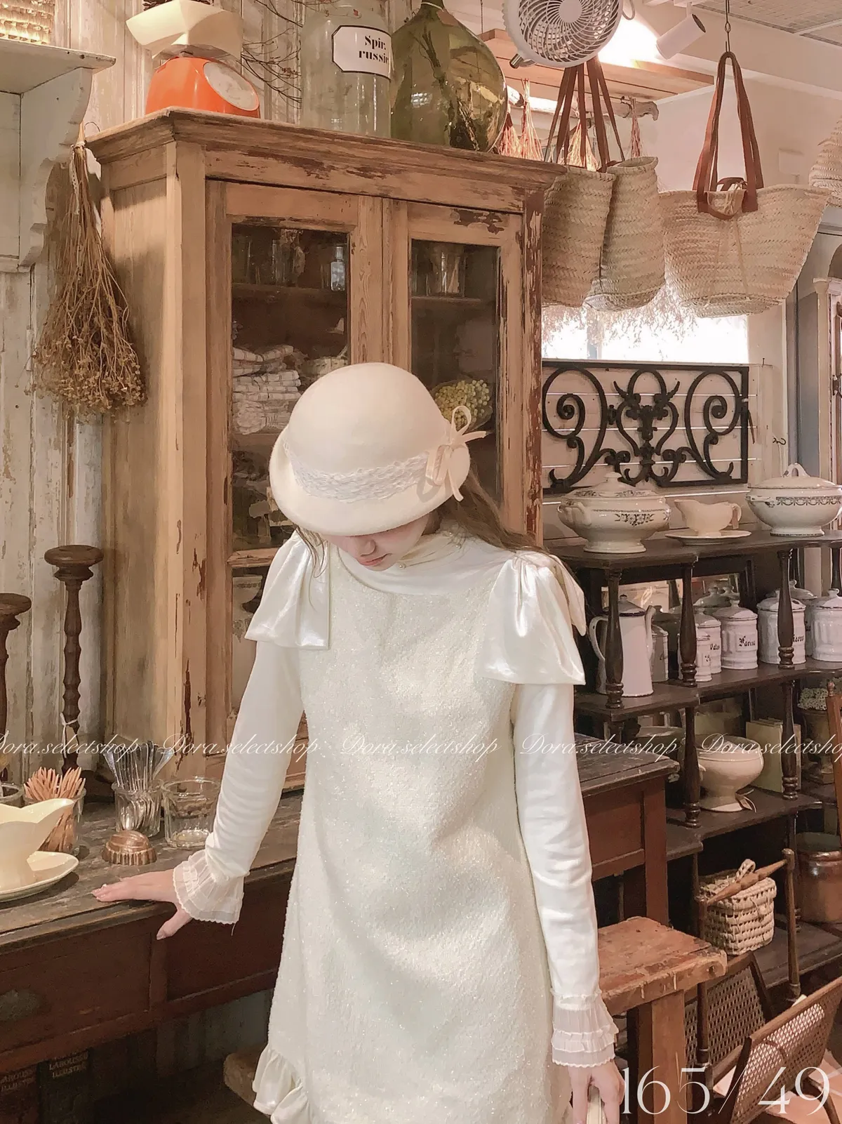 氣質宮廷珍珠領蕾絲拼接長袖上衣---米