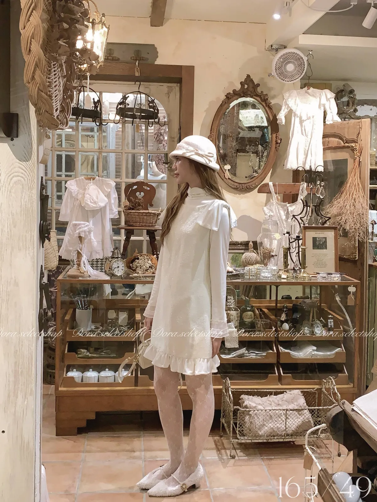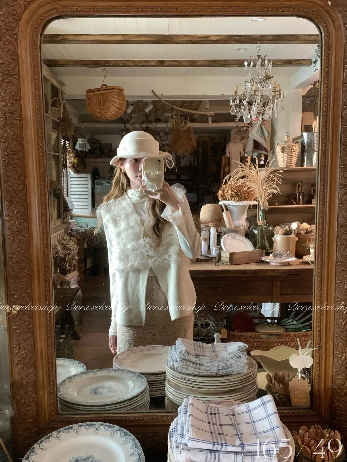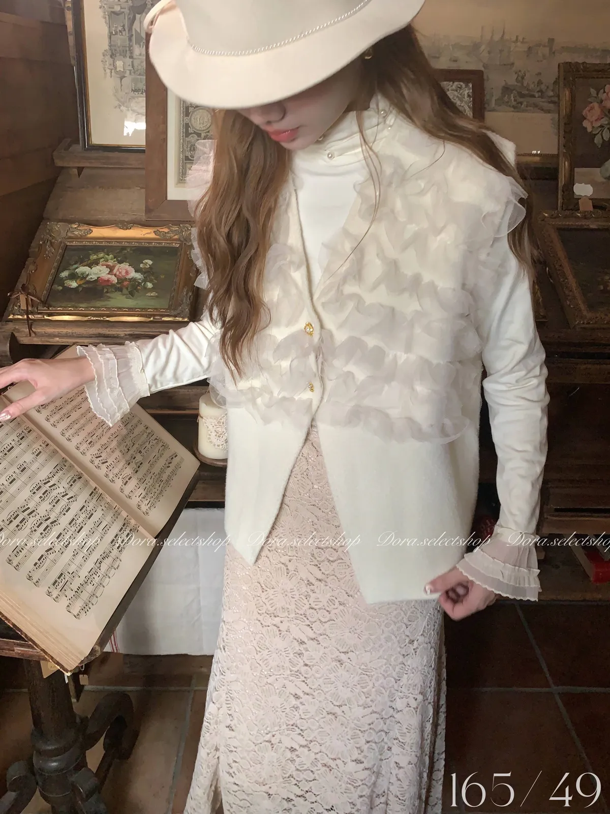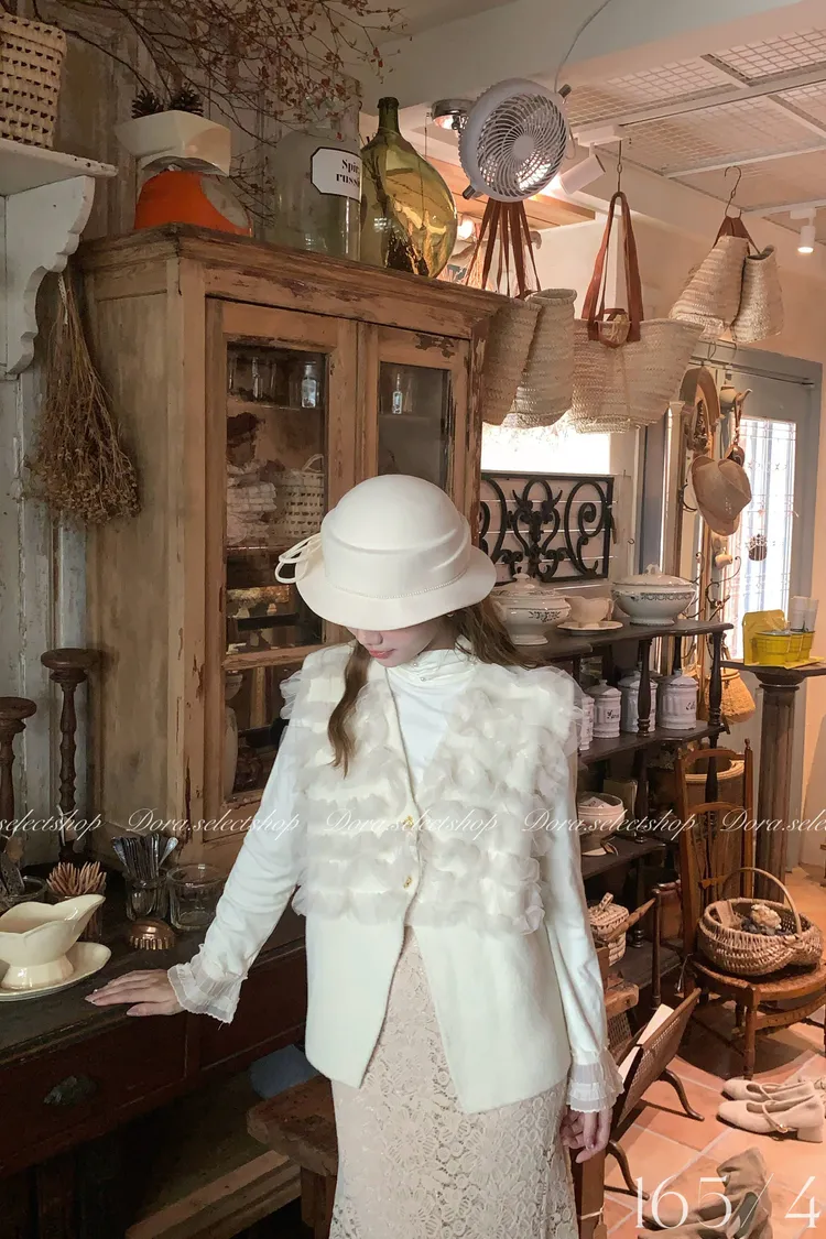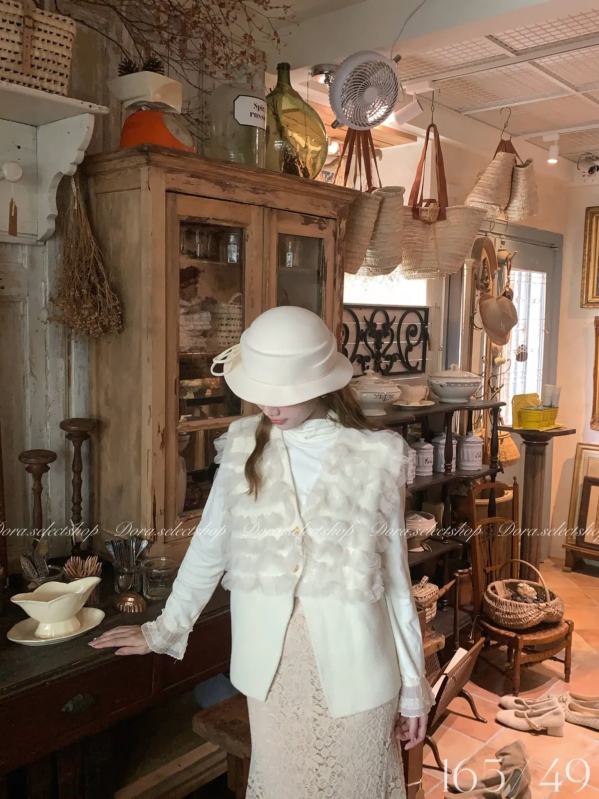 氣質宮廷珍珠領蕾絲拼接長袖上衣---米