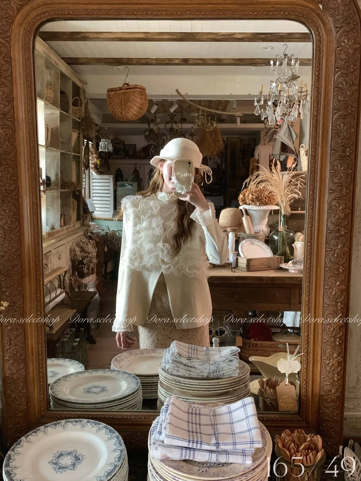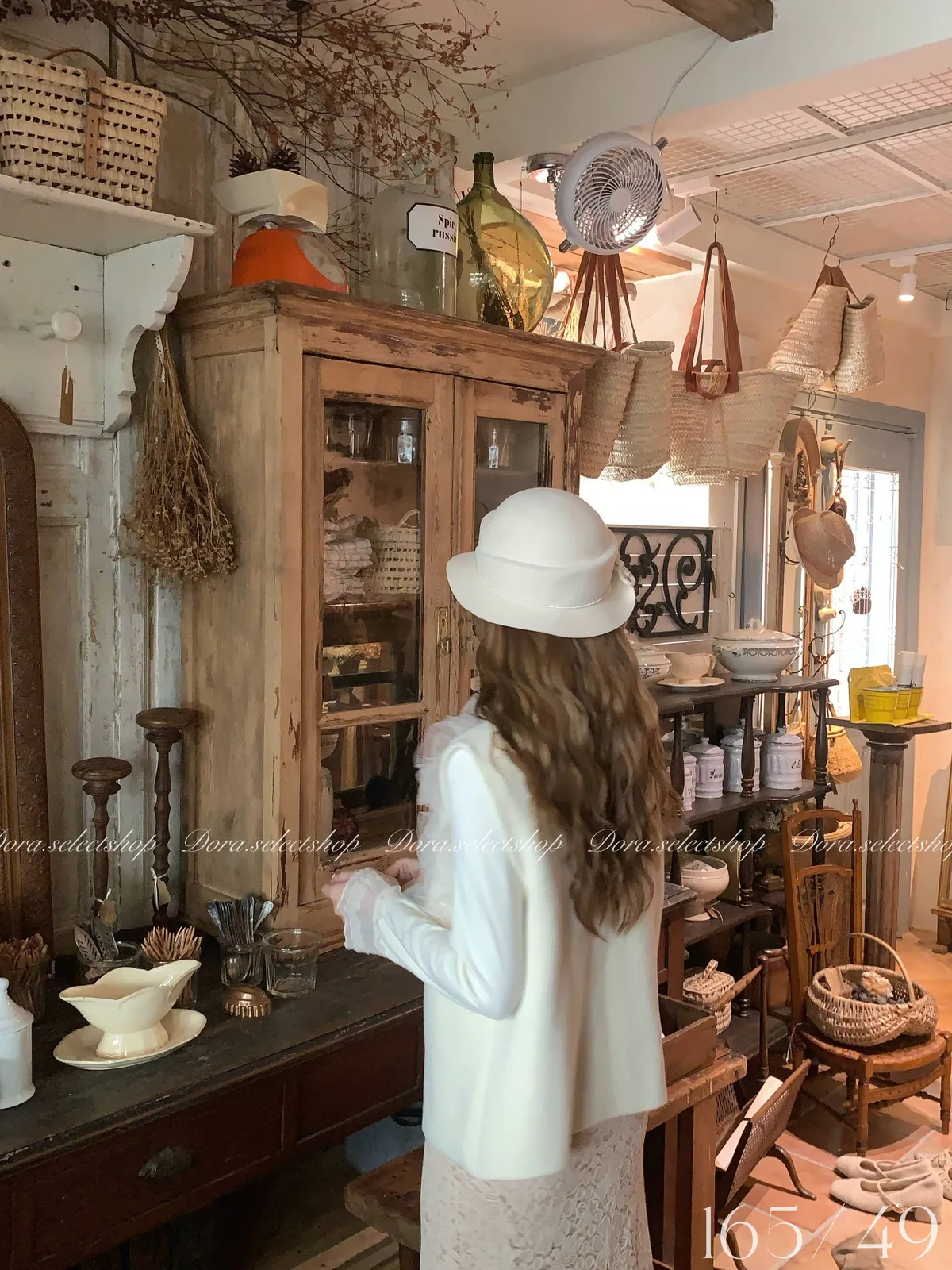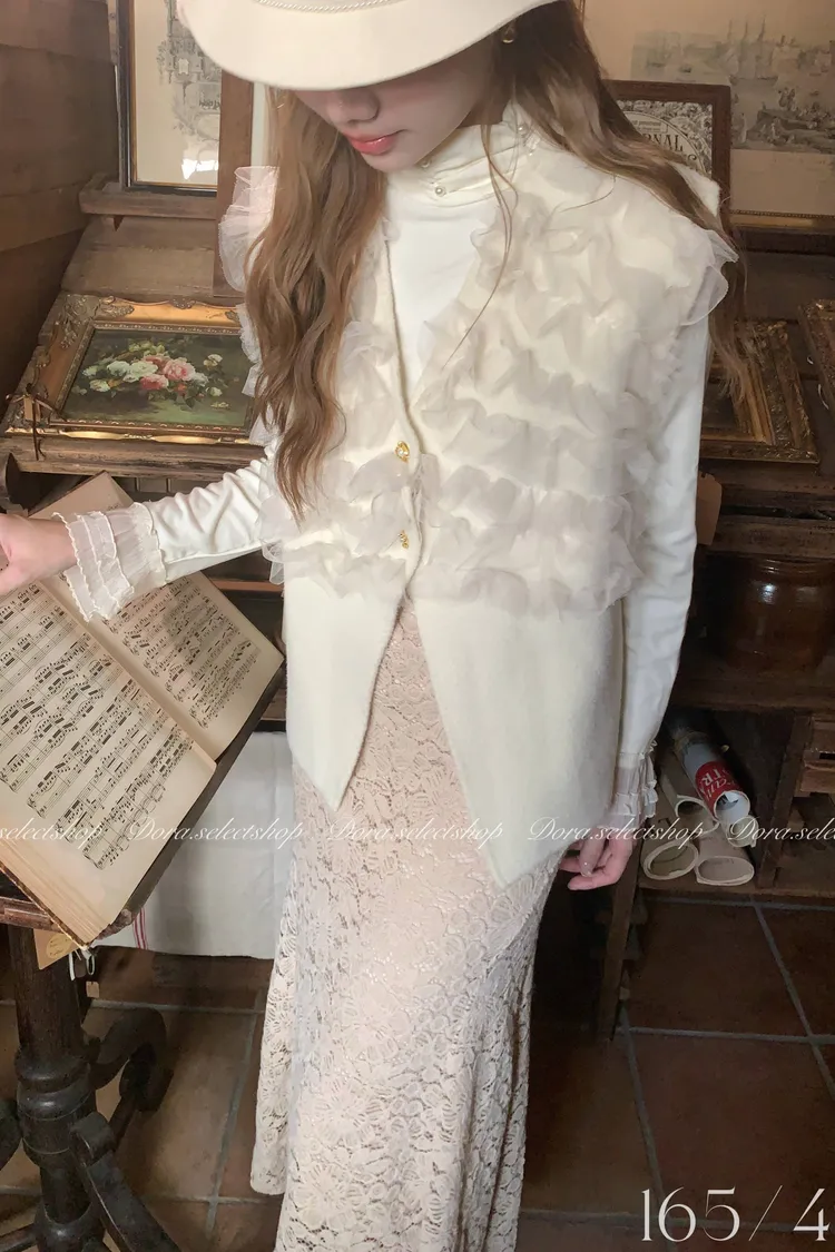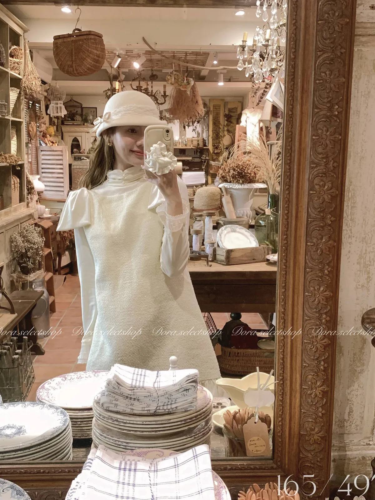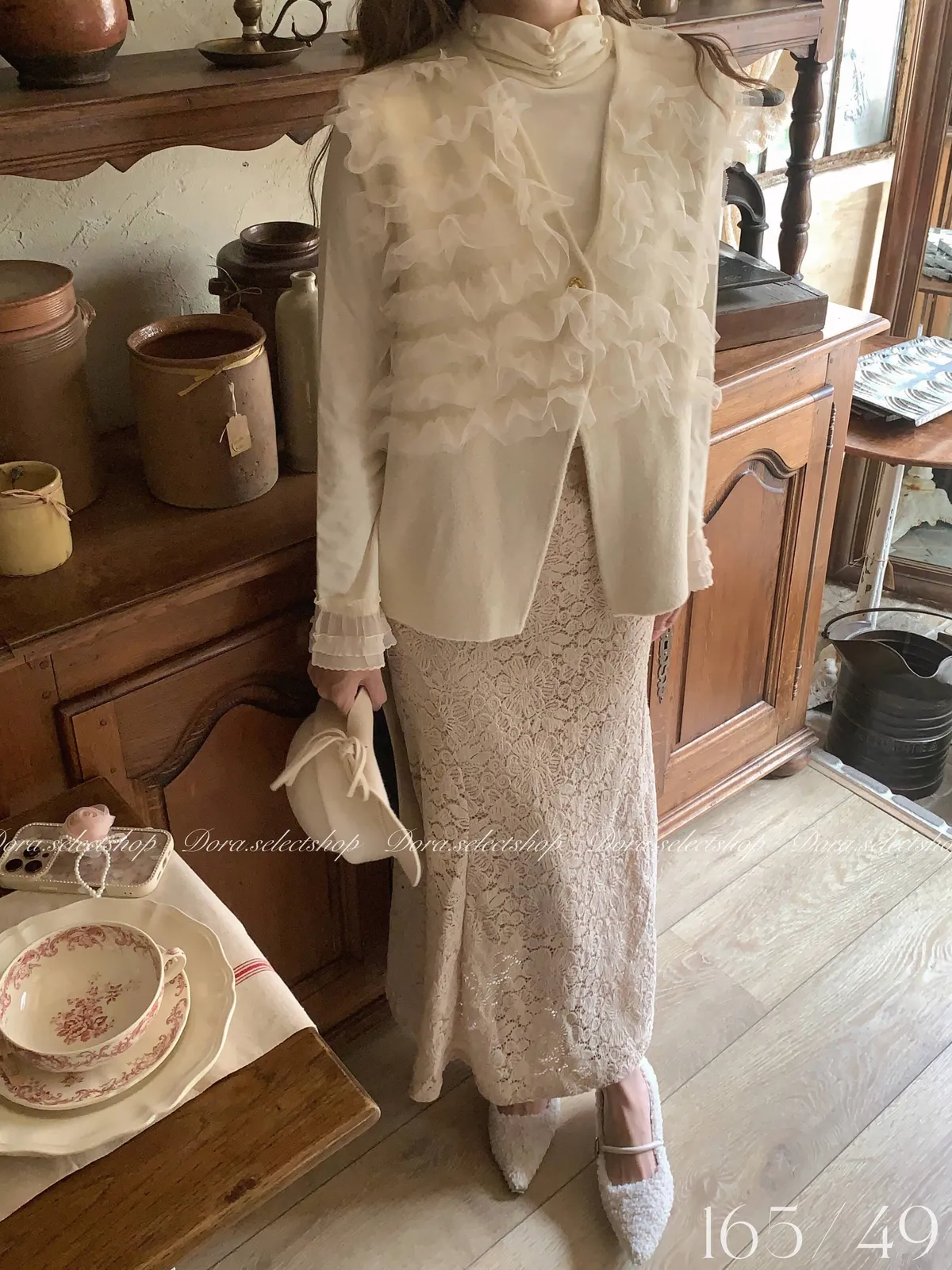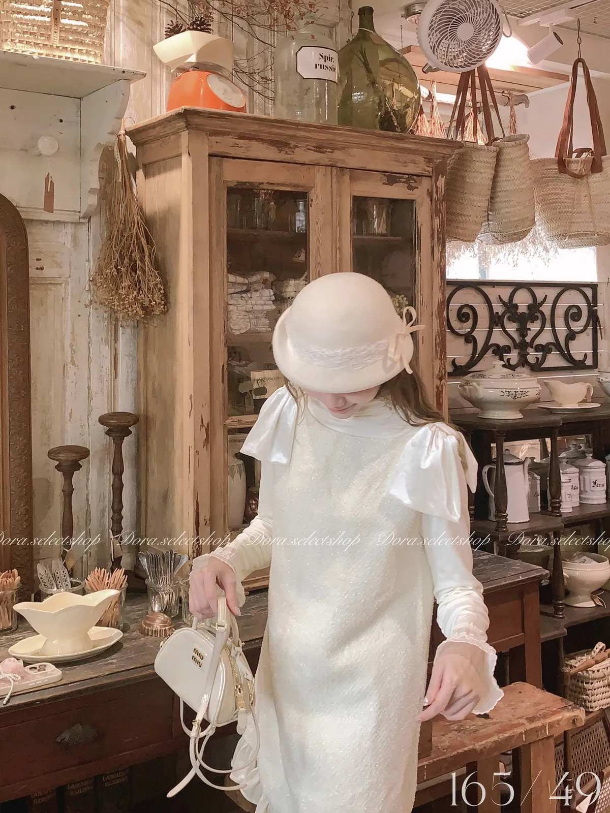 氣質宮廷珍珠領蕾絲拼接長袖上衣---米