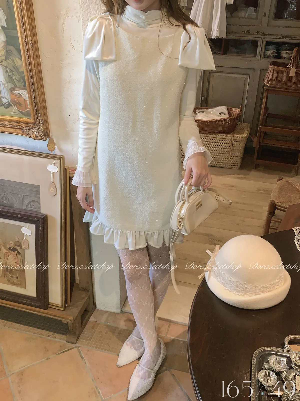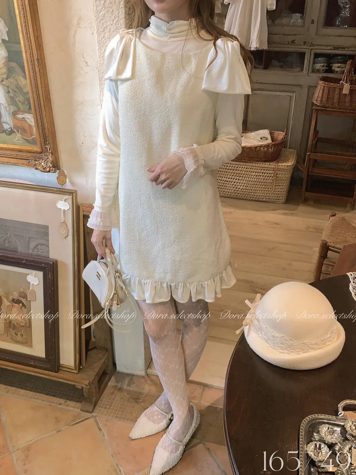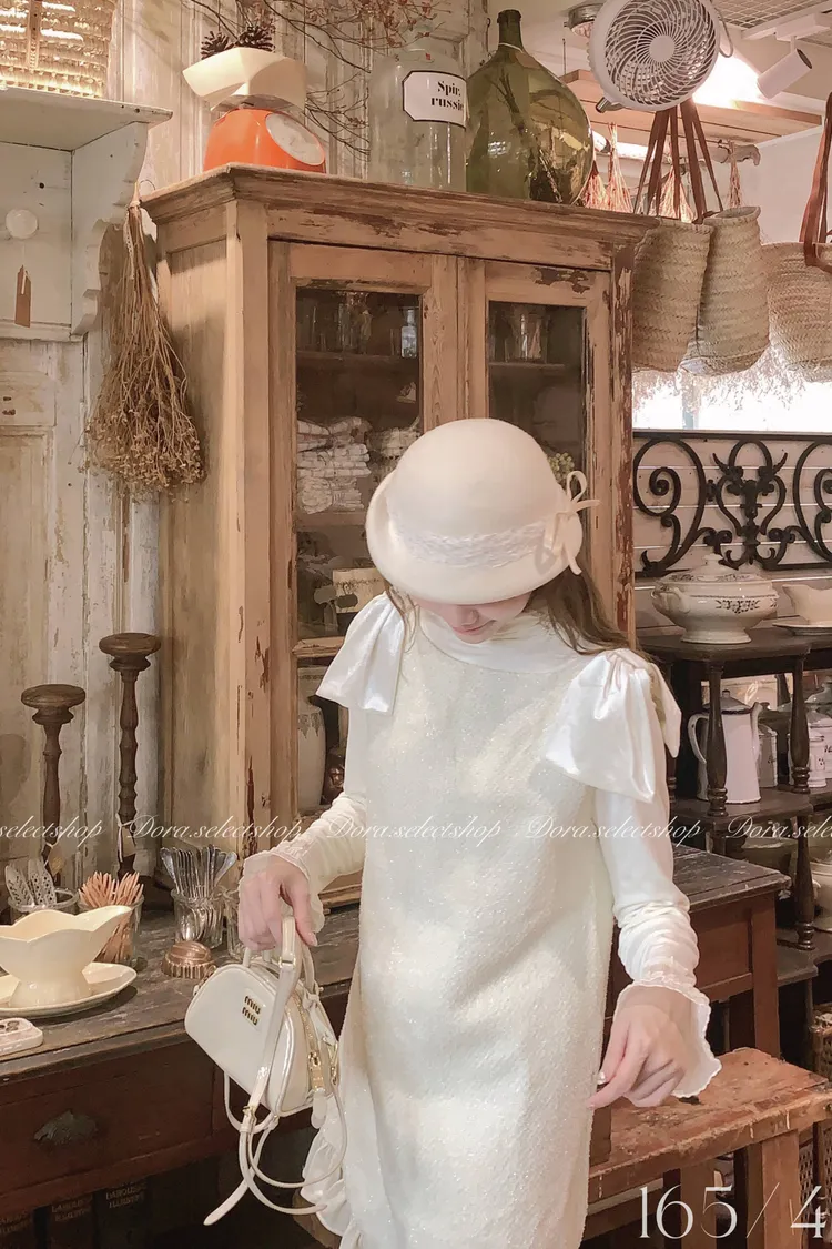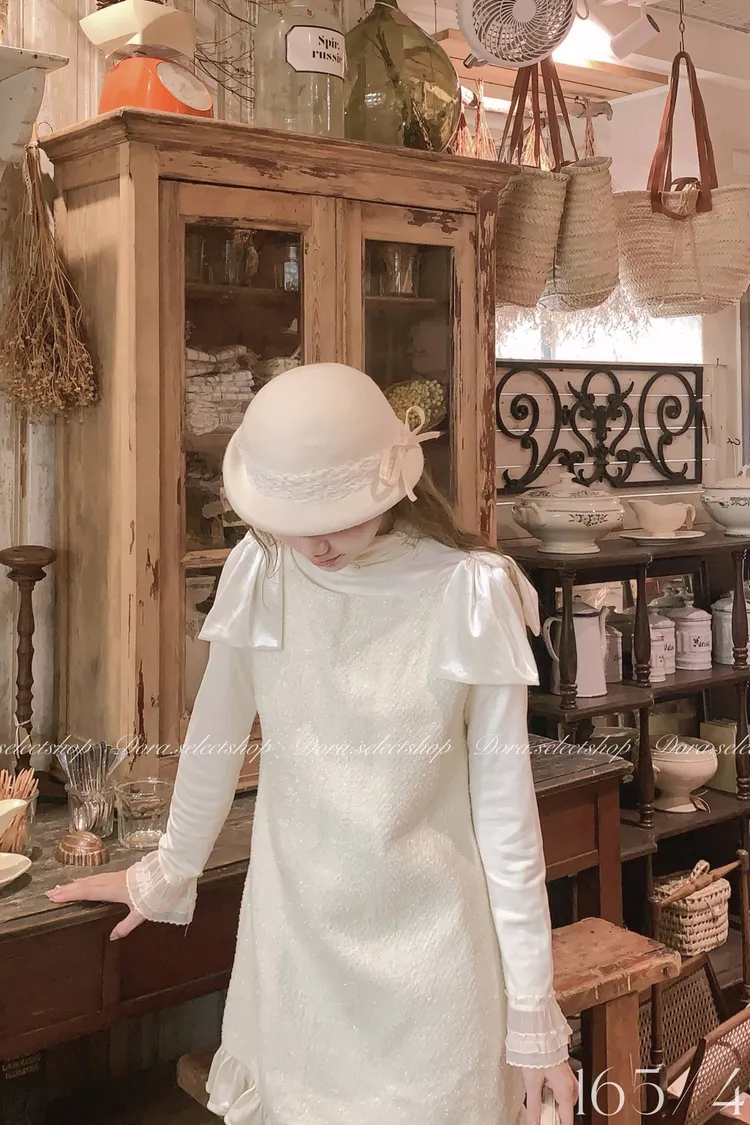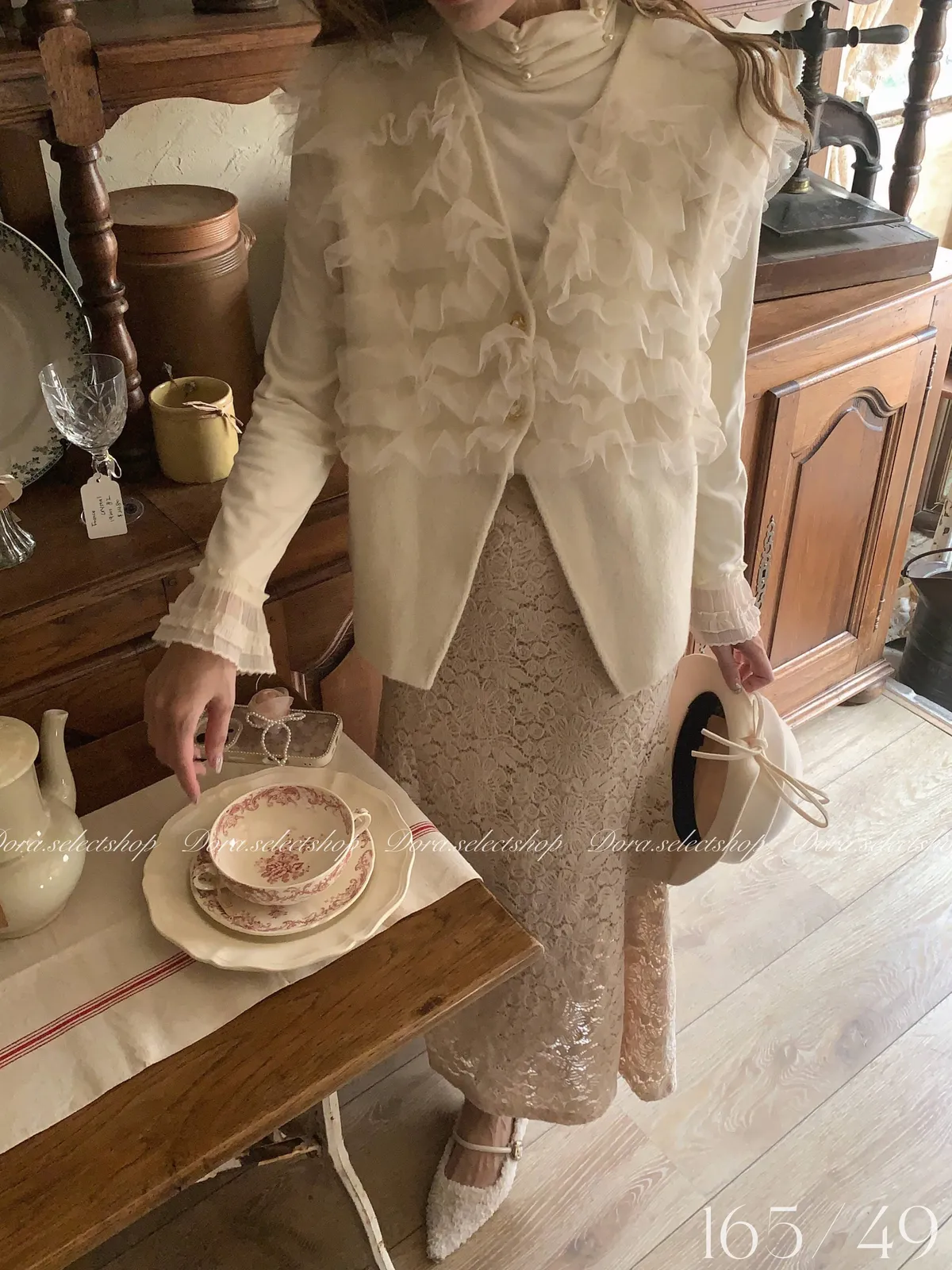 氣質宮廷珍珠領蕾絲拼接長袖上衣---米
