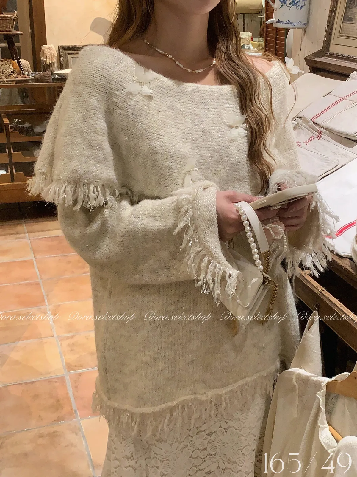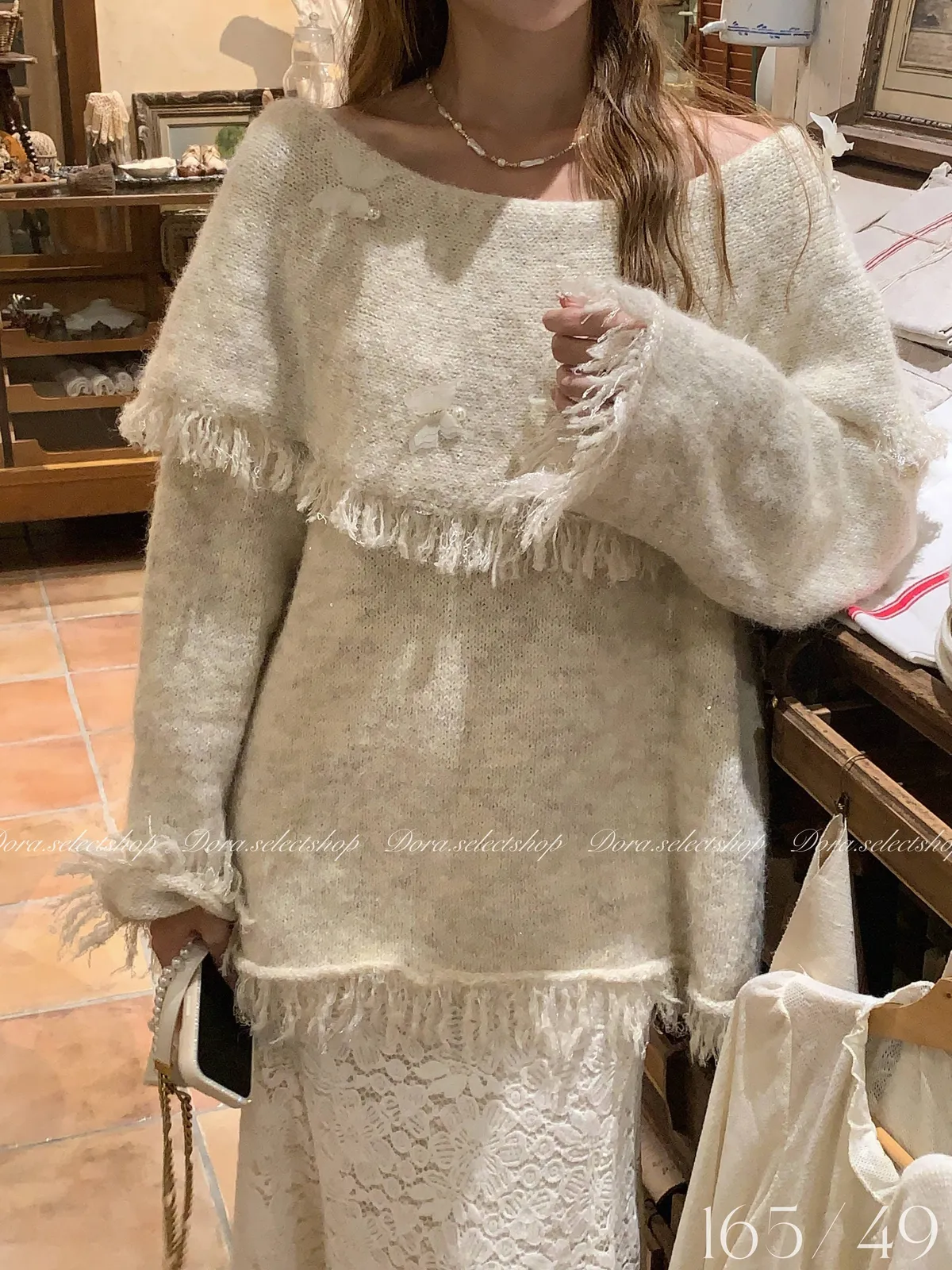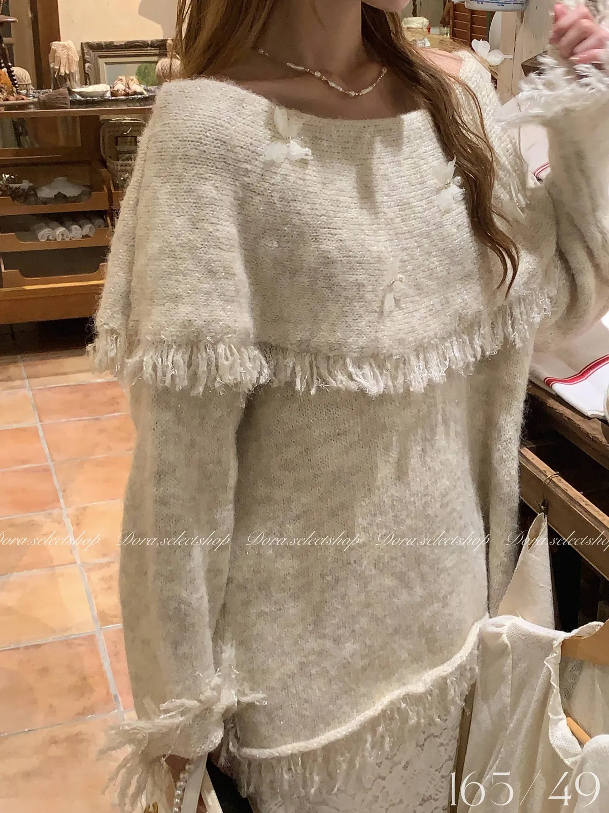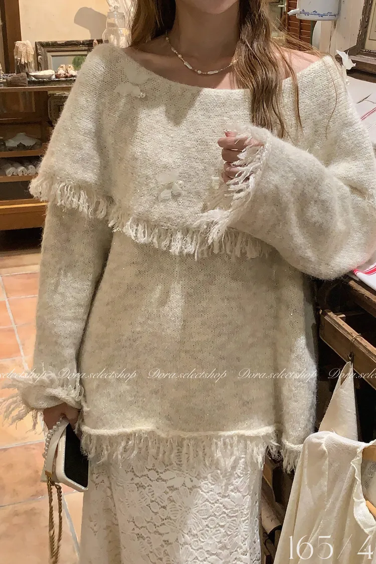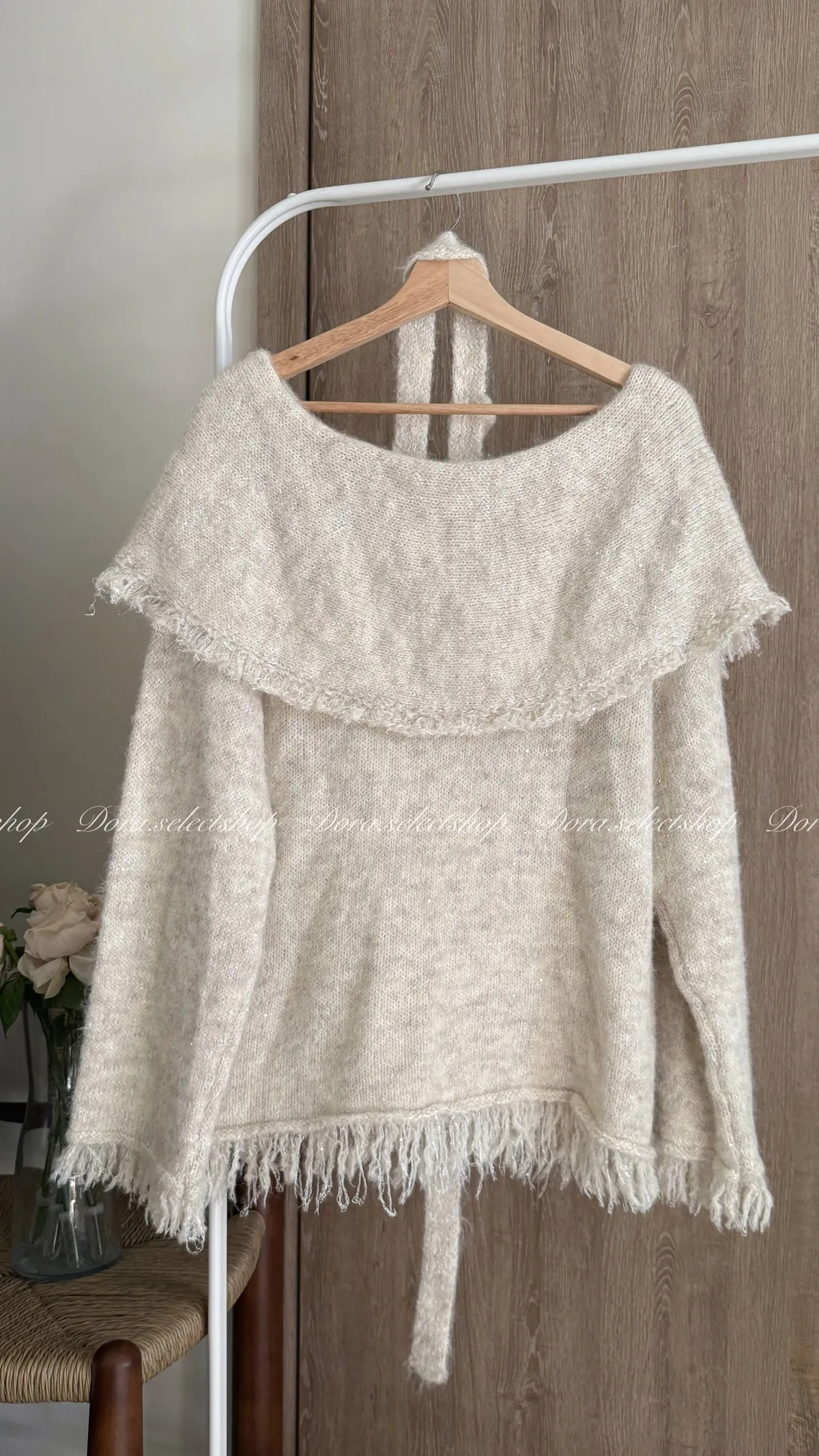 設計感大船領鬚邊寬鬆毛衣(附綁帶)---燕麥