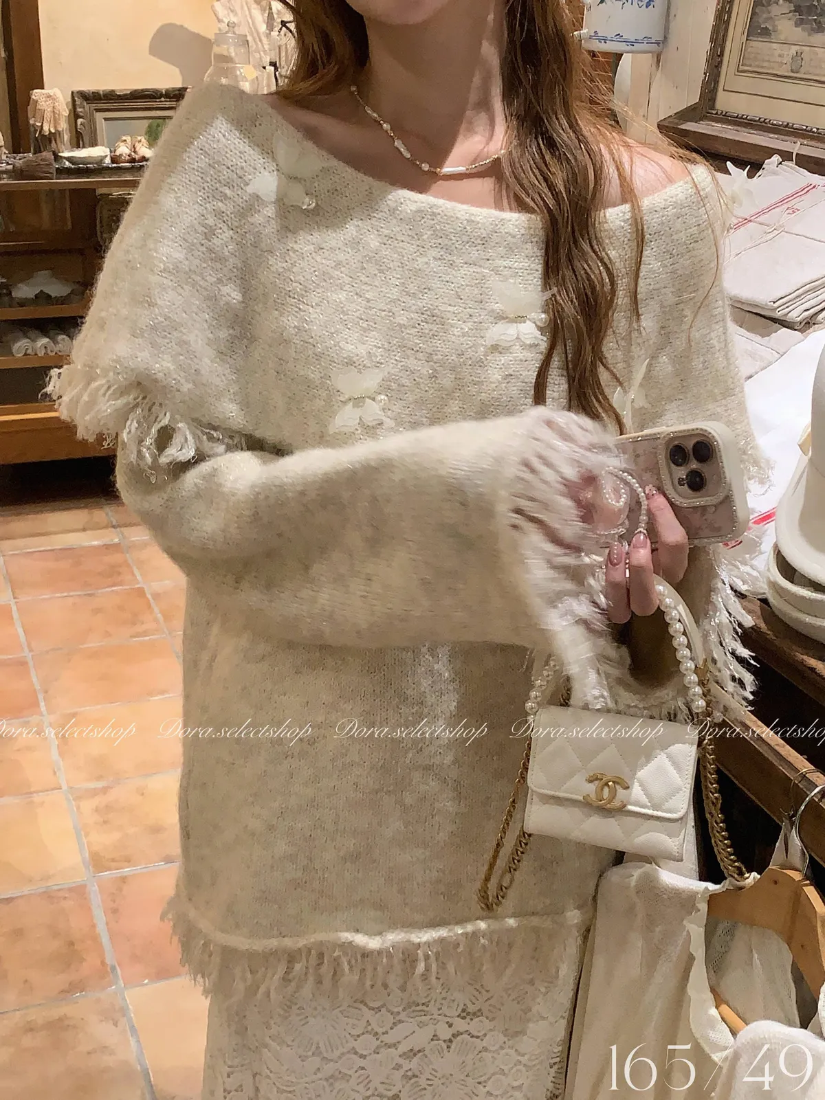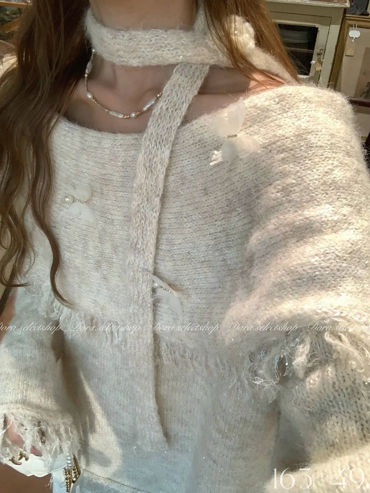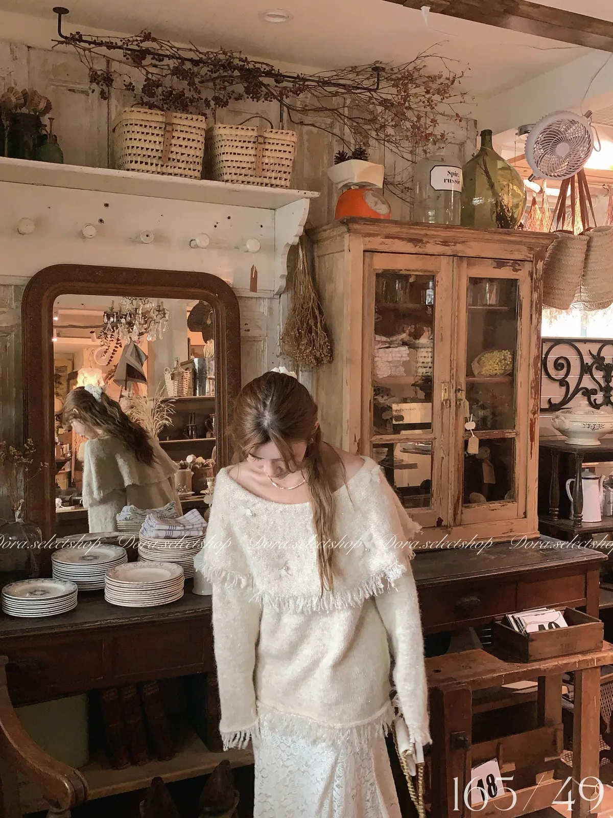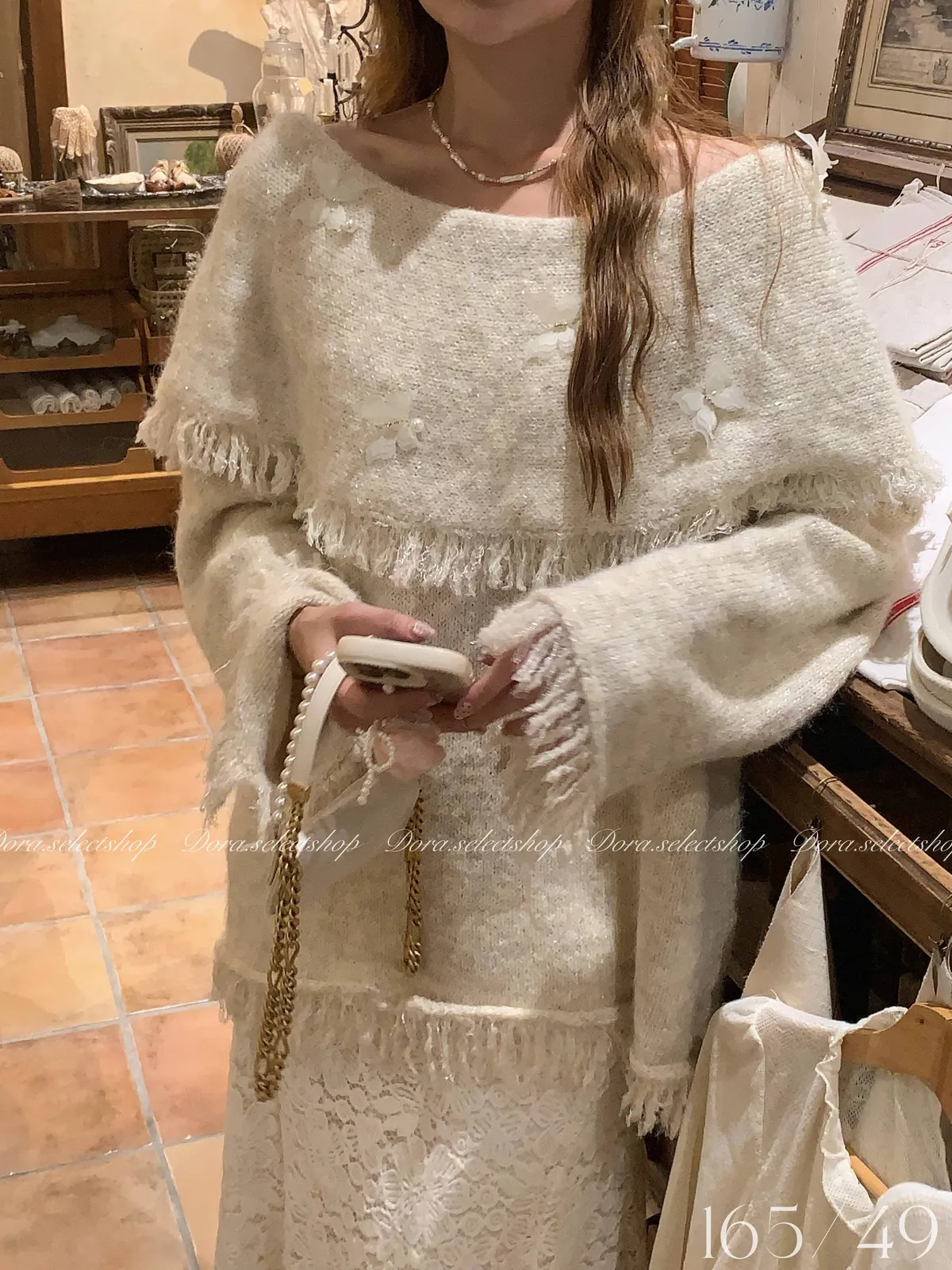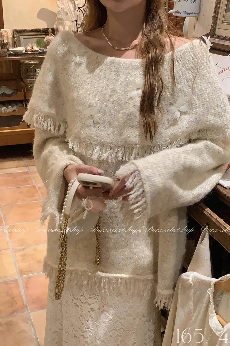 設計感大船領鬚邊寬鬆毛衣(附綁帶)---燕麥