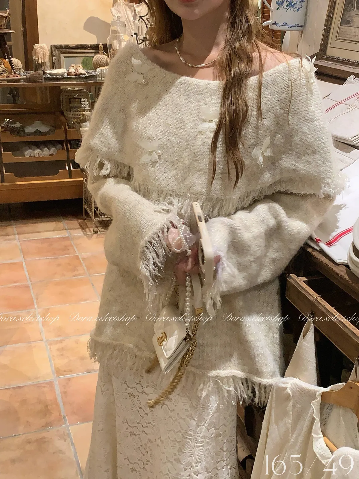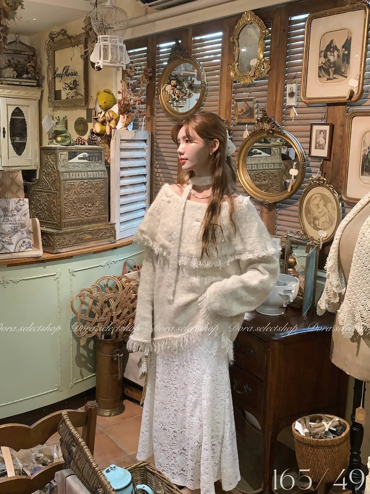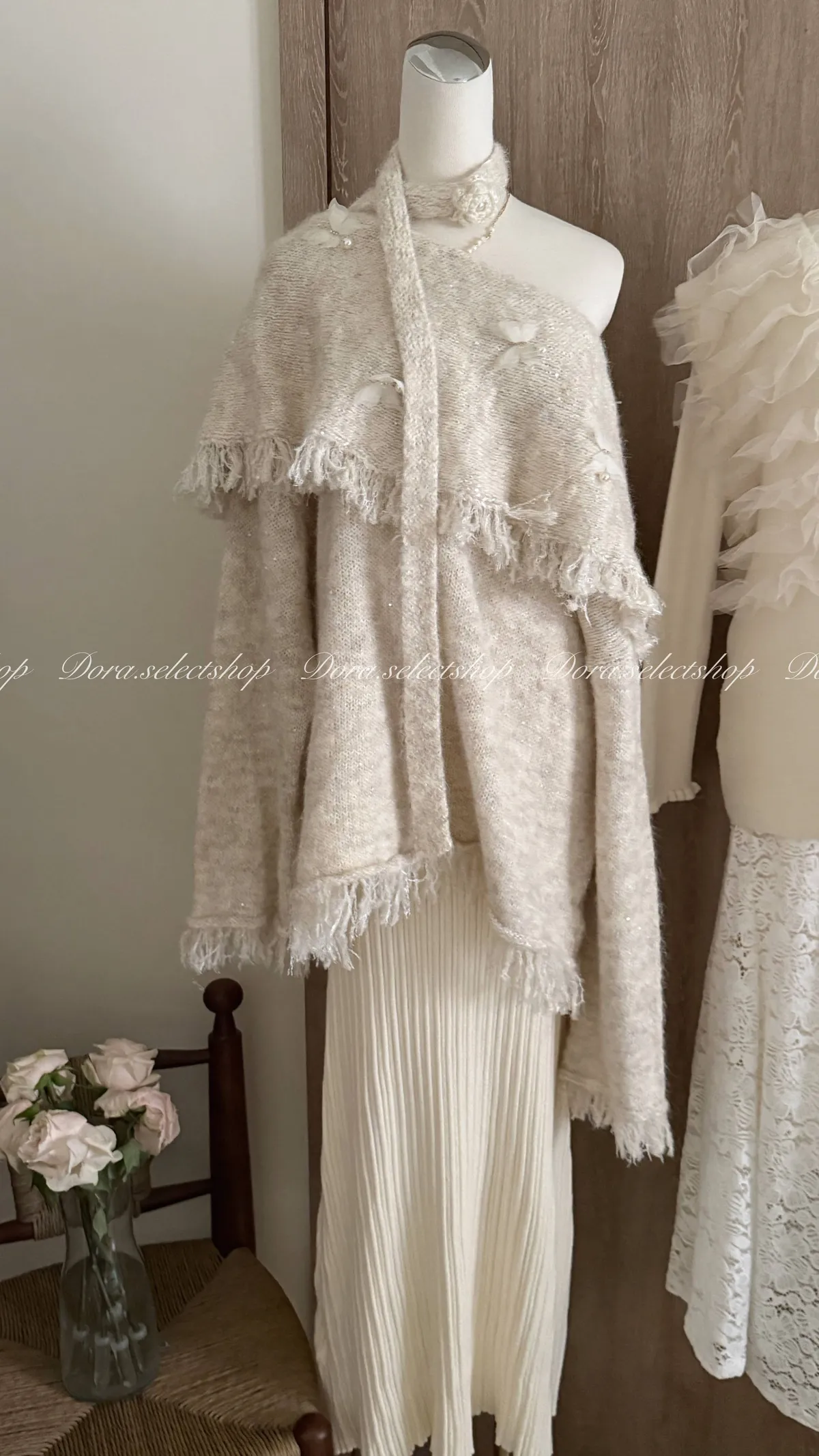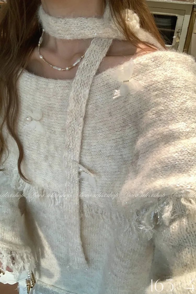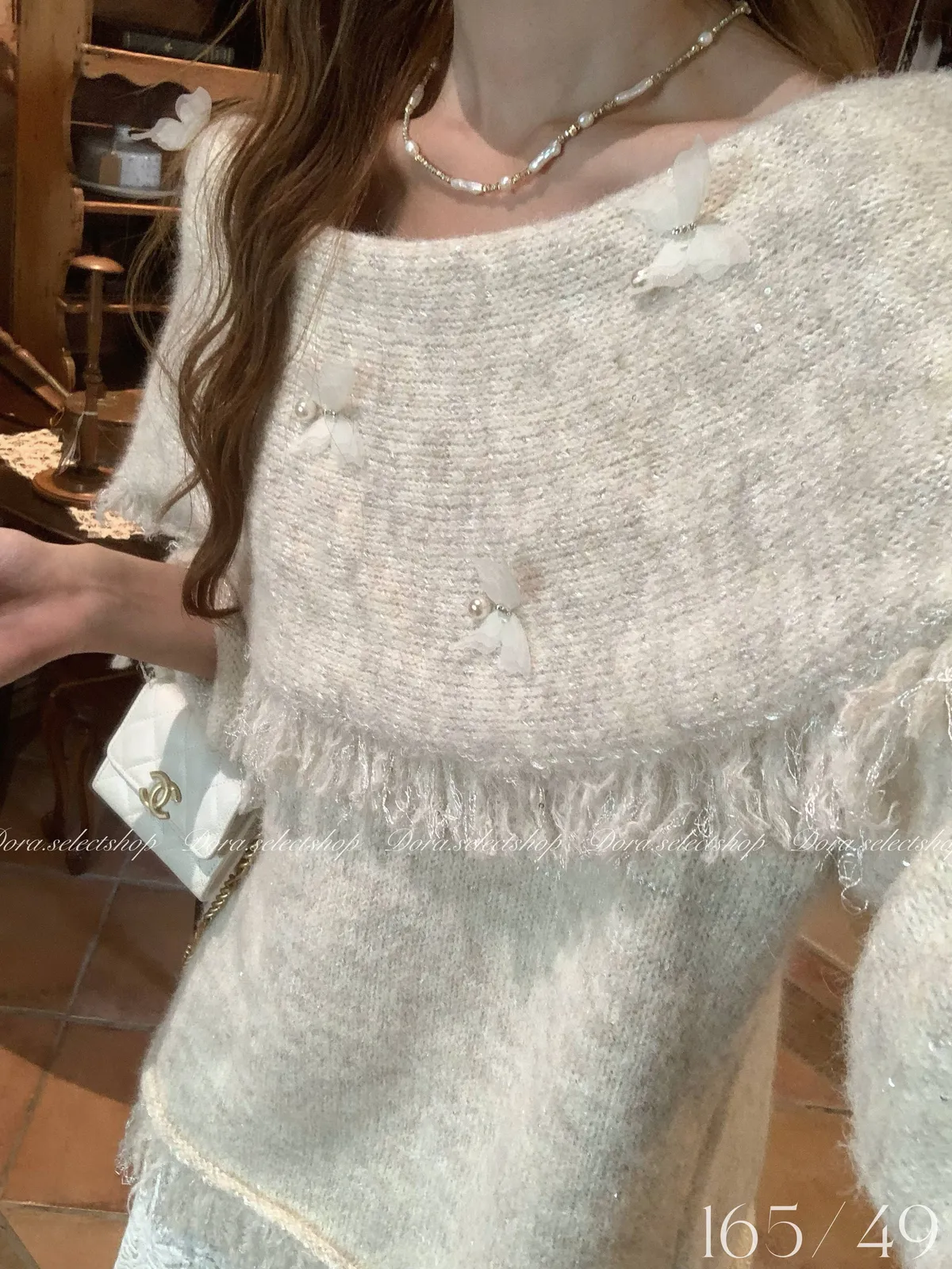 設計感大船領鬚邊寬鬆毛衣(附綁帶)---燕麥