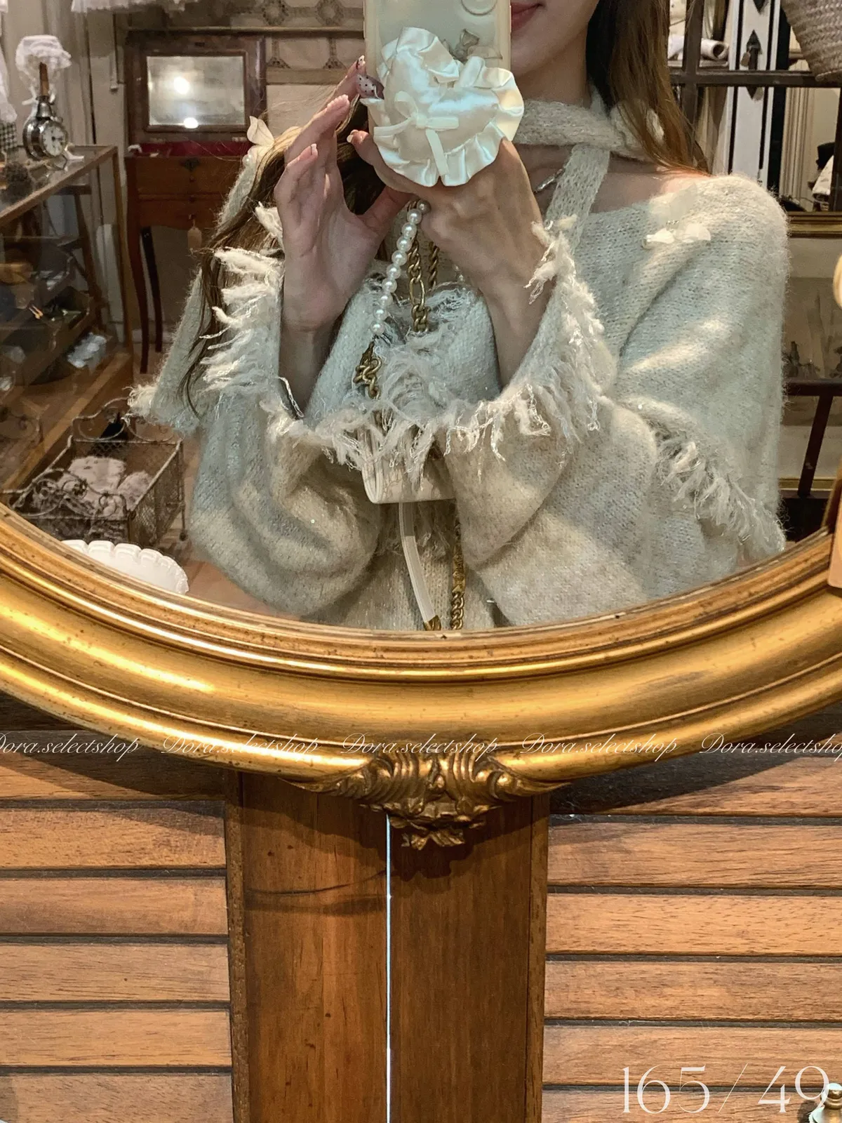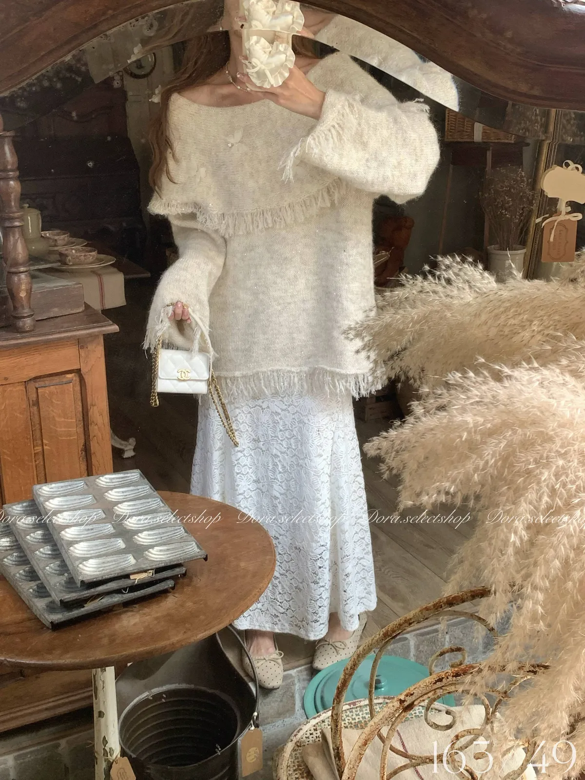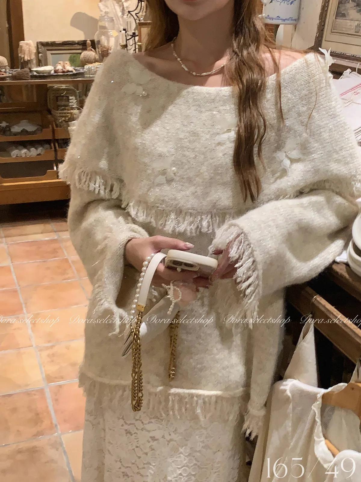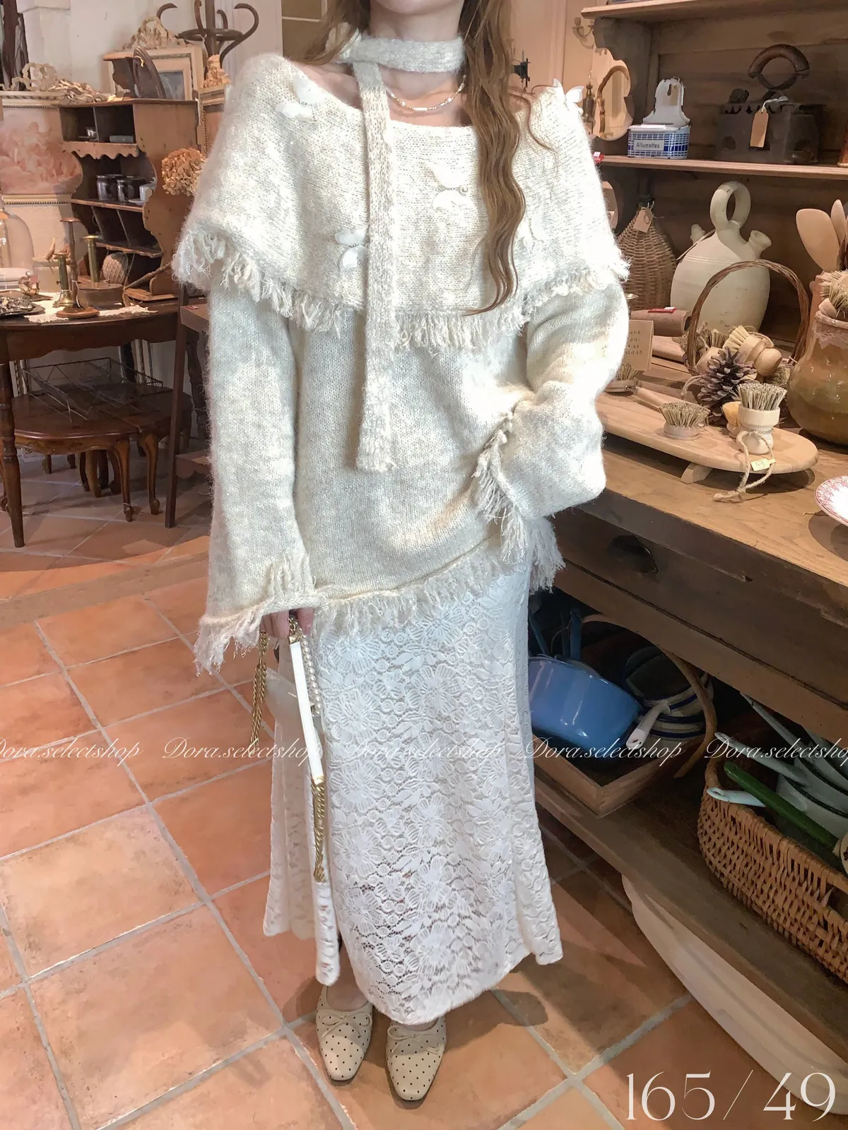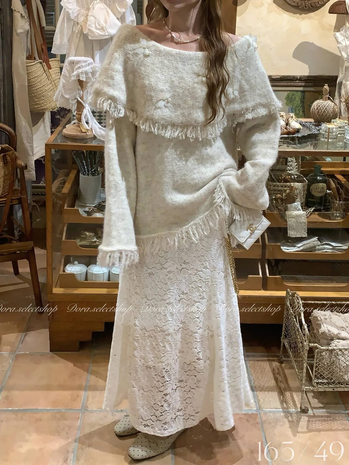 設計感大船領鬚邊寬鬆毛衣(附綁帶)---燕麥
