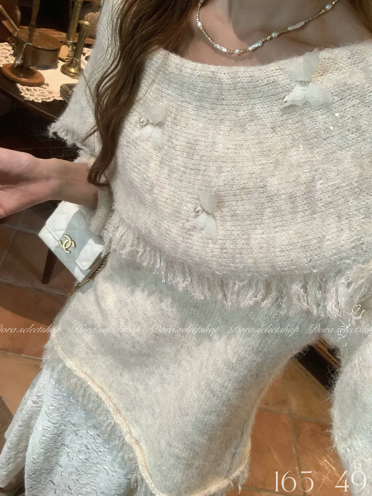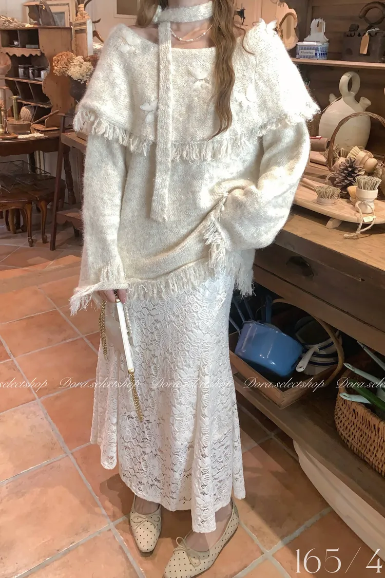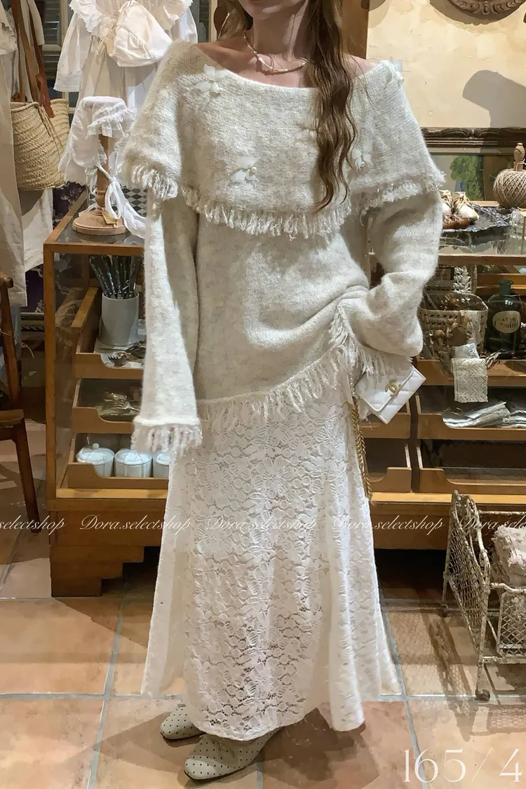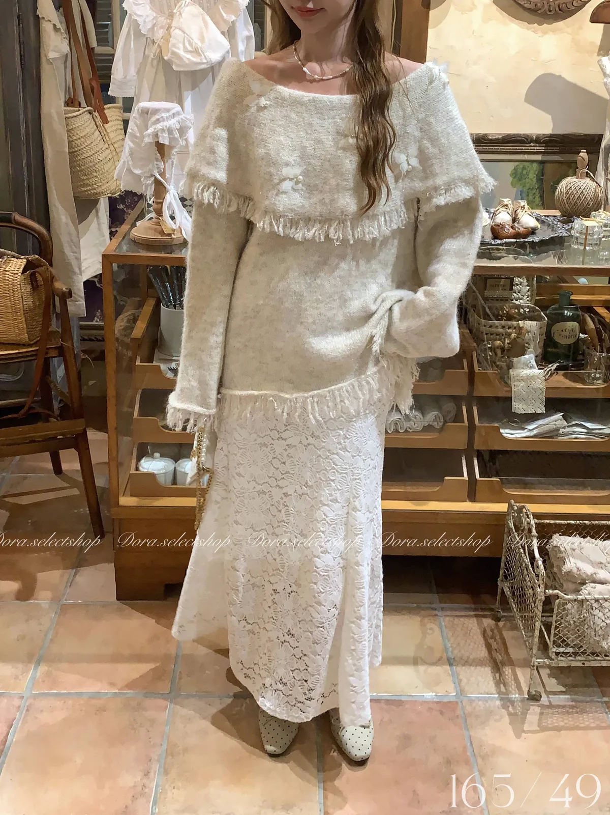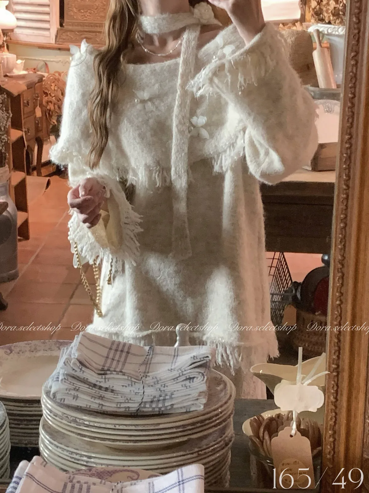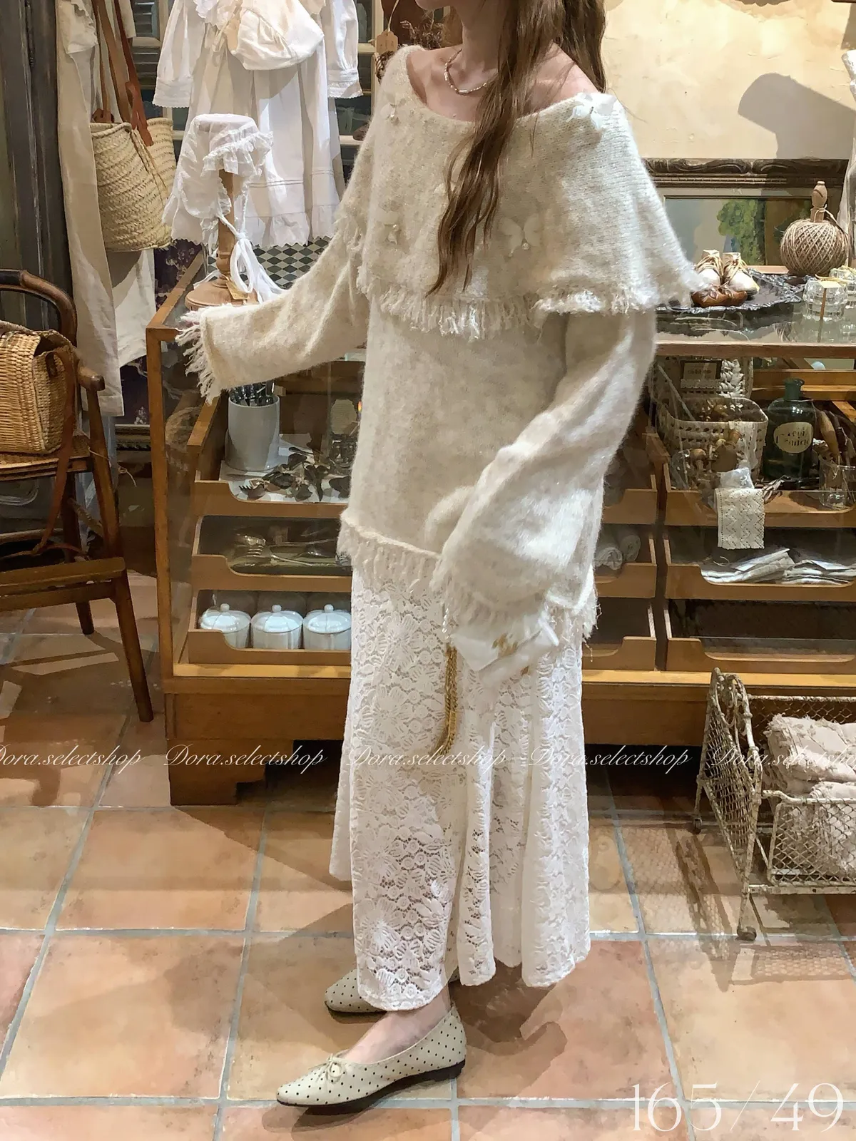 設計感大船領鬚邊寬鬆毛衣(附綁帶)---燕麥