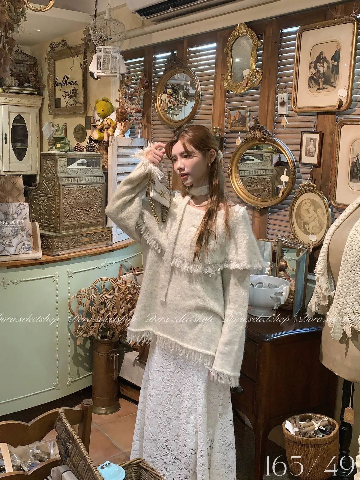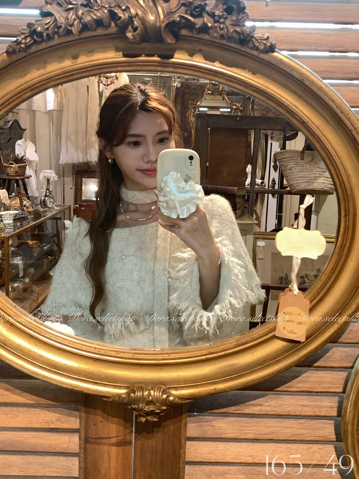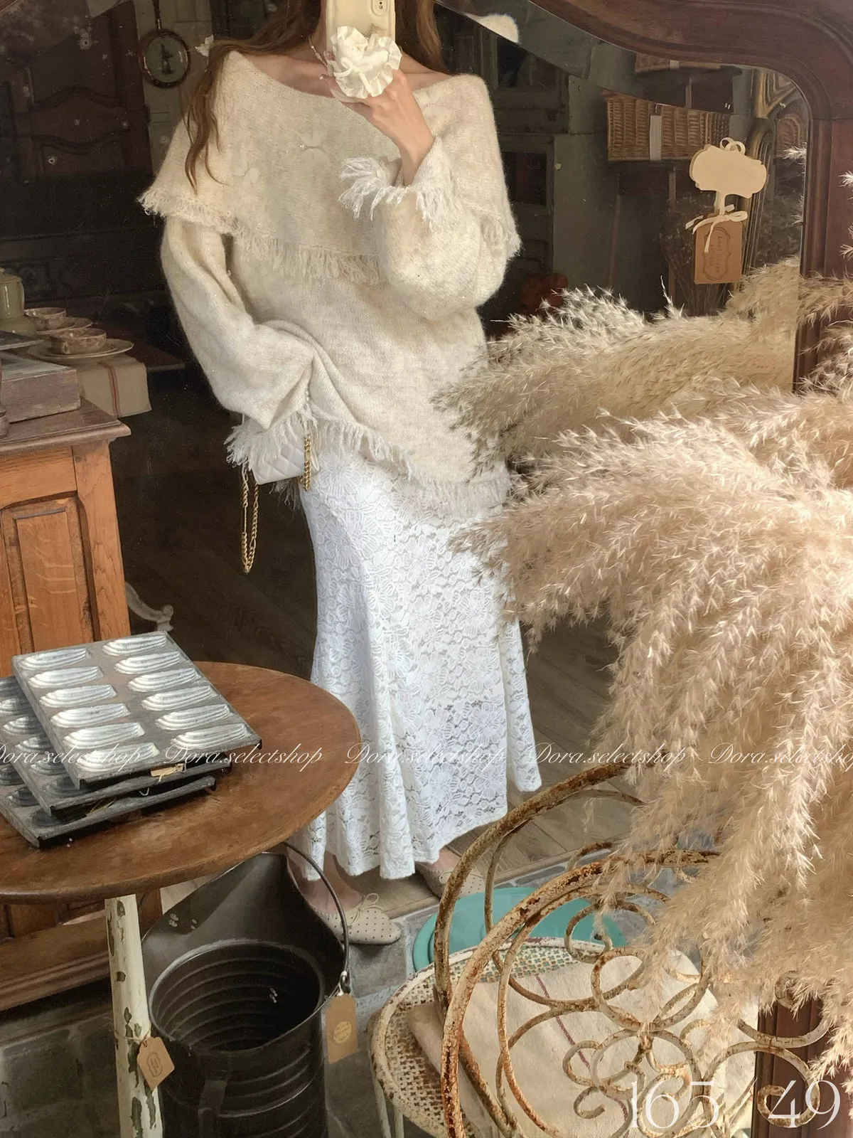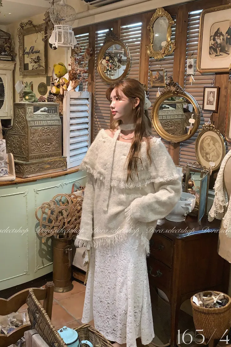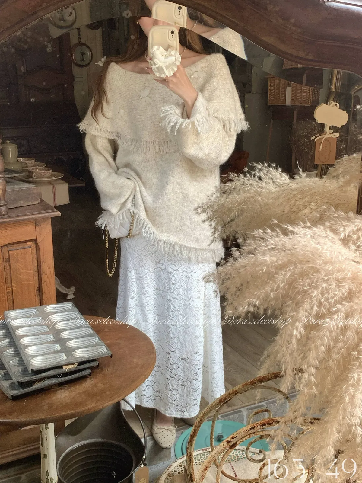 設計感大船領鬚邊寬鬆毛衣(附綁帶)---燕麥
