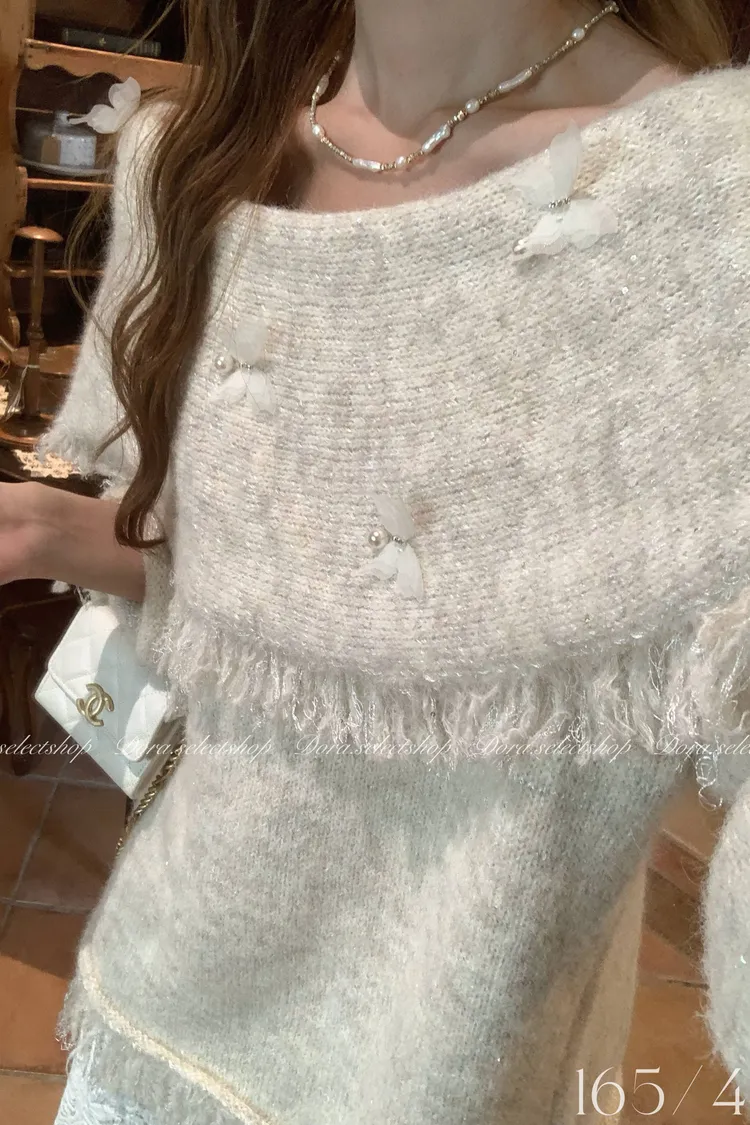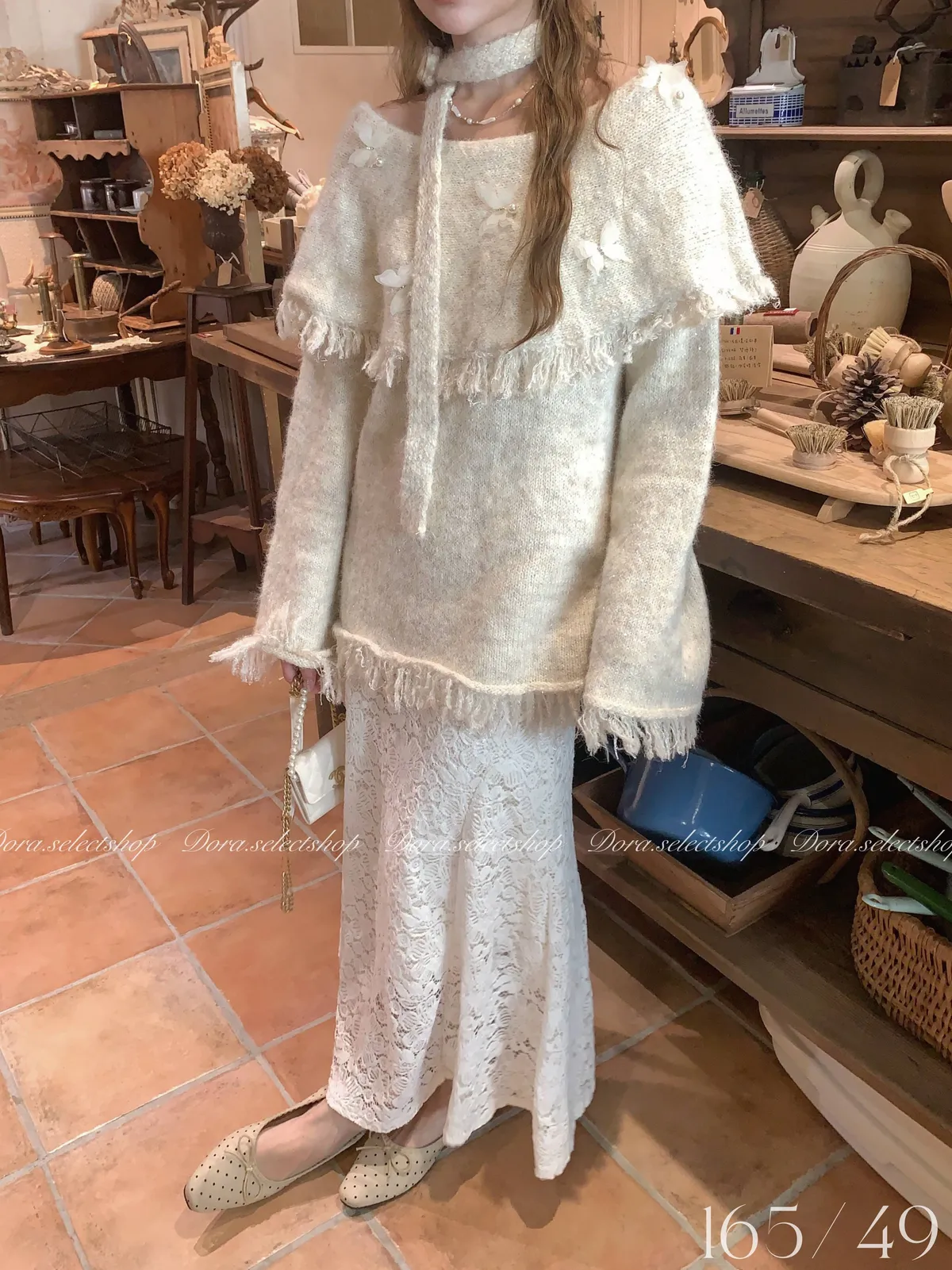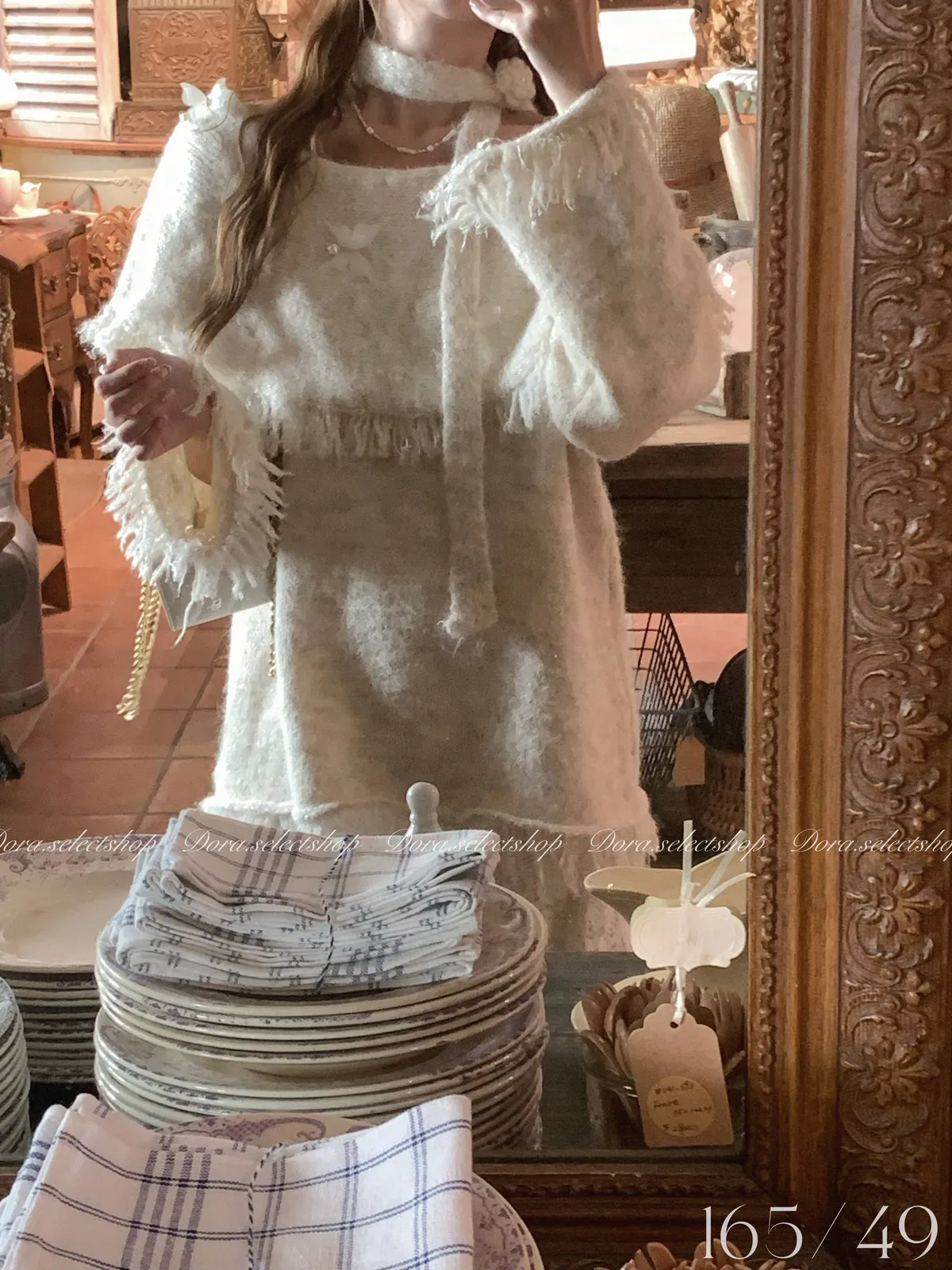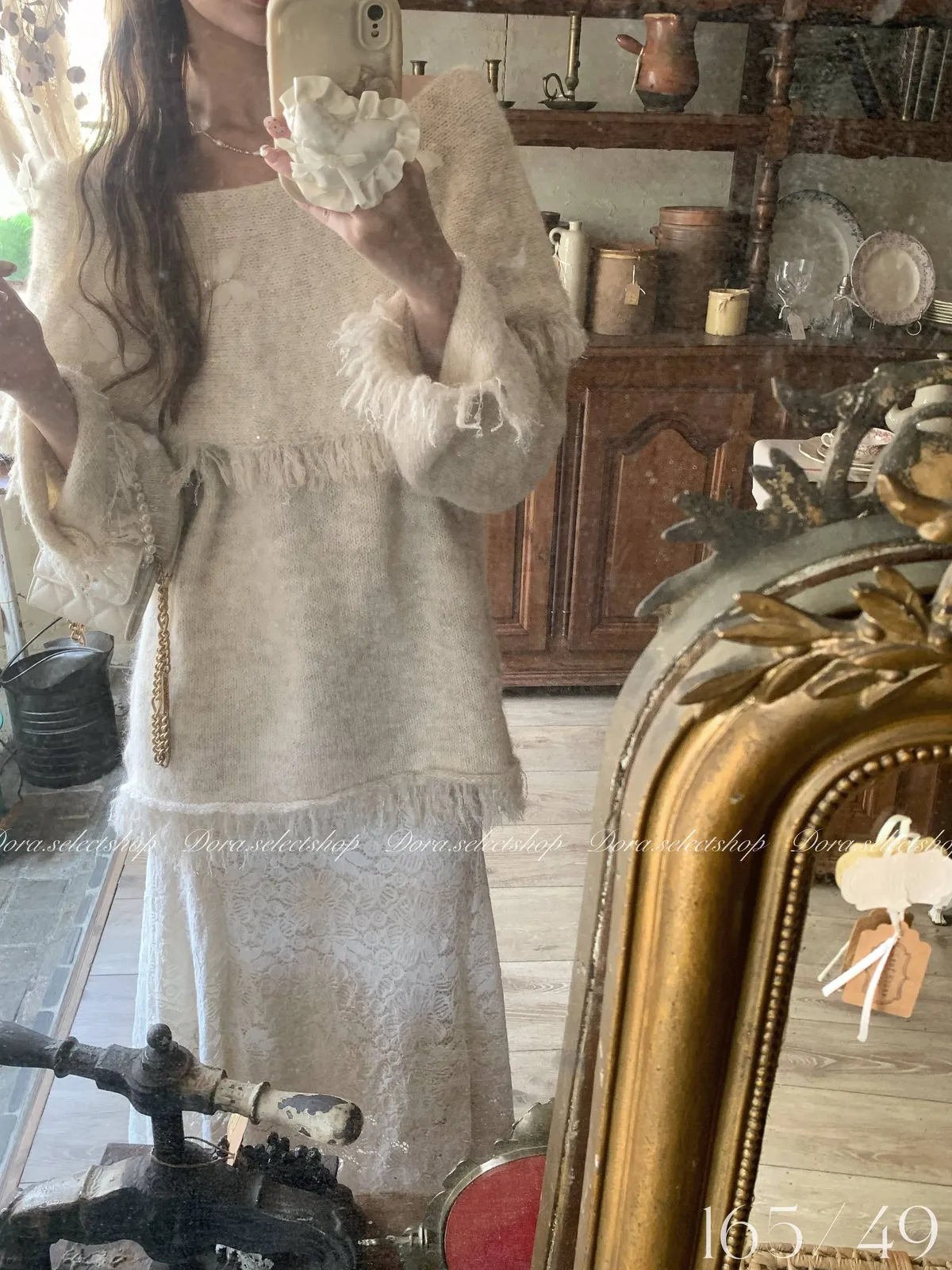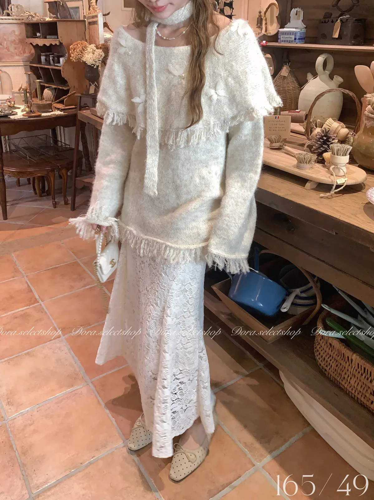 設計感大船領鬚邊寬鬆毛衣(附綁帶)---燕麥