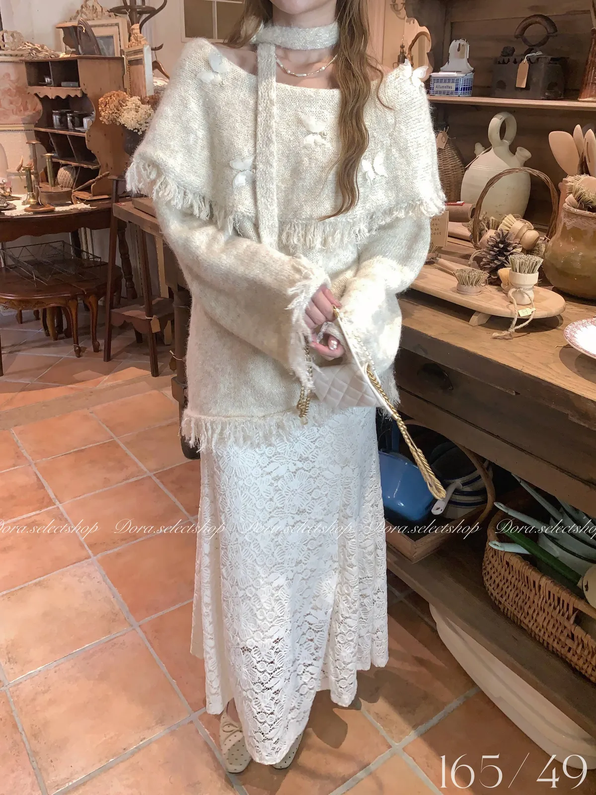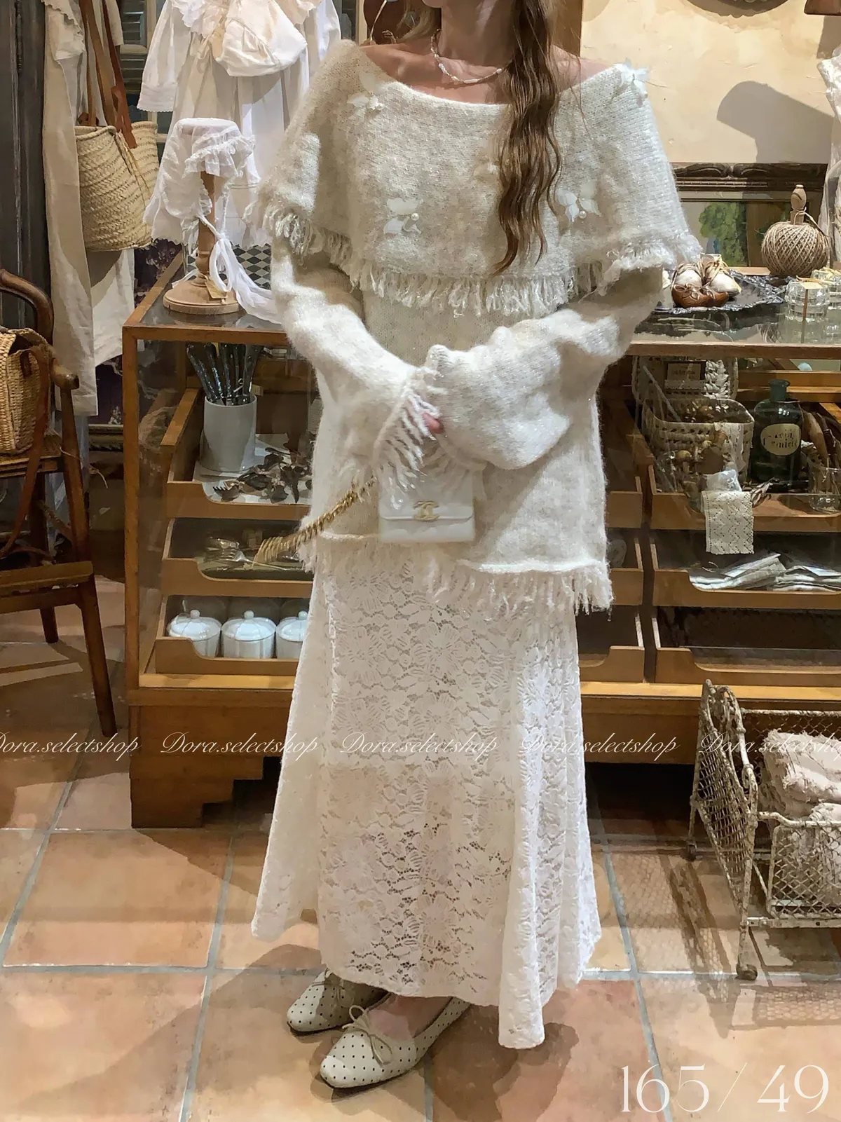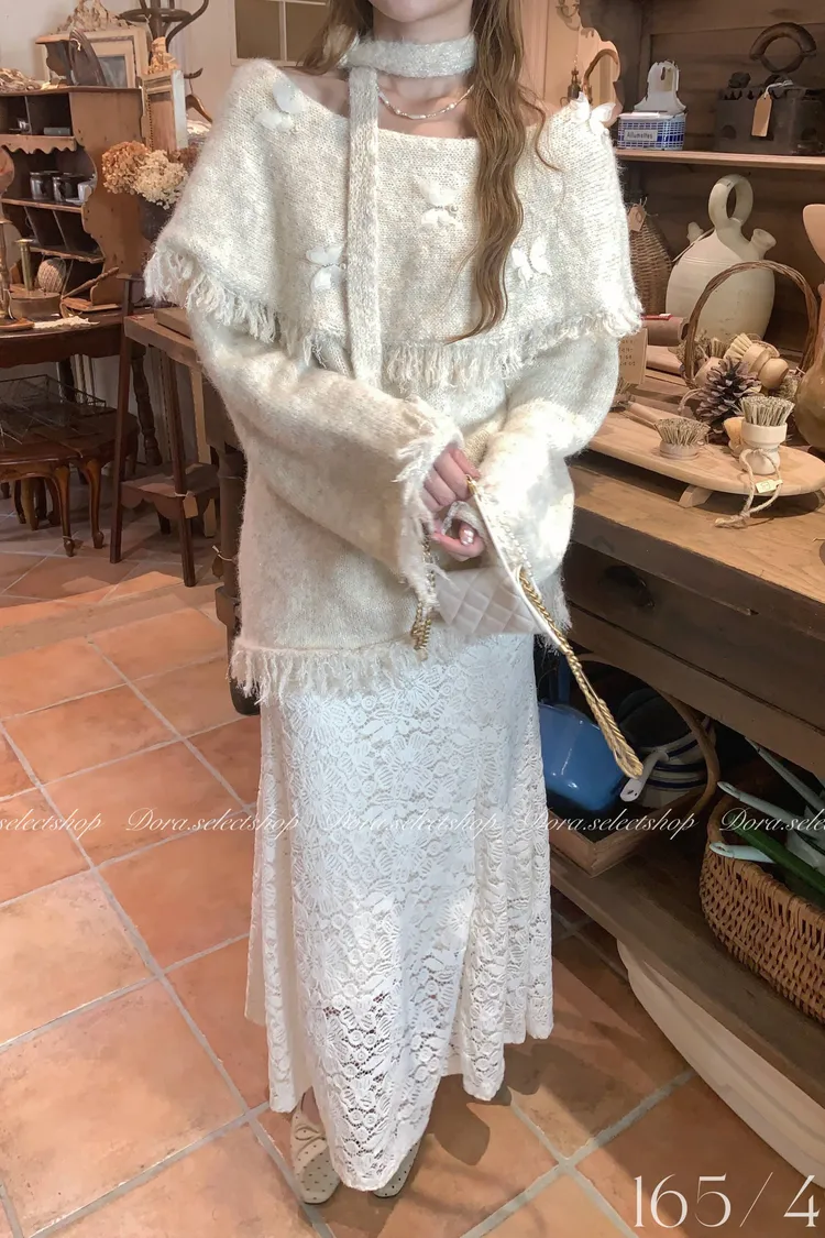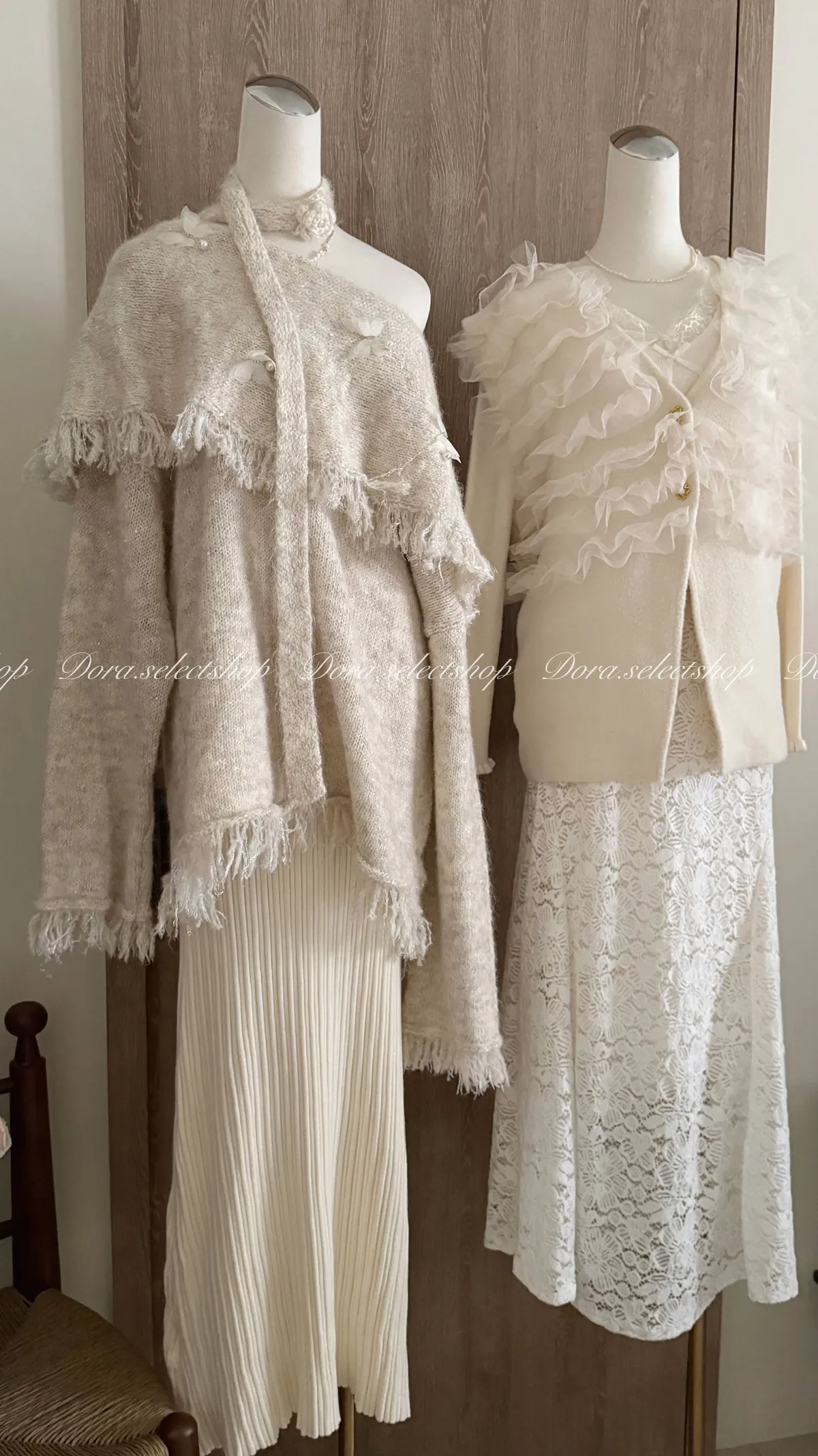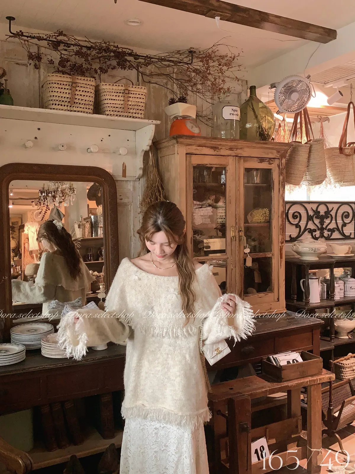 設計感大船領鬚邊寬鬆毛衣(附綁帶)---燕麥